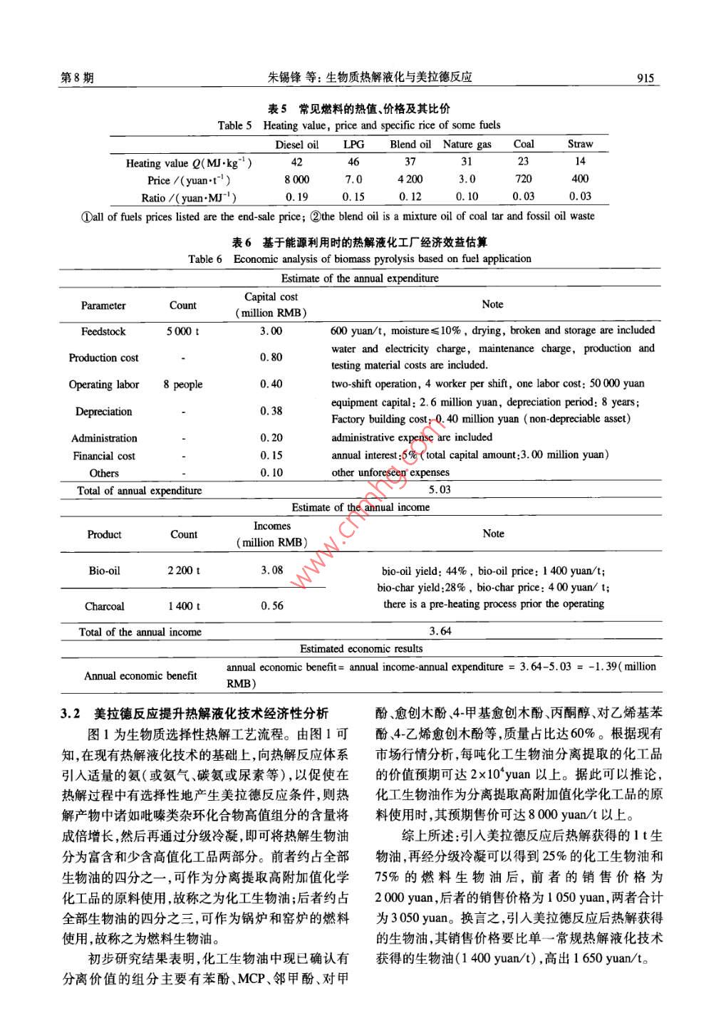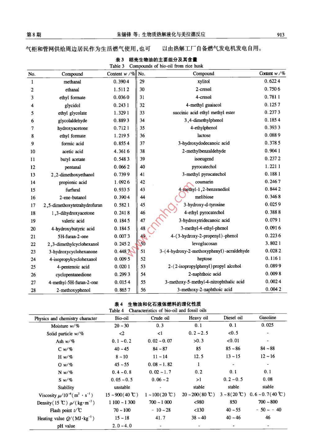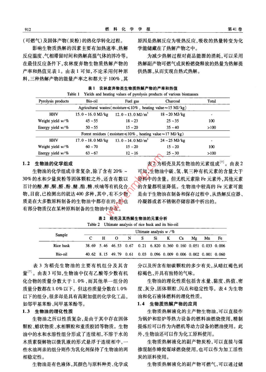 第41卷第8期燃料化學學報Vol 41 No 82013年8月Joumal of Fuel Chemistry and TechnologyAug.2013文章編號:0253-2409(2013)08-091146生物質熱解液化與美拉德反應朱錫鋒,朱昌朋(中國科學技術大學生物質潔凈能源安徽省重點實驗室,安徽合肥230026)摘要:對生物質熱解液化和美拉德反應進行了介紹指出美拉德反應不僅存在于生物質熱解液化過程中,而且通過引人適量氨等調控措施,可以促進美拉德反應有選擇性地生成吡嗪類雜環(huán)化合物等高值化學品,然后再通過分級冷凝將生物油分為化工生物油和燃料生物油,前者用于分離提取高值化學品,后者用于鍋爐和窯爐的燃料。引人美拉德反應后,生物質熱解液化技術經濟性將會得到根本性的改善。關鍵詞:生物質;生物質熱解;美拉德反應;生物油中圖分類號:TK6文獻標識碼:ABiomass fast pyrolysis and Maillard reactionZHU Xi-feng, ZHU Chang-pengAnhui Key Laboratory for Biomass Clean Energy, University of Science and Technology of China, Hefei 230026, China)Abstract Biomass pyrolysis and Maillard reaction were discussed in this article. Maillard reaction existed notonly in biomass pyrolysis, but also could be facilitated to produce high value-added compounds, such as pyrazineby adding defined ammonia. The condensable gas was condensed into two types of bio-oil which could be usedfor chemical and fuel, respectively. The former could be served as material to obtain valuable chemicals byseparation and extraction, while the latter could be used to burn in boiler or kiln. The economy of biomass fastpyrolysis process would be considerably improved when the Maillard reaction was introducedKey words: biomass; biomass pyrolysis; Maillard reaction; bio-oil生物質資源是自然界唯一可再生的碳源,具有化技術由于具有工藝過程短、原料適應性強、反應迅數(shù)量巨大、環(huán)境友好、CO2零排放等優(yōu)點。因此,世速、轉化率高以及易于商業(yè)化等諸多優(yōu)點故該技術界各國都把高效利用生物質資源擺在重要位置,中自20世紀70年代末問世以來,發(fā)展非常迅速6國更是將生物質能利用列為能源領域優(yōu)先發(fā)展的主如荷蘭BTG和加拿大 Dynamotive均于20世紀90題之一。中國擁有豐富的生物質資源,每年可供年代中期建成萬噸級示范裝置,中國科技大學也于利用的生物質資源保守估計即達7×103t標煤,實際20070年通過產學研合作在合肥建成了中國第一套可用于能源開發(fā)利用的資源量約合3.5×x103t標煤。產業(yè)化示范裝置。但客觀地說,該項技術迄今在世未來通過技術進步,以及利用邊際土地種植速生林界各國都沒有真正進入市場推廣階段其原因是多等能源作物,將使可用于能源開發(fā)的生物質資源高方面的但根本原因是其經濟性不佳。因此在現(xiàn)有達10×10t標煤2。技術基礎上加入美拉德反應和分級冷凝措施,使生1982年, Bunga)在 Science)上提出生物煉物油中高附加值組分的含量顯著增長,從而使之兼制的概念,旨在通過多種技術途徑將生物質轉化為其能源產品和化工原料雙重功能,則很可能是提升燃料、電力和化工品等產品。2006年,研究者在生物質熱解液化技術經濟性的重要途徑之一。《 Science和《Natr5上進一步強調,生物煉制1生物質熱解液化作為一種新的工業(yè)制造概念,為實現(xiàn)生物能源和生11生物質熱解液化物材料的可持續(xù)生產提供了可能,并將成為一種新生物質熱解液化是指在中溫(約500℃)缺氧的制造技術典范。條件下使生物質快速受熱分解,熱解氣體再經快速作為生物煉制的重要手段之一,生物質熱解液冷凝而獲得液體產物(生物油)和一部分氣體產物收稿日期:20136-17;修回日期:2013407402?;痦椖?國家自然科學基金(509300);國家高技術研究發(fā)展計劃(863計劃,2012AA051803);中國科學院重點部署項目(KGZD聯(lián)系作者:朱錫鋒,男,教授,主要從事生物質熱解的研究;E-mail:xihu@ustc,edu.cn。燃料化學學報第41卷(可燃氣)及固體產物(炭粉)的熱化學轉化過程。原因是熱解反應為吸熱反應,吸收的熱量轉變?yōu)榛绊懮镔|熱解的因素主要有加熱速率、熱解學能儲藏在了熱解產物之中。反應溫度、氣相滯留時間和熱解高溫氣體的淬冷等。為減少熱解過程對商品能源的消耗,可以采用在最佳反應條件下,農林廢棄物生物質熱解產物的熱解副產物可燃氣或炭粉燃燒釋放的熱量為熱解提產率和熱值見表1。由表1可知,不論采用何種原供熱源,從而實現(xiàn)自熱式熱解。料,三種熱解產物的能量產率之和都大于100%,其表1農林廢棄物類生物質熱解產物的產率和熱值Table I Yields and heating values of pyrolysis products of various biomassesPyrolysis produBio-oilgasCharcoalTotalAgricultural wastes( moisture s10%, heating value =15 M/kg)HHV15.0~16.0M/kg12.0-13.0MJ/m318~20M/kgWeight yield w/%45~5518-2325~35100Energy yield w/%50~5535~40>100Forest residues(moisture%, heating value =17 MJ/kg)17.0-18.0M/kg13.0-14.0MJ/m324~25M/kgWeight yield w/%15Energy yield w/% 63-67 12-16 25-30>1001.2生物油的化學組成表2為稻殼及其生物油的元素組成。由表2生物油的化學組成非常復雜,除了含有20%~可知,生物油中碳、氫、氧三種有機元素的含量大于30%的水和少量炭粉等固體顆粒之外,還含有數(shù)以原料中的含量。但無機元素除Fe元素外,其他元素百計的酸、醇、酮、醛、酚、醚、酯糖、呋喃等有機化合的含量都明顯降低。生物油中較高的Fe元素可能物,目前,已檢測出的就達400多種,其中,有不少物是由于生物油在制備和保存過程中,從熱解反應器質是在大多數(shù)原料制