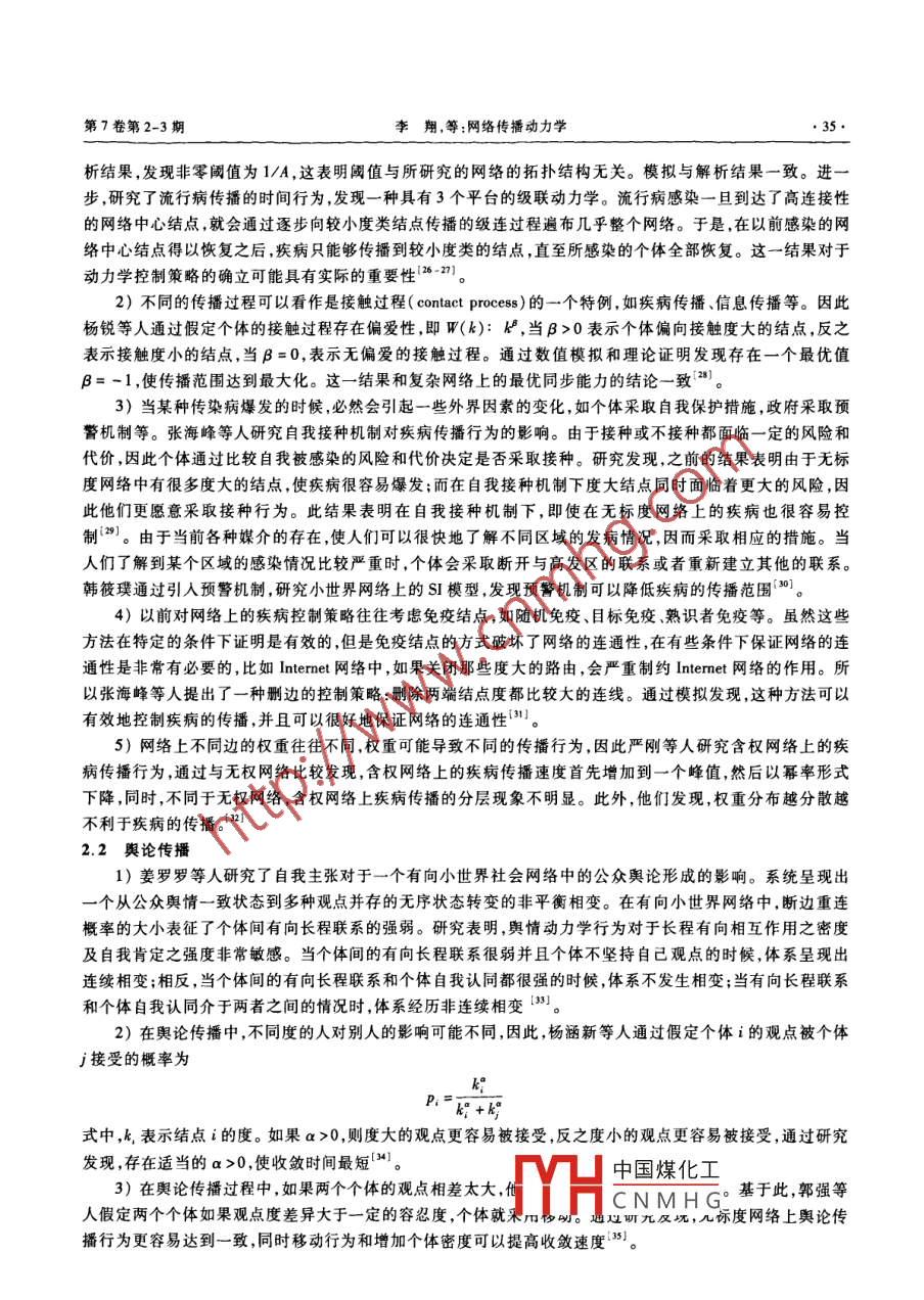 第7卷第2-3期復(fù)雜系統(tǒng)與復(fù)雜性科學(xué)Vol. 7 No. 2-3010年9月COMPLEX SYSTEMS AND COMPLEXITY SCIENCESep.2010文章編號(hào):1672-3813(2010)02-03-0033-05網(wǎng)絡(luò)傳播動(dòng)力學(xué)李翔,劉宗華2,汪秉宏31.復(fù)旦大學(xué),上海200433;2.華東師范大學(xué),上海200241;3.中國(guó)科學(xué)技術(shù)大學(xué),合肥230026摘要:病毒的流行、謠言的散布、觀點(diǎn)的傳遞都是在不同網(wǎng)絡(luò)上的形形色色的傳播現(xiàn)象,既存在著現(xiàn)象后的不同起因和特征,更存在著千絲萬(wàn)縷的聯(lián)系和共通的演化機(jī)理。匯總了復(fù)旦大學(xué)、華東師范大學(xué)和中國(guó)科學(xué)技術(shù)大學(xué)的研究小組過(guò)去幾年里在網(wǎng)絡(luò)傳播動(dòng)力學(xué)的研究成果。關(guān)鍵詞:復(fù)雜網(wǎng)絡(luò);傳播動(dòng)力學(xué);網(wǎng)絡(luò)中圖分類號(hào):N941文獻(xiàn)標(biāo)識(shí)碼:AOn Spreading Dynamics on NetworksLIhua2. WANG(1. Fudan University, Shanghai 200433, China; 2. East China Normal University, Shanghai 230026, China3. University of Science and Technology of China, Hefei 230026, CIAbstract: The prevalence of epidemics, rumors, and opinions are various spreading phenomena on dif-ferent categories of networks, which not only exhibit specific features and backgrounds, but also sharesome mechanisms and extensive interconnections. This paper is a brief collection including the work andhinking on this topic from the research groups of Fudan Univeristy, East China Normal University, andUniversity of Science and Technology of China.Key words: complex networks; spreading dynamics; network網(wǎng)絡(luò)傳播研究涉及疾病擴(kuò)散、輿論傳播及其動(dòng)力學(xué)等問(wèn)題。(計(jì)算機(jī)或生物)病毒在網(wǎng)絡(luò)上的流行與傳播行為是復(fù)雜網(wǎng)絡(luò)理論的主要研究?jī)?nèi)容之一,也是近年來(lái)人們?cè)谏鐣?huì)經(jīng)濟(jì)活動(dòng)中最為密切關(guān)注的一個(gè)主題。SARS、禽流感、沖擊波、震蕩波、熊貓燒香、灰鴿子等生物和計(jì)算機(jī)病毒的肆虐給人們帶來(lái)了以千億美元計(jì)數(shù)的巨大經(jīng)濟(jì)損失,而且這一傳播過(guò)程通常極為迅速。以2004年的“震蕩波”蠕蟲(chóng)病毒為例,在短短的十余天內(nèi)全球數(shù)千萬(wàn)臺(tái)計(jì)算機(jī)遭受到它的攻擊,其傳播速度驚人。復(fù)雜網(wǎng)絡(luò)傳播動(dòng)力學(xué)行為的研究還包括對(duì)謠言輿論、觀點(diǎn)等主體在網(wǎng)絡(luò)上擴(kuò)散現(xiàn)象的探討。本文主要匯總了復(fù)旦大學(xué)、華東師范大學(xué)和中國(guó)科學(xué)技術(shù)大學(xué)這幾個(gè)研究小組在過(guò)去幾年里對(duì)上述問(wèn)題的若干思考。歷史上流行病動(dòng)力學(xué)的研究已經(jīng)提出了幾個(gè)代表性模型。伴隨復(fù)雜網(wǎng)絡(luò)研究的興起,復(fù)旦大學(xué)研究小組-間°通過(guò)數(shù)值計(jì)算和理論分析研究網(wǎng)絡(luò)上傳播動(dòng)力學(xué)的若干模型,在探索復(fù)雜網(wǎng)絡(luò)的傳播臨界值理論基礎(chǔ)上,結(jié)合非線性動(dòng)力學(xué)分析了傳播動(dòng)態(tài)過(guò)程中存在的混沌、分叉等典型動(dòng)力學(xué)行為特征,圍繞小世界、無(wú)標(biāo)收稿日期:2010-06-14中國(guó)煤化工基金項(xiàng)目:園家自然科學(xué)基金項(xiàng)目(10635040,10975126,60874089,91024026CNMH校博士點(diǎn)基金項(xiàng)目(20093402110032);教育部新世紀(jì)優(yōu)秀人才計(jì)劃項(xiàng)目(NCET-09-031知-^目(09QH1400200)作者簡(jiǎn)介:李(1975-),男,湖南人,教授博導(dǎo),主要研究方向?yàn)閺?fù)雜網(wǎng)絡(luò)系統(tǒng)理論與應(yīng)用。復(fù)雜系統(tǒng)與復(fù)雜性科學(xué)2010年9月度網(wǎng)絡(luò)等典型模型分析了拓?fù)浣Y(jié)構(gòu)對(duì)于傳播動(dòng)力學(xué)的影響等。值得特別指出的是,研究小組發(fā)現(xiàn)在時(shí)延環(huán)境下小世界特性是網(wǎng)絡(luò)系統(tǒng)中不可避免地存在震蕩傳播過(guò)程的特征結(jié)構(gòu)0。這一系列的研究結(jié)果有助于分析相應(yīng)控制策略的有效性,并提出抑制疾病在網(wǎng)上傳播的對(duì)策6。針對(duì)人們社會(huì)活動(dòng)的網(wǎng)絡(luò)化特征,復(fù)旦大學(xué)研究小組還進(jìn)一步分析人群與不同現(xiàn)實(shí)網(wǎng)絡(luò)交互影響下的網(wǎng)絡(luò)傳播動(dòng)力學(xué)性能分析及其防控策略,圍繞人群的個(gè)體差異性,研究了在考慮不同類型的冪律和指數(shù)分布的易感性和傳染能力時(shí),移動(dòng)的人群中爆發(fā)流行病的臨界值條件,得到了個(gè)體差異性與病毒蔓延相關(guān)性等-24-。復(fù)雜網(wǎng)絡(luò)上流行病傳播可在更高級(jí)別上進(jìn)行研究,比如一個(gè)節(jié)點(diǎn)對(duì)應(yīng)一個(gè)城市或一個(gè)地區(qū),因而單個(gè)節(jié)點(diǎn)上可以同時(shí)擁有大量的粒子或個(gè)體,以前的研究主要集中在個(gè)體擴(kuò)散對(duì)流行病傳播的影響,近年來(lái), Vespignani小組開(kāi)始考慮一個(gè)節(jié)點(diǎn)可以同時(shí)被多個(gè)粒子占據(jù)的反應(yīng)-擴(kuò)散模型。以此為契機(jī),華東師范大學(xué)的研究小組探討了個(gè)體遷移模式對(duì)于無(wú)標(biāo)度網(wǎng)絡(luò)上流行病傳播的影響,著重考慮了人類活動(dòng)的兩個(gè)特點(diǎn):目的性與集聚性對(duì)流行病傳播的影響:2