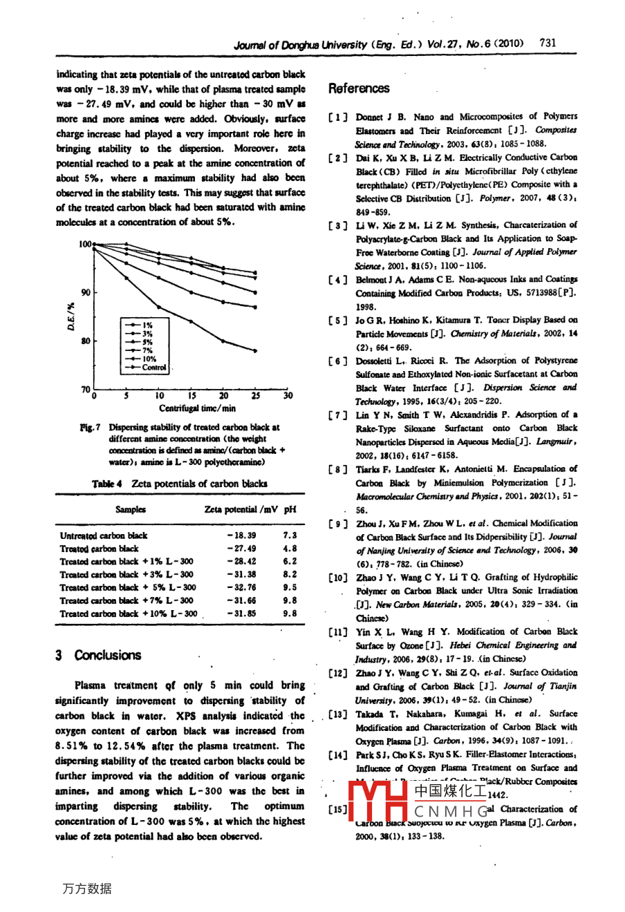 Joumnal of Donghue University (Eng. Ed.) Vol.27, No.6 (2010)727To Improve the Dispersibility of Carbon Black in Water with Plasmaand Organic Amines TreatmentsCAO Shu-hua(曹淑華) , SHEN Li (沈麗), DAI Jin-jin (戴瑾瑾)*,DONG Zhi-jun(志軍)Key Laboratory of Science & Techmology of Eco-Tetile , Mimistryof Education, Donghuo Univerity, Shanghai 201620. ChinaAbstract: Carbon black has been widely used in manygrafting* 0], surface oxidation.r), etc., to introduceindustrial areas, but it i poor dispersibility in water. Inpolar groups onto its surface. But most of the approachesorder to improve its dispersiblity in water, carbon black wasabove were conducted in aqucous condition, which wouldtreated by axygen plasma. Plasma treatment, as one of thelcad environmental pollution and require considerableenvirormental friendly methods, has been used to introduceenergy for post treatments such as drying.polar groups, mainly xygen-containing groups, 如thePlasma treatment, as one of theenvironmental friendlysurface of carbon black. The results show the dispersibilitymethods, has also ben used t如o introduce polar groups, mainlyof treated carbon black in watσr is greatly improved, whichoxygen-containing groups to the ourface strncture of carbonis expressed with the centrifugal and gravity settlementblack. The study of Takata et al. on plasma treatment ofrates. Analysis of the treated carbon black with X-raycarbon black indicated that the ratio of oxygen/carbonphotoelectron spectroscopy (XPS) indicates that xygenincreased with increasing treating time, and reached aplasma treatment can cause significant increase of polargroups includingC- -OH, 000H, C- O, andO -C-0onsaturatod valuc of 0. 42[3]. Park et al. reported that oxygcnthe surface of carbon black thus greatly improves thecontaining function group of carbon black was introduceddispersing stability of carboo black im watar. Besides, thethrough axygen plasma treatmen[4J. Li and Horita alsodispersibility of plasma treated carbon black can be furtherreported that oxygen containing function group on the surfaceimproved by the addition of organic amines, especiallyof carbon black increased ater an orxygen plasma treatmentil.polyetheramines. The improvenent of the dispersingIn this paper, xygen plasma was used to treat carbonstability of carbon black has also been conflrmed by etablack. The settlement ratcs of carbon powders treated underpotential measurements.different conditions were measured, and the infuence ofKey words: carbon black; axygenr; plasma; amines; X-raydifferent amincs was also studied. X-ray photoclectronphotoelectron spectroscopyspectroscopy (XPS) analysis shows the change of the surfaccac mumber; TS195. 13Doaument code: Astructure of carbon black after plasma treatment.Article ID; 1672 - 5220(2010)06- 0727- 05.1 ExperimentalIntroduction1.1 MaterialsThe materials in details were shown in Table 1.Carbon black has been widely used in many industrialareas, such as reinforcing filler of rubberl, conductiveTable 1 Materials in the experimentagent of plastics'), and black pigment for coating',MatcrialSourceinks), or tonef"], These applications all involve dispersingcarbon black into various media, e. g. water-borne or oil-Carbon black CommercialDegusa Co., Ltd.borme media. The quasi-graphitic structure, complexproductsOxygcn≥99.2%Shanghai Sangang-Messerconfigurations, and colloidal dimcnsions of pristine carbonGas Product Co,, Ltdblack result in poor dispersibility in a variety of medias.Organic amincs CommercialHuntsman Co. , Ltd.Inks are waterborne dispersions and have been widely uscdXTA-758in printing of paper or textils. In order to improve 謝Polyetheramine M. =1000,Huntsman Co, Ltd.dispersibility in water, carbon black has been subjected toL- 100HLB=17.0Polyetheramine M. =20,Huntsmnan Co. , Ltd.various surface treatments, for instance, surfactant surfaceL- 207HLB=13.8adsorptionf.n, encapnhation,surface chemical中國(guó)煤化工Reccived date; 2009-06 -30TMYHCNMHGFoundation item: Program for Changjiang Scholar and Innovative Rescarch Team in University, China (No. IRT0526)曲Correspondence should be addrestod to DAI Jin-jin, E-mail; jindai@dhu. edu. cn728Joumal of Donghu University (Eng. Ed.) Vol.27, No.6 (2010)(Table 1 cotinued)and pH of the upper suspension is measured using pH mcterE- 201-C (made in China). Zeta potcntial of the upperMaterialGradeSourcesuspension is mcasurcd using a Zetasizer Nano SericsPolyetheramine M. =3 0Huntsman Co, LId.(Malvern Instruments Ltd, UK).HLB=17.1Dicthanolamine ARSinopharm ChemicalRcagent Co., Ltd.2 Results and DiscussionNotc: HLB is hydrophilc-lipophile balance oumber.2.1 Eftects of plasma treatments on stspension1.2 Procedure and measurementstability o[ carbon black in water1.2.1 Plasma trealmentIn order to compare the stability o{ suspension ofPlasma trcatment equipment GPT- 3 RF 13. 56 MHzcarbon black before and after plasma trcatment, their(made in China) was used in this study. Put a petri dishgravity and centrifungal stability were dctermined and theloaded with the carbon black sample of about 100 mg asresults were shown in Figs. 1 and 2.thin as possible into the plasma chamber, and open thevacuum pump till the pressure reaches to about 10 Pa.Flush the chamber with oxygen for 2 -3 times, and then30}introduce oxygen into the reactor. Once the pressurercachcs 30 Pa. initiate the glow dischargc at a power of80 W for a trcatment time 5 min. After the plasmatrcatment, raise the pressure and remove the samples.I -Plsm uralme1- Untreated1.2.2 Measurencnts o{ sttlemneat ntes ol carbon black in2091.2.2.1 Ccntrifugal sttlement rate340Disperse the trcatcd or untreated carbon blackSubsidence time/dsamplc of about 1 g into 100 mL distiled water and stirFig.1 Gravity sttlement stability of oxygen plasmawith a high-speed mixer SFJ - 400 ( Shanghai Xiandaitrcated and untreated carbon blacks in waterEnvironment Engincering Technique Co., .Ltd.China) at1 800 r/min for 30 min. Pour 5 mL dispernion0pi
