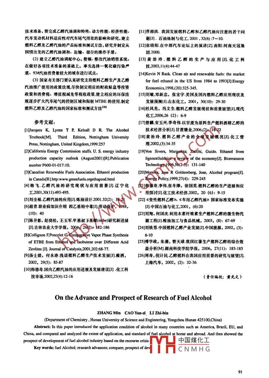 第28卷第4期湖南科技學院學報Jourmal of Hunan University of Science and EngineeringApr 2007燃料乙醇研究概況及發(fā)展前景張敏曹燕子李志斌(湖南科技學院生命科學與化學工程系,湖南永州425100)摘要:介紹了美國、巴西、歐共體等世界主要燃料乙醇應用國家及中國的燃料乙醉使用情況,對比分析了國內(nèi)外燃料乙醇的應用程度和國家標準,從能源危機與環(huán)境保護的角度出發(fā),展望了燃料乙醇工業(yè)的發(fā)展前景關(guān)鍵詞:燃料乙醇;研究進展;對比;發(fā)展前景中圖分類號:06-1文獻標識碼:A文章編號:1673-2219(2007)04008903乙醇俗稱酒精,它以玉米、小麥、薯類、糖蜜等為展計劃”叫,作為重要能源戰(zhàn)略美國還制定了相關(guān)的法律原料經(jīng)發(fā)酵、蒸餾而制成,所謂燃料乙醇是指對濃度為95%和扶持政策1.如1990年美國國會通過的空氣清凈法修正左右的乙醇進一步脫水,再加上5%體積分散(一般為無鉛案,該法案的實施對燃料乙醇的推廣提供了非常重要的汽油或無鉛的烴類)的變性劑使之成為水分小于0.8%,且政策支持不可食用的變性無水乙醇4引2005年8月8日美國出臺的《新能源法案》正式生效燃料乙醇既是一種清潔能源,又是一種良好的汽油增氧這些措施進一步推動了美國燃料乙醇產(chǎn)業(yè)的快速發(fā)展嗎。劑和辛烷值調(diào)和組分,用以代替四乙基鉛和甲基叔丁基醚美國政府實施燃料乙醇政策以來促進了美國農(nóng)業(yè)的發(fā)(MTBE)或乙基叔丁基醚(ETBE)圍,乙醇調(diào)入汽油對展,改善了環(huán)境,減少了原油進口,為社會提供了大量就業(yè)降低汽車尾氣中的一氧化碳含量很有效起到凈化空氣的效機會果同時,乙醇用糧食制造,是一種生物轉(zhuǎn)化的太陽能,是2巴西發(fā)展燃料乙醇的計劃和獲利種取之不盡,用之不竭的可再生資源,在汽油中加入一定巴西政府大力發(fā)展燃料乙醇行動計劃源于1975年,比例的乙醇作燃料,能節(jié)約石油凈化空氣,轉(zhuǎn)化多余糧食,是出于國家能源安全和經(jīng)濟發(fā)展考慮,二是為了促進國內(nèi)農(nóng)為人類社會的可持續(xù)發(fā)展提供一條簡單有效的途徑。業(yè)種植業(yè)的發(fā)展和保護農(nóng)民利益,三是為本國發(fā)展綠色可再從20世紀70年代中期開始,利用生物技術(shù)和可再生資生能源創(chuàng)出新路和保護環(huán)境"1源(生物源)進行乙醇工業(yè)化生產(chǎn),并以此作為石油能源的幾十年來實施的燃料乙醇計劃,給巴西帶來很大收益替代物成為各國的研究熱點。我國在《國民經(jīng)濟和社會發(fā)一是形成了獨立的經(jīng)濟能源運行系統(tǒng);二是刺激了農(nóng)業(yè)、乙展第十個五年計劃綱要》中對使用乙醇汽油提出了明確要醇相關(guān)行業(yè)的大發(fā)展;三是大氣和生態(tài)環(huán)境得到明顯改善求,國家有關(guān)部門已將其作為調(diào)整和優(yōu)化產(chǎn)業(yè)結(jié)構(gòu)的重點工13歐共體國家的乙醇產(chǎn)業(yè)歐盟燃料乙醇2004年的消耗量為175萬噸,2005年1國外對燃料乙醇的研究與利用狀況乙醇用于燃料市場的需求有較大增長歐盟生物燃料計劃驅(qū)1.1美國燃料乙醇應用現(xiàn)狀及發(fā)展動了這一需求。計劃要求到2010年這一比例將提高到美國是世界上燃料乙醇的主要生產(chǎn)國,1930年乙醇5175%體積分數(shù))16??商娲茉磳⒄?2%的份額,這有油混合燃料在美國國內(nèi)布拉斯加州首次面市。20世紀70年可能引起人們對酒精的更大興趣代以來,在石油危機的背景下,美國為減少對進口原油的依歐共體積極發(fā)展燃料乙醇是因為如下六點:(1)石油價賴,從尋找替代能源的角度出發(fā),聯(lián)邦政府制定了“乙醇發(fā)格的不斷上漲;(2)盡量減少對石油的依賴;(3)盡可能增加就業(yè)機會;(4)將資金留在本國;(5)乙醇汽油提高了汽收稿日期:2007-03-05油的動力性能;(6)減輕環(huán)境污染的程度國?;痦椖?湖南省永州市科技局資助項目湖南科技學1.4我國燃料乙醇的發(fā)展研究院大學生課題資助項目.湖南省自然科學基金項目fV凵中國煤化工能建設(shè)(06J50021)和湖南省重點學科建設(shè)項目(2006180資助。作者簡介:張敏(1956-),女,湖南陵人,湖南科cNMH屬老開始試用車技學院生命科學與化學工程系教授,從事化學教學與精細化用乙醇汽油的發(fā)展很快,并已具有一定的規(guī)模。推廣使用車學品合成研究用乙醇汽油已作為我國的一項戰(zhàn)略舉措,隨著車用乙醇汽油甲醇/%≤0.5在全國范圍的使用,必將為我國創(chuàng)造出更巨大的經(jīng)濟效益和水分隔≤10≤0.8ASTM社會效益到。實際膠質(zhì)(100mly'≤50≤5.0ASTM205年2月頒布了《可再生能源法》國家以立法的形式鼓勵包括燃料乙醇在內(nèi)的生物質(zhì)液體燃料的發(fā)展。由于燃無機氟(以ClASTM≤32料乙醇的生產(chǎn)漸趙多樣化因此不會造成對某一種原料的過分依賴而且隨著科技的進步,纖維乙醇的開發(fā)成功燃料乙≤0.1≤0.08ASTMD1688醇的生產(chǎn)不會對國家糧食安全造成威脅6。酸度(以乙酸計<0ASTMDl613142我國推廣使用燃料乙醉的意義PH值65~90乙醇已不單是一種優(yōu)良燃料,它已經(jīng)成為一種優(yōu)良的燃改性劑質(zhì)量分數(shù)>1:951.95油品質(zhì)改善劑被廣泛使用作為一種新型的,可再生清潔能源而越來越受到世人的重視。在我國推廣使用車用乙醇≤4.76汽油主要有如下三個重要意義清澈透|清澉透明,無肉外觀無懸