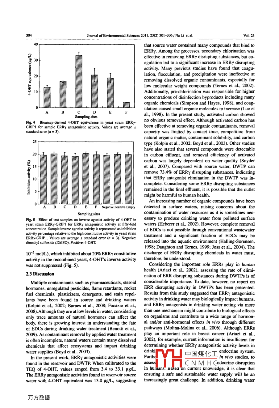 Available online at ww.sciencedirect.comJOURNAL OFENVIRONMENTALScienceDirectSCIENCES巴ISSN 101-0742JES 門Jourmal of Erironmneatal Sciences 2011, 23(2) 301-306www.jesc.sc.cnLLEstrogen-related receptor γ disruption of source water and drinking watertreatment processes extractsNa Lil, Weiwei Jiang' , Kaifeng Rao' , Mei Ma', Zijian Wang'.",Satyanarayanan Senthik Kumaran2I. Research Centerfor Eco-Envirormental Sciences, Chinese Academy of Sciences, Bejing 100085, China. E-mail: linazone@ 163.com2. Unit of Toxiclogs. Bharathiar Universis, Coimbalore 641046, IndiaReceived 31 March 2010; revised 19 November 2010; acepted 24 November 2010AbstractEnvironmental chemicals in drinking water can impact human health through nuclear receptors. Addionally, estrogen-relatedreceptors (ERRs) are vulnerable to endocrine-disrupting effects. To date, however, ERR disruption of drinking water potency hasnot been reported. We used ERRY two-hybrid yeast assay to screen ERRY disrupting activities in a drinking water treatment plant(DWTP) located in north China and in source water from a reservoir, focusing on agonistic, antagonistic, and inverse agonistic activityto 4-hydroxytamoxifen (4-OHT). Water treatment processes in the DWTP consisted of pre chlorination, coagulation, coal and sandfilration, activated carbon fltration, and secondary chlorination processes. Samples were extracted by solid phase extraction. Resultsshowed that ERRγ antagonistic activities were found in all sample extracts, but agonistic and inverse agonistic activity to 4-0HTwas not found. When calibrated with the toxic equivalent of 4-OHT, antagonistic efluent effects ranged from 3.4 to 33.1 ug/L. In thetreatment processes, secondary chlorination was efective in removing ERRY antagonists, but the coagulation process led to significantlyincreased ERRγ antagonistic activity. The drinking water treatment processes removed 73.5% of ERRγ antagonists. To our knowledge,the occurrence of ERRγ disruption activities on source and drinking water in vitro had not been reported previously. It is vital, therefore,to increase our understanding of ERRy disruping activities in drinking water.Key words: drinking water; estrogen receptor, estrogen-related receptor; two-hybrid yeast; solid phase extractionDOI: 10.1016/S1001-0742(10)60406-8Citation: Li N, Jiang W w, Rao K F, Ma M, Wang ZJ, Kumaran S s, 2011. Estrogen. related reeptor r disuption of source water anddrinking water treatment processes extracts. Joural of Environmental Sciences, 23(2): 301-306IntroductionWhile research has focused on the disruption activityof estrogen receptors (ERs) in water in recent years, farOver the last several decades, an increasing number ofless attention has been paid to identifying compoundsenvironmental contaminants have been found to disruptwith estrogen-related receptors (ERRs) disrupting activity.endocrine systerms in wildlife and humans (Sonnenschein Increasing evidence from in vivo and in vitro stud-and Soto, 1998). These endocrine disrupting chemicals ies demonstrates, however, that ERRs are vulnerable to(EDCs) can interact with human nuclear receptors (NRs),endocrine-disrupting effects (Horard and Vanacker, 2003)interfering with the endocrine system, causing develop- and are possibly disrupted by environmental chemicalsmental degeneration, reducing fecundity, and leading to (Takayanagi et al, 2006). Recent research has also doc-an increase in human breast cancer (Colbom et al., 1993;umented a correlation between ERs and ERRs in breastCrews et al, 2000). Recently, EDCs have emerged as a cancer patients (Ariazi et al,. 2002), indicating that ERRmajor water quality concerm as they can interfere with disrupting chemicals may play an important role in breastendocrine systems when found at certain concentrations tumors. Therefore, the rate of elimination of ERRs disrupt-in drinking water (Scruggs et al., 2005). Many EDCs areing substances during the treatment process of drinkingbiologically active at very low concentrations and have water and assessing the disrupting potency of surface waterbeen detected in surface water (Heberer et al, 2002) and resour中國(guó)煤化-lental importance.drinking water (Stackelberg et al, 2004). This is of concemSi, ERRs have beenas many conventional treatment processes are ineffectiveclassitYHCN M H Gptor subfamily asin completely removing EDCs from water (Johnson et al, no enaogenousuganas nave Deen laentified. Both ERRs2007).and ERs have a high degree of amino acid sequencesimilarity and identity in their DNA-binding (DBD) and●Corresponding auhor. E-mail: wangiz@rces.ac.cn02Joumal of Enironmental Sciences 2011, 23(2) 301- 306/NaLi etal.Vol. 23ligand-binding (LBD) domains (Horard and Vanacker,ASource water2003). ERRs can bind to functional estrogen responseelements (EREs) in ERs target genes, suggesting possiblesimilarities between ERRs and ERs action (Takayanagiet al., 2006). ERRY and ERs functional crosstalk systemsBPre- chlorinationmight explain low-dose effects of environmental estrogenbisphenol A (Takayanagi et al, 2006). Of the three ERRtypes, ERRa, ERRB and ERRγ (Giguere et al, 1988;Hong et al, 1999), ERRγ is essential for the develop-CCoagulationment of the hypothalamic-hypophyseal-adrenocortical axis(Wilson et al, 1993; Luo et al, 1994), and is expressedin a number of human adult and fetal tissues includingthe brain, skeletal muscle, heart, kidney, and retina. SomeDCoal and sand flrationsynthetic chemicals including bisphenol A, diethylstilbe-strol, 4 nonylphenol and some phytoestrogens can bind tohuman ERRy (Tremblay et al, 2001; Coward et al, 2001;Greschik et al, 2004; Takayanagi et al, 2006), which haveEActivated carbonbeen detected in many environment samples and drinkingwater. Assessing the environmental pollutants interferingwith ERRY is, therefore, of great importance.We previously developed novel screening methods forFSecondary chlorinationchemicals with ERRγ disrupting properties using a yeasttwo-hybrid sys