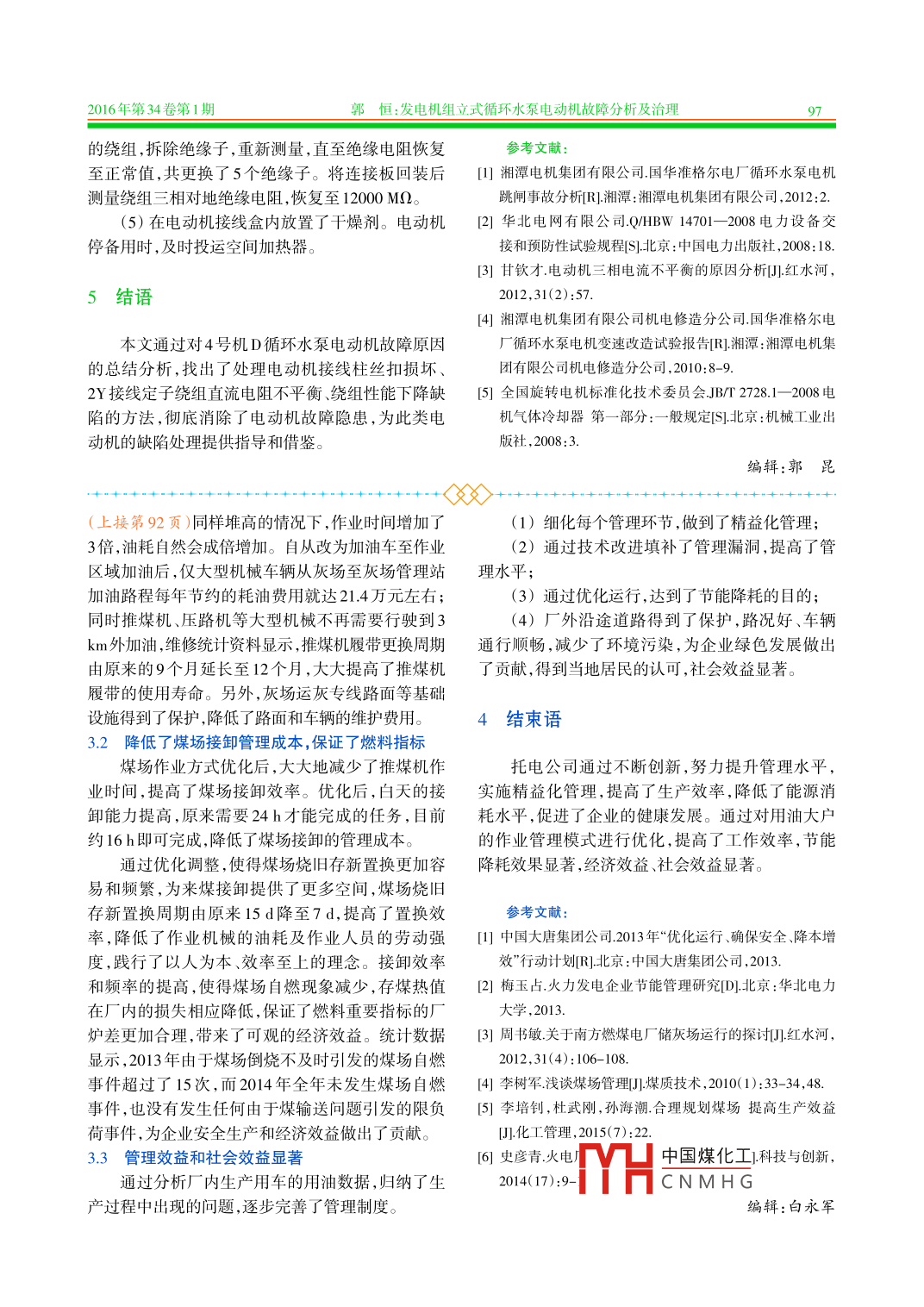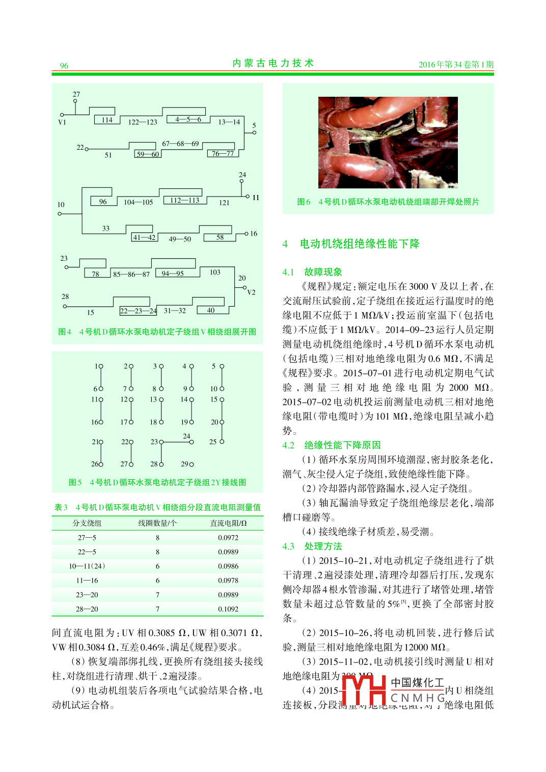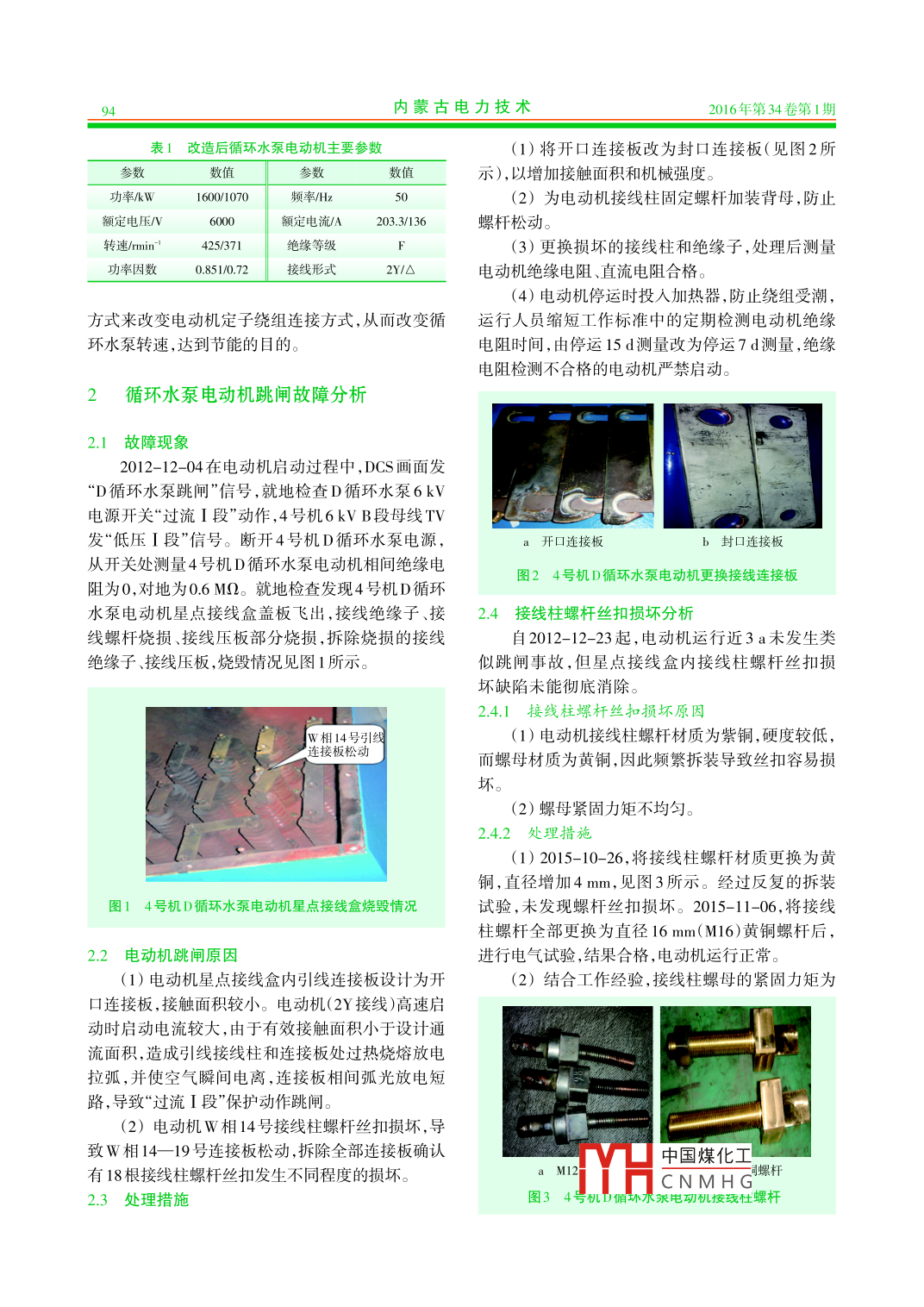 內(nèi)蒙古電力技術2016年第34卷第1期INNER MONGOLIA ELECTRIC POWER .doi:10.3969/j.issn. 1008-6218.2016.01.014發(fā)電機組立式循環(huán)水泵電動機故障分析及治理郭恒(神華內(nèi)蒙古國華準格爾發(fā)電有限責任公司,內(nèi)蒙古鄂爾 多斯010300)摘要:神華內(nèi)蒙古國華準格爾發(fā)電有限責任公司4號機D循環(huán)水泵電動機雙速改造后,在運行維護過程中,出現(xiàn)因接線柱螺絲松動導致電動機啟動后跳閘、定子繞組采用2Y接線時三相直流電阻不平衡、電動機繞組絕緣性能下降等問題。通過采取更換電動機接線連接板、絕緣子和接線柱,對繞組線圈連線焊接處進行補焊,冷卻器堵漏等措施,徹底消除了故障隱患,保證了循環(huán)水泵電動機的安全穩(wěn)定運行。關鍵詞:循環(huán)水泵;電動機;直流電阻;絕緣性能;接線柱;冷卻器;絕緣子文獻標志碼:B中圖分類號:TM621.7文章編號:1008- -6218(2016)01-0093-05Fault Analysis and Treatment of Vertical Circulating W ater Pump MotorGUO Heng(Shenhua Inner Mongolia Guohua Zhungeer Power Generation Co.,Ltd., Ordos 010300, China)Abstract: After circulation pumps D motor double speed transformation in GuohuaZhungeer Power Generation Co.,Ltd. No.4 unit, motor trip in the star operation because ofscrew terminal loose, phase DC resistance appear unbalance during stator winding 2Ywiring, simultaneously motor winding insulation gradually decline. By measures to replacingelectrical wiring board, posts and insulator, welding junction of windings, cooler plugging,completely eliminate the motor risks, also ensure safety and stable operation of units.Key words : circulating water pump; motor; DC resistance; insulation performance;posts; cooler; insulator1設備概況示。4號機組共有2臺循環(huán)水泵電動機,冬季1臺電動機低速運行,夏季2臺電動機高速運行,春、秋季神華內(nèi)蒙古國華準格爾發(fā)電有限責任公司4號根據(jù)氣溫情況1臺高速或1臺低速運行。發(fā)電機組D循環(huán)水泵電動機為湘潭電機集團有限公電動機機座為長方體結構,橫截面為方形,在司生產(chǎn)的立式電動機,2007--09--30投運,電動機型機座東、西兩側面分別裝有水一空冷卻器;電動機號為YKSL1600- 14/1730-1。2010- -09- 14在湘潭電上軸承由推力軸承和導向軸承組成,型號為機集團有限公司電機修造分公司進行了雙速改造,SMZ12- 200- -6B;下軸承為圓柱滾子軸承,型號為改造后電動機型號為YKKL1600/1070- 14/16,將原NU 1048ECM ;接線盒位于機座南、北兩側,星點接線來14極雙Y接線改為14極雙Y和16極△2種接線盒內(nèi)有29個絕緣子和接線柱,出線接線盒內(nèi)有3個方式,并于2010-10-20投運,其主要參數(shù)如表1所絕緣子和接線柱.通過改變接線盒內(nèi)接線柱的連接中國煤化工[收稿日期] 2015-11-27HCNMH G[作者簡介]郭恒(1981), 男,山西人,學士,工程師,從事發(fā)電廠電氣設備檢修工作。94內(nèi)蒙古電力技術2016年第34卷第1期表1 改造后循環(huán)水泵電動機主要參數(shù)(1)將開口連接板改為封口連接板(見圖2所參數(shù)數(shù)值示),以增加接觸面積和機械強度。功率/W1600/1070頻率/Hz ;(2)為電動機接線柱固定螺桿加裝背母,防止額定電壓/V6000額定電流/A203.3/136螺桿松動。轉速/min'425/371絕緣等級(3)更換損壞的接線柱和絕緣子,處理后測量功率因數(shù)0.851/0.72接線形式2Y/O電動機絕緣電阻、直流電阻合格。(4)電動機停運時投人加熱器,防止繞組受潮,方式來改變電動機定子繞組連接方式,從而改變循運行人員縮短工作標準中的定期檢測電動機絕緣環(huán)水泵轉速,達到節(jié)能的目的。電阻時間,由停運15 d測量改為停運7d測量,絕緣電阻檢測不合格的電動機嚴禁啟動。2循環(huán)水泵電動機跳閘故障分析2.1故障現(xiàn)象2012- 12-04在電動機啟動過程中, DCS畫面發(fā)“D循環(huán)水泵跳閘”信號,就地檢查D循環(huán)水泵6kV電源開關“過流I段”動作,4號機6kV B段母線TV發(fā)“低壓I段”信號。斷開4號機D循環(huán)水泵電源,開口連接板b封口連接板從開關處測量4號機D循環(huán)水泵電動機相間絕緣電圖24號機D循環(huán)水泵電動機更換接線連接板阻為0,對地為0.6MQ。就地檢查發(fā)現(xiàn)4號機D循環(huán)水泵電動機星點接線盒蓋板飛出,接線絕緣子、接2.4接線 柱螺桿絲扣損壞分析線螺桿燒損、接線壓板部分燒損,拆除燒損的接線自2012-12-23起,電動機運行近3a未發(fā)生類絕緣子、接線壓板,燒毀情況見圖1所示。似跳閘事故,但星點接線盒內(nèi)接線柱螺桿絲扣損壞缺陷未能徹底消除。2.4.1接線柱螺桿絲 扣損壞原因Iw相14號引線(1)電動機接線柱螺桿材質為紫銅,硬度較低,連接板松動而螺母材質為黃銅,因此頻繁拆裝導致絲扣容易損不。(2)螺母緊固力矩不均勻。2.4.2處 理措施(1) 2015-10-26,將接線柱螺桿材質更換為黃銅,直徑增加4mm,見圖3所示。經(jīng)過反復的拆裝圖14號機D循環(huán)水泵電動機星點接線盒燒毀情況試驗,未發(fā)現(xiàn)螺桿絲扣損壞。2015-11-06, 將接線柱螺桿全部更換為直徑16mm(M16)黃銅螺桿后,2.2電動機跳閘原因進行電氣試驗,結果合格,電動機運行正常。(1)電動機星點接線盒內(nèi)引線連接板設計為開(2)結合工作經(jīng)驗,接線柱螺母的緊固力矩為口連接板,接觸面積較小。電動機(2Y接線)高速啟動時啟動電流較大,由于有效接觸面積小于設計通流面積,造成引線接線柱和連接板處過熱燒熔放電拉弧,并使空氣瞬間電離,連接板相間弧光放電短路,導致“過流I段"保護動作跳閘。(2) 電動機W