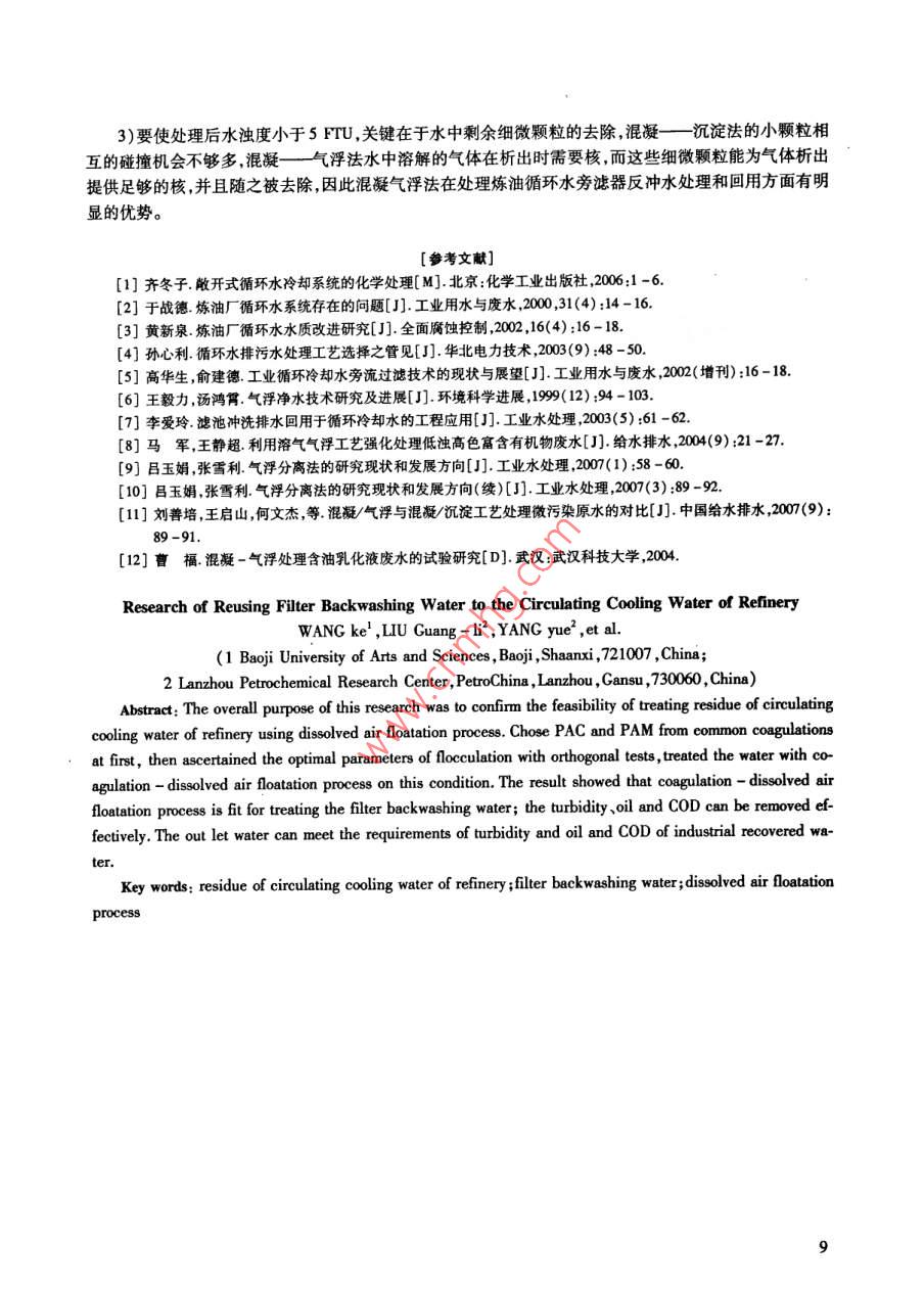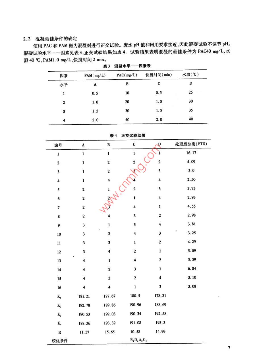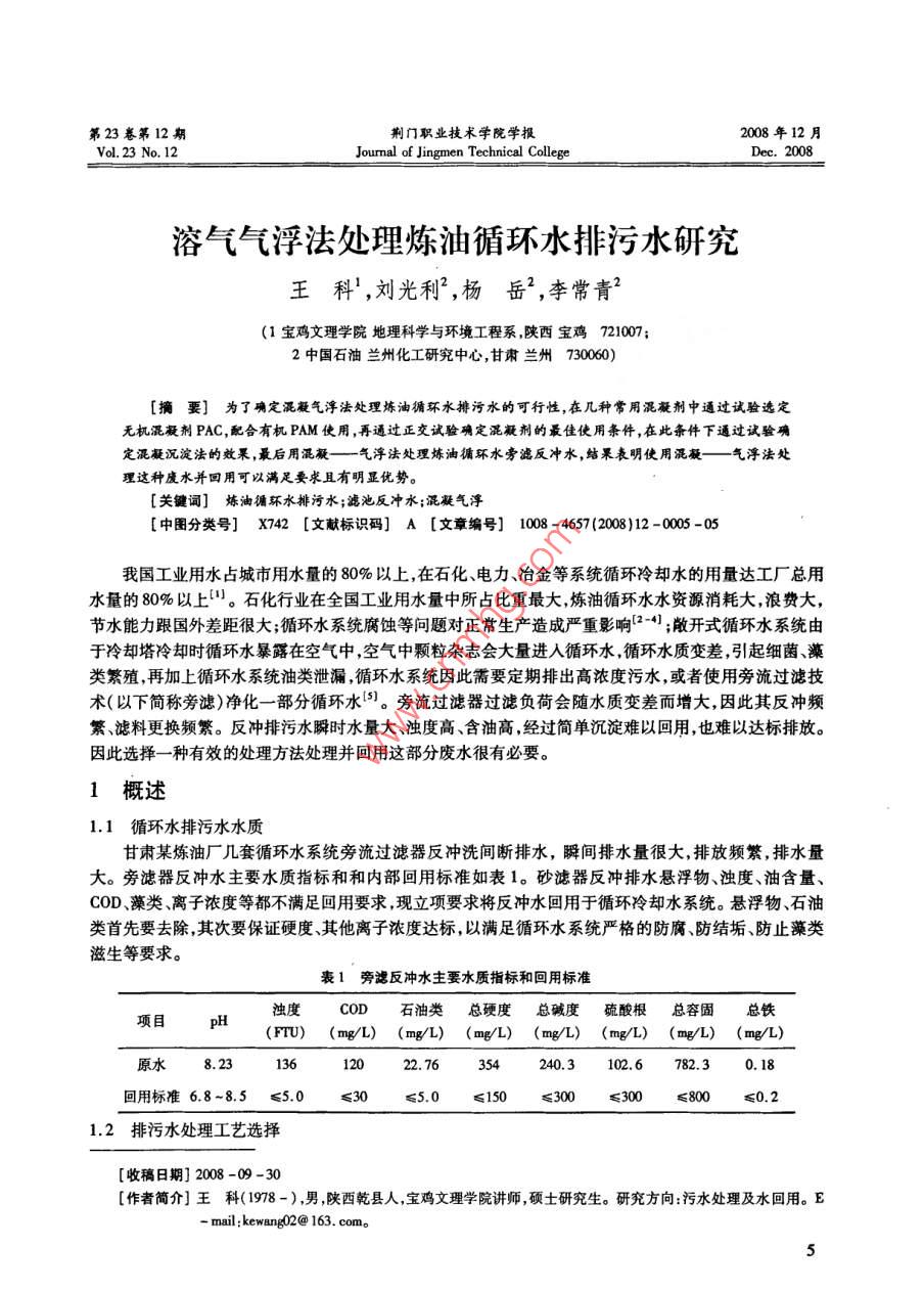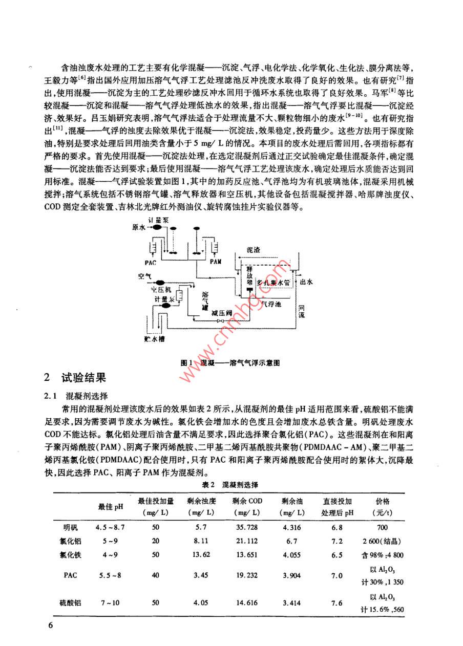第23卷第12期.荊門職業(yè)技術(shù)學院學報2008年12月Vol. 23 No. 12Joumal of Jingmen Technical CollegeDec.2008溶氣氣浮法處理煉油循環(huán)水排污水研究王科',劉光利",楊岳",李常青(1寶雞文理學院地理科學與環(huán)境工程系,陜西寶雞721007;2中國石油蘭州化工研究中心,甘肅蘭州730060)[摘要]為了確定混凝氣浮法處理煉油循環(huán)水排污水的可行性,在幾種常用混凝劑中通過試驗選定無機混凝劑PAC,配合有機PAM使用,再通過正交試驗確定混凝劑的最佳使用條件,在此條件下通過試驗確定混凝沉淀法的效果,最后用混凝一氣浮法 處理煉油循環(huán)水旁濾反沖水,結(jié)果表明使用混凝一氣浮 法處.理這種廢水并回用可以滿足要求且有明顯優(yōu)勢。.[關(guān)鍵詞]煉油循環(huán)水排污水;濾池反沖 水;混凝氣浮[中團分類號] X742 [文獻標識碼] A [文章編號] 1008 - 4657(2008)12 -0005 -05我國工業(yè)用水占城市用水量的80%以上,在石化、電力、冶金等系統(tǒng)循環(huán)冷卻水的用量達工廠總用水量的80%以上”。石化行業(yè)在全國工業(yè)用水量中所占比重最大,煉油循環(huán)水水資源消耗大,浪費大,節(jié)水能力跟國外差距很大;循環(huán)水系統(tǒng)腐蝕等問題對正常生產(chǎn)造成嚴重影響'2-4] ;敞開式循環(huán)水系統(tǒng)由于冷卻塔冷卻時循環(huán)水暴露在空氣中,空氣中顆粒雜志會大量進人循環(huán)水,循環(huán)水質(zhì)變差,引起細菌、藻類繁殖,再加上循環(huán)水系統(tǒng)油類泄漏,循環(huán)水系統(tǒng)因此需要定期排出高濃度污水,或者使用旁流過濾技術(shù)(以下簡稱旁濾)凈化--部分循環(huán)水[”。旁流過濾器過濾負荷會隨水質(zhì)變差而增大,因此其反沖頻繁、濾料更換頻繁。反沖排污水瞬時水量大、獨度高、含油高,經(jīng)過簡單沉淀難以回用,也難以達標排放。因此選擇-種有效的處理方法處理并回用這部分廢水很有必要。1概述1.1循環(huán)水排污水水質(zhì)甘肅某煉油廠幾套循環(huán)水系統(tǒng)旁流過濾器反沖洗間斷排水,瞬間排水量很大,排放頻繁,排水量大。旁濾器反沖水主要水質(zhì)指標和和內(nèi)部回用標準如表1。砂濾器反沖排水懸浮物濁度、油含量、COD、藻類、離子濃度等都不滿足回用要求,現(xiàn)立項要求將反沖水回用于循環(huán)冷卻水系統(tǒng)。懸浮物、石油類首先要去除,其次要保證硬度、其他離子濃度達標,以滿足循環(huán)水系統(tǒng)嚴格的防腐、防結(jié)垢、防止藻類滋生等要求。表1旁濾反沖水主要水質(zhì)指標和回用標準濁度COD石油類總硬度總堿度 硫酸根 總?cè)莨炭傝F項目pH(FTU)(mg/L) (mg/L) (mg/L) (mg/L) (mg/L) (mg/L) (mg/L)原水8.231362022. 76354240.3102. 6782. 3回用標準6.8~8.5 ≤5.0≤30≤5.0≤150≤300 ;≤300≤8001.2排污水處理工藝選擇[收稿日期] 2008 -09 -30[作者簡介]王科(1978-) ,男,陜西乾縣人,寶雞文理學院講師,碩士研究生。研究方向:污水處理及水回用。E- mail:kewang02@ 163. com。5含油濁廢水處理的工藝主要有化學混凝一沉淀 、氣浮、電化學法、化學氧化、生化法、膜分離法等,王毅力等l6]指出國外應(yīng)用加壓溶氣氣浮工藝處理濾池反沖洗廢水取得了良好的效果。也有研究門指出,使用混凝一沉淀為 主的工藝處理砂濾反沖水回用于循環(huán)水系統(tǒng)也取得了良好效果。馬軍8等比較混凝一-沉淀和混凝一 溶 氣氣浮處理低濁水的效果,指出混凝一-溶氣 氣浮要比混凝一沉淀經(jīng)濟、效果好。呂玉娟研究表明,溶氣氣浮法適合于處理流量不大、顆粒物細小的廢水9-10]。也有研究指出" ,混凝一氣浮 的濁度去除效果優(yōu)于混凝一沉淀法 ,效果穩(wěn)定,投藥量少。這些方法用于深度除油,特別是要求處理后回用油類含量小于5 mg/ L的情況。本項目的廢水處理后需回用,各項指標都有嚴格的要求。首先使用混凝一-沉淀法處理 ,在選定混凝劑后通過正交試驗確定最佳混凝條件,確定混凝一-沉淀法能否達到要求 ;最后使用混凝一溶 氣氣浮工藝處理該廢水,確定處理后水質(zhì)能否達到回用標準?;炷灰粴飧≡囼炑b置如圖1,其中的加藥反應(yīng)池氣浮池均為有機玻璃池體,混凝采用機械攪拌;溶氣系統(tǒng)包括不銹鋼溶氣罐、溶氣釋放器和空壓機,其他設(shè)備包括混凝攪拌器、哈那牌濁度儀、COD測定全套裝置、吉林北光牌紅外測油儀、旋轉(zhuǎn)腐蝕掛片實驗儀器等。計量泵原水可PACPAM●暴多孔集水管出水空壓機計盤參與氣浮池減壓間貯水槽團1混凝一 溶氣氣浮示意圖2試驗結(jié)果2.1混凝 劑選擇常用的混凝劑處理該廢水后的效果如表2所示,從混凝劑的最佳pH適用范圍來看,硫酸鋁不能滿足要求,因為需要調(diào)節(jié)廢水為堿性。氯化鐵會增加水的色度且會增加廢水總鐵含量。明礬處理廢水COD不能達標。氯化鋁處理后油含量不滿足要求,因此選擇聚合氯化鋁(PAC)。這些混凝劑在和陽離子聚丙烯酰胺( PAM)、陰離子聚丙烯酰胺、二甲基二烯丙基酰胺共聚物( PDMDAAC - AM)、聚二甲基二烯丙基氯化銨( PDMDAAC)配合使用時,只有PAC和陽離子聚丙烯酰胺配合使用時的絮體大,沉降最快,因此選擇PAC、陽離子PAM作為混凝劑。賀2 混凝劑選擇最佳投加量剩余濁度剩余COD剩余油直接投加價格最佳pH(mg/ L)處理后pH(元/t)明礬4.5-8.75035.7284.3166.8700氯化鋁5~9208.1121.1126.77.22 600(結(jié)晶)氯化鐵4~913.6213.6514.0556.5含98%:4800以Al2O,5.5~8403.4519. 2323.9047.0計30%,1 350硫酸