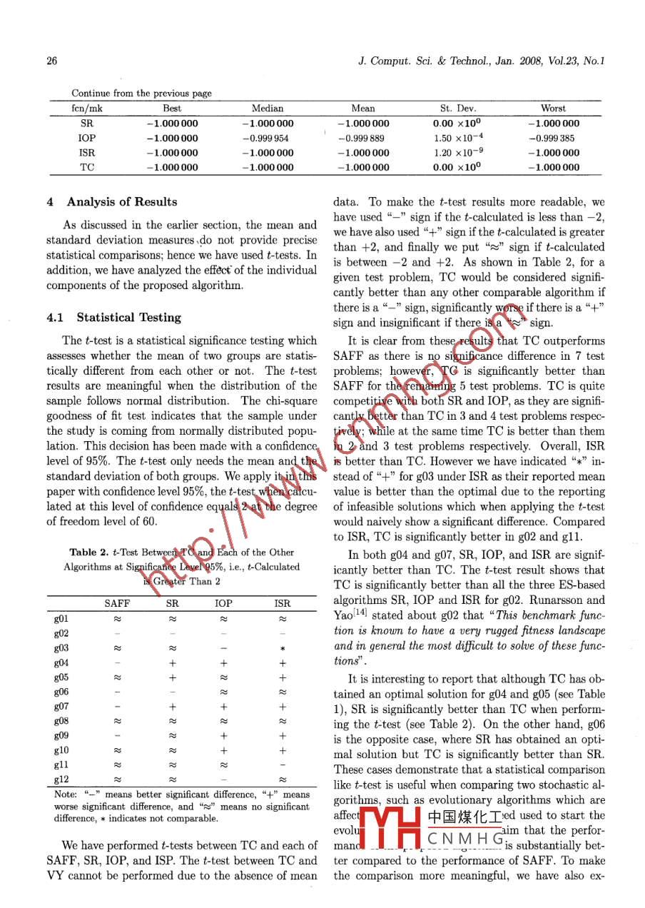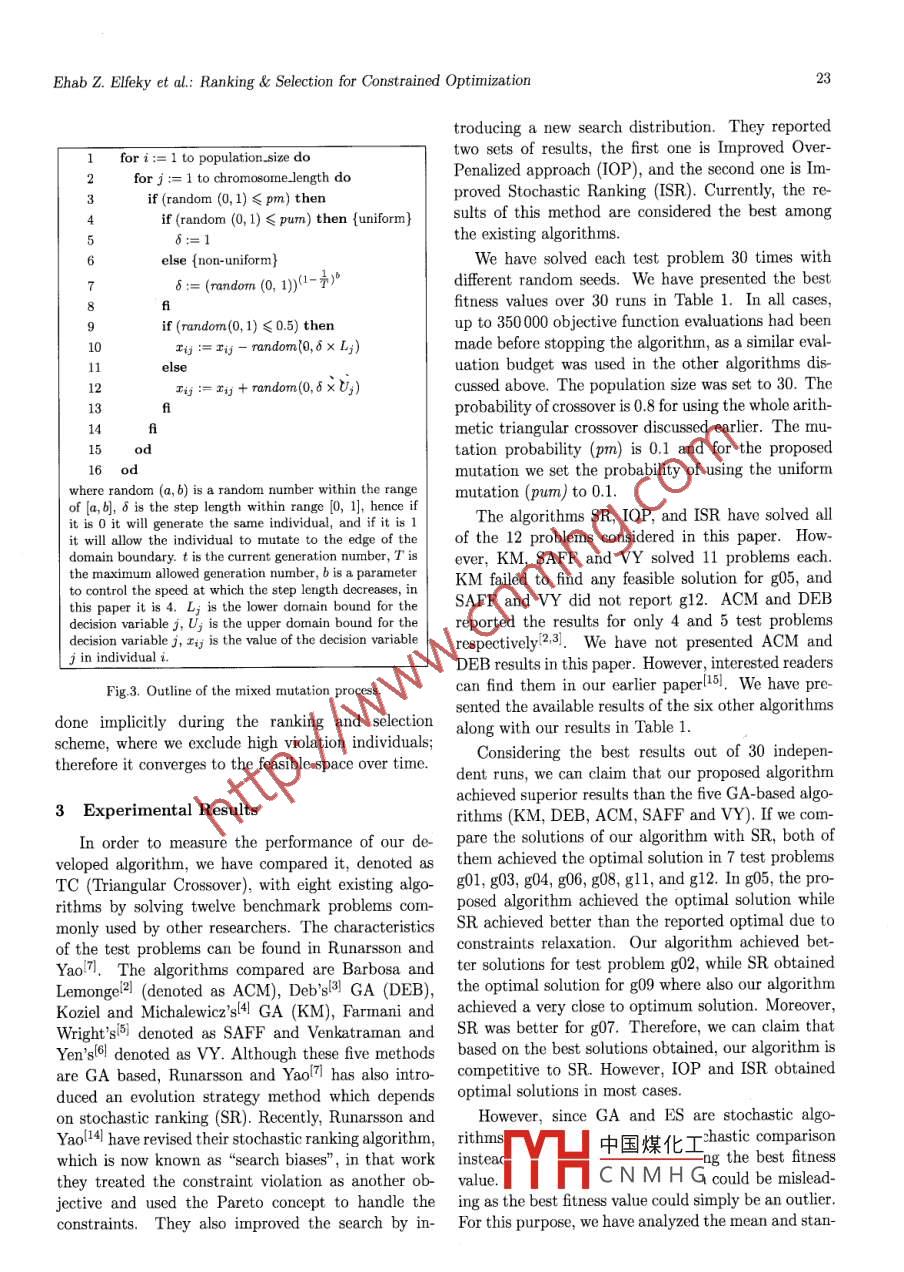 Elfeky EZ, Sarker RA, Essam DL. Analyzing the simple ranking and selection process for constrained evolutionaryoptimization. JOURNAL OF COMPUTER SCIENCE AND TECHNOLOGY 23(1): 19 34 Jan. 2008Analyzing the Simple Ranking and Selection Process for ConstrainedEvolutionary OptimizationEhab Z. Elleky, Ruhul A. Sarker, and Daryl L. EssamSchool of Information Technology and Elctrical Engineering, University of New South Wales, ADFA CampusCanberra 2600, AustraliaE-mail: {elfeky, r.sarker, d.essam }@adfa.edu.auRevised November 20, 2007.Abstract Many optimization problems that involve practical applications have functional constraints, and some ofthese constraints are active, meaning that they prevent any solution from improving the objective function value tothe one that is better than any solution lying beyond the constraint limits. Therefore, the optimal solution usuallylies on the boundary of the feasible region. In order to converge faster when solving such problems, a new rankingand selection scheme is introduced which exploits this feature of constrained problems. In conjunction with selection,a new crossover method is also presented based on three parents. When comparing the results of this new algorithmwith six other evolutionary based methods, using 12 benchmark problems from the literature, it shows very encouragingperformance. T-tests have been applied in this research to show if there is any statistically significance diferencesbetween the algorithms. A study has also been carried out in order to show the effect of each component of the proposedalgorithm.Keywords constrained continuous optimization, evolutionary computation, genetic algorithms, multi-parent crossover1 IntroductionLemongel2), Debl3), Koziel and Michalewicxl4, Far-mani and Wrightl5 and Venkatraman and Yenl6l andMany optimization problems are nonlinear and con-others) attempted to solve constrained problems us-strained. These problems can be represented as fol-ing traditional GAs. Also, Runarsson and Yaol7] delows:veloped an Evolution Strategies (ES) based approachfor solving constrained optimization problems. Theyminf(X),s.t. g;(X)≤0, i= 1,2...,m,showed that their algorithm outperforms GA based ap-h;(X)≤0,j= 1,2.....proaches for 12 well-known test problems. In this pa-Li≤x;≤U; i= 1,2...n,per, we analyze the different combinations of operators1)and mechanisms, in order to design a new GA basedwhere x∈R" is the vector of solutions x = approach for solving certain casses of constrained op-[x1,2..... The objective function is f(X), mtimization problems. For this purpose, we have de-is the mumber of inequality cnstraints, g(X) is the signed a new ranking and slection method, and a newi-th inequality constraint, p is the number of equalitycrossover method.constraints, and hj(X) is the j-th equality constraint.It is a common situation for many constrained op-Each deision variable has a lower bound L, and an timization problems that some constraints are activeat the global optimum point, thus the optimum pointupper bound U;.Over the last two decades, Evolutionary Algorithmslies on the boundary of the feasible spacel4l. This is(EAs) have proved themselves as global optimizationusually true for business applications with limited re-techniques. Among the evolutionary algorithms, Gsources. In such cases, it seems natural to restrict thenetic Algorithms (GAs) are the most widely usedsearch of the solution to near the boundary of the fea-technique for solving optimization problems. Con-sible space(8l. However, this may not be the situationstrained optimization problems have been consideredfor中國煤化工$ engineering designas dificult problems. Many researchers and practi- andAsYHCNMHGeyelementofGAs.tioners (including Mezura and Coellol1, Barbosa andRegular Paper20J. Comput. Sci & Technol, Jan. 2008, Vol.23, No.1Many studies have been carried out to show how this new offspring. There are three most commonly usedoperator afects the evolutionary process. The most ranking and selection methods. First, fitness propor-widely used crossover methods are k- point, uniform,. tional reproduction, in this scheme individuals are cho-intermediate, global discrete, order-based, and matrix- sen for selection in proportion to their fitness value.based[9]. Most of these crossovers are based on twoIn the second method, rank based selection, the popu-parents. However, Eiben et al.l10l introduced a multi- lation is sorted from best to worst; then the higherparent reproduction process to GAs. They have in- ranked individuals are given higher probabilities todicated that increasing the number of parents in the survivel9. The third method is tournament selection,crossover leads to more reliable offspring. As they re- where a random number of individuals are chosen fromported, performance increased up to a certain num- the population (with or without replacement) and theber of parents and then decreased. They concluded best individual from this group is chosen as a par-that the improvement was at the maximum level when ent for the next generation9. These processes are re-changing the number of parents from2 to3. So it was peated until the mating pool is flled. There are a va-not worthwhile going beyond 3 or 4 parentslo. Note riety of other selection methods, including stochasticthat Eiben et aliol have applied their genetic algo- methodsl7. In this paper, we introduce an algorithmrithm with a binary representation.which uses a tournament selection in some stages ofAs we are dealing with constrained problems, the the evolution process, and uses a new ranking methodfeasibility ratio (the ratio between the number of feasi- in other stages. This will be discussed later in moreble individuals and the total population size) plays an detail.important role in the search process and can thus beThe penalty function is the most widely usedconsidered as an indicator for diversity. Hence, a wider method to deal with constraints in constrained op-range of fea