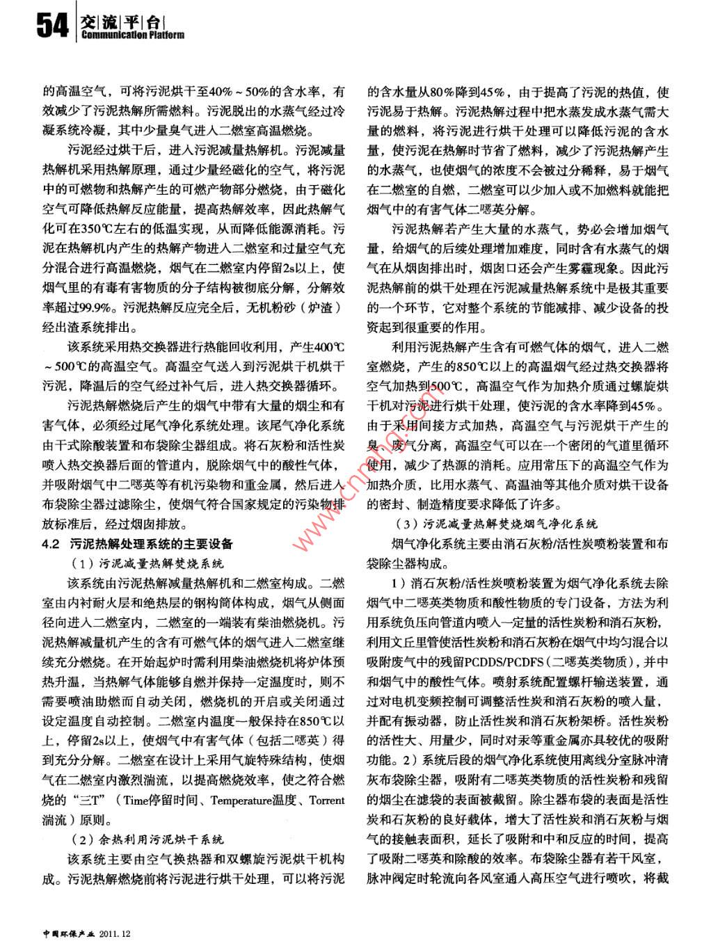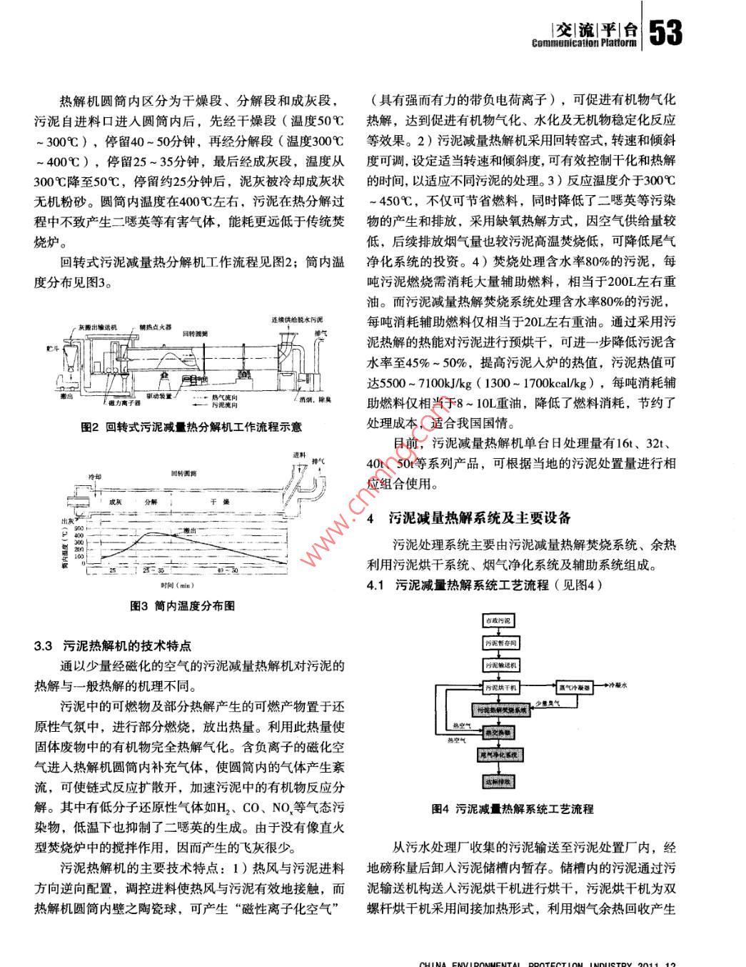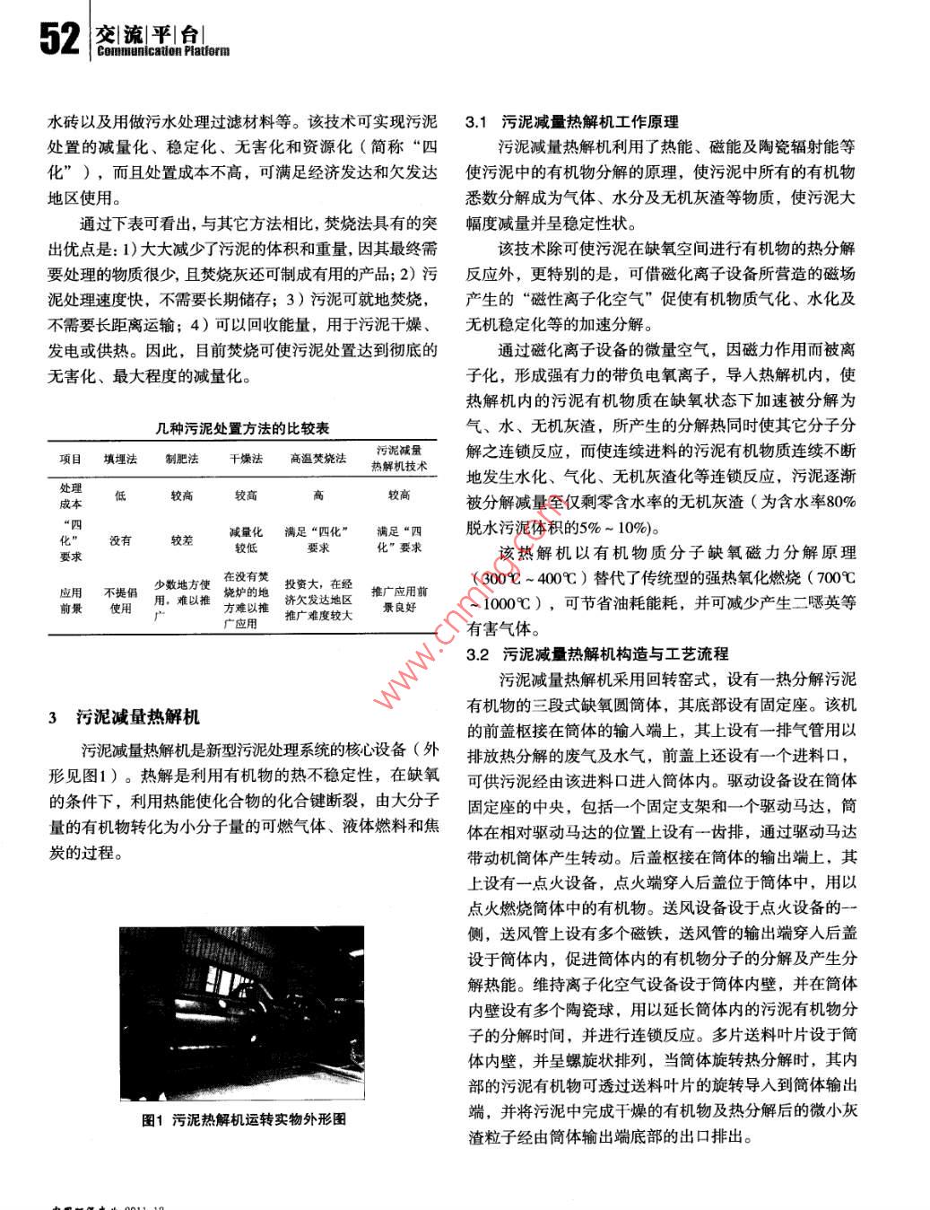 50交|流|平|臺(tái)|Communlcaton Platform污泥減量熱解機(jī)熱解焚燒技術(shù)概述黃家瑤,林秀梅(福建莊訊環(huán)??萍加邢薰?,福州350003)摘要:針對(duì)目前我國(guó)城市污水處理廠產(chǎn)生大量污泥, 二次污染現(xiàn)象日益嚴(yán)重的狀況,闡述了污泥的性質(zhì)特點(diǎn)及主要處理處置方法,介紹并分析了污泥減量熱解機(jī)熱解焚燒技術(shù)的工作原理、工作流程、技術(shù)特點(diǎn),以及污泥熱解處理系統(tǒng)的主要設(shè)備。關(guān)鍵詞:城市污泥;二次污染;污泥處理處置;污泥減量熱解機(jī)中圖分類號(hào):X703文獻(xiàn)標(biāo)志碼:A文章編號(hào):1006- -5377 (2011) 12- -0050-06根據(jù)國(guó)家環(huán)保部規(guī)劃,未來(lái)10年是我國(guó)污水處理利。本文著重介紹了該污泥減量熱解機(jī)熱解焚燒技術(shù)的的“黃金時(shí)期”,將建成上千座污水處理廠。而城市污工作原理、工作流程,以及污泥熱解處理系統(tǒng)的主要設(shè)水處理廠在污水處理的過程中必然會(huì)產(chǎn)生污泥,隨著城備和特點(diǎn)。市污水處理率的不斷提高,污泥的產(chǎn)量同樣在不斷增1污泥的種類及性質(zhì)特點(diǎn)大。據(jù)測(cè)算,到2010年底, 我國(guó)每天產(chǎn)生的污泥量(含水率80%~ 85%)至少已達(dá)到17.5萬(wàn)噸。污水處理廠每天1.1 污泥的種類排放的污泥中含有大量有機(jī)物和豐富的氮、磷等營(yíng)養(yǎng)物污泥是水處理過程中形成的以有機(jī)物為主要成分的質(zhì),任其排入水體,將會(huì)大量消耗水體中的氧,導(dǎo)致水泥狀物質(zhì), 其有機(jī)物含量高,容易腐爛發(fā)臭,顆粒較體水質(zhì)惡化,嚴(yán)重影響水生生物的生存;污泥中的營(yíng)養(yǎng)細(xì),密度較小,含水量高且不易脫水,是呈膠狀結(jié)構(gòu)的物質(zhì)又會(huì)使水體富氧化,藻類大量繁殖,從而使水質(zhì)惡親水性物質(zhì)?;?除此以外,污泥中還有多種有毒物質(zhì)、重金屬和致污泥的種類較多,分類較復(fù)雜。1)按來(lái)源分:可病菌、寄生蟲卵等有害物質(zhì),如果處理處置不當(dāng),就會(huì)分 為生活污水污泥(生活污水處理廠的終端廢棄物)、傳染疾病,污染土壤和作物,并通過生物鏈轉(zhuǎn)嫁人類。工業(yè)廢水污泥(如印染、造紙、電鍍、冶煉、機(jī)制、煉因此,污泥不經(jīng)妥善處理處置而任意排放和堆置,必將油、釀造、化工制藥等行業(yè)的終端排放廢棄物)和給水對(duì)周圍環(huán)境造成嚴(yán)重的污染,使已建成的污水處理廠“不污泥三大類。 2)按成分和性質(zhì)可分為:有機(jī)污泥和無(wú)能充分發(fā)揮其消除環(huán)境污染的作用。機(jī)污泥;親水性污泥和疏水性污泥。3)按污泥從水中國(guó)內(nèi)企業(yè)引進(jìn)了日本和我國(guó)臺(tái)灣地區(qū)先進(jìn)的污泥處分離過程可分為:沉淀污泥(包括初沉污泥、混凝沉淀理處置專利技術(shù),并經(jīng)過引進(jìn)、消化吸收和改進(jìn),充分污泥、 化學(xué)沉淀污泥等)及生物污泥(包括腐殖污泥、利用污泥熱解焚燒的自身熱量對(duì)污泥進(jìn)行預(yù)烘干脫水,剩余活性污泥)。4)按污泥在不同的處理階段可分為:改進(jìn)技術(shù)工藝,大大降低污泥處理成本,研發(fā)出了適合生污泥、 濃縮污泥、消化污泥(熟污泥)、脫水污泥、我國(guó)國(guó)情的污泥減量熱解機(jī),并已獲中國(guó)實(shí)用新型專干污泥、干燥污泥及污泥焚燒灰等。交|流|平|臺(tái)51Comnunication Pattorn1.2我國(guó)市政污水處理廠的污泥性質(zhì)特點(diǎn)埋場(chǎng)填埋。填埋法的處理成本較低,但污泥黏稠,不能(1)有機(jī)物含量較低堆積,影響垃圾填埋場(chǎng)的機(jī)械作業(yè),縮短垃圾填埋場(chǎng)的我國(guó)城市居民食品結(jié)構(gòu)不同,居民住宅衛(wèi)生設(shè)施還使用壽命。由于垃圾填埋場(chǎng)大多為露天,簡(jiǎn)單處理后的不完善,公共廁所污水未能全部排人污水管網(wǎng),加之工污泥的穩(wěn)定狀態(tài)很容易被打破,經(jīng)過幾場(chǎng)雨后恢復(fù)原形業(yè)廢水密度較大,城市環(huán)境衛(wèi)生比發(fā)達(dá)國(guó)家差,大量無(wú)的污泥對(duì)場(chǎng)地的安全會(huì)構(gòu)成嚴(yán)重危害。含水率高的污泥機(jī)粉塵進(jìn)人城市下水道,污泥無(wú)機(jī)物組分增加,有機(jī)物滲濾液量也顯著增加,而且污泥很容易堵塞垃圾填埋場(chǎng)含量一般只在50%左右。而發(fā)達(dá)國(guó)家城市污水污泥的有的滲濾液管道,影響其排水系統(tǒng)的正常運(yùn)行。同時(shí)還存機(jī)組分為70% ~ 80%在滲漏污水、排放沼氣等二次污染,基本沒有實(shí)現(xiàn)污泥(2)碳水化合物含量高的減量化、穩(wěn)定化、無(wú)害化和資源化,國(guó)家已逐漸限制我國(guó)城市居民的食品結(jié)構(gòu)以糧食、植物油、蔬菜和該法的應(yīng)用。在我國(guó),填埋法在短期內(nèi)還是-一個(gè)重要的豆制品為主,人均消費(fèi)的肉類和奶制品很少,所以污水中過渡性處置途徑,但由于填埋法作業(yè)難度大和滲濾液對(duì)VSS較低,有機(jī)組分中淀粉、糖類和纖維素等碳水化合物環(huán)境的污染,該方式終將會(huì)被淘汰。密度大,而脂肪含量低,因此我國(guó)市政污泥屬高碳水化合.2 制肥法物、低脂肪的污泥。如天津紀(jì)莊子污水處理廠二次沉淀池該法是將污水處理廠的污泥采用生物方法,通過微污泥的有機(jī)