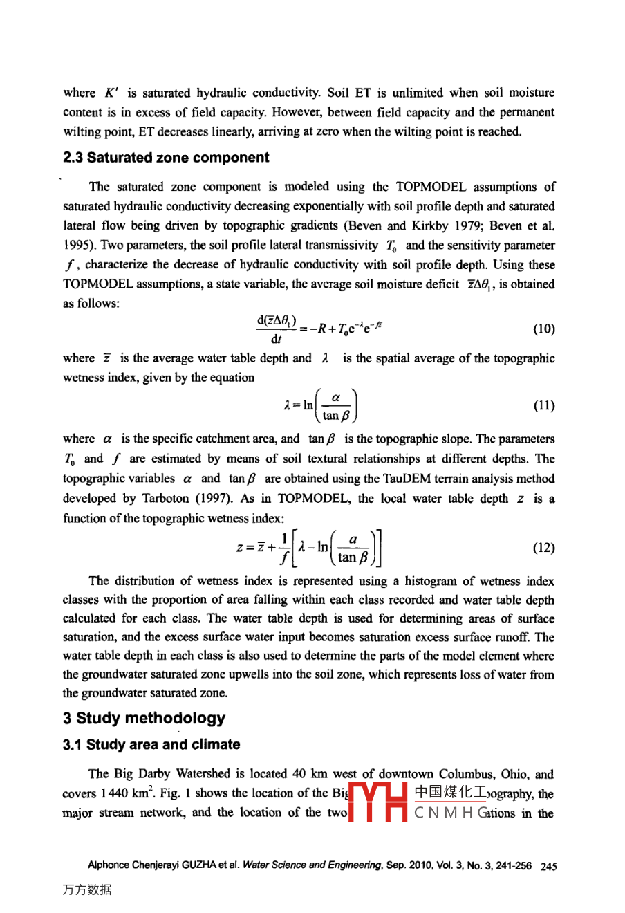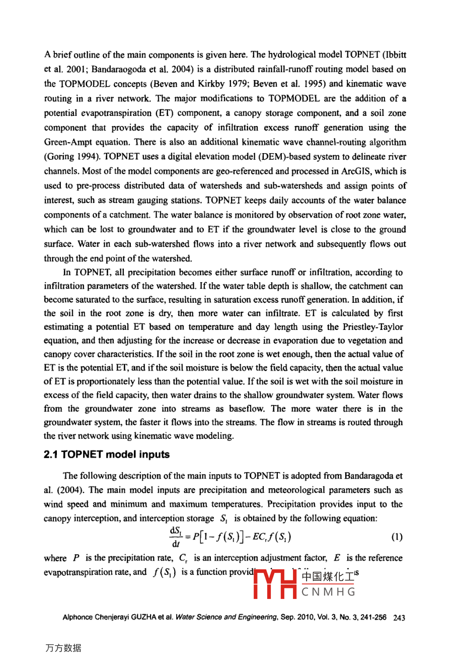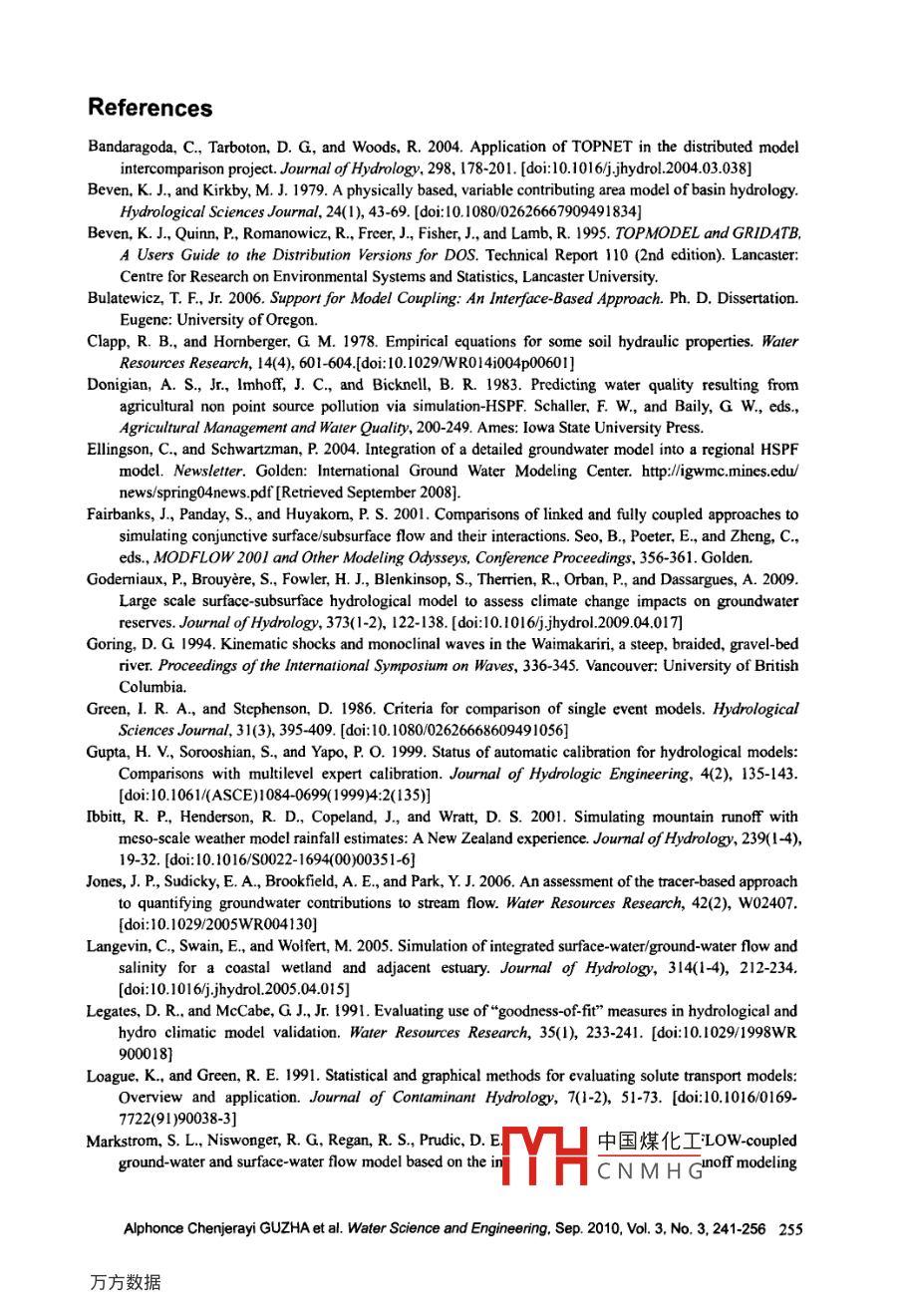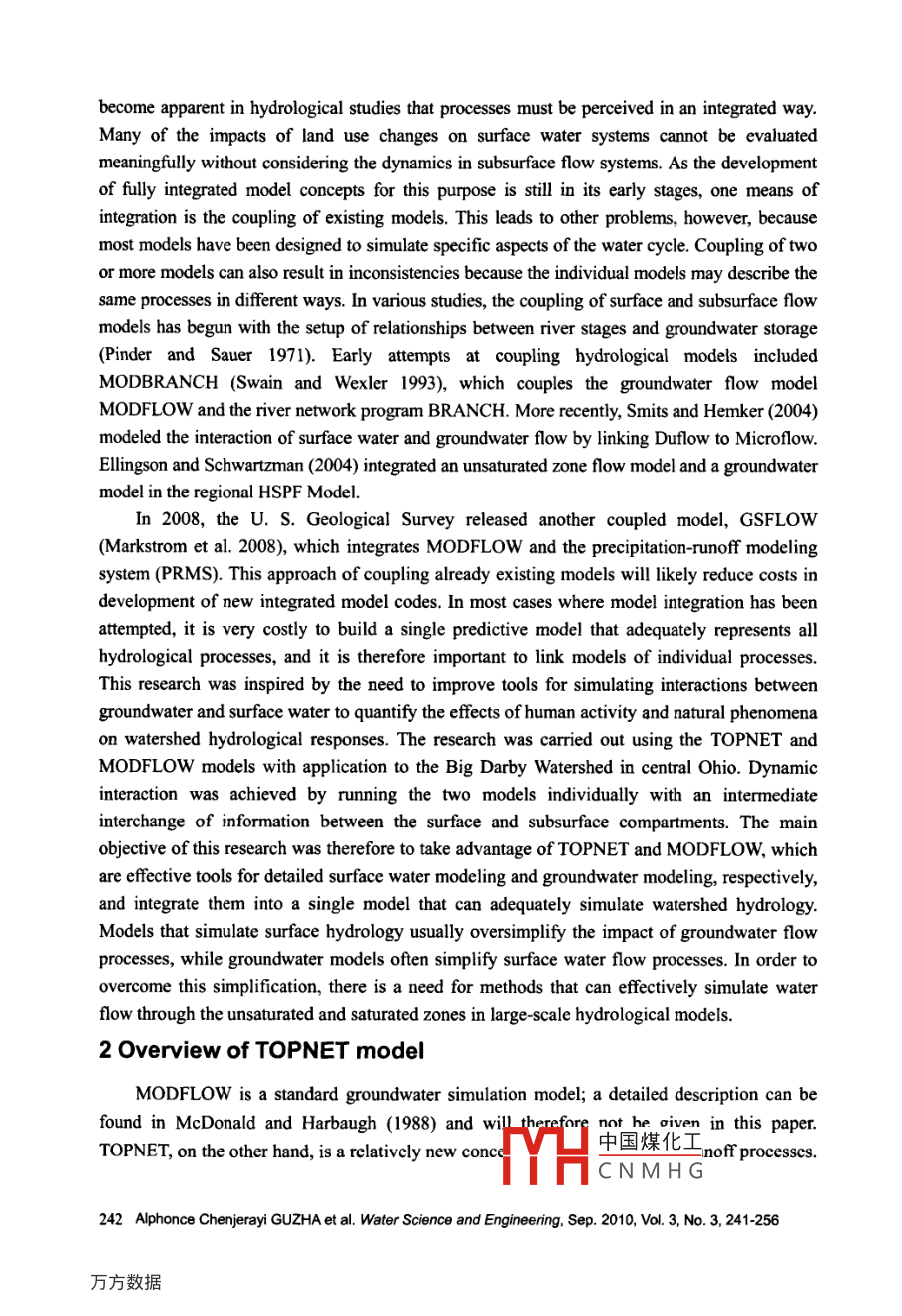 DEWater Science and Engineering, 2010, 3(3): 241-256doi:10.3882/.issn. 1674-2370.2010.03.001http://www.waterjournal.cne-mail: wse2008@vip.163.comSimulating streamflow and water table depth with acoupled hydrological modelAlphonce Chenjerayi GUZHA*l, Thomas Byron HARDY21. Department of Agriculural and Biological Engineering, Southwest Florida Research and Education Center,Universiy of Florida, Immokalee, FL 34142, USA2. River Systems Institute, Texas State Universiy, San Marcos, Texas 78666, USAAbstract: A coupled model integrating MODFLOW and TOPNET with the models interactingthrough the exchange of recharge and baseflow and river-aquifer interactions was developed andapplied to the Big Darby Watershed in Ohio, USA. Calibration and validation results show thatthere is generally good agreement between measured streamflow and simulated results from thecoupled model. At two gauging stations, average goodness of ft (R2 ), percent bias (P), andNash Sutcliffe eficiency ( Ems ) values of 0.83, 11.15%, and 0.83, respectively, were obtained forsimulation of streamflow during calibration, and values of 0.84, 8.75%, and 0.85, respectively,were obtained for validation. The simulated water table depths yielded average R2 values of 0.77and 0.76 for calibration and validation, respectively. The good match between measured andsimulated streamflows and water table depths demonstrates that the model is capable of adequatelysimulating strearmflows and water table depths in the watershed and also capturing the influence ofspatial and temporal variation in recharge.Key words: hydrological modeling; model coupling; streamflow; groundwater; TOPNET model;MODFLOW model; Big Darby Watershed1 IntroductionIn recent years, integrated surface-subsurface modeling tools have evolved rapidly andare now being applied in various watershed hydrology studies in different parts of the world.Studies include those by Markstrom et al. (2008), Panday and Huyakom (2004), Jones et al.(2006), and Wermer et al. (2006). The application of coupled models provides evidence of thecapacity of these models to produce realistic catchment behavior. However, as stated byNemeth and Solo-Gabriele (2003), linking groundwater and surface water models isfrequently problematic because the models use different sets of goverming equations.Additionally, the time scale is usually longer for groundwater modeling than for surfacewater modeling.Considerable effort has been expended to characterize the physical, chemical, and biologicalprocesses affecting groundwater and surface water resour中國煤化工pecause it has:TYHCNMHG*Corresponding author (e mail: acguzha@uf1.edu)Received Dec. 10 2009; accepted Jun. 1, 2010become apparent in hydrological studies that processes must be perceived in an integrated way.Many of the impacts of land use changes on surface water systems cannot be evaluatedmeaningfully without considering the dynamics in subsurface flow systems. As the developmentof fully integrated model concepts for this purpose is still in its early stages, one means ofintegration is the coupling of existing models. This leads to other problems, however, becausemost models have been designed to simulate specific aspects of the water cycle. Coupling of twoor more models can also result in inconsistencies because the individual models may describe thesame processes in different ways. In various studies, the coupling of surface and subsurface flowmodels has begun with the setup of relationships between river stages and groundwater storage(Pinder and Sauer 1971). Early attempts at coupling hydrological models includedMODBRANCH (Swain and Wexler 1993), which couples the groundwater flow modelMODFLOW and the river network program BRANCH. More recently, Smits and Hemker (2004)modeled the interaction of surface water and groundwater flow by linking Duflow to Microflow.Ellingson and Schwartzman (2004) integrated an unsaturated zone flow model and a groundwatermodel in the regional HSPF Model.In 2008, the U. S. Geological Survey released another coupled model, GSFLOW(Markstrom et al. 2008), which integrates MODFLOW and the precipitation-runoff modelingsystem (PRMS). This approach of coupling already existing models will likely reduce costs indevelopment of new integrated model codes. In most cases where model integration has beenattempted, it is very costly to build a single predictive model that adequately represents allhydrological processes, and it is therefore important to link models of individual processes.This research was inspired by the need to improve tools for simulating interactions betweengroundwater and surface water to quantify the effects of human activity and natural phenomenaon watershed hydrological responses. The research was carried out using the TOPNET andMODFLOW models with application to the Big Darby Watershed in central Ohio. Dynamicinteraction was achieved by running the two models individually with an intermediateinterchange of information between the surface and subsurface compartments. The mainobjective of this research was therefore to take advantage of TOPNET and MODFLOW, whichare effective tools for detailed surface water modeling and groundwater modeling, respectively,and integrate them into a single model that can adequately simulate watershed hydrology.Models that simulate surface hydrology usually oversimplify the impact of groundwater flowprocesses, while groundwater models often simplify surface water flow processes. In order toovercome this simplification, there is a need for methods that can effectively simulate waterflow through the unsaturated and saturated zones in large -scale hydrological models.2 Overview of TOPNET modelMODFLOW is a standard groundwater simulation model; a detailed description can befound in McDonald and Harbaugh (1988) and will therefore not he oiven in this paper.TOPNET, on the other hand, is a relatively new conce中國煤化工nof pocesse..sCNMHG242 Alphonce Chenjerayi GUZHA et al. Water Scien