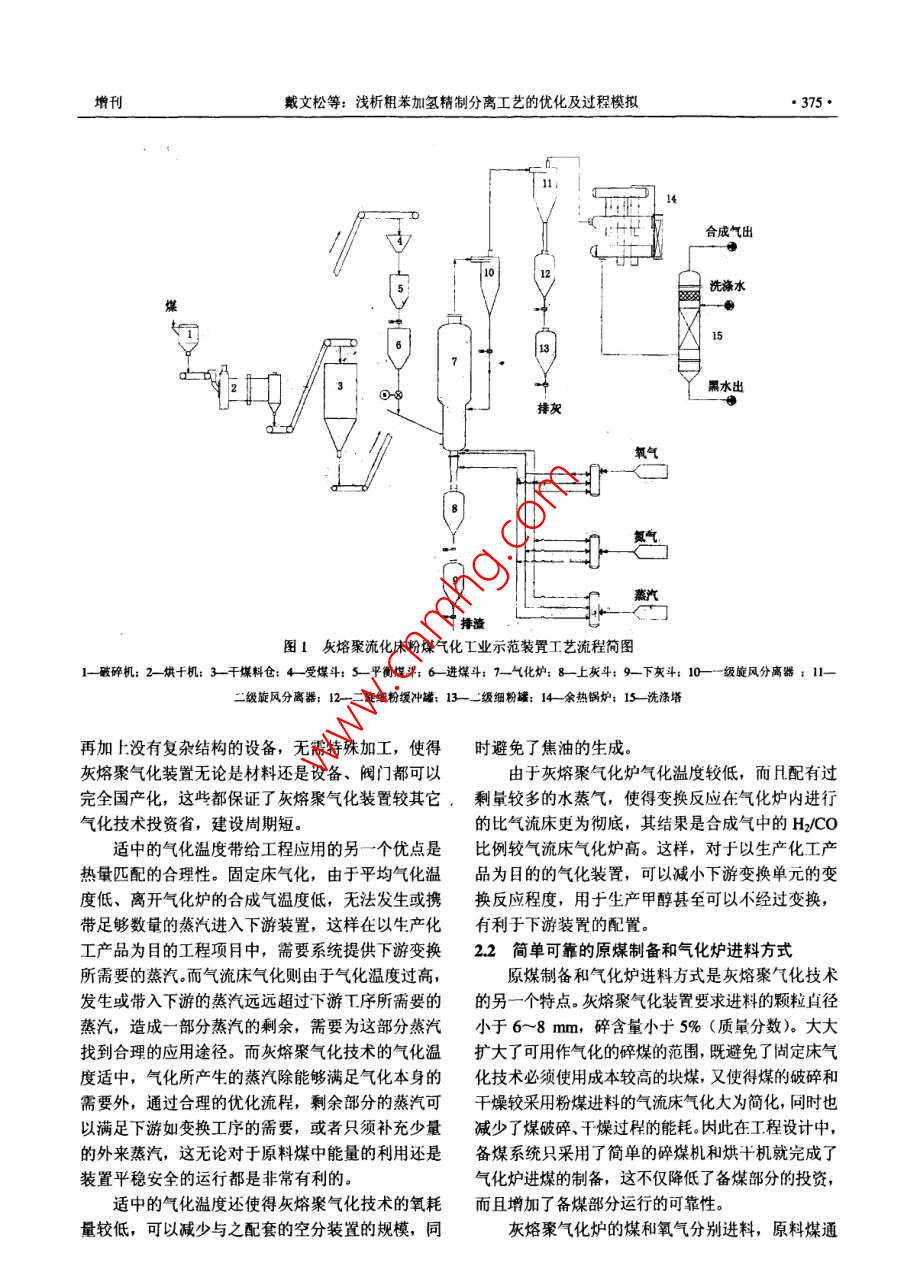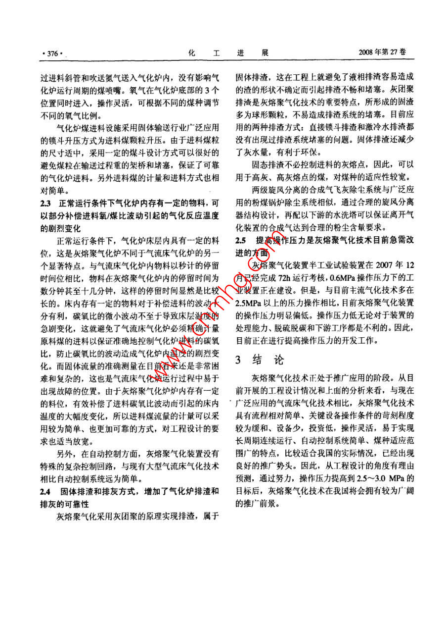 化工進(jìn)展374 CHEMICAL INDUSTRY AND ENGINEERING PROGRESS2008年第27卷增刊淺析灰熔聚氣化技術(shù)的工程特點(diǎn)戴文松,蔣榮興,郭志雄,張蓉生(中國(guó)石化工程建設(shè)公司,北京100101)摘要:系統(tǒng)分析了灰熔聚氣化技術(shù)的工程特點(diǎn),指出這些特點(diǎn)從工程設(shè)計(jì)的角度分析易于實(shí)現(xiàn)長(zhǎng)周期連續(xù)運(yùn)行,適合在化工領(lǐng)域應(yīng)用。關(guān)鍵詞:煤氣化;灰熔聚流化床氣化;工程技術(shù)灰熔聚流化床粉煤氣化技術(shù)是中國(guó)科學(xué)院山西(1)備煤部分粒徑0~30mm的原料煤(焦),煤炭化學(xué)研究所經(jīng)過(guò)二十余年研究、中國(guó)石化工程篩分、破碎到0~8mm粒度,在回轉(zhuǎn)干燥器中烘干建設(shè)公司參加加壓工程技術(shù)開發(fā),具有自主知識(shí)產(chǎn)(煙煤水分<5%,褐煤水分<12%)待用。權(quán)的氣化技術(shù)。應(yīng)用該技術(shù)的半工業(yè)試驗(yàn)裝置于(2)進(jìn)料部分入爐煤經(jīng)進(jìn)煤鎖斗系統(tǒng),由星2007年12月完成了1.0M操作壓力的72運(yùn)行型給料機(jī)計(jì)量,氣力輸送進(jìn)入氣化爐下部??己?0.6MPa操作壓力的工業(yè)示范裝置正在建設(shè)。(3)供氣部分氣化劑(空氣/蒸汽、氧氣/蒸汽)本文僅從工程設(shè)計(jì)的角度對(duì)灰熔聚氣化技術(shù)的特點(diǎn)分三路計(jì)量調(diào)節(jié)進(jìn)入氣化爐。進(jìn)行分析。(4)氣化部分煤在氣化爐中部分燃燒產(chǎn)生的1灰熔聚氣化技術(shù)簡(jiǎn)介高溫下(950~1100℃)一次實(shí)現(xiàn)破粘、脫揮發(fā)分、氣化、灰團(tuán)聚及分離、焦油及酚類的裂解等過(guò)程,11灰熔聚氣化技術(shù)的原理生成煤氣灰熔聚流化床粉煤氣化技術(shù)以碎煤為原料(<(5)除塵部分高溫煤氣帶出的飛灰,大部分6~8mm),采用空氣、富氧或氧氣為氧化劑,水蒸經(jīng)一級(jí)旋風(fēng)分離器捕集,返回氣化爐進(jìn)一步氣化,氣或二氧化碳為氣化劑,在適當(dāng)?shù)拿毫6群蜌馑傧?二級(jí)旋風(fēng)分離器捕集的少量飛灰排出系統(tǒng)。使床層中粉煤沸騰,床中物料強(qiáng)烈返混,氣固兩相(6)廢熱回收系統(tǒng)及煤氣凈化部分除塵后充分混合,溫度到處均一,煤在床內(nèi)部分燃燒產(chǎn)生的熱煤氣依次進(jìn)入廢熱鍋爐、蒸汽過(guò)熱器和脫氧水的高溫下一次實(shí)現(xiàn)破粘、脫揮發(fā)分、氣化、灰團(tuán)聚預(yù)熱器回收熱量,再經(jīng)洗滌塔凈化冷卻,送至下一及分離、焦油及酚類的裂解等過(guò)程,完成煤的氣化。工序?;胰劬哿骰补に囘x擇性排灰技術(shù)使?fàn)t內(nèi)保持較高的碳含量,從而將操作溫度比傳統(tǒng)流化床提高2灰熔聚氣化技術(shù)的工程特點(diǎn)100~200℃,大大拓寬了適用煤種的范圍。2.1適中的氣化溫度灰熔聚流化床氣化技術(shù)核心如下?;胰劬蹥饣夹g(shù)屬于流化床氣化,具有流化床(1)固流態(tài)化適當(dāng)氣速使煤沸騰流化傳熱氣化技術(shù)適中氣化溫度的特點(diǎn)。氣化爐內(nèi)的平均溫傳質(zhì)性能好;氣化強(qiáng)度高;可用碎煤為原料。度通常在1000℃左右,從工程角度來(lái)說(shuō),這個(gè)溫(2)中心射流形成局部高溫區(qū)提高氣化強(qiáng)度無(wú)論對(duì)于材料的選擇還是結(jié)構(gòu)的設(shè)計(jì)都在現(xiàn)今具度;促使灰渣團(tuán)聚。有大量應(yīng)用經(jīng)驗(yàn)的工程技術(shù)范圍內(nèi)。如灰熔聚氣化(3)灰渣團(tuán)聚重力分離選擇性排出低炭含量技術(shù)的幾個(gè)關(guān)鍵設(shè)備氣化爐耐磨襯里、高溫和灰渣;爐料炭含量高結(jié)渣風(fēng)險(xiǎn)小;爐溫提高煤種適高壓旋風(fēng)分離器、耐高溫固體閥門、高溫高壓余熱應(yīng)性寬。鍋爐在煉油、石化行業(yè)都有操作條件相近的類似設(shè)(4)飛灰可控循環(huán)提高碳轉(zhuǎn)化率。備。因此,在灰熔聚氣化技術(shù)的操作溫度下,許多1.2工藝流程關(guān)鍵設(shè)備的開發(fā)都可以借鑒現(xiàn)有技術(shù)的工程經(jīng)驗(yàn),灰熔聚氣化裝置主要由備煤、進(jìn)料、供氣、氣避免了從毫無(wú)經(jīng)驗(yàn)的起點(diǎn)出發(fā)而造成的工程風(fēng)險(xiǎn)和化、除塵和余熱回收及凈化幾個(gè)主要部分組成見過(guò)高的設(shè)備投資。圖1。氣化溫度適中,可以借鑒現(xiàn)有技術(shù)的工程經(jīng)驗(yàn)增刊戴文松等:淺析粗苯加氫精制分離工藝的優(yōu)化及過(guò)程模擬375合成氣出煤洗滌水13黑水出排灰氧氣蒸汽排渣圖1灰熔聚流化床粉煤氣化工業(yè)示范裝置工藝流程簡(jiǎn)圖1-破碎機(jī):2-烘干機(jī):3-干煤料倉(cāng):4受煤斗:5平衡斗:6進(jìn)煤斗:7-氣化爐:8—上灰斗:9下灰斗:10——級(jí)旋風(fēng)分離器:11二級(jí)旋風(fēng)分離器:12—二旋細(xì)粉緩沖罐:13—二級(jí)細(xì)粉罐:14余熱鍋爐:15洗滌塔再加上沒(méi)有復(fù)雜結(jié)構(gòu)的設(shè)備,無(wú)需特殊加工使得時(shí)避免了焦油的生成?;胰劬蹥饣b置無(wú)論是材料還是設(shè)備、閥門都可以由于灰熔聚氣化爐氣化溫度較低,而且配有過(guò)完全國(guó)產(chǎn)化,這些都保證了灰熔聚氣化裝置較其它,剩量較多的水蒸氣,使得變換反應(yīng)在氣化爐內(nèi)進(jìn)行氣化技術(shù)投資省,建設(shè)周期短。的比氣流床更為徹底,其結(jié)果是合成氣中的H2/CO適中的氣化溫度帶給工程應(yīng)用的另一個(gè)優(yōu)點(diǎn)是比例較氣流床氣化爐高。