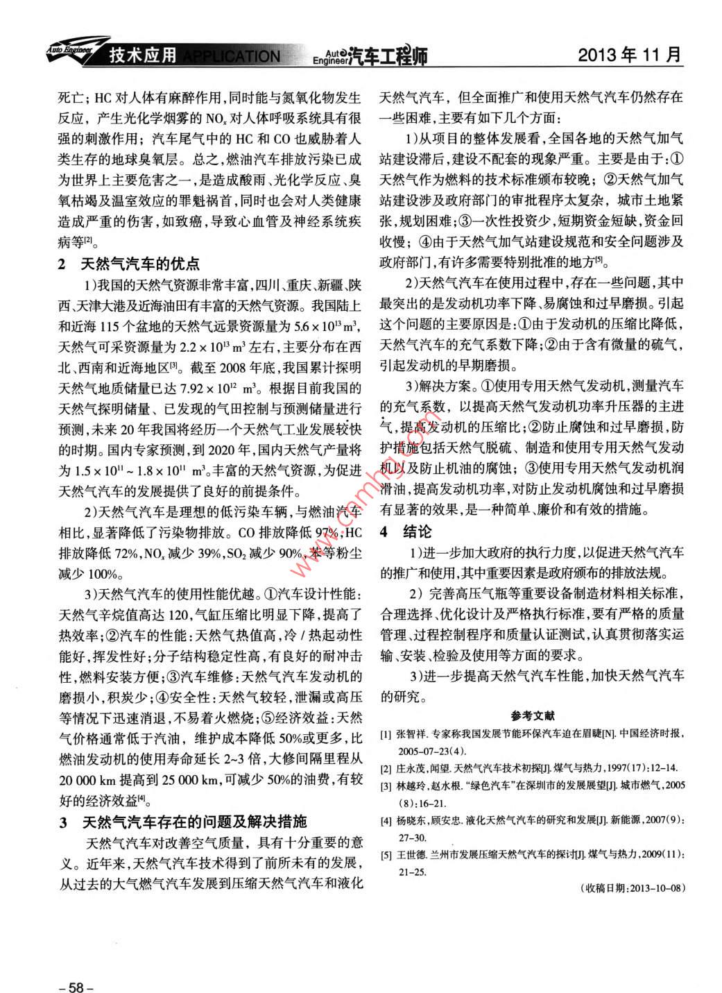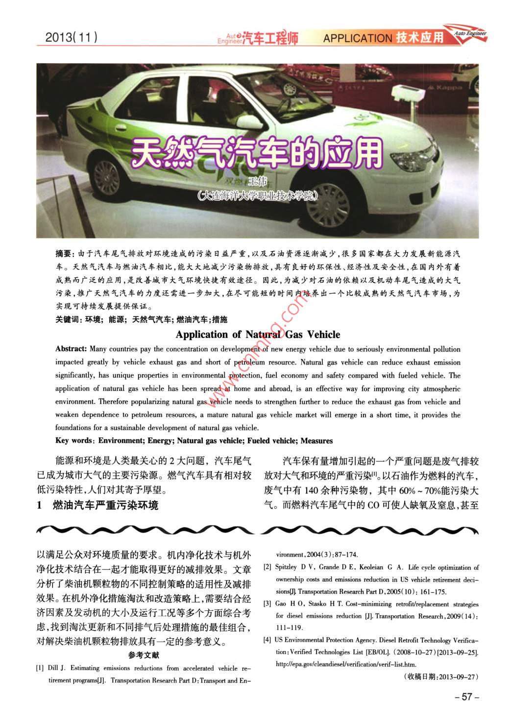2013(11)汽車工程師 APPLICATION技術(shù)應(yīng)用天然氣洗車的應(yīng)用雙偉摘要:由于汽車尾氣排放對環(huán)境造成的污染日益嚴(yán)重,以及石油資源逐漸減少,很多國家都在大力發(fā)展新能源汽車。天然氣汽車與燃油汽車相比,能大大地減少污染物排放,具有良好的環(huán)保性、經(jīng)濟(jì)性及安全性,在國內(nèi)外有著成熟而廣泛的應(yīng)用,是改善城市大氣環(huán)境快捷有效途徑。因此,為減少對石油的依賴以及機(jī)動車尾氣造成的大氣污染,推廣天然氣汽車的力度還需進(jìn)一步加大,在盡可能短的時間內(nèi)培養(yǎng)出一個比較成熟的天然氣汽車市場,為實現(xiàn)可持續(xù)發(fā)展提供保證。關(guān)鍵詞:環(huán)境;能源;天然氣汽車;燃油汽車;措施Application of Natural Gas VehicleAbstract: Many countries pay the concentration on development of new energy vehicle due to seriously environmental pollutionimpacted greatly by vehicle exhaust gas and short of petroleum resource. Natural gas vehicle can reduce exhaust emissionsignificantly, has unique properties in environmental protection, fuel economy and safety compared with fueled vehicle.Theapplication of natural gas vehicle has been spread at home and abroad, is an effective way for improving city atmosphericenvironment. Therefore popularizing natural gas vehicle needs to strengthen further to reduce the exhaust gas from vehicle andweaken dependence to petroleum resources, a mature natural gas vehicle market will emerge in a short time, it provides thefoundations for a sustainable development of natural gas vehicleKey words: Environment; Energy; Natural gas vehicle; Fueled vehicle; Measures能源和環(huán)境是人類最關(guān)心的2大問題,汽車尾氣汽車保有量增加引起的一個嚴(yán)重問題是廢氣排較已成為城市大氣的主要污染源。燃?xì)馄嚲哂邢鄬^放對大氣和環(huán)境的嚴(yán)重污染。以石油作為燃料的汽車低污染特性,人們對其寄予厚望。廢氣中有140余種污染物,其中60%~70%能污染大1燃油汽車嚴(yán)重污染環(huán)境氣。而燃料汽車尾氣中的CO可使人缺氧及窒息,甚至以滿足公眾對環(huán)境質(zhì)量的要求。機(jī)內(nèi)凈化技術(shù)與機(jī)外onme200(3):87-174凈化技術(shù)結(jié)合在一起才能取得更好的減排效果。文章2 pitzley D, Grande D E, Keoleian G A. Life cycle optimization of分析了柴油機(jī)顆粒物的不同控制策略的適用性及減排ownership costs and emissions reduction in US vehicle retirement decinsp Transportation Research Part D, 2005(10): 161-175.效果。在機(jī)外凈化措施淘汰和改造策略上,需要結(jié)合經(jīng)3cmHo, Stasko H T. Cost-minimizing retrofit/replacement strategie濟(jì)因素及發(fā)動機(jī)的大小及運行工況等多個方面綜合考for diesel emissions reduction [J]. Transportation Research, 2009(14)慮,找到淘汰更新和不同排氣后處理措施的最佳組合,11對解決柴油機(jī)顆粒物排放具有一定的參考意義。[4]US Environmental Protection Agency. Diesel Retrofit Technology Verifica-參考文獻(xiàn)tion: Verified Technologies List [EB/OL].(2008-10-27)[2013-09-25][1 Dill J. Estimating emissions reductions from accelerated vehicle re-http://epa.gow/cleandiesel/verification/verif-list.htmtirement programs[J]. Transportation Research Part D: Transport and En-(收稿日期:2013-09-27)技術(shù)應(yīng)用0N劍時汽車工程師2013年11月死亡;HC對人體有麻醉作用,同時能與氮氧化物發(fā)生天然氣汽車,但全面推廣和使用天然氣汽車仍然存在反應(yīng),產(chǎn)生光化學(xué)煙霧的NO對人體呼吸系統(tǒng)具有很一些困難,主要有如下幾個方面:強(qiáng)的刺激作用;汽車尾氣中的HC和CO也威脅著人1)從項目的整體發(fā)展看,全國各地的天然氣加氣類生存的地球臭氧層。總之燃油汽車排放污染已成站建設(shè)滯后,建設(shè)不配套的現(xiàn)象嚴(yán)重。主要是由于:①為世界上主要危害之一,是造成酸雨、光化學(xué)反應(yīng)、臭天然氣作為燃料的技術(shù)標(biāo)準(zhǔn)頒布較晚;②天然氣加氣氧枯竭及溫室效應(yīng)的罪魁禍?zhǔn)?同時也會對人類健康站建設(shè)涉及政府部門的審批程序太復(fù)雜,城市土地緊造成嚴(yán)重的傷害,如致癌,導(dǎo)致心血管及神經(jīng)系統(tǒng)疾張,規(guī)劃困難;③一次性投資少,短期資金短缺,資金回病等。收慢;④由于天然氣加氣站建設(shè)規(guī)范和安全問題涉及2天然氣汽車的優(yōu)點政府部門,有許多需要特別批準(zhǔn)的地方。1)我國的天然氣資源非常豐富,四川、重慶、新疆、陜2)天然氣汽車在使用過程中,存在一些問題,其中西、天津大港及近海油田有豐富的天然氣資源。我國陸上最突出的是發(fā)動機(jī)功率下降、易腐蝕和過早磨損。引起和近海5個盆地的天然氣遠(yuǎn)景資源量為56×10°m,這個問題的主要原因是:①由于發(fā)動機(jī)的壓縮比降低,天然氣可采資源量為22×101m3左右,主要分布在西天然氣汽車的充氣系數(shù)下降;②由于含有微量的硫氣,北、西南和近海地區(qū)。截至2008年底,我國累計探明引起發(fā)動機(jī)的早期磨損。天然氣地質(zhì)儲量已達(dá)792×102m3。根據(jù)目前我國的3)解決方案。①使用專用天然氣發(fā)動機(jī),測量汽車天然氣探明儲量、已發(fā)現(xiàn)的氣田控制與預(yù)測儲量進(jìn)行的充氣系數(shù),以提高天然氣發(fā)動機(jī)功率升壓器的主進(jìn)預(yù)測,未來20年我國將經(jīng)歷一個天然氣工業(yè)發(fā)展較快氣,提高發(fā)動機(jī)的壓縮比;②