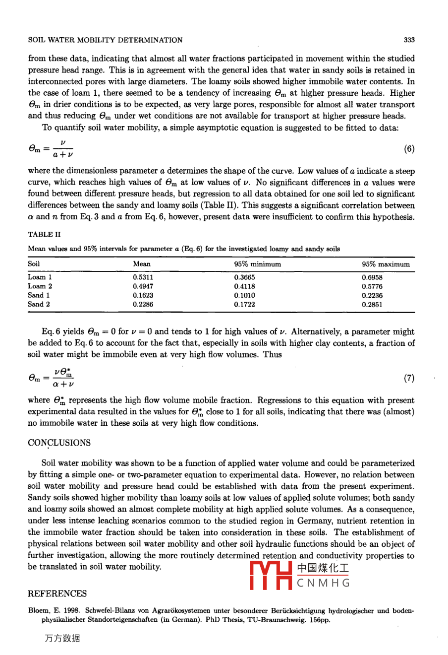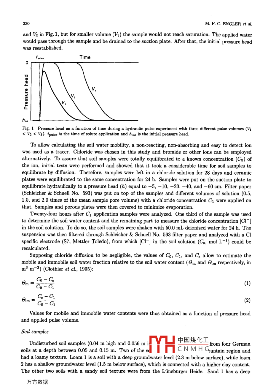 Pedosphere 18(3): 328 -334, 2008ISSN 1002-0160/CN 32-1315/PPEDOSPHERE⑥2008 Soil Science Society of ChinaPublished by Elsevier Limited and Science Presswww. elsevier. com/locate/pedosphereAn Alternative Approach for the Determination of SoilWater Mobility*lM. P. C. ENGLER', R. CICHOTA2, Q. DE JONG VAN LIER1,*2, E. M. BLOEM3, G. SPAROVEK1and E. SCHNUG31University of Sao Parlo, C.P. 9, Piracicaba (SP) 13418-900 (Brazil). E-mail: mpcampos@esalq. usp.br2Institute of Natural Resources, Massey University, P.0. Bor 11 222, Palmerston North (New Zealand)Institute for Crop and Soil Science, (JKI) Federal Research Centre for Cultivated Plante, Bundesallee 50, D-38116Braunschweig (Germany)(Received July 25, 2007; revised March 14, 2008)ABSTRACTA new laboratory method was proposed to establish an easily performed standard for the determination of mobile soilwater close to real conditions during the infiltration and redistribution of water in a soil. It consisted of applying a watervolume with a tracer ion on top of an undisturbed ring sample on a pressure plate under a known suction or pressurehead. Afterwards, 8oil water mobility was determined by analyzing the tracer-ion concentration in the soil sample. Soilwater mobility showed如be a function of the applied water volume. No relation between soil water mobility and appliedpressure head could be established with data from the present experiment. A simple one- or two parameter equation canbe fitted to the experimental data to parameterize soil water mobility as a function of applied solute volume. Sandy soilsshowed higher mobility than loamy soils at low values of applied solute volumes, and both sandy and loamy soils showedan almost complete mobility at high applied solute volumes.Key Words: laboratory method, mobile-immobile water, pressure head, soil textureCitation: Engler, M. P. C, Cichota, R, de Jong van Lier, Q, Bloem, E. M., Sparovek, G. and Schnug, E. 2008. Analternative approach for the determination of soil water mobility. Pedosphere. 18(3): 328- 334.The asessment of pesticide, nutrient, and heavy metal movement in soils depends on reliable modelsto describe solute transport. These models can improve insight into the behavior of ions in a porousmedium (difusion, dispersion, anion exclusion, adsorption, or exchange processes), and describe themedium itself (pore geometry, aggregation, and reactivity) (van Genuchten and Wierenga, 1976). So-lute movement also infuences the presence and amounts of pollutants in specific parts of the soil andin groundwater that has fowed through its profle (Van de Pol et al, 1977). Solute movement modelsare essential for estimating impacts of waste disposal, surface mining, and pesticide application and forpredicting fertilizer eficiency and environmental impacts.Preferential fow pathways play an important role in soil water and solute transport (Thomas andPhilips, 1979; Priebe and Blackmer, 1989; Kanwar et al, 1985). Preferential fow consists of a routefor solutes to move rapidly below the biologically active root zone (Casey et al, 1997). It leads to atemporary nonequilibrium condition of solute concentration or pressure head (Brusseau and Rao, 1990)that limits the ability to predict flow and transport processes in undisturbed media that do not considerthese pathways.In order to extend predictions of hydraulic and prefd中國煤化工modeling of solutetransport processes, models usually distinguish a mobile 8YHCNMH Gtion. It is assumedthat an essentially mobile fraction is active in solute trarJ. pauwowo, wuit a vomplementary im-*lProject Bupported by Coordenacao de Aperfeicoamento de Pessoal de Nirvel Superior (CAPNS), Brazil and DeutscheForschungsgemeinschaft (DFG), Germany-Bilateral Cooperation Project 017/04.*2Corresponding autbor. E-mail: qdjvlier@esalq.usp.br.SOIL WATER MOBILITY DETERMINATIONmobile fraction does not participate in mass flow (Gaudet et al., 1977). Mobile (or dynamic) water islocated inside the mobile pore domain (usually large and inter-aggregate pores). The fuid fow in themedium is assumed to occur only in this domain. Solute is transported in the mobile domain as anadvective- dispersive process, and a difusive process exchanges solute between the mobile and immobilefraction. Immobile (or stagnant) water is mostly located inside aggregates (small and intra-aggregatepores). Transfer by diffusion between the two liquid domains (mobile and immobile) is proportional tothe concentration difference between the mobile and immobile liquids.Recently hydrological sulfur model (HYSUMO) was developed. HYSUMO simulates the S cyclein the soil, the soil water fractions, and plant uptake, including the mobile and immobile soil waterfraction. The importance of the mobile/immobile soil water concept for S balance modeling has beendiscussed by Bloem et al. (2005) using simulation results under various scenarios. The authors showedthat the immobile soil water fraction affected leaching, nutrient availability, and groundwater pollution,storing a non- negligible part of nutrients and therefore contributing to plant nutrition. Since Coats andSmith (1964) suggested a mobile-immobile (dead-end pore volume) fraction for characterizing solutionmobility for petroleum engineering, several methodological improvements were made to determine soilwater mobility, but no standardized method is yet accepted.Equipment, tracers, and the necessary equations support for deterministic or stochastic assessmentof soil water mobility have been developed for both field and laboratory conditions. Laboratory studiesto investigate the solute movement through porous media have been made using tracer techniques incolumns with repacked soil (Padilla et al., 1999) and undisturbed soil samples (Jaynes et al, 1995;Lee et al., 2000; Ilsemann et al., 2002). Also, tracer techniques using disk permeameter and tensioninfiltrometer have been proposed for estimating the soil water mobility and the difusion cofficientunder field conditions (Cl