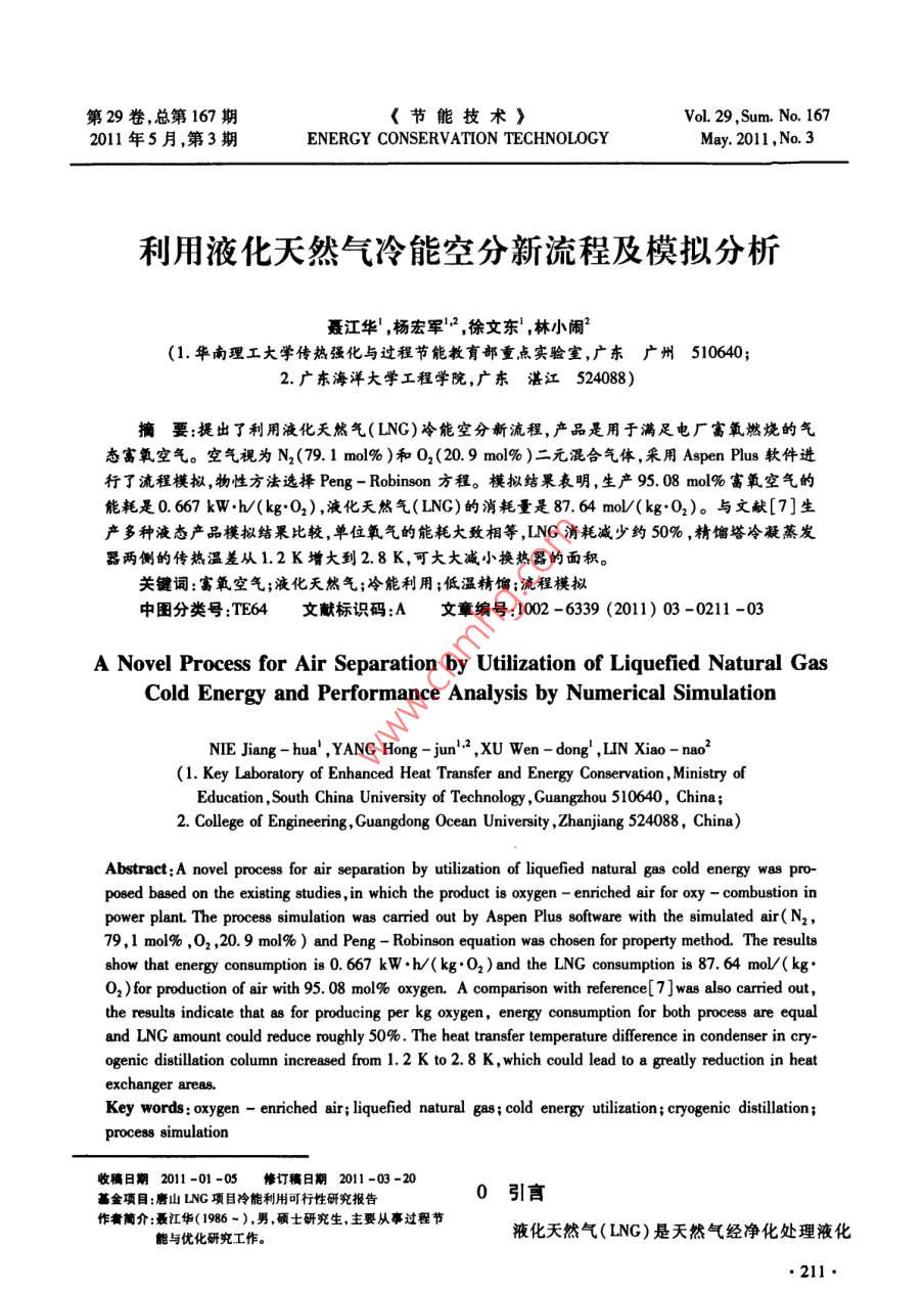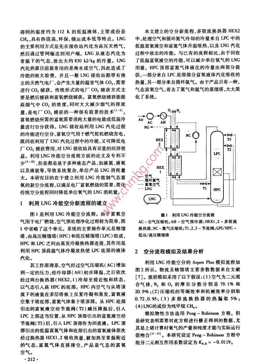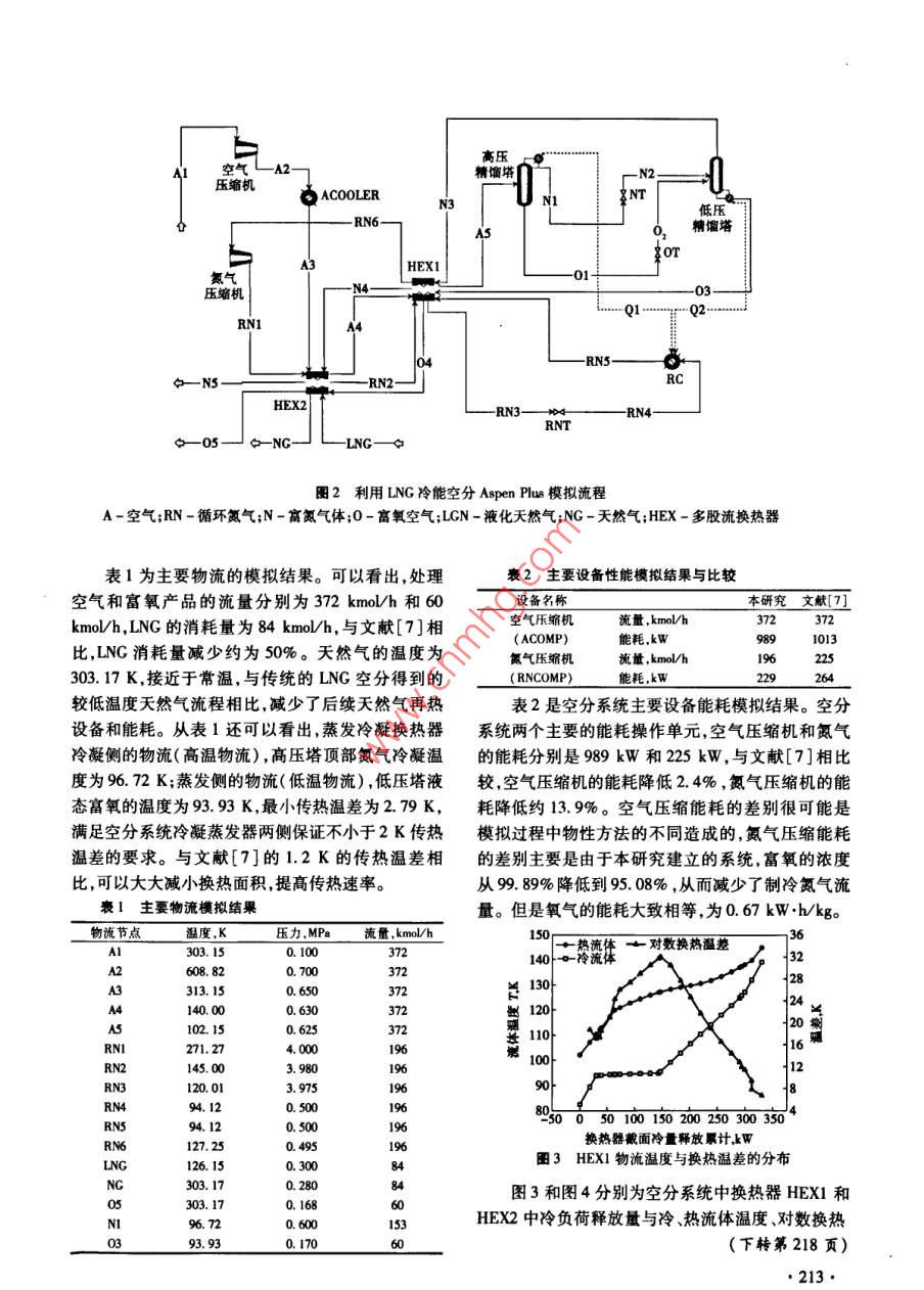 第29卷,總第167期節(jié)能技術(shù)voL 29 Sum. No. 1672011年5月,第3期ENERGY CONSERVATION TECHNOLOGYMay 2011, No. 3利用液化天然氣冷能空分新流程及模擬分析聶江華,楊宏軍2,徐文東,林小鬧(1.華南理工大學(xué)傳熱強(qiáng)化與過程節(jié)能教育部重點(diǎn)實驗室,廣東廣州510640;2.廣東海洋大學(xué)工程學(xué)院,廣東湛江524088)摘要:提出了利用液化天然氣(LNG)冷能空分新流程,產(chǎn)品是用于滿足電廠富氧燃燒的氣態(tài)富氧空氣??諝庖暈镹2(79.1mol%)和02(20.9mol%)二元混合氣體,采用 Aspen Plus軟件進(jìn)行了流程模擬,物性方法選擇Peng- Robinson方程。模擬結(jié)果表明,生產(chǎn)95.08ml%富氧空氣的能耗是0.667kWh/(kg·O2),液化天然氣(LNG)的消耗量是87.64mol/(kg·O2)。與文獻(xiàn)[7]生產(chǎn)多種液態(tài)產(chǎn)品模擬結(jié)果比較,單位氧氣的能耗大致相等,LNG消耗減少約50%,精餾塔冷凝蒸發(fā)器兩側(cè)的傳熱溫差從1.2K增大到2.8K,可大大減小換熱器的面積關(guān)鍵詞:富氧空氣;液化天然氣;冷能利用;低溫精餾;流程模擬中圖分類號:TE64文獻(xiàn)標(biāo)識碼:A文章編號:1002-6339(2011)03-0211-03A Novel Process for Air Separation by Utilization of Liquefied Natural GasCold Energy and Performance Analysis by Numerical SimulationNIE Jiang-hua, YANG Hong-jun, XU Wen-dong, LIN Xiao-na(1. Key Laboratory of Enhanced Heat Transfer and Energy Conservation, Ministry ofEducation, South China University of Technology, Guangzhou 510640, China2. College of Engineering, Guangdong Ocean University, Zhanjiang 524088, China)Abstract: A novel process for air separation by utilization of liquefied natural gas cold energy was pro-posed basedexisting studies, in which the product is oxygen-enriched air for oxy-combustion inpower plant. The process simulation was carried out by Aspen Plus software with the simulated air(N,79, 1 mol%, 02, 20. 9 mol%)and Peng-Robinson equation was chosen for property method. The resultsshow that energy consumption is 0.667 kW.h(kg.O2)and the LNG consumption is 87. 64 mol/ ( kg0,)for production of air with 95. 08 mol% oxygen. a comparison with reference[ 7 ]was also carried outthe results indicate that as for producing per kg oxygen, energy consumption for both process are equaland LNG amount could reduce roughly 50%. The heat transfer temperature difference in condenser in cry-ogenic distillation column increased from 1. 2 K to 2.8K, which could lead to a greatly reduction in heatexchanger areas.Key words: oxygen-enriched air; liquefied natural gas; cold energy utilization; cryogenic distillation;process simulation收稿日期2011-01-05修訂稿日期2011-03-20基金項目:唐山LNG項目冷能利用可行性研究報告0引言作者簡介:聶江華(1986~),男,碩士研究生,主要從事過程節(jié)能與優(yōu)化研究工作。液化天然氣(LNG)是天然氣經(jīng)凈化處理液化211得到的溫度約為112K的低溫液體,主要成份是本文建立的空分新流程,多股流換熱器HEX2CH4,具有熱值高,環(huán)保,儲運(yùn)成本低等特點(diǎn)。LNG中,處理空氣和循環(huán)氮?dú)饫鋮s的冷量來自LPC中的的主要利用方式是先在接收站汽化為高壓天然氣,低溫富氧液空和富氮?dú)怏w升溫吸熱,以及LNG汽化然后通過管網(wǎng)輸送到用戶端。LNG從液態(tài)汽化為過程中放出的冷能。與已有的流程相比由于回收常溫下的氣態(tài),放出大約830kJ/kg的冷量。LNG了低溫富氧液空的冷能,可以減少單位氧氣的LNG汽化熱源目前最常用的是海水或空氣,因此造成了用量。HPC頂部富氮?dú)怏w液化的冷量由兩部分提冷能的極大浪費(fèi)。并且一般LNG接收站都帶有獨(dú)供,一部分來自LPC底部部分富氧液體汽化吸收的立的天然氣電廠,會產(chǎn)生大量的溫室氣體CO2,需要熱量,另一部分來自循環(huán)氮?dú)狻S捎诋a(chǎn)品只有一種進(jìn)行CO2捕獲。傳統(tǒng)形式的電廠CO2捕獲方式主氣態(tài)富氧空氣,省去了氮?dú)夂蜌鍤獾恼麴s塔,大大簡要是燃后捕獲和富氧燃燒捕獲。富氧燃燒捕獲能提化了系統(tǒng)。高煙氣中CO2的濃度,同時大大減少煙氣的排放富氧燃燒所需的富氧需要消耗大量的電能或低溫冷如Q也量,是電廠CO2捕獲的一種很有前景的技術(shù)-3AC AH量進(jìn)行空分獲得。LNG接收站利用LNG汽化過程N(yùn)O的冷能進(jìn)行空分,富氧空氣用于燃?xì)廨啓C(jī)燃燒發(fā)電NC既回收利用了LNG汽化過程中的冷能,又可降低電HEX廠CO2捕獲費(fèi)用,對LNG接收站具有雙重的經(jīng)濟(jì)效益。利用LNG冷能空分流程方面的論文及專利不LP少0,但是都是基于多種液態(tài)產(chǎn)品,如液氮、液氧以及液氬等,導(dǎo)致系統(tǒng)復(fù)雜,單位產(chǎn)品LNG消耗量HEX大。本研究目的在于建立利用LNG冷能制氣態(tài)富氧的新空分流程,以滿足電廠富氧燃燒的需要,簡化—富氧空氣傳統(tǒng)空分流程同時降低單位氧氣的LNG消耗量。LN1利用LNG冷能空分新流程的建立圖1是利用LNG冷能空分流程。由于富氧空圖1利用LNG冷能空分流程氣用于電廠燃燒,空氣預(yù)處理凈化過程較為簡單圖AC-空氣壓縮機(jī);AH-空氣預(yù)冷器;HEX1,2-多股流1中省略了這個單元。系統(tǒng)的主要操作單元是精餾換熱器NC一氮?dú)鈮嚎s機(jī);m,2,3-節(jié)流閥;LPC/HPC塔由高壓精餾塔(HPC)和低壓精餾塔(LPC)組成,低壓/高壓精餾塔HPC和LPC之間由蒸發(fā)冷凝換熱器連接,其作用是利用HPC頂高溫氣體冷凝放熱使LPC底部的液體2空分流程模擬及結(jié)果分析汽化。其工作原理是,空氣經(jīng)過空氣壓縮機(jī)(AC)增加利用LNG冷能空分的 Aspen Plus模擬流程如到一定的壓力,