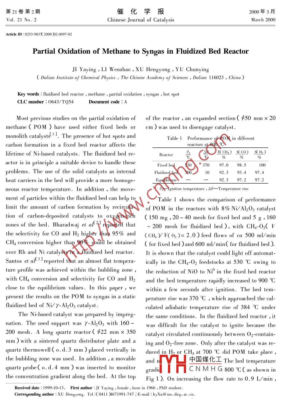 流化床反應(yīng)器中甲烷部分氧化制合成氣