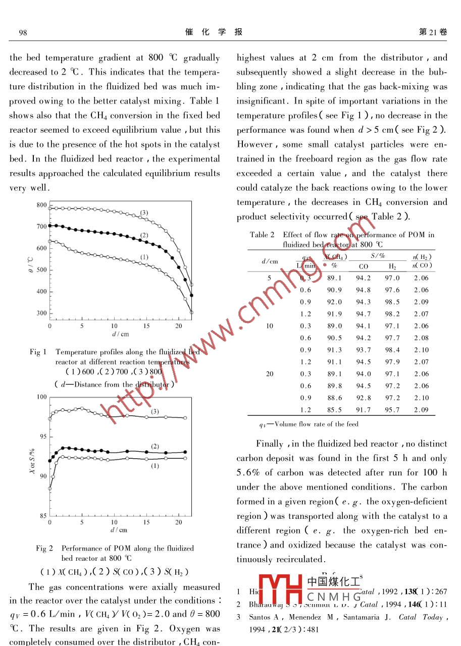 第21卷第2期催化學(xué)報(bào)2000年3Vol. 21 NoChinese Journal of CatalyMarch 2000Article ID:0253-9832000)2009702Partial Oxidation of methane to Syngas in Fluidized Bed reactorJI Yaying, LI Wenzhao, XU Hengyong, YU ChunyingDalian Institute of Chemical Physics, The Chinese Academy of Sciences, Dalian 116023, ChinaKey words fluidized bed reactne, partial oxidation syngas, hot spotCLC number: 0643/TQ54ocument code: AMost previous studies on the partial oxidation of of the reactor an expanded section($50 mm x 20methane( POM have used either fixed beds or cm )was used to disengage catalystmonolith catalysts 1. The presence of hot spots andTable 1 Performance of pom in differentcarbon formation in a fixed bed reactor affects thereactors at800℃lifetime of Ni-based catalysts. The fluidized bed re-△0XCH4)SC0)SH2)actor is in principle a suitable device to handle theseFixed bed53037097.098.51oblems. The use of the solid catalysts as internalFluidized bed 7001092.393.497.4heat carriers in the bed will provide a more homogeEquilibrium92,397,2neous reactor temperature. In addition, the move6— -Ignition temperature,△- Temperature risement of particles within the fluidized bed can help toTable 1 shows the comparison of performancelimit the amount of carbon formation by recircula- of poM in the reactors with 8% NV/ALO catalysttion of carbon-deposited catalysts to oxygen-rich (150 mg, 20-40 mesh for fixed bed and 5g, 160zones of the bed. Bharadwa et at reported that -200 mesh for fluidized bed), with CH4-0,(Vthe selectivity for CO and H2 higher than 95% and (cHAy v(0,)=2.0) feed flows of ca 500 ml/minCHA conversion higher than 90% could be obtained for fixed bed and 600 ml/ min( for fluidized bedover Rh and Ni catalysts in a fluidized bed reactor. It is shown that the catalyst could light off automatSantos et al 3]reported that an al most flat tempera- ically in the CHa-0, feedstocks at 530C owing toture profile was achieved within the bubbling zone, the reduction of nio to ni o in the fixed bed reactowith CHA conversion and selectivity for Co and H2 and the bed temperature rapidly increased to 900 Cclose to the equilibrium values. In this paper, we within a few seconds after ignition. The bed tempresent the results on the PoM to syngas in a static perature rise was 370C which approached the calfluidized bed of Ni/y-Al2O3 catalystculated adiabatic temperature rise of 384 C underThe Ni-based catalyst was prepared by impreg- the same conditions. In the fluidized bed reactor, itnation.The used support was y-Al2O3 with 160was difficult for the catalyst to ignite because the200 mesh. A long quartz reactor( 922 mm X 350 catalyst circulated continuously between 0-containmm) with a sintered quartz distributor plate and a ing and O,-free zone. Only after the catalyst was requartz thermowell(o d 3 mm) placed vertically in duced in H, or CHa at 700 did pOM take placethe bubbling zone was used. In addition a movable中國(guó)煤化工 The bed temperaturequartz probe(o d 4 mm ) was inserted to monitorgICNMHG800℃( as shown inthe concentration gradient along the bed. At the top Fig 1) On increasing ow rate to 0.9 L/ minReceived date: 1999-10-13. First author: JI Y aying, female, born in 1966, PhD studeng. Tel: (0411 M671991-747; E-mail hy Xu@ ms dicpaccnFoundatio毀費(fèi)" ported by the key project of The Chinese Academy of Sciences(y908催化學(xué)報(bào)第21卷the bed temperature gradient at 800C gradually highest values at 2 cm from the distributor anddecreased to 2C. This indicates that the tempera- subsequently showed a slight decrease in the bubture distribution in the fluidized bed was much im- bling zone indicating that the gas back-mixing wasproved owing to the better catalyst mixing. Table 1 insignificant. In spite of important variations in theshows also that the CHa conversion in the fixed bed temperature profiles( see Fig 1), no decrease in thereactor seemed to exceed equilibrium value, but this performance was found when d >5 cm( see Fig 2)is due to the presence of the hot spots in the catalyst However, some small catalyst particles were enbed. In the fluidized bed reactor the experimental trained in the freeboard region as the gas flow rateresults approached the calculated equilibrium results exceeded a certain value, and the catalyst therevery wellcould catalyze the back reactions owing to the lowertemperature, the decreases in CHA conversion androduct selectivity occurred see Table 2)aTable 2 Effect of flow rate on performance of POM influidized bed reactor at 800 CS/%94.297.02.060.690.994.897.62.061.291,994.798.22.07perature profiles along the fluidized be0.991.393.798.42.10reactor at different retemperature(1)600,(2)700,(3)8000.389,194.097.12.06( d-Distance from the distributor0.694.5970.92.10591.795,72,09carbon deposit was found in the first 5 h and only5. 6 of carbon was detected after run for 100 hmentioned conditions. The carbformed in a given region(e. g. the oxy gen-deficientdifferent region (e. g. the oxygen-rich bed enFig 2 Performance of POM along the fluidizedtrance ) and oxidized because the catalyst was conbed reactor at800℃tinuously recirculated(1)X(CH4)、(2)S(C0),(3)S(H2)The gas concentrations were axially measured1中國(guó)煤化工CNMHGO,199,13x1):267In the reactor over the catalyst under the conditions 2 BhanauWay557selmut L, U., Catal, 1994,146(1):Ilqv=0. 6 L/min, V( CH4(O2)=2.0 and 0=800 3 Santos a, Menendez m, santamariCatal TodayC. The results are given in Fig 2. Oxygen was 1994,21(2/3):481completely consumed over the distributor, CH4 conversion are亮教據(jù) vity for CO and H2 achieved theEd WGZh)