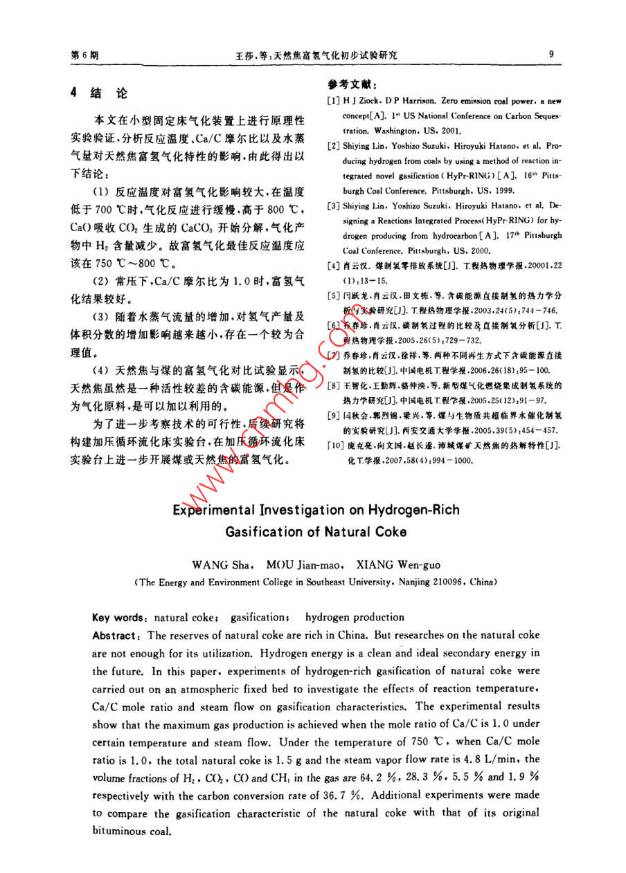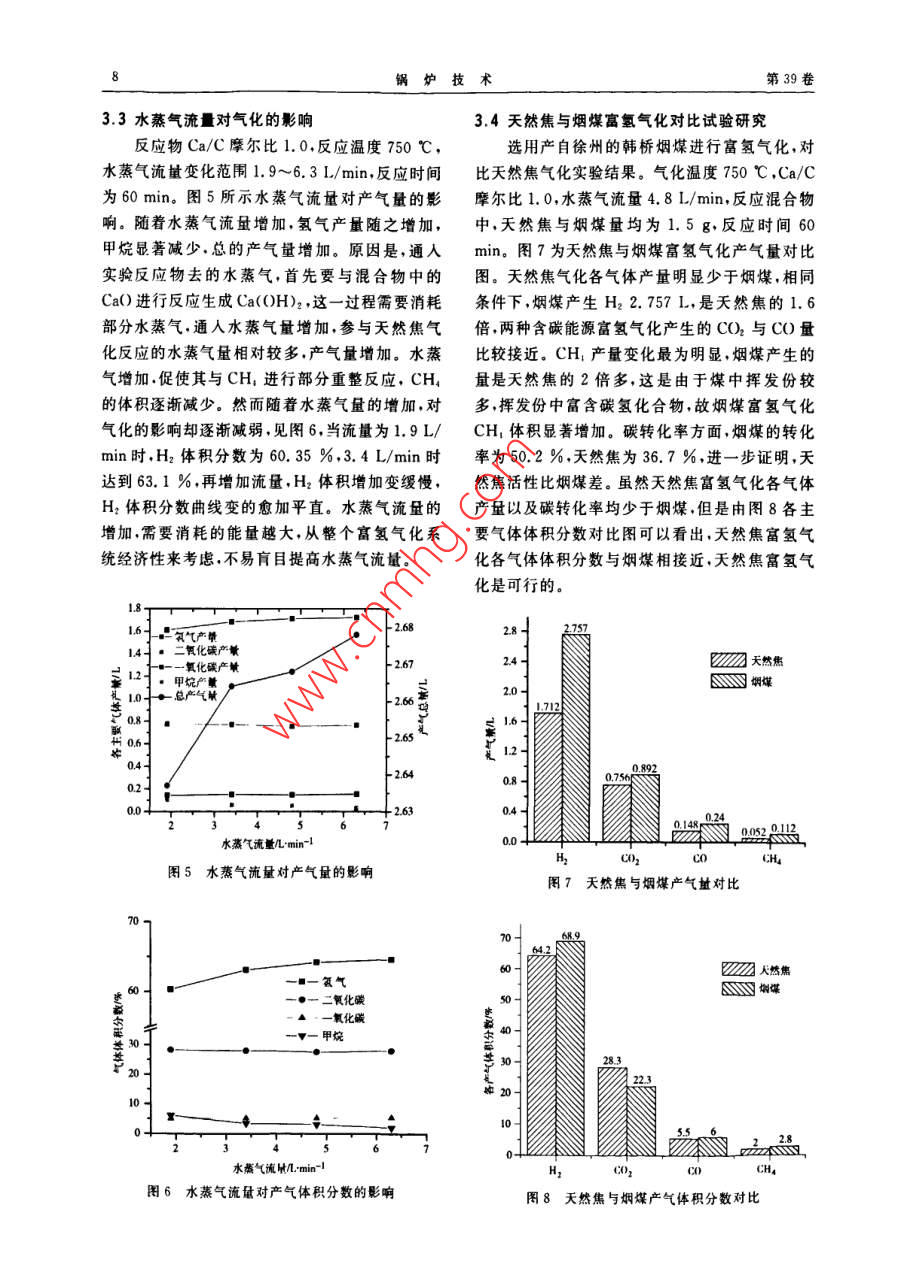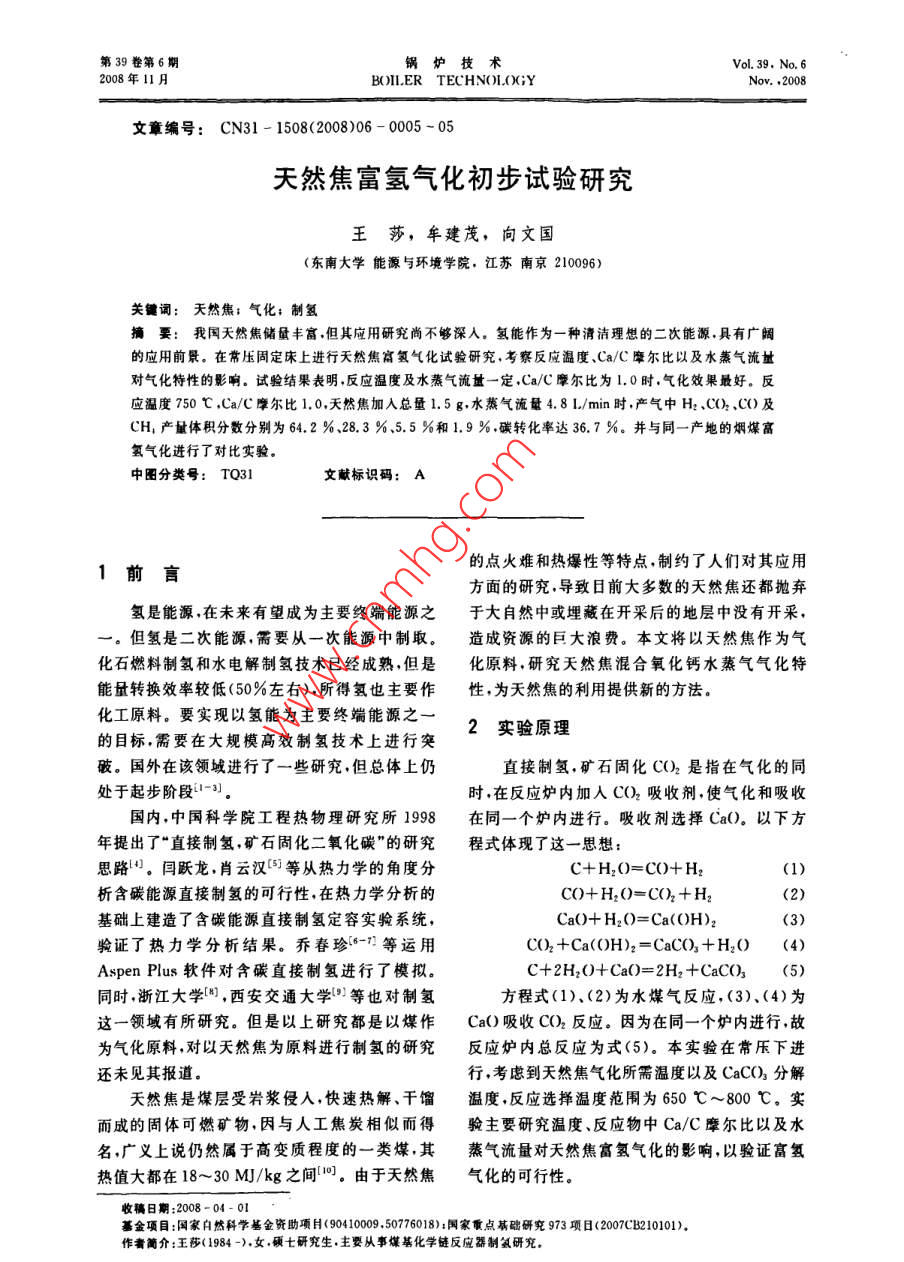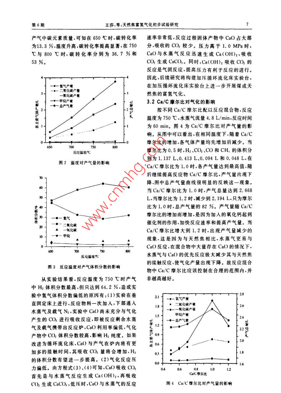 第39卷第6期咼爐技術Vol. 39. No. 62008年11 ABOILER TECHNOLOGYNov.,2008文章編號: CN31 一1508(2008)06 - 0005 - 05天然焦富氫氣化初步試驗研究王莎,牟建茂,向文國(東南大學能源與環(huán)境學院,江蘇南京210096)關鍵詞:天然焦:氣化;制氫摘要:我國天然焦儲量豐富,但其應用研究尚不夠深人。氫能作為一種清潔理想的二次能源.具有廣闊的應用前景。在常壓固定床上進行天然焦商氫氣化試驗研究,號察反應溫度、Ca/C摩爾比以及水蒸氣流量對氣化特性的影響。試驗結(jié)果表明,反應溫度及水蒸氣流量一定,Ca/C摩爾比為1.0時,氣化效果最好。反應溫度750亡,Ca/C摩爾比1.0.天然焦加入總量1.5g.水蒸氣流鼂4.8 L./min時,產(chǎn)氣中H: .CO)2 ,C0及CH,產(chǎn)量體積分數(shù)分別為64.2 %,28.3 %、5.5 %和1.9 %,碳轉(zhuǎn)化率達36.7 %。并與同一產(chǎn)地的煙煤富氫氣化進行了對比實驗。中圈分類號: TQ31文獻標識碼: A的點火難和熱爆性等特點,制約了人們對其應用1前言方面的研究,導致日前大多數(shù)的天然焦還都拋棄氫是能源,在未來有望成為主要終端能源之于大自然中或埋藏在開采后的地層中沒有開采,一。但氫是二次能源,需要從一次能源中制取。造成資源的巨大浪費。本文將以天然焦作為氣化石燃料制氫和水電解制氫技術已經(jīng)成熟,但是:化原料,研究天然焦混合氧化鈣水蒸氣氣化特能量轉(zhuǎn)換效率較低(50%左右).所得氫也主要作性,為天然焦的利用提供新的方法。化工原料。要實現(xiàn)以氫能為主要終端能源之一2實驗原理的目標,需要在大規(guī)模高效制氫技術上進行突破。國外在該領域進行了一些研究,但總體上仍直接制氫,礦石固化CO2是指在氣化的同處于起步階段1-81。時,在反應爐內(nèi)加入CO2吸收劑,使氣化和吸收國內(nèi),中國科學院工程熱物理研究所1998在同一個爐內(nèi)進行。吸收劑選擇Ca(。以下方年提出了“直接制氫,礦石固化二氧化碳”的研究程式體現(xiàn)了這一思想:思路l1。閆躍龍。肖云漢[5]等從熱力學的角度分C+ H2()=C0+H2(1)析含碳能源直接制氫的可行性,在熱力學分析的C0+ H2(=C(2+ H2(2)基礎上建造了含碳能源直接制氫定容實驗系統(tǒng),Ca(+ H2()=Ca(OH)2(3)驗證了熱力學分析結(jié)果。喬春珍([6-1等運用CO2 +Ca0H)2=CaCO3+H2() (4)Aspen Plus 軟件對含碳直接制氫進行了模擬。C+2H2(+Ca0=2H2 +CaCO3 (5)同時,浙江大學[田,西安交通大學(9]等也對制氫方程式(1)、(2)為水煤氣反應,(3).(4)為這一領域有所研究。但是以上研究都是以煤作Ca()吸收CO2反應。因為在同一個爐內(nèi)進行,故為氣化原料,對以天然焦為原料進行制氫的研究反應爐內(nèi)總反應為式(5)。本實驗在常壓下進還未見其報道。行,考慮到天然焦氣化所需溫度以及CaCO3分解天然焦是煤層受巖漿侵人,快速熱解、千餾溫度,反應選擇溫度范圍為650 C~800 C.實而成的周體可燃礦物,因與人工焦炭相似而得驗主要研究溫度、反應物中Ca/C摩爾比以及水名,廣義上說仍然屬于高變質(zhì)程度的一類煤,其蒸氣流量對天然焦富氫氣化的影響,以驗證富氫熱值大都在18~30 MJ/kg之間[0]。由于天然焦氣化的可行性。收稿日期:2008-04-01驀金項目:國家A然科學基金資助項月(90410009.50776018):國家重點荔礎研究973項日(2007CB210101)。作者簡介:王莎(1984 -).女.碩七研究生.主要從事煤基化學鏈反應器制氯研究。鍋爐技術第39卷續(xù)表13實驗系統(tǒng)與樣品試樣3.1實驗系統(tǒng)試樣1試樣2實驗系統(tǒng)如圖1。垂直固定床氣化方式,實Can93.1288. 48元素Has1. 995. 36驗裝置工作壓力為0.1 MPa,最高溫度900 C.主反應管為φ31 mmX2. 5 mmX 600 mm的分析3.213.64/%Na1.101. 590Cr25Ni20耐熱鋼。整個裝置由3個部分組成:Sat0.580.93配氣部分、爐體部分、采氣部分。實驗時先檢查..w/MJ.kg'26.5929. 56整個裝置的氣密性,打開爐體加熱裝置,并調(diào)節(jié)表2石灰石成分分析水蒸氣流量。當爐體達到設定溫度,且水蒸氣發(fā)生器產(chǎn)生穩(wěn)定的氣體時,加入定量的反應物料,組CaO Mg() Si02LOSS同時通人載氣N2 200 ml/min。收集產(chǎn)氣,并由百分含量/% 54. 460.61.063.88艾默生工程控制有限公司生產(chǎn)的NGA2000煤氣分析儀就行分析,主要分析氣體成分為H2,CO2,4結(jié)果與分析CO,CH,.實驗中,反應溫度范圍取650 C~800 C,氣體冷卻器F操劑集氣袋Ca/C摩爾比范圍0.5~1.2,不同Ca/C摩爾比混合物中,維持天然焦質(zhì)量1.5 g,水蒸氣流量加料器溫度控制儀氣體流贛計1.9~6.3 L/min,物料粒徑0.3~0.4 mm.主要考察氣化溫度、Ca/C摩爾比以及水蒸氣流量對富氫氣化特性的影響,同時與對應的煙煤富氫氣化實驗進行對比。壓力計4.1反應溫度對氣化的影響-熱電偶N反應物Ca/C摩爾比1.0,水蒸氣流量4.8-電加水蒸L/min,反應時間為60 min.圖2所示溫度對氣熱器氣發(fā)- 布風板生器化產(chǎn)氣量的影響。650 C時,氣化非常微弱,產(chǎn)生H2的體積為0. 298L,CO2的體積為0. 282 L。CO與CH,的體積較少。混合氣體中H2體積分用1實驗系統(tǒng)簡用數(shù)為47 %,CO2為43 %,CO與CH,各約5 %。如圖3所示。隨著反應溫度的提高,氣化反應加3.2實驗樣品實驗所用天然焦焦樣1產(chǎn)自徐州沛城煤礦,強,各氣體產(chǎn)氣量明顯增加。800 C時, H2.CO2、選用的對應原煤煤樣2產(chǎn)自同一礦區(qū)的徐州韓CO和CH,的產(chǎn)量分別為2. 364 L.1. 246 L.橋煙煤,作為實驗對比,2個試樣的成分分析結(jié)果0.052 L和0.082 L??偖a(chǎn)氣量隨著溫度的升高而快速增加,650 C時,總產(chǎn)氣量只為0. 646 L.當如