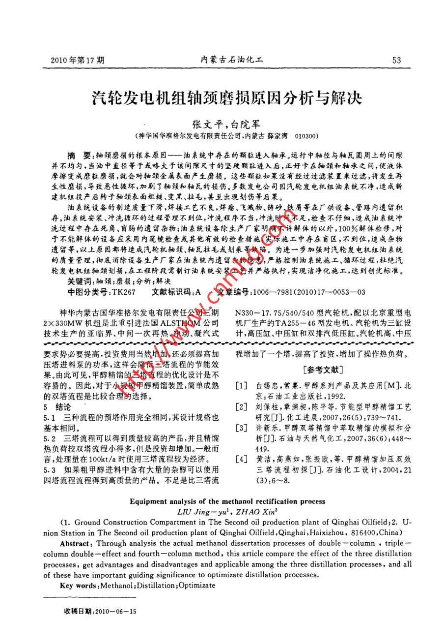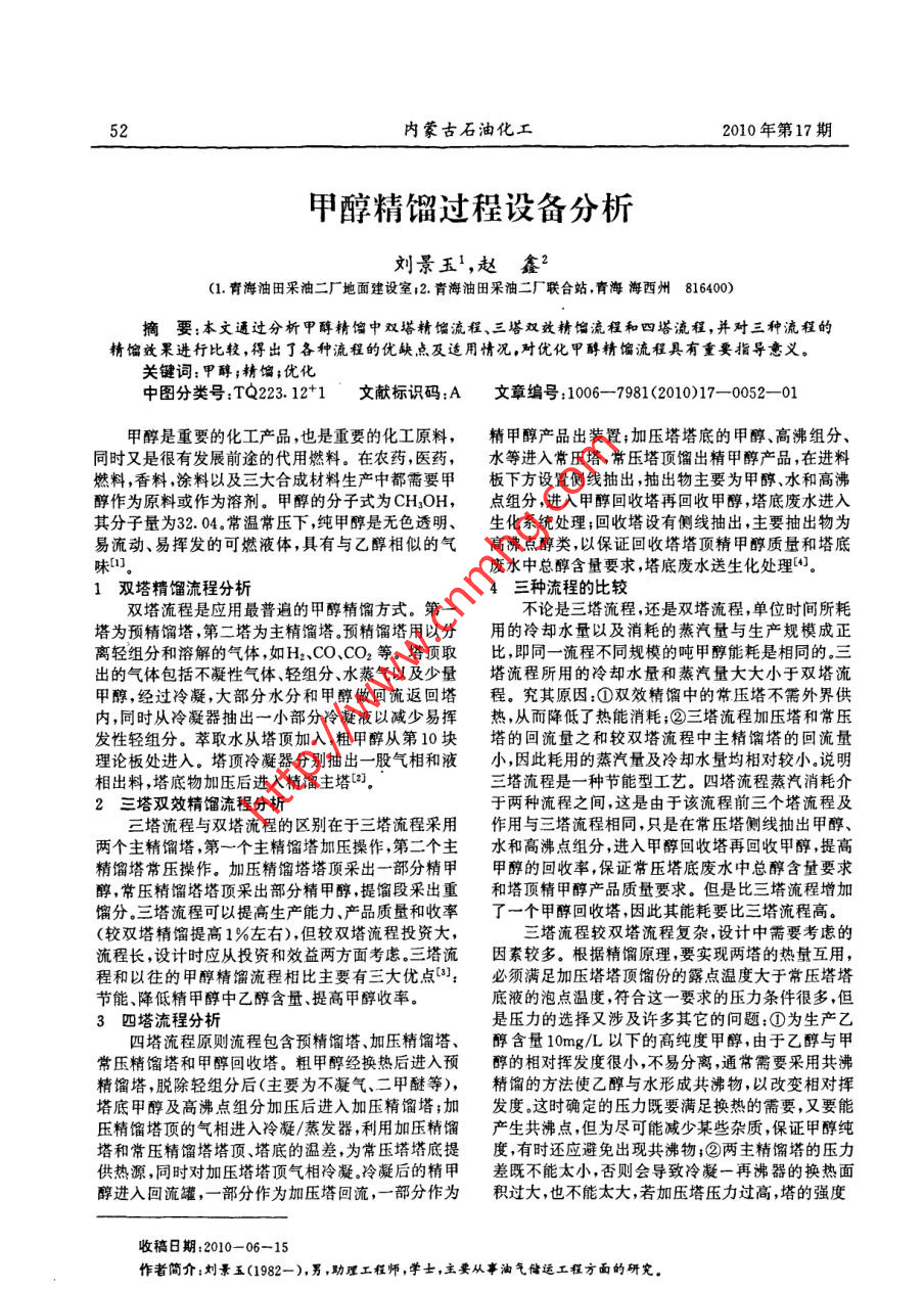 52內(nèi)蒙古石油化工.2010年第17期甲醇精餾過(guò)程設(shè)備分析劉景玉',趙鑫2(1.青海油田采油二廠地面建設(shè)室;2.青海油田采油二廠聯(lián)合站,青海海西州816400)摘要:本文通過(guò)分析甲醇精餾中雙塔精餾流程、三塔雙效精餾流程和四塔流程,并對(duì)三種流程的精餾效果進(jìn)行比較,得出了各種流程的優(yōu)缺點(diǎn)及適用情況。對(duì)優(yōu)化甲醇精餾流程具有重要指導(dǎo)意義。關(guān)鍵詞:甲醇;精餾;優(yōu)化中圖分類號(hào):TQ223.12+1文獻(xiàn)標(biāo)識(shí)碼:A文章編號(hào):1006-7981 (2010)17-0052-01甲醇是重要的化工產(chǎn)品,也是重要的化工原料,精甲醇產(chǎn)品出裝置;加壓塔塔底的甲醇、高沸組分、同時(shí)又是很有發(fā)展前途的代用燃料。在農(nóng)藥,醫(yī)藥,水等進(jìn)入常壓塔,常樂(lè)塔頂餾出精甲醇產(chǎn)品,在進(jìn)料燃料,香料,涂料以及三大合成材料生產(chǎn)中都需要甲板下方設(shè)置側(cè)線抽出,抽出物主要為甲醇、水和高沸醇作為原料或作為溶劑。甲醇的分子式為CH2OH,點(diǎn)組分,進(jìn)入甲醇回收塔再回收甲醇,塔底廢水進(jìn)入其分子量為32.04.常溫常壓下,純甲醇是無(wú)色透明、生化系統(tǒng)處理;回收塔設(shè)有側(cè)線抽出,主要抽出物為易流動(dòng)、易揮發(fā)的可燃液體,具有與乙醇相似的氣高沸點(diǎn)醇類,以保證回收塔塔頂精甲醇質(zhì)量和塔底味[1]。廢水中總醇含量要求,塔底廢水送生化處理(。1雙塔精餾流程分析4三種流程的比較雙塔流程是應(yīng)用最普遍的甲醇精餾方式。第一不論是三塔流程,還是雙塔流程,單位時(shí)間所耗塔為預(yù)精餾塔,第二塔為主精餾塔。預(yù)精餾塔用以分用的冷卻水量以及消耗的蒸汽量與生產(chǎn)規(guī)模成正離輕組分和溶解的氣體,如H2、CO、CO2等。塔頂取比,即同一流程不同規(guī)模的噸甲醇能耗是相同的.三出的氣體包括不凝性氣體、輕組分、水蒸氣以及少量塔流程所用的冷卻水量和蒸汽量大大小于雙塔流甲醇,經(jīng)過(guò)冷凝,大部分水分和甲醇做回流返回塔程。究其原因:①雙效精餾中的常壓塔不需外界供內(nèi),同時(shí)從冷凝器抽出一小部分冷凝液以減少易揮熱,從而降低了熱能消耗;②三塔流程加壓塔和常壓發(fā)性輕組分。萃取水從塔頂加入,粗甲醉從第10塊塔的回流量之和較雙塔流程中主精餾塔的回流量理論板處進(jìn)入。塔頂冷凝器分別抽出一股氣相和液小,因此耗用的蒸汽量及冷卻水量均相對(duì)較小。說(shuō)明相出料,塔底物加壓后進(jìn)入精餾主塔[2]。三塔流程是一種節(jié)能型工藝。四塔流程蒸汽消耗介2三塔雙效精 餾流程分析于兩種流程之間,這是由于該流程前三個(gè)塔流程及三塔流程與雙塔流程的區(qū)別在于三塔流程采用作用與三塔流程相同,只是在常壓塔側(cè)線抽出甲醇、兩個(gè)主精餾塔,第一個(gè)主精餾塔加壓操作,第二個(gè)主水和高沸點(diǎn)組分,進(jìn)入甲醇回收塔再回收甲醇,提高精餾塔常壓操作。加壓精餾塔塔頂采出-部分精甲甲醇的回收率,保證常壓塔底廢水中總醇含量要求醇,常壓精餾塔塔頂采出部分精甲醇,提餾段采出重和塔頂精甲醇產(chǎn)品質(zhì)量要求。但是比三塔流程增加餾分.三塔流程可以提高生產(chǎn)能力、產(chǎn)品質(zhì)量和收率了一個(gè)甲醇回收塔,因此其能耗要比三塔流程高。(較雙塔精餾提高1%左右),但較雙塔流程投資大,三塔流程較雙塔流程復(fù)雜,設(shè)計(jì)中需要考慮的流程長(zhǎng),設(shè)計(jì)時(shí)應(yīng)從投資和效益兩方面考慮。三塔流因素較多。根據(jù)精餾原理,要實(shí)現(xiàn)兩塔的熱量互用,程和以往的甲醇精餾流程相比主要有三大優(yōu)點(diǎn)叫):必須滿足加壓塔塔頂餾份的露點(diǎn)溫度大于常壓塔塔節(jié)能、降低精甲醇中乙醇含量、提高甲醇收率。底液的泡點(diǎn)溫度,符合這一要求的壓力條件很多,但3四塔 流程分析是壓力的選擇又涉及許多其它的問(wèn)題:①為生產(chǎn)乙四塔流程原則流程包含預(yù)精餾塔、加壓精餾塔、醇含量10mg/L以下的高純度甲醇,由于乙醇與甲常壓精餾塔和甲醇回收塔。粗甲醇經(jīng)換熱后進(jìn)入預(yù)醇的相對(duì)揮發(fā)度很小,不易分離,通常需要采用共沸精餾塔,脫除輕組分后(主要為不凝氣、二甲醚等),精餾的方法使乙醇與水形成共沸物,以改變相對(duì)揮塔底甲醇及高沸點(diǎn)組分加壓后進(jìn)入加壓精餾塔;加發(fā)度.這時(shí)確定的壓力既要滿足換熱的需要,又要能;壓精餾塔頂?shù)臍庀噙M(jìn)入冷凝/蒸發(fā)器,利用加壓精餾產(chǎn)生共沸點(diǎn),但為盡可能減少某些雜質(zhì),保證甲醇純塔和常壓精餾塔塔頂、塔底的溫差,為常壓塔塔底提度,有時(shí)還應(yīng)避免出現(xiàn)共沸物;②兩主精餾塔的壓力供熱源,同時(shí)對(duì)加壓塔塔頂氣相冷凝。冷凝后的精甲差既不能太小,否則會(huì)導(dǎo)致冷凝-再沸器的換熱面醇進(jìn)入回流罐,一-部分作為加壓塔回流,一-部分作為積過(guò)大,也不能太大,若加壓塔壓力過(guò)高,塔的強(qiáng)度收稿日期:2010-06-15作者簡(jiǎn)介:劉景五(1982- -),男,助理工程師,學(xué)士,主要從事油氣儲(chǔ)遠(yuǎn)工程方面的研究。2010年第17期內(nèi)蒙古石油化工.53汽輪發(fā)電機(jī)組軸頸磨損原因分析與解決張文平,白院軍(神華國(guó)華準(zhǔn)格爾發(