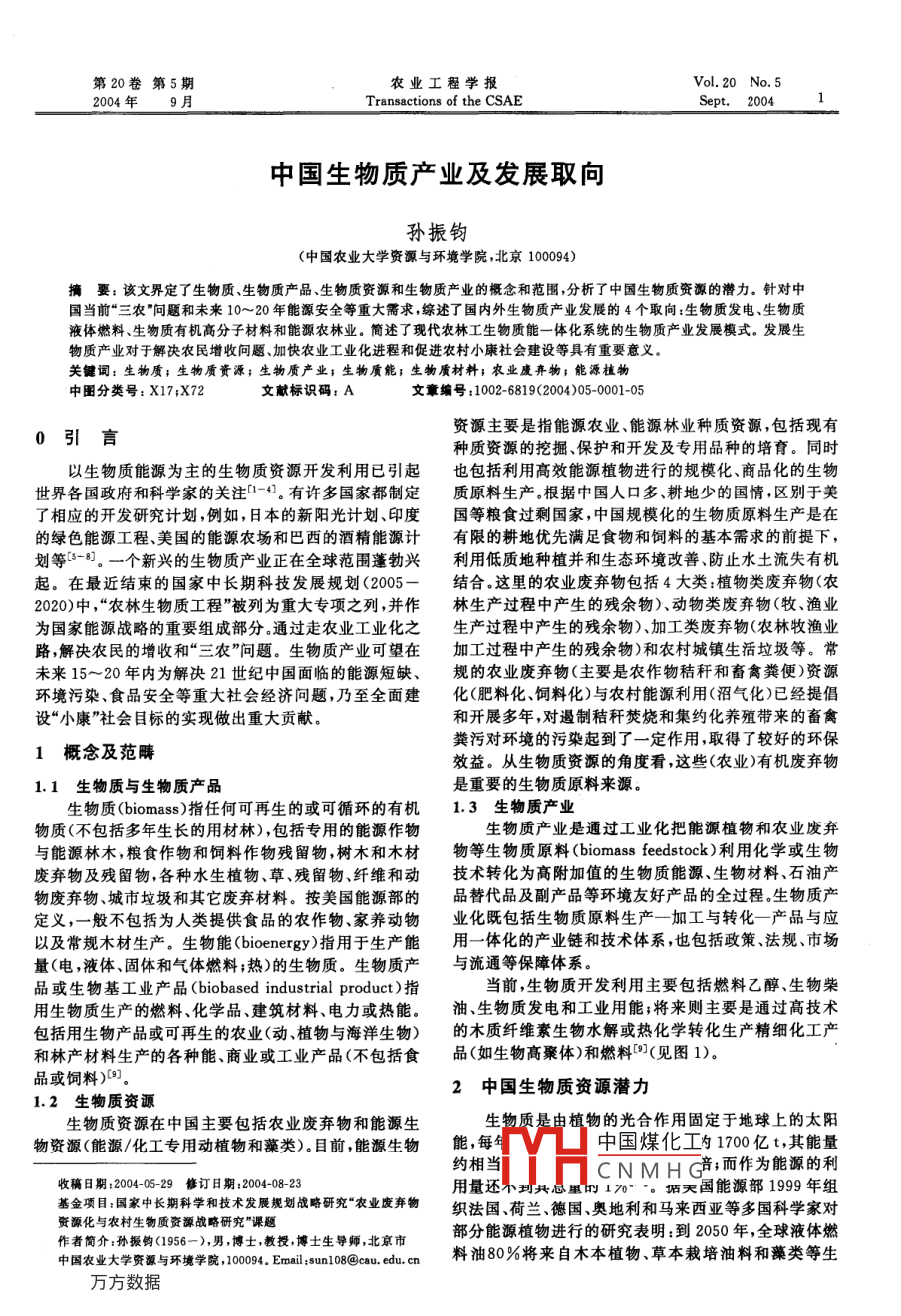 第20卷第5期農(nóng)業(yè)工程學(xué)報Vol 20 No 52004年9月Transactions of the CSae中國生物質(zhì)產(chǎn)業(yè)及發(fā)展取向?qū)O振鈞(中國農(nóng)業(yè)大學(xué)資源與環(huán)境學(xué)院,北京100094)摘要:該文界定了生物質(zhì)、生物質(zhì)產(chǎn)品、生物質(zhì)資源和生物質(zhì)產(chǎn)業(yè)的概念和范圍,分析了中國生物質(zhì)資源的潛力。針對中國當(dāng)前“三農(nóng)”問題和未來10~20年能源安全等重大需求,綜述了國內(nèi)外生物質(zhì)產(chǎn)業(yè)發(fā)展的4個取向:生物質(zhì)發(fā)電、生物質(zhì)液體燃料、生物質(zhì)有機(jī)高分子材料和能源農(nóng)林業(yè)。簡述了現(xiàn)代農(nóng)林工生物質(zhì)能一體化系統(tǒng)的生物質(zhì)產(chǎn)業(yè)發(fā)展模式。發(fā)展生物質(zhì)產(chǎn)業(yè)對于解決農(nóng)民增收問題加快農(nóng)業(yè)工業(yè)化進(jìn)程和促進(jìn)農(nóng)村小康社會建設(shè)等具有重要意義。關(guān)鍵詞:生物質(zhì);生物質(zhì)資源;生物質(zhì)產(chǎn)業(yè);生物質(zhì)能;生物質(zhì)材料;農(nóng)業(yè)廢棄物;能源植物中圖分類號:X17;X72文獻(xiàn)標(biāo)識碼:A文章編號:1002-6819(2004)05-001-05資源主要是指能源農(nóng)業(yè)能源林業(yè)種質(zhì)資源,包括現(xiàn)有種質(zhì)資源的挖掘、保護(hù)和開發(fā)及專用品種的培育。同時以生物質(zhì)能源為主的生物質(zhì)資源開發(fā)利用已引起也包括利用高效能源植物進(jìn)行的規(guī)模化、商品化的生物世界各國政府和科學(xué)家的關(guān)注-4。有許多國家都制定質(zhì)原料生產(chǎn)。根據(jù)中國人口多、耕地少的國情,區(qū)別于美了相應(yīng)的開發(fā)研究計劃,例如,日本的新陽光計劃、印度國等糧食過剩國家,中國規(guī)?;纳镔|(zhì)原料生產(chǎn)是在的綠色能源工程美國的能源農(nóng)場和巴西的酒精能源計有限的耕地優(yōu)先滿足食物和飼料的基本需求的前提下劃等-81。一個新興的生物質(zhì)產(chǎn)業(yè)正在全球范圍蓬勃興利用低質(zhì)地種植并和生態(tài)環(huán)境改善、防止水土流失有機(jī)起。在最近結(jié)束的國家中長期科技發(fā)展規(guī)劃(2005-結(jié)合這里的農(nóng)業(yè)廢棄物包括4大類:植物類廢棄物(農(nóng)2020)中,“農(nóng)林生物質(zhì)工程”被列為重大專項(xiàng)之列,并作林生產(chǎn)過程中產(chǎn)生的殘余物)動物類廢棄物(牧、漁業(yè)為國家能源戰(zhàn)略的重要組成部分通過走農(nóng)業(yè)工業(yè)化之生產(chǎn)過程中產(chǎn)生的殘余物)加工類廢棄物(農(nóng)林牧漁業(yè)路解決農(nóng)民的增收和“三農(nóng)”問題。生物質(zhì)產(chǎn)業(yè)可望在加工過程中產(chǎn)生的殘余物)和農(nóng)村城鎮(zhèn)生活垃圾等。常未來15~20年內(nèi)為解決21世紀(jì)中國面臨的能源短缺、規(guī)的農(nóng)業(yè)廢棄物(主要是農(nóng)作物秸稈和畜禽糞便)資源環(huán)境污染、食品安全等重大社會經(jīng)濟(jì)問題,乃至全面建化(肥料化、飼料化)與農(nóng)村能源利用(沼氣化)已經(jīng)提倡設(shè)“小康”社會目標(biāo)的實(shí)現(xiàn)做出重大貢獻(xiàn)。和開展多年,對遏制秸稈焚燒和集約化養(yǎng)殖帶來的畜禽1概念及范疇糞污對環(huán)境的污染起到了一定作用,取得了較好的環(huán)保效益。從生物質(zhì)資源的角度看,這些(農(nóng)業(yè))有機(jī)廢棄物1.1生物質(zhì)與生物質(zhì)產(chǎn)品是重要的生物質(zhì)原料來源。生物質(zhì) biomass)指任何可再生的或可循環(huán)的有機(jī)1.3生物質(zhì)產(chǎn)業(yè)物質(zhì)(不包括多年生長的用材林),包括專用的能源作物生物質(zhì)產(chǎn)業(yè)是通過工業(yè)化把能源植物和農(nóng)業(yè)廢棄與能源林木,糧食作物和飼料作物殘留物,樹木和木材物等生物質(zhì)原料( biomass feedstock)利用化學(xué)或生物廢棄物及殘留物,各種水生植物、草、殘留物纖維和動技術(shù)轉(zhuǎn)化為高附加值的生物質(zhì)能源、生物材料、石油產(chǎn)物廢棄物城市垃圾和其它廢棄材料。按美國能源部的品替代品及副產(chǎn)品等環(huán)境友好產(chǎn)品的全過程生物質(zhì)產(chǎn)定義,一般不包括為人類提供食品的農(nóng)作物、家養(yǎng)動物業(yè)化既包括生物質(zhì)原料生產(chǎn)一加工與轉(zhuǎn)化一產(chǎn)品與應(yīng)以及常規(guī)木材生產(chǎn)。生物能( bioenergy)指用于生產(chǎn)能用一體化的產(chǎn)業(yè)鏈和技術(shù)體系,也包括政策法規(guī)、市場量(電,液體、固體和氣體燃料;熱)的生物質(zhì)。生物質(zhì)產(chǎn)與流通等保障體系。品或生物基工業(yè)產(chǎn)品( biobased industrial product)指當(dāng)前,生物質(zhì)開發(fā)利用主要包括燃料乙醇、生物柴用生物質(zhì)生產(chǎn)的燃料、化學(xué)品、建筑材料、電力或熱能。油、生物質(zhì)發(fā)電和工業(yè)用能;將來則主要是通過高技術(shù)包括用生物產(chǎn)品或可再生的農(nóng)業(yè)(動植物與海洋生物)的木質(zhì)纖維素生物水解或熱化學(xué)轉(zhuǎn)化生產(chǎn)精細(xì)化工產(chǎn)和林產(chǎn)材料生產(chǎn)的各種能、商業(yè)或工業(yè)產(chǎn)品(不包括食品(如生物高聚體)和燃料(見圖1)。品或飼料)9。2中國生物質(zhì)資源潛力1.2生物質(zhì)資源生物質(zhì)資源在中國主要包括農(nóng)業(yè)廢棄物和能源生