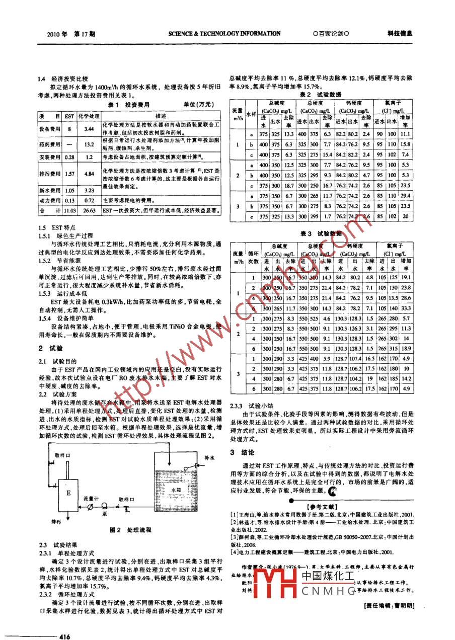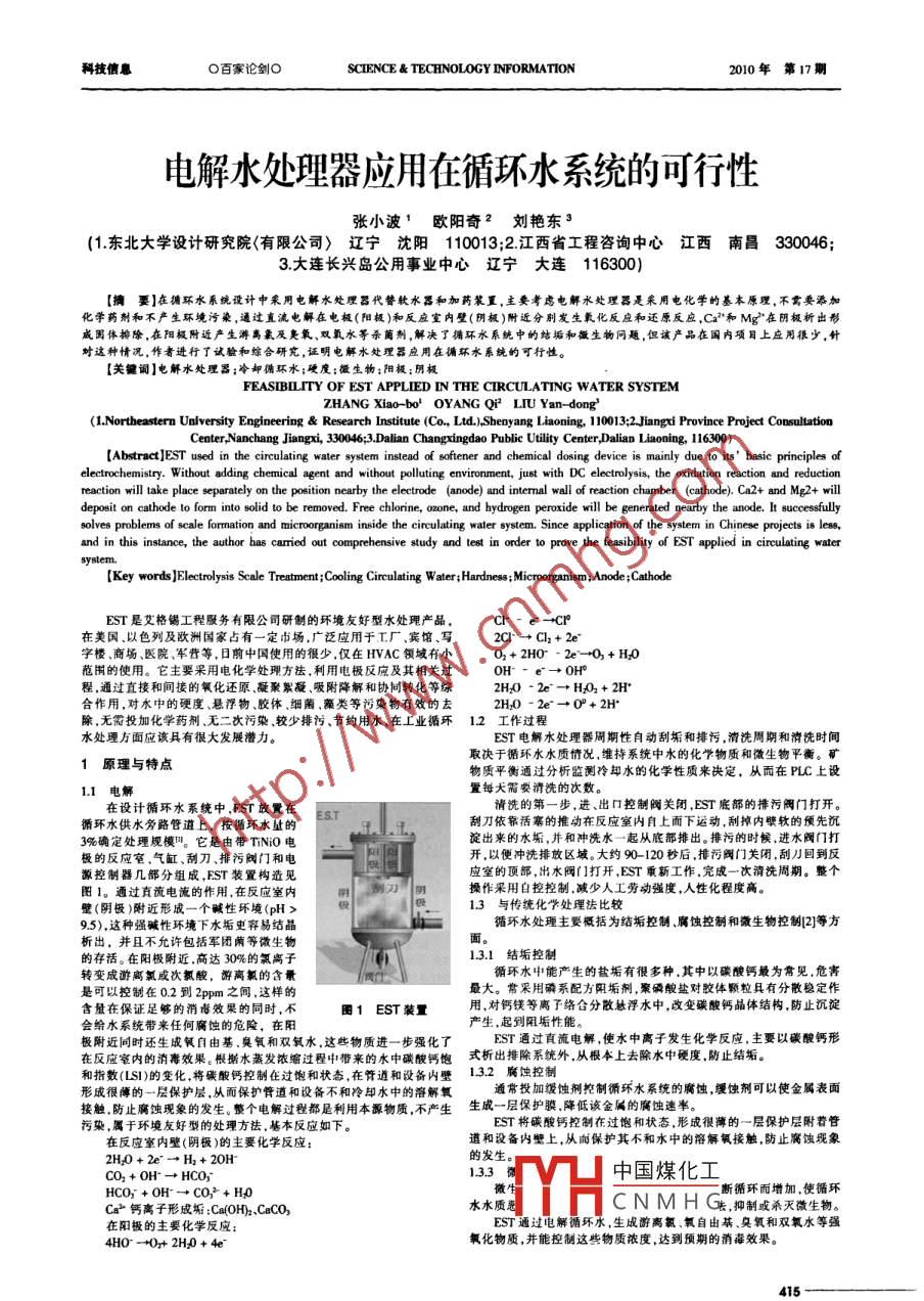 科技僧息0百家論劍0SCIENCE & TECHNOLOGY INFORMATION2010年第17期電解水處理器應(yīng)用在循環(huán)水系統(tǒng)的可行性張小波'歐陽奇2 劉艷東 3(1.東北大學(xué)設(shè)計(jì)研究院(有限公司〉遼寧沈陽110013;2.江西省工程咨詢中心 江西南昌330046;3.大連長興島公用事業(yè)中心遼寧大連116300)[摘要]在循環(huán)水系統(tǒng)設(shè)計(jì)中采用 電解水處理器代替軟水器和加藥裝置,主要考慮電解水處理器是采用電化學(xué)的基本原理,不需要添加化學(xué)藥劑和不產(chǎn)生環(huán)境污染,通過直流電解在電極(陽極)和反應(yīng)室內(nèi)壁(陰極)附近分別發(fā)生氧化反應(yīng)和還原反應(yīng),Ca?"和Mg"在陰極析出形.威圍體排除,在陽極附近產(chǎn)生游離氟及臭氧、雙氧水等殺菌劑,解決了循環(huán)水系統(tǒng)中的結(jié)垢和微生物問題,但該產(chǎn)品在國內(nèi)項(xiàng)目上應(yīng)用很少,針對這種情況,作者進(jìn)行了試驗(yàn)和綜合研究,證明電解水處理器應(yīng)用在循環(huán)水系統(tǒng)的可行性。[關(guān)鍵詞]電解水處理器;冷卻循環(huán)水;硬度:微生物;陽極;陰極FEASIBOLITY OF EST APPLIED IN THE CIRCULATING WATER SYSTEM .ZHANG Xiao-bo' OYANG QPYan-- dong'(1.Northeastern University Enginering & Research Institute (Co., Ld.,Sheayang Liaoning, 10013;2Jiangxi Province Project ConsulationCenter,Nanchang Jiangxi, 330046;3.Dalian Changxingdao Public Uility Center,Dalian Liaoning, 116300)[AbstractJEST used in the circulating water system instead of sofener and chemnical dosing device is mainly due to its' basic principles ofelectrochemistry. Without adding chemical agent and without polluting environment, just with DC electrolysis, the oxidation reaction and reductionreaction will take place separately on the position nearby the electrode (anode) and intemal wall of reaction chamber (cathode). Ca2+ and Mg2+ willdeposit on cathode to form into solid to be removed. Free chlorine, ozone, and hydrogen peroxide will be generated nearby the anode. ht sessfullysolves problems of scale frrnation and miroorganism inside the eirculating water system. Since application of the system in Chinese projects is lese,and in this instance, the author bas carried out comprehensive study and teet in order to prove the feasiblity of EST applied in circulating watersystem.(Key words Jleltrolysis Seale Tretment Cooling Circulating Water;HadessMicroorganism; Anode ;CathodeEST是艾格錫工程服務(wù)有限公司研制的環(huán)境友好型水處理產(chǎn)品。Cr- e→CP在美國.以色列及歐洲國家占有一定市場,廣泛應(yīng)用于工廠、賓館、寫2C1:→Cl2+ 2e"字樓、商場、醫(yī)院、軍營等.日前中國使用的很少,僅在HVAC領(lǐng)域有小02+2HO - 2e→O,+ H0范圍的使用。它主要采用電化學(xué)處理方法.利用電極反應(yīng)及其相關(guān)過0H* - e→0H程.通過直接和間接的氧化還原凝聚絮凝、吸附降解和協(xié)同轉(zhuǎn)化等綜2H20 - 2e°→HO2 + 2H°合作用,對水中的硬度、懸浮物,膠體,細(xì)菌,幕類等污染物有效的去2H0 - 2e- +0*+ 2H+除,無需投加化學(xué)藥劑、無二次污染、較少排污、節(jié)約用水,在工業(yè)循環(huán)1.2 工作過程水處理方面應(yīng)該具有很大發(fā)展?jié)摿?。EST電解水處理器周期性自動刮垢和排污,清洗周期和清洗時(shí)間取決于循環(huán)水水質(zhì)情況,維持系統(tǒng)中水的化學(xué)物質(zhì)和微生物平衡。礦1原理與特點(diǎn)物質(zhì)平衡邇過分析監(jiān)側(cè)冷卻水的化學(xué)性質(zhì)來決定,從而在PLC上設(shè)1.1 電解置每犬需要清洗的次數(shù)。在設(shè)計(jì)循環(huán)水系統(tǒng)中,EST放置在清洗的第-步,進(jìn)、出n控制閥關(guān)閉,EST底部的排污閥門打開。循環(huán)水供水旁路管道上,按循環(huán)水址的刮刀依靠活塞的推動在反應(yīng)室內(nèi)自上而下運(yùn)動,刮掉內(nèi)獎(jiǎng)軟的便先沉3%確定處理規(guī)?!?。它是由帶TNIO電淀出來的水垢,并和沖洗水-起從底部排出。排污的時(shí)候.進(jìn)水閥門打極的反應(yīng)窄.氣缸、刮刀、排污閥門和電開,以便沖洗排放區(qū)城。大約90- 120秒后,排污閥門關(guān)閉,刮刀回到反源控制器幾部分組成,EST 裝置構(gòu)造見應(yīng)室的頂部,出水閥門打開,EST重新工作.完成一次清洗周期。整個(gè)閣1。通過真流電流的作用,在反應(yīng)室內(nèi)操作采用自控控制,減少人工勞動強(qiáng)度,人性化程度高。壁(陰鍛)附近形成一個(gè)賊性環(huán)境(pH >3與傳統(tǒng)化學(xué)處理法比較9.5),這種強(qiáng)臧性環(huán)境下水垢史容易結(jié)晶循環(huán)水處理主要概括為結(jié)垢控制.腐蝕控制和微生物控制[2]等方析出,并且不允許包括軍團(tuán)南等微生物面。的存活。在陽極附近,高達(dá)30%的氯離子13.1 結(jié)垢控制循環(huán)水中能產(chǎn)生的鹽垢有很多種.其中以碳酸鈣最為常見.危害轉(zhuǎn)變成游離氯或次氯酸,游離氯的含最是可以控制在0.2到2pp之間,這樣的大。常采用磷系配方阻垢劑,聚磷酸鹽對膠體顆粒具有分散穩(wěn)定作含量在保證足夠的消毒效果的同時(shí),不圈1 EST裝置用,對鈣鎂等離了絡(luò)合分散越浮水中,改變碳酸鈣晶體結(jié)構(gòu),防止沉淀會給水系統(tǒng)帶來任何腐蝕的危險(xiǎn),在陽產(chǎn)生.起到陽垢性能。極附近同時(shí)還生成氧自由基.奧氧和雙氧水,這些物質(zhì)進(jìn)-步強(qiáng)化了EST通過直流電解,使水中離子發(fā)生化學(xué)反應(yīng),主要以碳酸鈣形在反應(yīng)室內(nèi)的消毒效