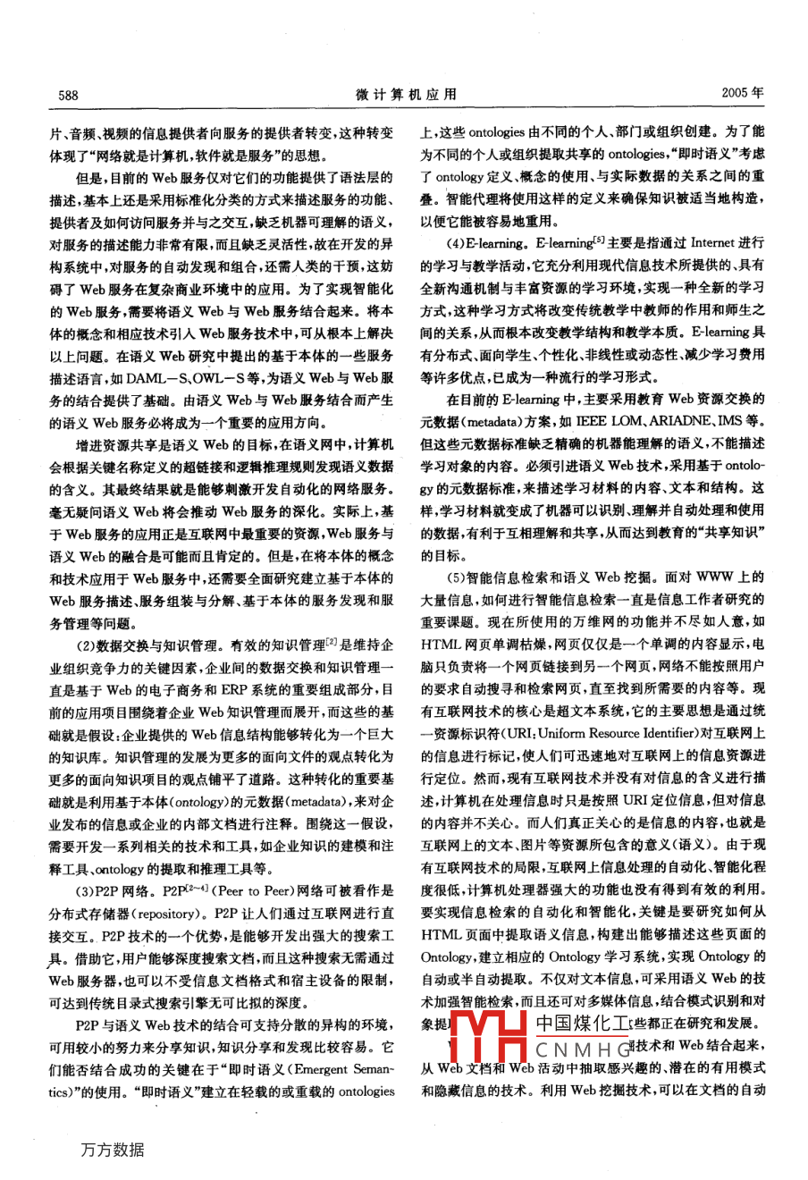 第26卷第5期VoL 26 No 52005年9月MICROCOMPUIER APPLICATIONSpt2005語(yǔ)義Web及其應(yīng)用*沈海波12洪帆1(1華中科技大學(xué)計(jì)算機(jī)學(xué)院武漢430074;2湖北教育學(xué)院計(jì)算機(jī)科學(xué)系武漢430205)摘要:語(yǔ)言文Web是下一代 Interuet的發(fā)展方向。語(yǔ)義Web的定義、分層結(jié)構(gòu)進(jìn)行了概述,詳細(xì)總結(jié)和研究了語(yǔ)義Web在Web服務(wù)、P2P網(wǎng)絡(luò)、知識(shí)管理、E- learning、智能信息檢索和語(yǔ)義Web挖摑、網(wǎng)格計(jì)算等多個(gè)領(lǐng)域的應(yīng)關(guān)鍵詞:語(yǔ)義Web本體元數(shù)據(jù)應(yīng)用Semantic Web and Its ApplicationsSHEN Haibo.2, HONG Fan'( School of Computer, Huazhong University of Science and Technology, Wuhan, 430074, China2Department of Computer Science, Hubei College of Education, Wuhan, 430205, China)Abstract, Semantic Web is the development direction of the next generation Internet. the definition and layeredstructure of the Semantic Web were outlined, and its applications in some areas, such as Web services, P2P network,knowledge management, E-learning, intelligent information searching and Semantic Web mining, grid computing andso on, were summarized and researched in detaiL語(yǔ)義web追求的目標(biāo)是讓W(xué)eb上的信息能夠被機(jī)器理表示,以滿足分布式主流計(jì)算環(huán)境語(yǔ)義互操作的需要使軟件解,從而實(shí)現(xiàn)Web信息的自動(dòng)處理,以適應(yīng)Web信息資源的 Agent對(duì)www上異構(gòu)和分布信息進(jìn)行智能的有效的訪問(wèn)快速增長(zhǎng),更好地為人類服務(wù)。近年來(lái),無(wú)論在國(guó)際上,還是和檢索。在國(guó)內(nèi),人們對(duì)語(yǔ)義Web及其關(guān)鍵技術(shù)和應(yīng)用的研究正在如根據(jù)W3C,語(yǔ)義Web研究的主要目的就是擴(kuò)展當(dāng)前的火如茶語(yǔ)義Wb的支撐軟件與應(yīng)用開(kāi)發(fā)日益受到重視語(yǔ)Www使得網(wǎng)絡(luò)中所有信息都具有語(yǔ)義,計(jì)算機(jī)能夠理解和義Web可以看作是新一代的信息基礎(chǔ)設(shè)施被人們稱為第三處理便于人和計(jì)算機(jī)之間的交互與合作。因而其研究的側(cè)代智能網(wǎng)絡(luò)重點(diǎn)就是如何把信息表示為計(jì)算機(jī)能夠理解和處理的形式,即帶有語(yǔ)義,以支持網(wǎng)絡(luò)環(huán)境下廣泛有效的自動(dòng)推理1語(yǔ)義Web概述1.2語(yǔ)義web的分層模型1.1語(yǔ)義web的定義為了實(shí)現(xiàn)語(yǔ)義Web信息服務(wù)的智能化與自動(dòng)化的目標(biāo),www的發(fā)明者 Tim berners-Le早在1999年就提出語(yǔ)義web研究者們開(kāi)發(fā)了許多新技術(shù)并提出了一系列的技了語(yǔ)義Web( Semantic Web)的概念。他所領(lǐng)導(dǎo)的非贏利性術(shù)標(biāo)準(zhǔn)。 Tim Berners-Le提出了XML2000語(yǔ)義Web模組織WC于2000年創(chuàng)建了www.SemanticWeb.org網(wǎng)站,型,它是一種分層結(jié)構(gòu)的模型如圖1所示并在2001年正式提出語(yǔ)義Web。所謂“語(yǔ)義”就是文本的含(1) Unicode和URI層。是語(yǔ)義Web的最底層。Uni義。語(yǔ)義Wb就是能夠根據(jù)語(yǔ)義進(jìn)行判斷的網(wǎng)絡(luò)。因此簡(jiǎn)code可以保證我們使用國(guó)際化、通用化的字符集避免不同類單地說(shuō)語(yǔ)義Web是一種能理解人類語(yǔ)言的智能網(wǎng)絡(luò),它不型字符集之間由于編碼不同而造成的存儲(chǔ)、傳遞和使用上的但能夠理解人類的語(yǔ)言,而且還可以使人與電腦之間的交流混亂,同時(shí)也可以實(shí)現(xiàn)多國(guó)語(yǔ)言的混合存儲(chǔ)和使用。變得像人與人之間交流一樣輕松。語(yǔ)義Web是下一代互聯(lián)中國(guó)煤化工的事物—無(wú)論是網(wǎng)絡(luò)網(wǎng)的發(fā)展方向,其實(shí)質(zhì)就是增強(qiáng)網(wǎng)絡(luò)資源內(nèi)容和功能的語(yǔ)義中的中的某個(gè)人、一座房子、CNMHG本文于2004-08-27收到湖北省自然科學(xué)基金項(xiàng)目資助(2004ABA055)5期沈海波等:語(yǔ)義Web及其應(yīng)用別和組織起來(lái)同時(shí)也通過(guò)屬性將概念相互聯(lián)系起來(lái)從而建Rules立起概念的語(yǔ)義空間,亦即對(duì)某一個(gè)領(lǐng)域內(nèi)事物的共同理解。ProofDa這些概念和屬性的名字(即標(biāo)識(shí)構(gòu)成了 Ontology的詞匯表在語(yǔ)義Web的交流/通信中, Ontology擔(dān)當(dāng)著語(yǔ)義溝通的重Ontology vocabulary要角色,是其實(shí)現(xiàn)的關(guān)鍵技術(shù)之一。 Ontology需要用 AntolRDF+rdfscemagy語(yǔ)言描述和建構(gòu)。常用的 Ontology描述語(yǔ)言有DAMLXML+NS+xmlschemaS、OWL-S等。Unicode(5) Ontology的頂層: Logic、 Proof和 Trust,這三層位于語(yǔ)義Web體系結(jié)構(gòu)的頂部,也是語(yǔ)義表達(dá)的高級(jí)要求,目圖1XML2000語(yǔ)義Web體系結(jié)構(gòu)前正處于研究階段,也有一些簡(jiǎn)單的示范性應(yīng)用系統(tǒng)正在建設(shè)中。其中,邏輯層( Logic)提供了推理規(guī)則的描述手段,論一張桌子等都可以稱為資源。每一個(gè)資源都由惟一的URI證層(Poo通過(guò)運(yùn)用這些規(guī)則進(jìn)行邏輯推理和求證,而信任所標(biāo)識(shí)不同的資源擁有不同的URI,通過(guò)指定的URI可以層(Trus則負(fù)責(zé)為應(yīng)用程序提供一種機(jī)制以決定是否信任確定互聯(lián)網(wǎng)中惟一的資源(即定位的惟一性)。給出的論證2)XML+NS+ XML Schema層。是語(yǔ)義Web中首要(6)數(shù)字簽名( Digital Signature)。數(shù)字簽名位于層
