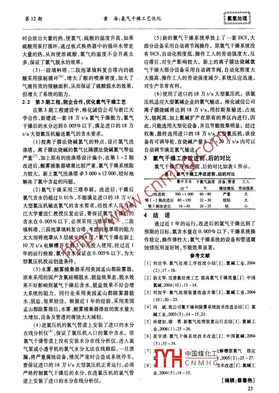 第12期氯堿工業(yè)2007年12月Chlor-Alkali IndustryDec.,2007氯氣干燥工藝優(yōu)化黃海(中鹽湖南株洲化工集團(tuán)科人設(shè)計(jì)有限責(zé)任公司,湖南株洲412004[關(guān)鍵詞]氯氣;干燥;優(yōu)化改進(jìn)[摘要]通過(guò)優(yōu)化氯氣干燥工藝,將I個(gè)泡沫篩板塔逐步改成氯氣洗滌塔、兩級(jí)鈦冷器、兩級(jí)填料于燥塔級(jí)泡罩填料復(fù)合塔,使氯氣含水由0.05%~0.10%降低到0.005%以下,從而滿足氯氣用大型氯壓機(jī)輸送的要求減輕對(duì)設(shè)備、管道的腐蝕。中圖分類號(hào)]TQ0282[文獻(xiàn)標(biāo)志碼]B[文章編號(hào)]1008-133x(2007)12-0022-02中鹽株化集團(tuán)誠(chéng)信有限公司(以下簡(jiǎn)稱“株化鹽水換熱器,再經(jīng)過(guò)二級(jí)鈦冷器進(jìn)一步冷卻脫水,其誠(chéng)信公司”)現(xiàn)有6萬(wàn)凵a普通陽(yáng)極隔膜膜法燒堿,中第1級(jí)鈦冷器用循環(huán)水,第2級(jí)鈦冷器冬天用循5萬(wàn)υa擴(kuò)張陽(yáng)極隔膜法燒堿,14萬(wàn)υa離子膜燒環(huán)水、夏天用5℃水,再經(jīng)水霧捕集器后進(jìn)入泡沫塔堿,這些裝置分3期建設(shè)。第1期2004年投產(chǎn)4萬(wàn)用濃硫酸進(jìn)一步脫水,從泡沫塔出來(lái)的氯氣經(jīng)過(guò)酸U/a離子膜燒堿替代4萬(wàn)ta的石墨陽(yáng)極隔膜法燒霧捕集器后經(jīng)氯氣泵送至用戶。堿;第2期2005年上5萬(wàn)ta擴(kuò)張陽(yáng)極隔膜法燒1.2原氯氣干燥工藝中存在的問(wèn)題堿;第3期2006年上10萬(wàn)t/a離子膜法燒堿。技術(shù)(1)塔的操作彈性小。泡沫塔的空塔氣速一般改進(jìn)前的10萬(wàn)va燒堿氯氣干燥部分設(shè)備能力不控制在1.2~2.2m/s,空塔氣速太小會(huì)漏液,太大匹配,干燥后的氯氣含水達(dá)0.05%~0.10%,同時(shí)會(huì)夾帶霧沫因而泡沫塔的操作彈性較小。株化誠(chéng)干燥設(shè)備、管道嚴(yán)重腐蝕。第1-2期技改時(shí),將信公司干燥氯氣僅用1個(gè)塔,不利于燒堿廠根據(jù)不氯氣干燥的能力擴(kuò)大到14萬(wàn)ta的氯氣處理能力,同的負(fù)荷組織生產(chǎn),無(wú)法保證氯氣干燥后的水分在并改進(jìn)了部分氯氣干燥系統(tǒng)將原來(lái)的1個(gè)泡沫篩0.01%以下,應(yīng)在泡沫塔后面增加1個(gè)填料泡罩復(fù)板塔改成一段填料塔、二段泡罩填料復(fù)合塔,將原來(lái)合塔。干燥氯氣用的濃硫酸自流改為酸循環(huán)(冷卻)使用,(2)泡沫塔內(nèi)的硫酸沒(méi)有冷卻而降低脫水效從而使干燥后的氯中含水量降低到0.01%以下,滿果。從硫酸高位槽流出的98%濃硫酸經(jīng)過(guò)泡沫塔足節(jié)能設(shè)備小透平機(jī)輸送氯氣的要求。第3期將離與塔底上升的氯氣逆流接觸,濃硫酸吸附氯氣中的子膜法燒堿與隔膜法燒堿的氯氣干燥分成2套系水分,由于濃硫酸吸水時(shí)放出大量的反應(yīng)熱,常常使統(tǒng)原氯氣干燥為隔膜法燒堿服務(wù),同時(shí)考慮到第4氯氣離開泡沫塔時(shí)溫度高達(dá)70~80℃,從而導(dǎo)致氯期還要上4萬(wàn)a離子膜燒堿,第3期新上離子膜氣中含水很高。法燒堿的氯氣干燥能力按18萬(wàn)∪a設(shè)計(jì),新上離子2氯氣干燥工藝的優(yōu)化改進(jìn)膜法燒堿的氯氣干燥采用氯氣洗滌塔、兩級(jí)鈦冷器、2.11~2期工程的改進(jìn)措施兩級(jí)填料干燥塔、一級(jí)泡罩填料復(fù)合塔,水霧、酸(1)將1個(gè)泡沫塔改成一段填料塔、二段泡罩霧捕集器釆用美國(guó)孟山都除霧器ˉ,氯氣干燥后填料復(fù)合塔。一段用填料塔,填料的操作彈性大,氣的含水量達(dá)到0.005%以下,氯氣干燥后的水分滿液傳質(zhì)效果好,同時(shí)在填料塔中沒(méi)被硫酸吸收的水足進(jìn)口的大型氯壓機(jī)輸送氯氣的含水要求S。分可以在泡罩填料復(fù)合塔中被吸收,保證氯氣中的1原氯氣干燥工藝水減少到規(guī)定值。1.1原氯氣干燥工藝流程(2)一段填料塔、二段泡罩填料復(fù)合塔內(nèi)的硫電解工序送來(lái)的濕氯氣經(jīng)氯氣洗滌塔除鹽進(jìn)入酸用外循環(huán)冷卻帶走熱量。硫酸吸收氯氣中的水分中國(guó)煤化工作者簡(jiǎn)介]黃海(1972-),男,1997年畢業(yè)于武漢化工學(xué)院CNMH,擔(dān)任株化科人設(shè)計(jì)公司工藝管道室主任。收稿日期]2007-08-02第12期黃海:氯氣干燥工藝優(yōu)化氯氫處理時(shí)會(huì)放出大量的熱,使氯氣、硫酸的溫度升高,如果(5)新的氯氣干燥系統(tǒng)單獨(dú)上了一套DCS,大硫酸用泵打循環(huán),通過(guò)板式換熱器中的循環(huán)水帶走部分設(shè)備采用自動(dòng)調(diào)節(jié)閥操作。原氯氣干燥系統(tǒng)沒(méi)大量的熱,從而使?jié)饬蛩?、氯氣的溫度不?huì)升高太有DCS,自動(dòng)化程度低操作工人的勞動(dòng)強(qiáng)度大,反多,保證了氯氣脫水的效果。應(yīng)滯后,對(duì)生產(chǎn)影響較大。新上的離子膜法燒堿氯(3)一段填料塔、二段泡罩填料復(fù)合塔內(nèi)的硫氣干燥大部分設(shè)備采用自動(dòng)調(diào)節(jié)閥,自動(dòng)化程度大酸采用強(qiáng)制循環(huán)(,增大了酸的噴淋密度,加大了.大提高操作工人的勞動(dòng)強(qiáng)度減少,系統(tǒng)反應(yīng)迅速,氣液傳質(zhì)的接觸面積,從而保證了硫酸脫水的效果,對(duì)生產(chǎn)非常有利但增大了系統(tǒng)的阻力。(6)使用了進(jìn)口的18萬(wàn)∽a大型氯壓機(jī)。該氯2.2第3期工程院企合作優(yōu)化氯氣干燥工藝壓機(jī)適應(yīng)大型氯堿企業(yè)的氯氣輸送。株化誠(chéng)信