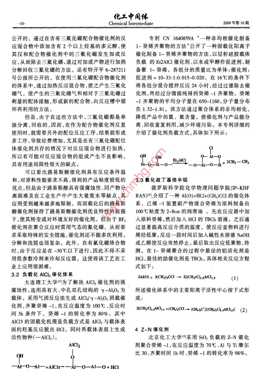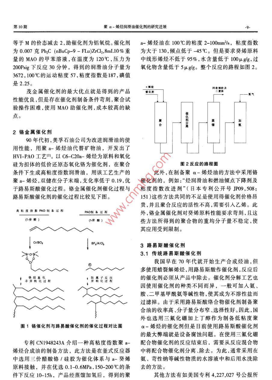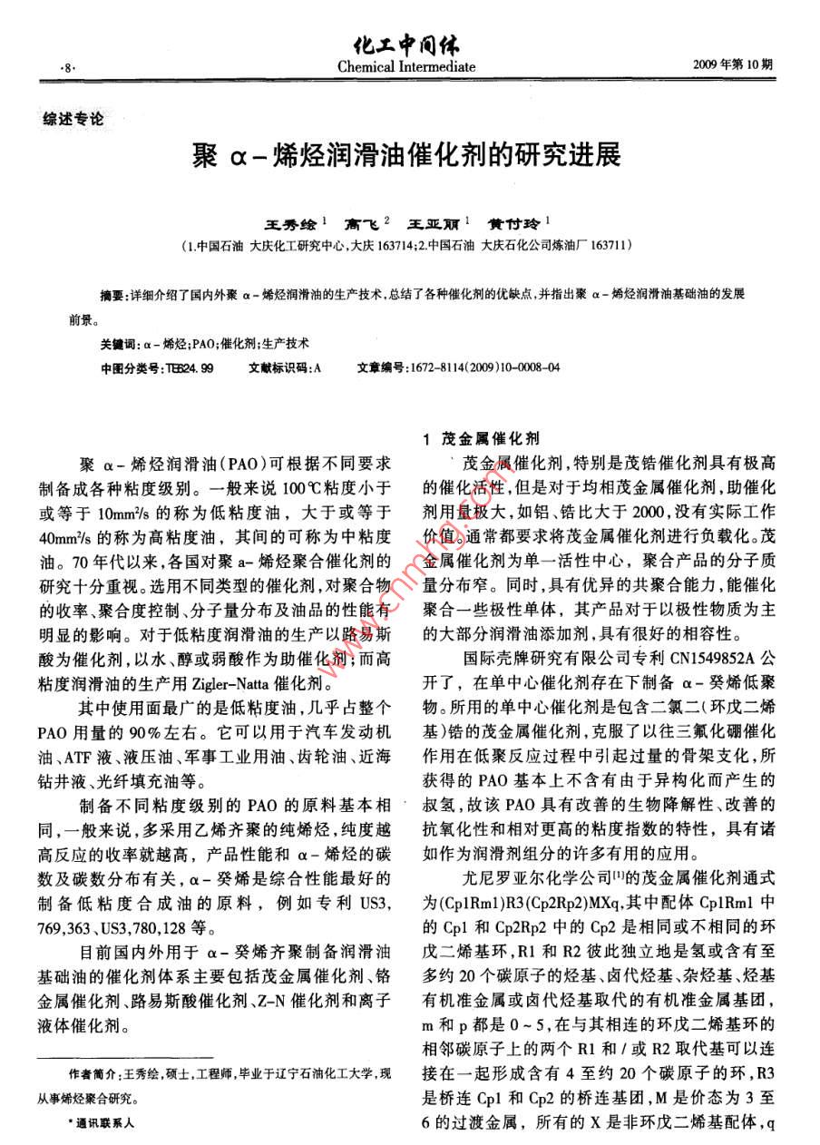 化工中間體.8●Chemical Intermediate2009年第10期綜述專論聚x-烯烴潤滑油催化劑的研究進(jìn)展王秀繪高飛2王亞麗1黃付玲 1(1.中國石油大慶化工研究中心,大慶163714;2.中國石油大慶石化公司煉油廠163711)摘要:詳細(xì)介紹了國內(nèi)外聚a-烯烴潤滑油的生產(chǎn)技術(shù)??偨Y(jié)了各種催化劑的優(yōu)缺點(diǎn),并指出聚a-烯烴潤滑油基礎(chǔ)油的發(fā)展前景。關(guān)鍵詞:a-烯烴;PAO;催化劑;生產(chǎn)技術(shù)中團(tuán)分類號:E624.99文獻(xiàn)標(biāo)識碼:A文章編號:1672-8114(2009)10-0008 041茂金屬催化劑聚a-烯烴潤滑油(PAO)可根據(jù)不同要求茂金屬催化劑,特別是茂鋯催化劑具有極高制備成各種粘度級別。一般來說100粘度小于的催化活性,但是對于均相茂金屬催化劑,助催化或等于10mm/s的稱為低粘度油,大于或等于劑用量極大,如鋁、鋯比大于2000,沒有實(shí)際工作40mm2/s的稱為高粘度油,其間的可稱為中粘度價(jià)值。通常都要求將茂金屬催化劑進(jìn)行負(fù)載化。茂油。70年代以來,各國對聚a-烯烴聚合催化劑的金屬催化劑為單- -活性中心,聚合產(chǎn)品的分子質(zhì)研究十分重視。選用不同類型的催化劑,對聚合物量分布窄。同時(shí),具有優(yōu)異的共聚合能力,能催化的收率、聚合度控制、分子量分布及油品的性能有聚合一些極性單體,其產(chǎn)品對于以極性物質(zhì)為主明顯的影響。對于低粘度潤滑油的生產(chǎn)以路易斯的大部分潤滑油添加劑,具有很好的相容性。酸為催化劑,以水、醇或弱酸作為助催化劑;而高國際殼牌研究有限公司專利CN1549852A公粘度潤滑油的生產(chǎn)用Zigler- -Natta催化劑。開了,在單中心催化劑存在下制備a-癸烯低聚其中使用面最廣的是低粘度油,幾乎占整個(gè)物。所用的單中心催化劑是包含二氯二(環(huán)戍二烯PAO用量的90%左右。它可以用于汽車發(fā)動機(jī)基)鋯的茂金屬催化劑,克服了以往三氟化硼催化油、ATF液、液壓油、軍事工業(yè)用油、齒輪油、近海作用在低聚反應(yīng)過程中引起過量的骨架支化,所鉆井液、光纖填充油等。獲得的PAO基本上不含有由于異構(gòu)化而產(chǎn)生的制備不同粘度級別的PAO的原料基本相,叔氫, 故該P(yáng)AO具有改善的生物降解性、改善的同,一般來說,多采用乙烯齊聚的純烯烴,純度越抗氧化性和相對更高的粘度指數(shù)的特性,具有諸高反應(yīng)的收率就越高,產(chǎn)品性能和a-烯烴的碳如作為潤滑劑組分的許多有用的應(yīng)用。數(shù)及碳數(shù)分布有關(guān),a-癸烯是綜合性能最好的尤尼羅亞爾化學(xué)公司"的茂金屬催化劑通式制備低粘度合成油的原料,例如專利US3,為 (CplRm1)R3(Cp2Rp2)MXq,其中配體Cp1Rm1中769,363、US3,780,128等。的Cp1和Cp2Rp2中的Cp2是相同或不相同的環(huán)目前國內(nèi)外用于a-癸烯齊聚制備潤滑油戊二烯基環(huán),R1和R2彼此獨(dú)立地是氫或含有至基礎(chǔ)油的催化劑體系主要包括茂金屬催化劑、鉻多約20個(gè)碳原子的烴基、鹵代烴基、雜烴基、烴基金屬催化劑、路易斯酸催化劑、Z-N催化劑和離子有機(jī)準(zhǔn)金屬或鹵代烴基取代的有機(jī)準(zhǔn)金屬基團(tuán),液體催化劑。m和p都是0~5,在與其相連的環(huán)戊二烯基環(huán)的相鄰碳原子上的兩個(gè)R1和/或R2取代基可以連作者筒介:王秀繪,碩士,工程師,畢業(yè)于遼寧石油化工大學(xué),現(xiàn)接在一起形成含有4至約20個(gè)碳原子的環(huán),R3從事烯烴聚合研究。是橋連Cp1和Cp2的橋連基團(tuán),M是價(jià)態(tài)為3至●通訊聯(lián)系人6的過渡金屬,所有的X是非環(huán)戊二烯基配體,q第10期聚a-烯烴潤滑油催化劑的研究進(jìn)展.9.等于M的價(jià)態(tài)減去2,助催化劑為鋁氧烷。催化劑a-烯烴油在100C的粘度2-100mm2/s,粘度指數(shù)為0.007克Ph2C (nBuCp-9 - FLu)ZrCl2,8mL10%重為大于130, 傾點(diǎn)低于-45C。但是要求癸烯原料量的MAO的甲苯溶液,在溫度為1209,壓力為中線形烯烴不低于95%,水含量低于100μg/g,過200Psig下反應(yīng)30分鐘,得到的潤滑油分子量為氧化物含量低于5μgg。整個(gè)反應(yīng)的路程如圖2。3672, 100C的運(yùn)動粘度57,粘度指數(shù)是187,碘值是2.25。a嫌給茂金屬催化劑的最大優(yōu)點(diǎn)就是得到的產(chǎn)品儲化劑性能優(yōu)良,但是存在催化劑制備條件苛刻,聚合試驗(yàn)操作困難,使用MAO助催化劑,成本較高的缺點(diǎn)。臨|如離|2鉻金屬催化劑90年代初,美孚石油公司為改進(jìn)潤滑油的使用性能,用聚a-烯烴油代替礦物油,開發(fā)出了HVI-PA0工藝21。以C6- C20a-烯烴為原料和氧化硅為擔(dān)體的低價(jià)還原態(tài)氧化鉻為催化劑,在聚合圄2反應(yīng)的路程圖條件下生成高粘度指數(shù)潤滑油,用該工藝生產(chǎn)的此外,在制備聚a-烯烴油的方法中采用鉻聚a-烯烴,雙健在分子末端,支化率低于0.19,優(yōu)催化劑的,例如:“烴潤滑油和燃油傾點(diǎn)下降劑及于路易斯酸催化過程。鉻金屬催化劑催化過程與粘度指數(shù)改進(jìn)劑"(日本專利公開號JP09 ,508;路易斯酸催化劑的催化過程比較見下圖。151)這些方法共同的不足是使用得催化劑價(jià)格昂貴,并且聚合反應(yīng)的活性不高,需要引人乙烯。此高粘度指數(shù)PAO制備過程PAO制備過程外,鉻金屬催化劑對癸烯原料性能要求苛刻,且這(1突殿)(1嬰酸)些方法所得到的聚合物的重均分子量不穩(wěn)定,使其應(yīng)用受到限制。Cr/9O,BF,/AICL3路易斯酸催化