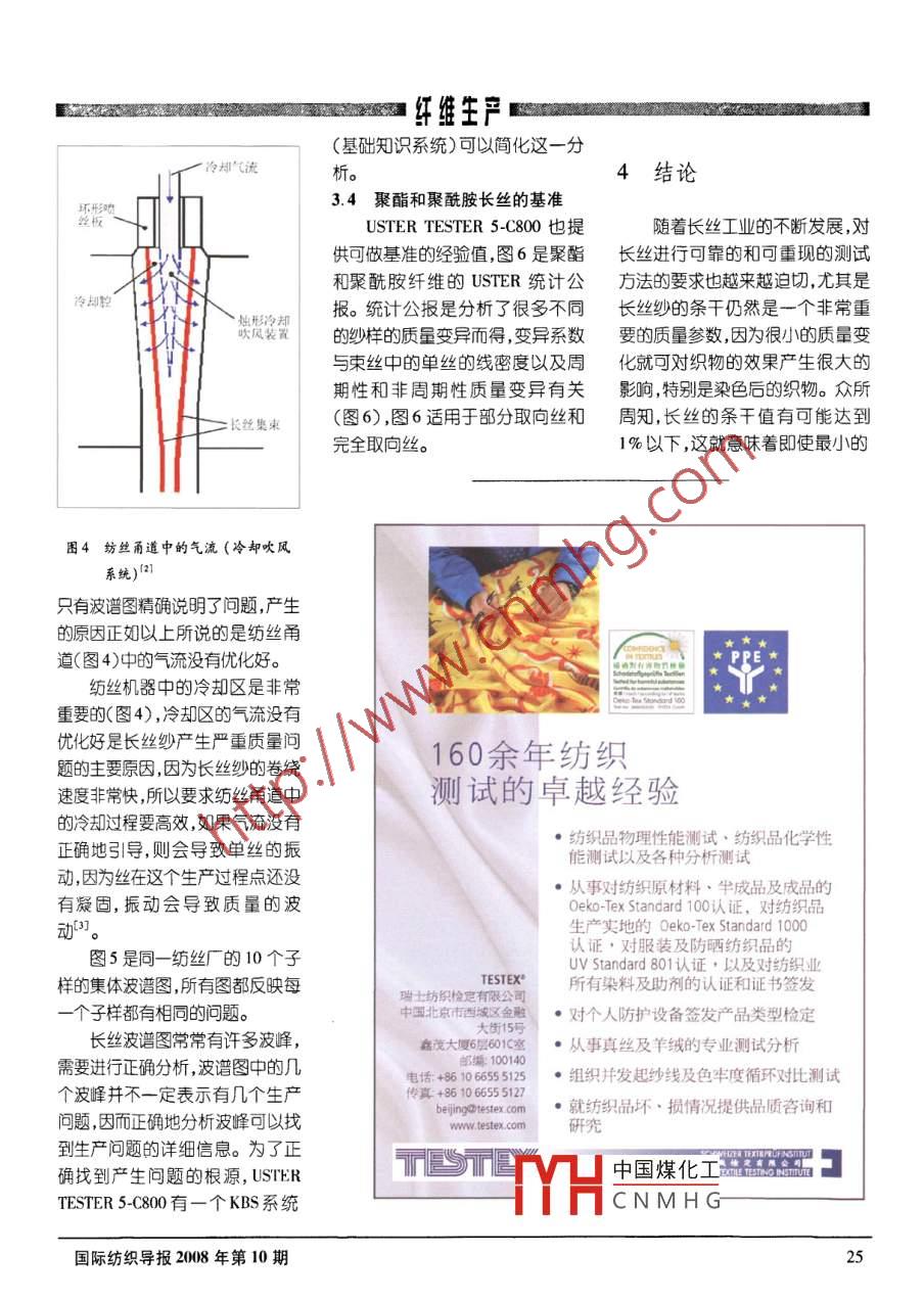 纖維生產長絲的工藝優(yōu)化S. D. Kretzschmar, R. Furter烏斯特技術公司(瑞士)摘要:天然纖維的應用雖已有數(shù)千年歷史 ,但仍無法滿足當今世界人口的需求,所以2熔體紡絲工序中常出合成纖維的發(fā)明無疑是20世紀最重要的發(fā)明之一。另一個重點是紡織行業(yè)現(xiàn)的紗疵源的競爭,為了不斷滿足客戶的新要求,長絲的生產工藝和其特性得到了多方面的改進,因而長絲工業(yè)也變得越來越重要。主要介紹了對長絲質量變化進行長絲紗的紡絲方法有多種,的測試和測試結果的分析。表1給出了一些紡絲方法。關鍵詞:烏斯特TESTER 5-C800,化纖長絲,條干均勻度檢測,質量控制本文將重點介紹熔體紡絲工因為紡絲速度非常高。這種質量藝過程,熔體紡絲被認為是最簡單的紡絲方法,因為此方法不需要使1引言變異會給后道工序生產帶來困難,用會產生問題的溶波。例如拉伸加捻工序、變形工序和染許多專家在著力于研究熔體天然纖維的應用雖然有數(shù)千色工序。這些質量變異導致了紗紡絲,不僅是在理論上,而且也做年的歷史,但仍無法滿足當今世界線質量的下降,因此全面質量檢測了大量的實驗[26],合成纖維的紡人口的需求”,所以合成纖維的發(fā)成為質量控制的必需。絲對各工序的參數(shù)變化影響非常明無疑是20世紀最重要的發(fā)明之鳥斯特技術公司從1955年開敏感,例如,紡絲過程中的大分子始就著力于生產長絲紗的檢測儀聚合物的熔化溫度以及冷卻空氣另一個重點是紡織行業(yè)的競器,2005年USTERO TESTER 5-的溫度[5] ,特別是紡絲箱體的環(huán)境爭,為了不斷滿足客戶的新要求,C800 長絲條干儀進入市場,長絲影響長絲的成型4。長絲的生產工藝和特性得到了多紗的質量參數(shù)可以通過此儀器很如圖1所示,熔體紡絲主要有方面的改進,長絲工業(yè)也變得越來快得到評估,并且測試結果可以用3個過程:給料階段、紡絲階段和越重要。來判斷后道工序的生產。.卷繞階段”。本文主要介紹了對長絲的質表1長絲紗的不同紡絲工藝方法(2]量變化進行的測試和測試結果的紡絲方法&分析。對于短纖紗來說,紗線不勻熔體紡.聚酰胺66聚酰胺6聚酯聚丙烯聚乙烯是不可避免的,主要因素為天然纖溶液紡維的變異、紡紗方法以及纖維在紗干法紡絲二乙酸纖維素三乙酸纖維素聚氨脂~氨蛇聚氣乙烯氯化聚氮乙烯中的排列。但對于長絲紗來說,異聚丙烯酸狀粒子、紡絲過程的不規(guī)則、冷卻濕法紡絲:直接溶劑聚丙烯酸變性緊丙烯腈.聚氬酯-氨鉈 聚乙酶芳蛇過程和卷繞過程的操作、以及機器造絲的缺陷和牽伸問題都會導致長絲濕法紡絲:行生法粘膠人中國煤化工質量不勻,甚至是上千米的不勻,MYHCNMHG國際紡織導報2008年第10期纖維生產二在給料階段,原材料可儲存,序的紗疵定熔化然后再加工,熔體紡絲的原材位由圖1加加料斗s]料可以是大分子顆粒,也可以是聚以說明”。合體切片,首先干燥,然后在擠壓如圖1機里熔融。在一些現(xiàn)代化的工廠,所示,圖中圓踴斗,長片段不勻或是聚酯和聚酰胺是在連續(xù)聚合裝置圈和三角表擠壓s長波長的紗疵范圍中生產的,在此裝置中熔體直接從示的機器部給料階段最終聚合器輸送到熔體紡絲裝置。件產生 的紗. 紡絲泵oo聚丙烯不同于聚酯和聚酰胺,因為疵,可以通過冷卻so}其聚合后生成固體產物,所以聚合不勻率曲線與紡絲過程分離。圖、波譜圖、紡絲階段在紡絲階段,每一次從擠壓機條干不勻值、牽伸準備. 矩片段不勻或是短波長的紗疵范圍傳輸?shù)郊徑z泵的添加劑和過濾后長度變異曲絲餅的熔體量相同,并同時被等量擠壓線圖和相對通過噴絲口(圖1),通過噴絲板之支數(shù)來查找。后,在距離噴絲口下方5 ~ 20 cm的..圖1中三角0o卷繞紡絲甬道處,由熔體紡成的長絲經標識的機器空氣冷卻成型,如果是用多噴口的部件產生的圖1熔體紡絲工序 中的常發(fā)紗疵定位7]噴絲頭,可以紡成未拉伸束絲或是紗疵,還可以部分拉伸束絲”。測量一個滿在卷繞階段,長絲通過紡絲甬筒的絲,通過不勻率曲線圖、波譜3長絲的條干測試和長道后,通過上油裝置卷繞到預備羅圖、長度變異曲線圖和相對支數(shù)來拉上,束絲在通過上油裝置之后卷查找”。絲的USTER統(tǒng)計公報繞成原絲包裝,并可以運輸?shù)较碌涝跍y試長度內,與名義值最大正如之前所述,長絲的質量指工序的機器”。的質量變異也可以測試出的。標可以通過USTER TESTER 5-以聚酰胺的生產為例,紡絲工C800長絲條干儀檢測,既有圖表分析的測試結果,也有數(shù)值分析的10/1測試結果。3.1不勻率 曲線圖不勻率曲線圖是條干測試重-10要的一部分,可提供長絲紡絲工序0 1002003004005006007008009001000中的很多細節(jié)信息,圖2是兩種不聚酯纖維(70 dtex/36)[長度/m0-同長絲的不勻辜曲線圖,下圖的長5手絲質量變異比,上圖的長絲的高得多。Wwwwwww圖2中上圖的紗條干不勻是2001 000CVm =1. 15%,下圖的紗條干不勻聚酯纖維(75 dtex/1281) 長度/m旦m-?K9%。下圖中紗的條圍2長絲紗的不勻率 曲線圖中國煤化工原因是紡絲甬道中MYHCNMHG國際紡織導報2008年第10期.2纖維生產表2長絲紗測試的數(shù)值結果NU%CVm .CVmRel.mMinmMax1m3m10 m50 mCnt士%1/11.311. 661.261.201.010. 260.2-3.53.8-2.03. I1/2.1.121.431.050.970.750.26- 3.33.4-1.81.51/31. 161.491.091.030.840.240.0-3.13.62. I1/41. 101.420.990.930.770.28-3.23.3-1.91.91/51.131.451.040.980.830.33-3.32.21/61.151.501.03.0.960.22-1.8 .2.31/71.120.82.0.35