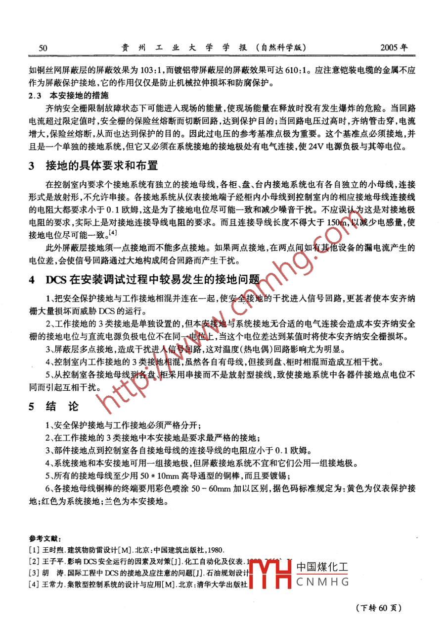 第34卷第5期.貴州工業(yè)大學學報(自然科學版)Vol.34 No.52005年10月JOURNAL OF GUIZHOU UNIVERSITY OF TECHNOLOGYOctober. 2005(Natural Science Edition)文章編號:1009-0193(2005)05-0048-03DCS的接地分析龔建平,張希周(貴州大學電氣工程學院,貴州貴陽50003)摘要:文章對分散型計算機控制系統(tǒng)幾種不同的接地方式作了詳細分析,并對在系統(tǒng)接地裝置安裝過程中出現(xiàn)的技術(shù)問題及注意事項提出了相應處理措施及說明。關(guān)鍵詞:DCS;接地;隔離;屏蔽中圖分類號:TM862文獻標識碼:B0引言DCS(Distributed ControlSystem)集散型控制系統(tǒng)自80年代中期進人我國以來,由于其先進性、可靠性與實用性在各主要工業(yè)領域得到廣泛應用,并逐步成為一種常規(guī)設計。在DCS應用中,接地問題往往不被人們所重視,易出現(xiàn)由于忽視接地而導致DCS不能正常工作的情況,甚至威脅到生產(chǎn)系統(tǒng)的安全運行。本文通過對DCS接地的分析,指出了在設計安裝調(diào)試中較易發(fā)生的接地問題,提出了DCS接地的關(guān)鍵所在。1接地的分類1.1接地分 為安全接地和工作接地兩種安全接地是為了人身和設備安全而設的接地。當設備絕緣老化時,設備會發(fā)生漏電現(xiàn)象,安全接地使設備外殼金屬部件不會產(chǎn)生對人身造成危害的過高電壓,也可使電氣設備的保護裝置動作、以免故障擴大。[1]在DCS中,安全接地同時也是靜電防護接地,具有重要的靜電防護作用。在集散控制系統(tǒng)中有大量的CMOS器件,CMOS器件對靜電較敏感。據(jù)統(tǒng)計,由于靜電造成的損壞占CMOS器件損壞的78% . CMOS器件靜電損壞主要分為電壓擊穿損壞和功率擊穿損壞。CMOS的絕緣介質(zhì)層SIO2的耐壓值僅為100V,當靜電電壓超過此值時,氧化膜就會被擊穿造成針孔而導致柵溝相通使器件失效;靜電積累會造成放電,放電電流流過集成電路內(nèi)部時會引起PN結(jié)溫度升高,這可能燒毀內(nèi)部連線或造成內(nèi)部導線截面變小,也可能引起合金化或造成金屬擴散,最終造成器件破壞或嚴重的電老化,給設備帶來極大隱患。1.2工作接地分 為屏蔽接地、系統(tǒng)接地、本安接地三種(1)屏蔽接地屏蔽接地是為避免電磁場對儀表和信號的干擾而采取的接地?,F(xiàn)場儀表的信號通過電纜送到控制室的DCS,信號從現(xiàn)場到控制室的過程中會受到許多電磁干擾。電磁千擾可分為靜電感應產(chǎn)生的干擾和電磁感應產(chǎn)生的干擾。靜電感應產(chǎn)生的干擾是信號回路周圍存在的分布電容引起的,當- - 些電源電纜和信號電纜平行靠在一起時,信號電纜的信號回路由靜電感應而產(chǎn)生干擾電壓ES:_CiEs= 2c+CoEi .(1)式中: Ci- -第 i根電源電纜與信號電纜間電容,F;中國煤化工Coi除第i根電源電纜外其他電源電纜與信號MYHCNMHGEi-第i根電源電纜內(nèi)的電壓,V.收稿日期:2005-04- 15.第5期龔建平,等:DCS的接地分析由式(1)可知,當信號電纜與電源電纜無隔離地并行在一起時 ,干擾電壓大小取決于它們相對的幾何位置。當靠得很近時,220V電源使信號回路有100V左右的干擾電壓,這顯然是不允許的。電磁感應產(chǎn)生的干擾是信號電纜周圍電磁場造成的,在信號回路中產(chǎn)生干擾電壓Em:Em=中EMiliIi一-第I號電流回路流國的電流,AMi-信號回路與第I號電流回路間的互感系數(shù)。電磁感應產(chǎn)生的干擾還包括其他電磁場(大型電機、變壓器等)引起的干擾。(2)系統(tǒng)接地系統(tǒng)接地的目的是使DCS信號建立一個基準點,該基準點接地是為了使基準點保持較穩(wěn)定的電位,以保證信號傳輸?shù)目煽啃院蜏蚀_性。若基準點有干擾或噪音,可因其接地使之影響減少。通常24V電源的負極也接在這個基準點上。系統(tǒng)接地網(wǎng)絡應盡可能地縮短其距離,以減少回路阻抗。(3)本安接地本安接地是給配有本安齊納安全柵的回路中的齊納安全柵專設的接地,齊納安全柵的接地直接關(guān)系到本安回路的本質(zhì)安全功能的實現(xiàn)。圖1為齊納式安全柵的接地原理圖,從圖中可以看到SG和AG兩個接地點;B點與C點電位相同,D點是變送器外殼在現(xiàn)場接地。若現(xiàn)場與控制室有地電位差存在,則D點與B點電位就不安全播同,若以B點為參考零電位,當D點出現(xiàn)一-10 V的電位,A,B間仍為24 V,則A,D間就有34 V電位差,在這種情況下,齊納管不會反向?qū)?不起保護作用,但如果不小心,現(xiàn)場信號線碰到變送器外殼,產(chǎn)生的電火花可能點燃爆炸氣體。反之,若D點。( + \出現(xiàn)+ 10 V的電位,則可以影響變送器的信號,給DCS造成干卑|卑AG擾。電租2。DCS接地采取的主要措施|sc2.1靜電防護措施主要有兩種(1)阻止靜電產(chǎn)生和減少靜電電荷的積累。在DCS控制室圖1齊納安全柵接線原理圖[2]內(nèi)要采用防靜電地板,并嚴格要求在進行手工操作DCS內(nèi)部器件時,工作人員應穿戴防靜電的工作服鞋和帽,應戴防靜電護腕,不用易產(chǎn)生靜電的材料裝修控制室、不用易產(chǎn)生靜電的器具,以免靜電加到器件上造成器件損壞。(2)采取讓靜電得以泄放的措施。泄放的主要方法是靜電接地,即工作臺機柜及所有可能有靜電積累處予以接地,使靜電有可靠的泄放通道。2.2屏蔽接地的措施為減少電磁干擾可采取多種措施,如信號線采用雙絞線信號電纜穿人接地的鋼管、在電纜橋架及電纜溝中封閉并與電源電纜隔離等。據(jù)API標準,電源電線與信號電纜最小應保