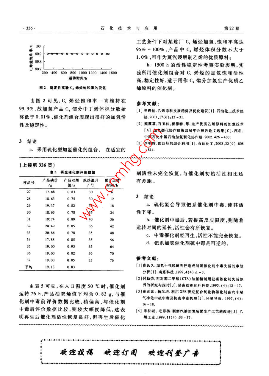 第22卷第5期石化技術與應用Vol.22 No.52004年9月Petrochemical Technology & ApplicationSep.2004研究與開發(fā)(334~336)C,烯烴加氫生產乙烯料的工藝研究田鵬程,屈錦華,戴立順,高曉冬(中國石化石油化工科學研究院,北京10083)摘要:將2種硫化型加氫催化劑組合裝填,進行了C。餾分加氫生產乙烯裂解原料的實驗,確定了適宜的C,烯烴加氫飽和工藝條件,并進行了1500 h催化劑活性穩(wěn)定性考察實驗。結果表明:在氫分壓為3.2 MPa、反應溫度為(基準+30)9C ,氫/油體積比為200,體積空速為(基準x2.0) h"' 的反應條件下,C,烯烴的加氫飽和率達到95%~100%,加氫C.烯烴體積分數不大于1.0%,是蒸汽裂解制乙烯的優(yōu)質原料。關鍵詞:碳四烯烴;加氫;蒸汽裂解;乙烯原料中圈分類號:TQ221.21'1文獻標識碼:B文章編號:1009 - 0045<(2004)05 -0334 -03據專家預計,我國乙烯消費量在2005年將達裹1實驗用原料組成體積分數%到10 Mt,2010年將達到13 Mt1-2)。 目前,石腦V(異丁烷)/ V(異丁烷)/異丁烷丁烯V(丁烯)=2:1 V(丁烯)=3:1油仍是世界上最主要的乙烯裂解原料。隨著石C0.710.070.510.55腦油資源日漸短缺,尋找新的乙烯裂解原料,對正T烷3.235.513.99.3.80乙烯生產是非常必要的。異丁燒94. 8930. 2673. 3578.73我國許多煉油化工一體化企業(yè)煉廠氣資源1-丁烯48.6516. 2612.21異丁烯0. 122. 670.970.76豐富,C,餾分過剩,但典型的催化裂化裝置的C,順丁烯0.04.081.381.05餾分中C,烯烴體積分數高達50% ~ 60%3],同反丁烯D.108.122.772.101,3-丁二烯0.000.640.16時還含有少量的二烯烴以及硫、砷等雜質,如直Cs及以上組分0.840.000. 560.63接將C,餾分作為蒸汽裂解制乙烯的原料,則烯總計100烴在裂解爐中會發(fā)生聚合、環(huán)化、縮合和結焦反丁烯合計0.3264.1521. 6016.28應,因此必須將烯烴除去。采用低壓加氫飽和烯烴并脫除其雜質,是使C。餾分成為優(yōu)質乙烯裂1.2實驗裝置及 催化劑解料的主要方法。實驗在250 mL加氫裝置上進行,異丁烷和中國石化石油化工科學研究院(RIPP)針對使丁烯分別經計量泵至反應器入口與新氫混合進用貴金屬加氫催化劑進行C,餾分加氫存在的硫、人反應器床層,反應后進人高壓分離器進行氣液砷導致催化劑中毒的問題,采用非貴金屬催化劑,分離,液相產物經降壓后用鋼瓶取樣分析。以國內某煉廠的C,餾分為原料,進行了系統(tǒng)的工由于煉廠C,餾分中一般都含有一定量的藝條件和催化劑活性穩(wěn)定性考察。1,3-丁二烯,而二烯烴在高溫下極易發(fā)生聚合,因此,對于C,加氫通常先采用低溫及低加氫活性1實驗部分的催化劑對二烯烴進行加氫,然后再進入活性較高1.1 原料的加氫催化劑床層進行烯烴飽和反應。本實驗采實驗原料為取自某煉廠的C,餾分(簡稱丁烯),并以異丁烷(取自某煉廠烷基化裝置)代替實際工業(yè)裝置用的稀釋油,所用丁烯、異丁烷及收稿日期:2004 -04 -19;修回日期:2004 -06-07作者簡介:田鵬程(1962- ),男,北京人,工程師,現(xiàn)從事石油混合原料的組成見表1。煉制中試研究工作。第5期田鵬程等. C,烯烴加氫生產乙烯料的工藝研究●335●用一種硫化型的選擇性加氫脫雙烯催化劑和一種空速、氫/油比等工藝條件對丁烯加氫的影響,其中硫化型加氫精制催化劑組合裝填的方式。反應溫度為(基準+30)C ,體積空速為(1 ~2) x基準h~' ,氫/油體積比為200 ~700,異丁烷與丁烯2結果與討論的體積比(簡稱稀釋比)為2~3。此外,還考察了2.1 工藝條件考察氫分壓為4.8 MPa的超臨界條件下丁烯的加氫效在氫分壓3.2 MPa下,考察了反應溫度、體積果。各實驗的工藝條件和產品組成見表2。表2丁烯加氫實驗工藝條件和產品組成項目實驗1實驗2實驗3實驗 4實驗5實驗6實驗7實驗8實驗9 實驗 -3B工藝參數氫分壓/MPa3.24.8反應溫度/C基準-30基準基準基準基準+10基準+10 基準+15基準+30 基準-5烯烴進料空速/h-'基準x1.5 基準基準基準x1.5 基準x1.5基準x1.5基準x1.5基準x2.0基準氫/油體積比D0: 1700:1350:150:1350: I200: I稀釋比2:13:13:產品組成φ/%C,-C,0.430.520.590.540.550. 700.670.49正丁烷16.37 20.43 18.90 19. 7824.48 19. 0826.1120.2520.2120.08異丁烷71.72 78.40 78. 9978.8574.3779. 6172. 7077.5378.4678. 171-丁烯0.980.000.09 .0.020.070.04異丁烯0.730.00 0.14.000.130.10順丁烯3.050.240.050.00;0., 000.200.00 .反丁烯;6.110.460.00.0. 380. 000.251.3-丁二烯0.00 0.00C,及以上組分0.600.650.60.0.610.72.640.750.74 .總計00100丁烯合計*φ/%32.59 0.00 3.68 0. 763.132.08烯烴飽和率”/%49.2094.2698.8299.9795. 1399. 9796.76”:指將產品中丁烯的體積分數還原為純丁烯進料時產品中丁烯的體積分數:* * :相對純丁烯進料的烯烴飽和率:由表2可見,采用稀釋比為3:1的混合進料,溫升較小,反應溫度較易控制。在實驗2的條件下,烯烴飽和率高達100%,丁烯2.2催化劑穩(wěn)定性考察體積分數降至0;當將氫/油體積比由700降低至為了考察所用催化劑組合加氫處理丁烯原350時(實驗3),烯烴飽和率降低至94.26%,烯料的穩(wěn)定性,在完成上述工藝條件實驗(催化劑烴體積分數升高到3.68%,這說明氬/油比對烯已運轉320 h)的基礎上,在氫分壓3.2 MPa,基準烴加氫有影響。在氫/油體積比為350的條件溫度,體積空速(基準x2.0) h-'的條件下,以丁下,提高氫分壓至4.8 MPa(實驗4),使反應在超烯為原料(性質見表1)進行了催化劑活性穩(wěn)定性臨界條件下進行,可使烯烴飽和率由94.26%提實驗結果見圖1和圖2。由圖1可見,催化劑床高至98. 82%,產品的丁烯體積分數由3.68 %降.層平均溫度一直高于要求值(基準溫度),這是由至0.76%,可見,提高氫分壓可使烯烴飽和率