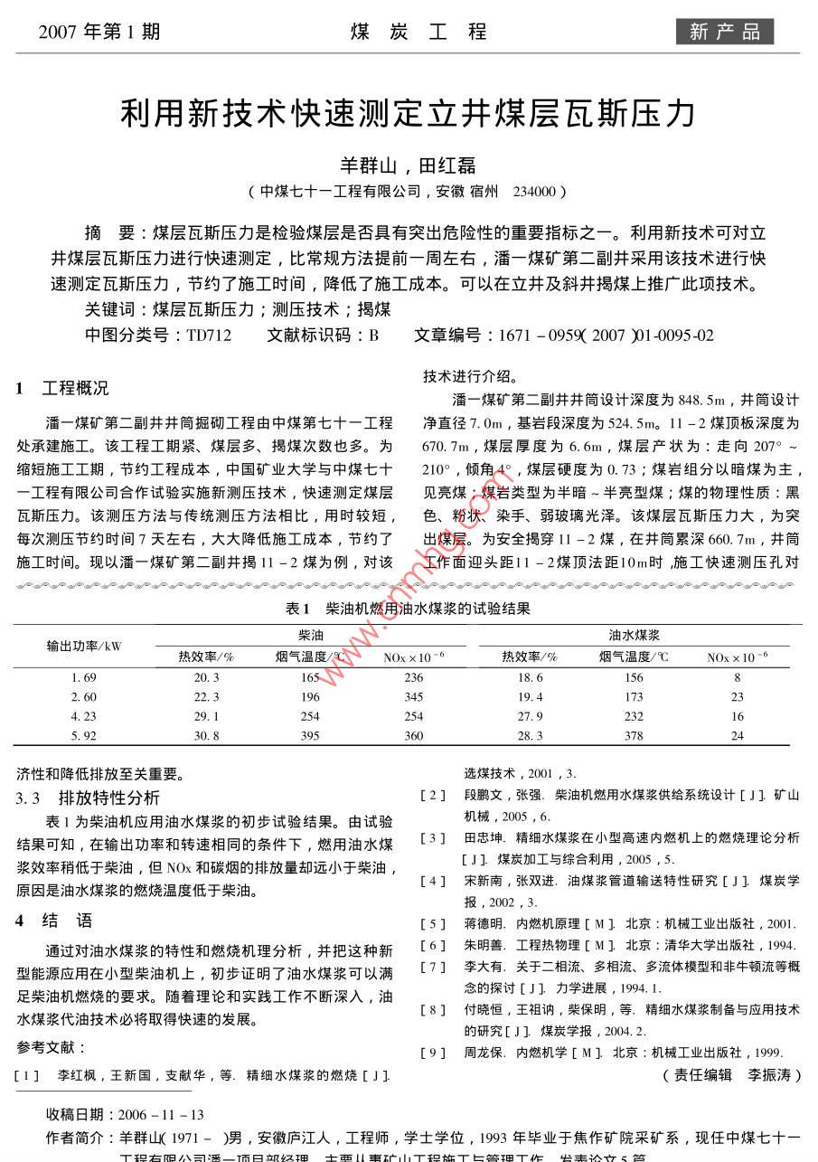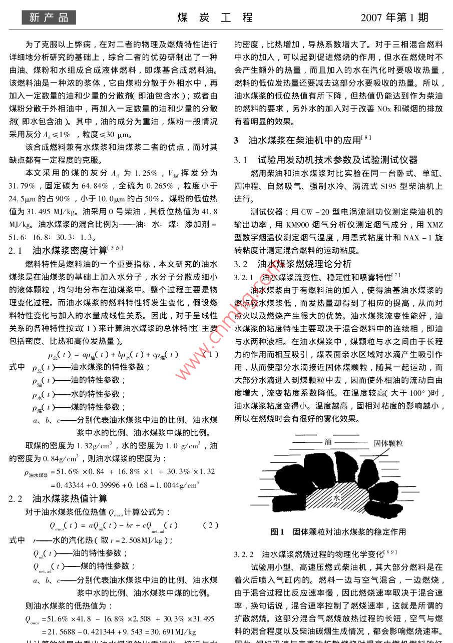 2007年第1期煤炭工程新產(chǎn)品柴油機(jī)替代燃料油水煤漿的研究張強(qiáng),毛君,張佳,段鵬文,任蘭鑄(遼寧工程技術(shù)大學(xué),遼寧阜新123000摘要∶為了解決國(guó)際能源日益緊張的問(wèn)題,開(kāi)發(fā)新的柴油機(jī)替代燃料十分必要。作者通過(guò)對(duì)新型替代燃料——油水煤漿的理論分析和試驗(yàn)硏究,最終證明了油水煤漿作為柴油杋代用燃料是可行的。關(guān)鍵詞:油水煤漿;柴油機(jī);替代燃料;排放中圖分類號(hào):TQ534.3文獻(xiàn)標(biāo)識(shí)碼:A文章編號(hào):1671-0959(2007)01-009303Research on oil coal mixture for diesel engineZHANG Qiang, MAO Jun, ZHANG Jia, DUAN Peng-wen, REN Lan-zhuC Liaoning Technology University Fuxin, 123000, ChinaAbstract: In order to release the present tension of the international energyecessary to develop a new fuellternative for the diesel engine. With the theoretical analysis and test research ond coal water mixture to be a newfuel alternative of the diesel engine, the paper identified that the oil coal water mixture to replace the diesel for the dieselKeywords: oil coal water mixture diesel engine ; alternative fuel emission1柴油機(jī)及煤基合成燃料簡(jiǎn)介我國(guó)可生產(chǎn)水煤漿的煤種多而齊全價(jià)格偏低勞動(dòng)力和添加劑的成本低,所以水煤漿的價(jià)格與發(fā)達(dá)國(guó)家相比,是低廉世界石油價(jià)格的持續(xù)升溫使發(fā)展中國(guó)家的經(jīng)濟(jì)安全受的水煤漿的生產(chǎn)儲(chǔ)運(yùn)和燃用都有利于環(huán)境保護(hù)等。到嚴(yán)重的威脅,美、日等國(guó)也紛紛拋出戰(zhàn)略儲(chǔ)備油來(lái)緩解本文分析了油水煤漿的特性,分析了油水煤漿的霧化石油價(jià)格對(duì)經(jīng)濟(jì)的壓力,同時(shí)各國(guó)加緊了尋找可再生能源及燃燒規(guī)律,并以一種油水煤漿為例進(jìn)行試驗(yàn),說(shuō)明了用和可替代石油的燃料的步伐油水煤漿替代柴油燃用是完全可行的。柴油機(jī)是將燃料燃燒釋放岀來(lái)的熱能轉(zhuǎn)變?yōu)闄C(jī)械能的一種能量轉(zhuǎn)換裝置。在柴油機(jī)中燃料與空氣混合燃燒后產(chǎn)2煤基合成燃料的特性分析生高溫、高壓的工作氣體,它作為熱能的載體推動(dòng)活塞以水煤漿(CwM)和油煤漿(COM)為代油燃料,實(shí)現(xiàn)資再通過(guò)連杄、曲軸向外輸岀杋械功。柴油機(jī)是一種數(shù)量大、源節(jié)約和優(yōu)化,是兩種相對(duì)比較成功的代油措施,都對(duì)能應(yīng)用面廣、熱效率高的動(dòng)力機(jī)械,是機(jī)車、船舶的主要?jiǎng)釉吹母咝Ю镁哂蟹e極的作用,但二者在推廣應(yīng)用上都有力設(shè)備。我國(guó)的柴油機(jī)保有量相當(dāng)大,并且以相當(dāng)高的速—定的局限性。其中,油煤漿的粘度偏高,影響燃料的供度增長(zhǎng),對(duì)柴油燃料的需求量越來(lái)越大。因此,提髙柴油給,且節(jié)油旳數(shù)量不大。一般來(lái)說(shuō),隨著溫度的增加,油機(jī)的性能和開(kāi)發(fā)新型可替代能源對(duì)于我國(guó)的有著重要的意煤漿粘度呈先降后增的變化趨勢(shì),且只在低溫(160℃左文23。右)達(dá)到最低,而粘度在溫度超過(guò)240℃后迅速增加油水煤漿便是一種可替代石油的煤基代油燃料,在我這是因?yàn)樵谟兔簼{燃料中,煤的溶脹及溶岀物是升溫過(guò)程國(guó)發(fā)展水煤漿技術(shù)其社會(huì)效益和經(jīng)濟(jì)效益更明顯,其原因中煤漿粘度變化的主要影響因素,作為柴油機(jī)燃料,它的是貧油富煤是我國(guó)的國(guó)情,石油供求的現(xiàn)實(shí)已經(jīng)使我們不溶脹及溶出物對(duì)供給影響比較大,容易造成供給不足,燃能把它僅僅作為燃料而燒掉。我囯科技工作者經(jīng)過(guò)α0多年燒不平穩(wěn)的現(xiàn)象;雖然水煤漿能節(jié)約大量燃料油,但單位的攻關(guān)研究,水煤漿的加工工藝及技術(shù)在某些方面已經(jīng)居體積的水煤漿熱能太低,容易造成動(dòng)力不足,出現(xiàn)熄火現(xiàn)于世界領(lǐng)先水平,我國(guó)是煤炭生產(chǎn)消費(fèi)大國(guó),煤炭深加工象,且當(dāng)柴油機(jī)供給和燃燒時(shí),柴油機(jī)的及其噴嘴必須進(jìn)技術(shù)、設(shè)備成熟,已經(jīng)能夠獨(dú)立完成各檔次的水煤漿加工,行較大改造,因此阻止了它的推廣應(yīng)用。收稿日期:2006-05-20基金項(xiàng)目:國(guó)家重點(diǎn)技術(shù)創(chuàng)新項(xiàng)目”煤基柴油代用燃料的制備與燃用”「新產(chǎn)品煤炭工程2007年第1期為了克服以上弊病,在對(duì)二者的物理及燃燒特性進(jìn)行的密度,比熱增加,導(dǎo)熱系數(shù)增大了。對(duì)于三相混合燃料詳細(xì)地分析研究的基礎(chǔ)上,綜合二者的優(yōu)勢(shì)研制出了一種中水的加入,可以起到促進(jìn)燃燒的作用,但水在燃燒時(shí)不由油、煤粉和水組成合成液體燃料,即煤基合成燃料油。會(huì)產(chǎn)生額外的熱量,而且加入的水在汽化時(shí)要吸收熱量該燃料油是一種濃的漿體,它由煤粉分散于外相水中,再燃料的低位發(fā)熱量還要減去這部分水要吸收的熱量。所以,加入一定數(shù)量的油和少量的分散劑(即油包含水);或者由油水煤漿的低位熱值有所下降,但熱值仍能達(dá)到作為柴油煤粉分散于外相油中,再加入一定數(shù)量的油和少量的分散的燃料的要求,另外水的加入對(duì)于改善NOx和碳煙的排放敵即水包含油)其中,油的成分為重油,煤粉一般情況有