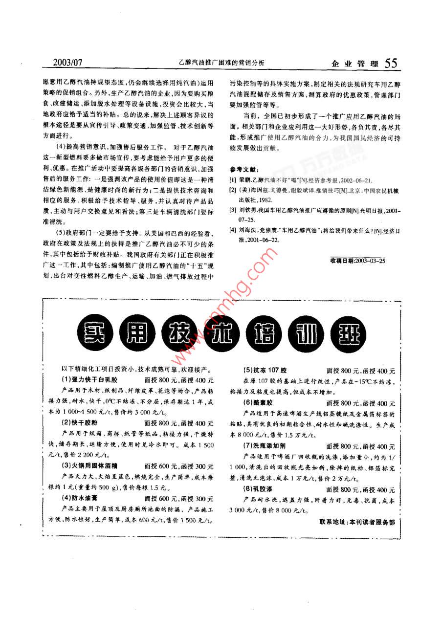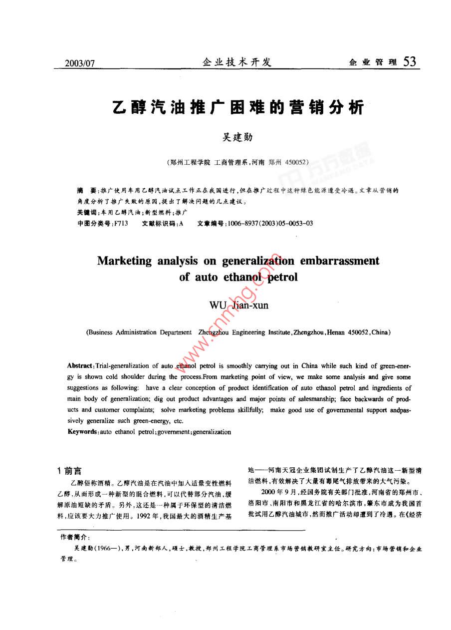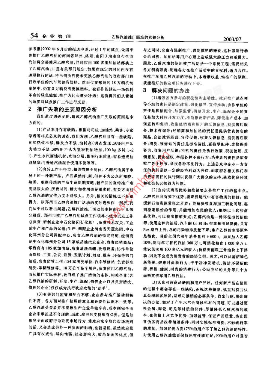 2003/07企業(yè)技術(shù)開發(fā)乙醇汽油推廣困難的營銷分析吳建勛鄭州工程學院工商管理系,河南鄭州450052)摘要;推廣使用豐用乙醇汽油試點工作正在我國進行,但在推廣過程中這種綠色能源遭受冷遇。文章從營銷的角度分析了推廣失敗的原因,提出了解決問題的幾點建議關(guān)鑣詞:車用乙醇汽油;新型然料;推廣中圖分類號:F713文讞標識碼:A文章編號:1006-8937(2003)05-0053-03Marketing analysis on generalization embarrassmentof auto ethanol petrolwu Jian-xunBusiness Administration Department Zhengzhou Engineering Institute, Zhengzhou, Henan 450052, China)Abstract: Trial-generalization of auto ethanol petrol is smoothly carrying out in Chinasuch kind ofgy is shown cold shoulder during the process From marketing point of view, we make some analysis andsuggestions as following: have a clear conception of product identification of auto ethanol petrol and ingredients ofmain body of generalization; dig out product advantages and major points of salesmanship; face backwardsucts and customer complaints; solve marketing problems skillfully; make good use of govemmental supportsively generalize such green-energy, etc.Keywords: auto ethanol petrol; government generalization1前言河南天冠企業(yè)集團試制生產(chǎn)了乙醇汽油這一新型清乙醇俗稱酒精。乙醇汽油是在汽油中加入適量變性燃料潔燃料,有效解決了大量有毒尾氣排放帶來的大氣污染。乙醇,從而形成一種新型的混合燃料,可以代替部分汽油,緩2000年9月,經(jīng)國務(wù)院有關(guān)部門批準,河南省的鄭州市解原油短缺的矛盾。另外,這還是一種屬于環(huán)保型的清潔燃洛陽市南陽市和票龍江省的哈爾濱市肇東市成為我國首料應(yīng)該要大力推廣使用。1992年,我國最大的酒精生產(chǎn)基批試用乙醇汽油城市然而推廣活動卻遭到了冷遇。在《經(jīng)濟作者簡介:昊建勛(1966—),男,河南新鄭人,碩士,教授,鄭州工程學院工商管理系市場營教研室主任。研究方向:市場營銷和企業(yè)54企業(yè)管理乙醇汽油推廣困難的營銷分析2003/07參考報》2002年6月份的報道中說,經(jīng)過1年的試點,全國率與之同時,它也有強制推廣強制推銷的嫌疑,這種強制行動先推廠乙醇汽油的河南省鄭州、洛陽、南陽3地市宣布全市會給司機、加油站等用戶心理上造成強大的壓力和威懾力汽油將全部使用乙醇汽油同時市內(nèi)100多座加油站都換上因此,乙醇汽油的使用推廣活動是一個系統(tǒng)工程,需要相關(guān)了乙醇汽油,并且有關(guān)部門規(guī)定如果在規(guī)定的時間內(nèi)沒有各方明確職責、明確各方在推廣活動中的責權(quán)利,通力合作。遵照執(zhí)行的話將吊銷所有仍未更換乙醉汽油的政府部門和在推廣車用乙醇汽油的行動中,本著誰收益,誰推廣的原則行政單位的汽車駕駛員駕照。然而僅在鄭州的18萬輛機動就能很好的將這項任務(wù)進行下去。車輛中仍有8萬輛沒有更換燃料。被看作能掀起一場燃料3解決問題的辦法革命的綠色能源,推廣為何會遭受冷遇?這值得我們從營銷的角度對試點推廣工作進行反思(1)增強各方參與的積極性和主動性。政府推廣試點領(lǐng)2推廣失敗的主要原因分析導(dǎo)小組的責任是制定政策強化指導(dǎo)宣傳推動;協(xié)作單位的責任是積極配合、加強監(jiān)管;研制開發(fā)、生產(chǎn)、混配企業(yè)的責我們通過調(diào)研發(fā)現(xiàn),造成乙醇汽油推廣失敗的原因是多任是加大科技開發(fā)力度,不斷推出新產(chǎn)品、降低生產(chǎn)成本、加方面的:強宜傳和促銷、收集經(jīng)銷商和用戶的反饋信息、提供售后服(1)產(chǎn)品本身存有缺陷。根據(jù)對司機、加油站乘客、專家務(wù)、技術(shù)咨詢等;經(jīng)銷商和加油站的責任是提供貨真價實的學者等相關(guān)公眾的調(diào)查,我們發(fā)現(xiàn),乙醇汽油具有一些缺陷。商品、合法誠實經(jīng)營、宣傳促銷,收集反饋信息,提供售后服比如熱值不夠,爆發(fā)力不強,油耗高(調(diào)查發(fā)現(xiàn),50%用戶認務(wù);清洗、維修站的責任是標準清洗、更換零配件維修保養(yǎng)為動力不足,30%用戶認為里程耗油增加,100kg多耗1-2咨詢,收集用戶反饋;司機的責任是執(zhí)行政策,積極使用,反1)、產(chǎn)生水汽腐蝕機材;水油分層,影響行車質(zhì)量;容易造成油饋意見,提出建議,舉報各種不法行為;消費者的責任是監(jiān)督路堵塞;與普通汽油混合使用不便等等。推廣各個環(huán)節(jié)舉報各種不法行為。上述公眾中企業(yè)一方責(2)宜傳工作不得力、相關(guān)措施不到位。乙醇汽油屬于市任的執(zhí)行是以一定的經(jīng)濟利益為補償,而政府各相關(guān)部門和場上的一種新產(chǎn)品。產(chǎn)品雖然好新,但并不為公眾所知曉消費者責任的執(zhí)行則以獲得廣大群眾的支持、獲取優(yōu)良環(huán)境熟悉。根據(jù)傳統(tǒng)的產(chǎn)品生命周期策略,新產(chǎn)品的宣傳推廣難和社會長遠效益為補償。度是很大的所費時間精力和費用也是很多的,有關(guān)方面對2)宜傳該商品優(yōu)勢和推銷要點是推廣工作的基本點。乙醇汽油的宣傳力度不是很大。另外,相關(guān)的措施也不是很乙醇汽油具有如下優(yōu)勢:能降低尾氣中有害物質(zhì)的排放;能得力,以鄭州市乙醇汽油推廣活動的實際進程作一剖析,我緩解石油資源緊張之矛盾;能解決糧食深加工轉(zhuǎn)化問題起們從中可以看出問題:乙醇汽油推廣活動的主體