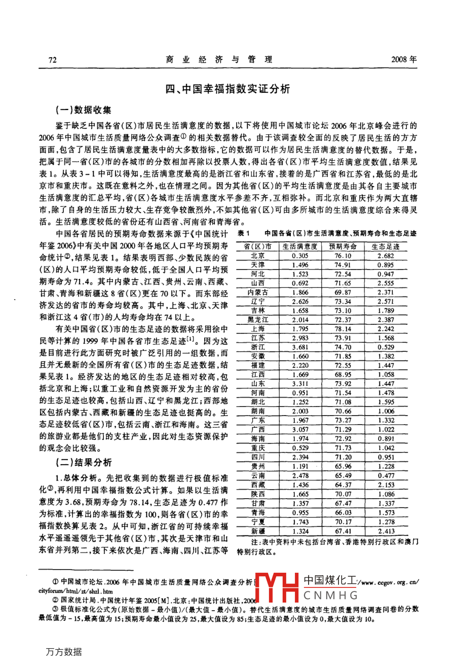 第6期總第200期商業(yè)經(jīng)濟(jì)與管No, 6 Vol, 200年6月JOURNAL OF BUSINESS ECONOMICSJun.2008中國幸福指數(shù)的構(gòu)建王慧紅,陳楠(福州大學(xué)管理學(xué)院,福建福州350002)摘要:近年來,在中國創(chuàng)建和諧社會的進(jìn)程中,民生問題和環(huán)境問題引起人們極大的關(guān)注。文章從投入與產(chǎn)出的角度,基于以人為本和可持續(xù)發(fā)展的原則,構(gòu)建中國幸福指數(shù)。通過中國幸福指數(shù)測量中國各地區(qū)在追求居民幸福生活產(chǎn)出的同時,是否關(guān)注生態(tài)資源的投入。該指數(shù)的理論框架來源于幸福星球指數(shù)。文章的創(chuàng)新之處在于,構(gòu)建的中國幸福指數(shù)的分子部分代表人們的幸福生活產(chǎn)出,分母部分代表生態(tài)資源的投入,以此衡量中國各地區(qū)追求幸福的生態(tài)效率,或可持續(xù)的幸福水平。關(guān)鍵詞:中國幸福指數(shù);幸福星球指數(shù);生活滿意度;生態(tài)足跡中圖分類號:F22文獻(xiàn)標(biāo)識碼:A文章編號:1000-2154(2008)06-0070-05、引言隨著時代不斷文明進(jìn)步,國際社會核心價值正從經(jīng)濟(jì)發(fā)展回歸并落實(shí)到增進(jìn)民生福祉上來。幸福指數(shù)由此孕育而生。早在70年代,南亞不丹國已經(jīng)提出“國民幸福指數(shù)”的核算。這引起了各國經(jīng)濟(jì)學(xué)家的關(guān)注,并紛紛開始研究有關(guān)幸福指數(shù)的理論。近年來,世界各國更刮起了構(gòu)建幸福指數(shù)指標(biāo)體系、試算國內(nèi)幸福指數(shù)的熱潮。在英國,政府公布的“2002年生活滿意度”文件中認(rèn)為“國家有理由進(jìn)行干預(yù),以提高國民對生活的滿意度”;在美國,諾貝爾經(jīng)濟(jì)學(xué)獎得主丹尼·卡尼曼教授與其他專家于2006年起編制國民幸福指數(shù),使它與GDP一樣成為一個國家發(fā)展水平的衡量標(biāo)準(zhǔn)。中國國家統(tǒng)計(jì)局也于2006年9月12日宣布,今后將推出幸福指數(shù)等一些新的統(tǒng)計(jì)內(nèi)容,以適應(yīng)各方面對中國經(jīng)濟(jì)社會協(xié)調(diào)發(fā)展的需求。從最初的GDP核算,到綠色GDP探討,再到人類發(fā)展指數(shù)HD的公布,最后到幸福指數(shù)的試算,人們正逐漸形成以人為本的觀念。從單純關(guān)注經(jīng)濟(jì)的增長,到注重經(jīng)濟(jì)的真正發(fā)展,再到重視人類的發(fā)展,最后回歸到人類的幸福生活,人們的價值觀已經(jīng)發(fā)生了極大的轉(zhuǎn)變。本文所構(gòu)建的中國幸福指數(shù)不同之處在于,它從投入與產(chǎn)出的角度測量我國居民在追求幸福生活產(chǎn)出的同時,是否關(guān)注生態(tài)資源的投入。它的理論框架來源于幸福星球指數(shù),衡量中國各省(區(qū))市迫求幸福的生態(tài)效率,或可持續(xù)的幸福水平。二、幸福星球指數(shù)在國內(nèi)外的幸福指數(shù)理論中,最引人注目的是英國的幸福星球指數(shù)( Happy Planet Index)。它給人耳目收稿日期:2008-03-22作者簡介:王慧紅(1965-),女,福建永春人,福州大學(xué)管理學(xué)院中國煤化工計(jì)量經(jīng)濟(jì)學(xué)分析與應(yīng)用研究陳楠(984-),女,福建福州人,福州大學(xué)管理學(xué)院碩士研究生CNMHG究①李權(quán)興.“國民幸福指數(shù)”和“快樂指數(shù)”學(xué)說連線,[2007-07HSA. wwv aua amoy/ xss/2007-07-042188l.hm第6期王慧紅,陳楠:中國幸福指數(shù)的構(gòu)建71新的感受。2006年,英國“新經(jīng)濟(jì)基金”和“地球之友”組織發(fā)表了178個國家的“全球幸福星球指數(shù)”;接著2007年,又發(fā)布了30個國家的“歐洲幸福星球指數(shù)”。該指數(shù)由生活滿意度,預(yù)期壽命及生態(tài)足跡①(或碳足跡)②三部分構(gòu)成。它的計(jì)算方法是通過生活滿意度和預(yù)期壽命相乘得到幸福生活年③,然后除以生態(tài)足跡,以此來探討能否花費(fèi)最少的資源讓人們過上最幸福的生活。在2006年的“全球幸福星球指數(shù)”排名中,太平洋島國瓦努阿圖榮獲冠軍。其中中美洲國家排名靠前接著是亞洲國家,然后是歐美國家,最后是非洲國家。西方國家排名普遍靠后使許多人質(zhì)疑該指數(shù)的準(zhǔn)確性。但只要看過報告就會發(fā)現(xiàn),幸福星球指數(shù)不是用于衡量地球上最幸福的國家或最適宜居住的國家,也不是用于衡量世界上最發(fā)達(dá)的國家或?qū)Νh(huán)境最友好的國家。它是一個衡量各國人民在創(chuàng)造長久、幸福生活的同時是否關(guān)注人類賴以生存的有限的生態(tài)資源的指標(biāo),即人類幸福生活的生態(tài)效率的指標(biāo)。調(diào)查者希望人類在關(guān)注自身幸福的同時關(guān)注生態(tài)環(huán)境幸福星球指數(shù)在所有的幸福指數(shù)中可算是獨(dú)樹一幟,具有鮮明的特色。首先,大部分幸福指數(shù)注重衡量幸福的產(chǎn)出,而幸福星球指數(shù)則關(guān)注幸福的投入產(chǎn)出比;其次,它衡量的是一種相對的幸福,而多數(shù)幸福指數(shù)衡量的卻是絕對的幸福;最后,如果說多數(shù)幸福指數(shù)衡量的是人類的幸福,體現(xiàn)以人為本的思想,而幸福星球指數(shù)衡量的則是人類和生態(tài)的共同幸福,反映的是可持續(xù)發(fā)展的觀念。鑒于以上的區(qū)別,我們不能用其他幸福指數(shù)的結(jié)果作為評判幸福星球指數(shù)準(zhǔn)確與否的標(biāo)準(zhǔn)。雖