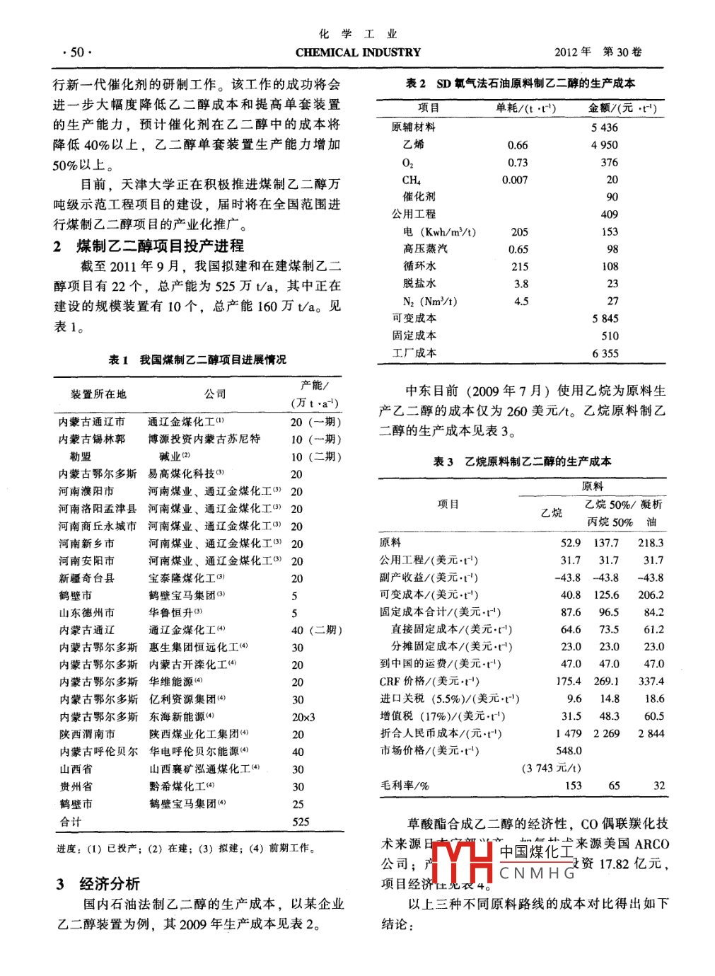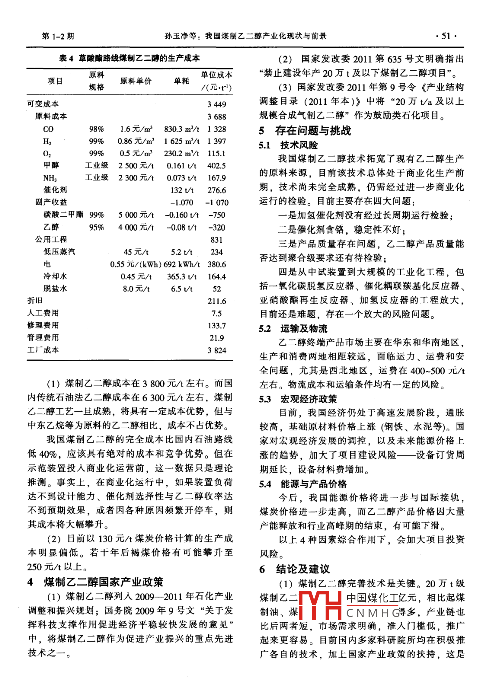 第30卷第1-2期化學工業(yè)2012年1-2月CHEMICAL INDUSTRY49射我國煤制乙二醇產(chǎn)業(yè)化現(xiàn)狀與前景孫玉凈,于春梅(中石油東北煉化工程有限公司吉林設(shè)計院,吉林132002)摘要:介紹了我國煤制乙二醇技術(shù)水平及其項目進展情況。經(jīng)過經(jīng)濟分析與對比,得出該方法對傳統(tǒng)石油法乙二醇工藝具有一定成本優(yōu)勢,但與中東乙烷等為原料的乙二醇相比,成本不占優(yōu)勢。如果今后褐煤價格上升將增加更多變數(shù)。為此提出了有益的建議。關(guān)鍵詞:煤化工;乙二醇;制備;技術(shù)經(jīng)濟對比;技術(shù)經(jīng)濟分析;評論文章編號:1673-9647(2012)1-2-0049-04中圖分類號:TQ54文獻標識碼:A煤制乙二醇在2009年初列入國家石化產(chǎn)業(yè)調(diào)2011年7月,上海浦景化工技術(shù)有限公司向整和振興規(guī)劃,國內(nèi)掀起了一股煤制乙二醇的開內(nèi)蒙億利資源集團所屬的西部新時代能源投資股發(fā)投資熱潮。至今,在建、擬建的煤制乙二醇項份有限公司轉(zhuǎn)讓了30萬ta煤制乙二醇裝置成套目超過20個,總產(chǎn)能525萬t/a,煤制乙二醇技技術(shù)。術(shù)已成為業(yè)界關(guān)注的熱點。13五環(huán)工程公司-湖北化學所-鶴壁寶馬1國內(nèi)相關(guān)技術(shù)發(fā)展情況2011年7月1日,由鶴壁寶馬集團和五環(huán)工11福建物構(gòu)所-丹化集團程公司、湖北省化學研究院共同合作建設(shè)的煤制該集團2006年完成300t級中試裝置乙二醇工業(yè)試驗裝置全流程成功打通2008年完成了萬噸級工業(yè)試驗裝置。通遼金煤鶴壁市正在加快推進中國石化與河南煤化合化工(中科院福建物構(gòu)所、上海金煤、丹化科作的鶴壁煤化一體化項目,各項前期工作已全面技)首期20萬t/a煤制乙二醇項目已于200年展開,一期投資近4億元的5萬ta煤制合成氣底建成投產(chǎn)。2010年通過對原有設(shè)計進行調(diào)整生產(chǎn)乙二醇工業(yè)化示范裝置已開工,25萬ta裝使整套裝置具備15萬t/a乙二醇并聯(lián)產(chǎn)10萬t/a置已備案,其他前期工作正在積極推進。草酸的能力。但由于催化劑等問題,至今仍未正14中石化(揚子-上海石化院常開車。2011年4月18日,中國石化合成氣制乙二12華東理工-安徽淮化-上海浦景醇中試裝置在位于江蘇南京的揚子石化建成、中2011年由華東理工大學、淮化集團以及上海交。該項目為中國石化重點科研開發(fā)項目,采用浦景化工合作開發(fā)了煤制乙二醇技術(shù),建成了千了上海石化研究院研發(fā)的合成氣制乙二醇技術(shù)。噸級中試裝置。開發(fā)的煤制乙二醇技術(shù)已申報61.5天津大學項發(fā)明專利和2項實用新型專利。與國內(nèi)其他技2001年完成了300t/aCO氣相催化偶聯(lián)制草術(shù)相比在催化劑和原料工藝等方面有所突破。該酸酯、草酸中試,開發(fā)了1000U/a草酸酯加氫制套中試裝置具備4項技術(shù)優(yōu)勢:流程完整,由酯乙二醇的工藝軟件包。并申請了28項發(fā)明專利。化、羰化、加氫和乙二醇精制4個工序構(gòu)成;所天津大學在草酸酯加氫制乙二醇技術(shù)開發(fā)方面取用催化劑為銅硅催化劑,不含鉻,活性高,預期得了突破H中國煤化工性、高選擇性壽命長;采用純氮氧化物作為酯化工序的開車和與長壽命CNMHG化劑。正在進補充物料,易于控制;對一氧化碳原料氣的要求收稿日期:2011-10-14不高,氫氣含量上限為2000μL/L,遠高于其他作者簡介:孫玉凈(1966-),女,吉林省人,教授級高工,從事工藝所要求的10μL左右。項目管理工作?;瘜W工業(yè)50CHEMICAL INDUSTRY2012年第30卷行新一代催化劑的研制工作。該工作的成功將會表2SD氧氣法石油原料制乙二醇的生產(chǎn)成本進一步大幅度降低乙二醇成本和提高單套裝置項目單耗/(tt)金額/(元·t)的生產(chǎn)能力,預計催化劑在乙二醇中的成本將原輔材料5436降低40%以上,乙二醇單套裝置生產(chǎn)能力增加495050%以上。目前,天津大學正在積極推進煤制乙二醇萬CHa噸級示范工程項目的建設(shè),屆時將在全國范圍進催化劑公用工程行煤制乙二醇項目的產(chǎn)業(yè)化推廣電(Kwh/m3/t)2煤制乙二醇項目投產(chǎn)進程高壓蒸汽065截至2011年9月,我國擬建和在建煤制乙二循環(huán)水215醇項目有22個,總產(chǎn)能為525萬t/a,其中正在脫鹽水3.8建設(shè)的規(guī)模裝置有10個,總產(chǎn)能160萬ta。見N2(Nm3/1)4.5表1可變成本固定成本510表1我國煤制乙二醇項目進展情況工廠成本6355裝置所在地產(chǎn)能/公司中東目前(2009年7月)使用乙烷為原料生(萬t·a4)產(chǎn)乙二醇的成本僅為260美元t。乙烷原料制乙內(nèi)蒙古通遼市通遼金煤化工()20(一期內(nèi)蒙古錫林郭博源投資內(nèi)蒙古蘇尼特10(一期)二醇的生產(chǎn)成本見表3。勒盟堿業(yè)210(二期)表3乙烷原料制乙二醇的生產(chǎn)成本內(nèi)蒙古鄂爾多斯易高煤化科技河南濮陽市河南煤業(yè)、通遼金煤化工③20河南洛陽孟津縣河南煤業(yè)、通遼金煤化工③)20項目乙烷乙烷50%/凝析河南商丘永城市河南煤業(yè)、通遼金煤化工)20丙烷50%油河南新鄉(xiāng)市河南煤業(yè)、通遼金煤化工)20原料529137.7218.3河南安陽市河南煤業(yè)、通遼金煤化工0)20公用工程/(美元t新疆奇臺縣寶泰隆煤化工③副產(chǎn)收益/(美元t-43.8-43.8鶴壁市鶴壁寶馬集團③可變成本/(美元t)40.8125.6206.2山東德州市華魯恒升③固定成本合計/(美元t)內(nèi)蒙古通遼通遼金煤化工(4直接固定成