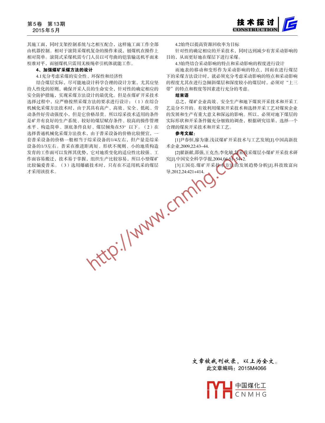 技術(shù)探討第5卷第13期后CONSTRUCTION2015年5月煤礦開采工藝與采煤方法研究鄒虎新疆煤炭設(shè)計(jì)研究院有限責(zé)任公司新疆 烏魯木齊市830091 .摘要:為了能夠提高煤礦企業(yè)開采效益,其開采技術(shù)與方法方面就要得到進(jìn)一步的提高。本文主要分析了煤礦開采技術(shù)與方法,從而為煤礦企業(yè)的發(fā)展提供基礎(chǔ)。關(guān)鍵詞:煤礦企業(yè);開采工藝;企業(yè)發(fā)展中圖分類號(hào): X752文獻(xiàn)標(biāo)識(shí)碼: A引言容易給采煤工作人員生命安全造成威脅。因此,應(yīng)當(dāng)不斷提高采煤近年來(lái)中國(guó)國(guó)民經(jīng)濟(jì)飛速發(fā)展,人們?nèi)粘I钪袑?duì)礦產(chǎn)資源的設(shè) 備安全性。需求量也在不斷增加,為提高采礦效率,人們將新的科學(xué)技術(shù)運(yùn)用2.3采煤技術(shù)水平較低到礦物開采過(guò)程中。在這個(gè)過(guò)程中,人們需根據(jù)當(dāng)?shù)孛旱V不同的開由于中國(guó)煤礦資源相對(duì)豐富,使得大量中小型煤礦開采企業(yè)相采環(huán)境來(lái)具體決定應(yīng)采用哪些采礦工藝。就中國(guó)國(guó)內(nèi)整個(gè)采礦行業(yè)繼發(fā)展。 然而,中小型煤礦企業(yè)擁有眾多弊端,如資金缺乏、資泗情況來(lái)看,許多礦產(chǎn)企業(yè)對(duì)采礦工藝的運(yùn)用還有所欠缺,這嚴(yán)重制浪費(fèi)、 管理水平較低、設(shè)備簡(jiǎn)陋等,這些缺陷嚴(yán)重阻礙了先進(jìn)采煤約了中國(guó)采礦企業(yè)發(fā)展。為了讓采礦企業(yè)能良好發(fā)展,需對(duì)當(dāng)前所技 術(shù)在中國(guó)的推廣和應(yīng)用,造成中國(guó)煤礦開采能力與發(fā)達(dá)國(guó)家仍存采用礦產(chǎn)工藝進(jìn)行一系列調(diào)整和改進(jìn),希望以此來(lái)提升礦產(chǎn)企業(yè)的在較大差距。采礦效率和采礦質(zhì)量。2.4技術(shù)缺陷引起環(huán)境破壞1、井下采煤方法研究由于開采技術(shù)的缺陷引發(fā)了煤礦周圍眾多環(huán)境問(wèn)題,其主要表1.1硬厚頂煤操控技術(shù)現(xiàn)有: (1) 水資源。煤礦開采中,煤礦裂縫生成的水分和采煤排硬厚頂煤操控技術(shù)不僅處理速度快,隨采隨冒,而且可以有效出的廢水都會(huì)污染地下水資源; (2) 大氣環(huán)境。煤礦開采中,礦提高煤礦資源利用率,馬上解決硬厚頂煤生產(chǎn)環(huán)境下影響采煤的因井中排出的瓦斯氣體和矸石堆放生成的有害氣體等都會(huì)嚴(yán)重污染大素。目前支撐壓力小、開發(fā)埋深淺的硬厚頂煤的生產(chǎn)環(huán)境廣泛應(yīng)用氣環(huán)境, 并影響周圍居民的身體健康; (3) 土地資源。煤礦開采硬厚頂煤操控技術(shù)。將高壓注水裂縫技術(shù)和頂煤深孔預(yù)先爆破技術(shù)中, 會(huì)破壞和占用煤礦周邊的土地資源,露天開采中煤矸石的堆放有機(jī)結(jié)合是硬厚頂煤操控技術(shù)的一大特點(diǎn), 該特點(diǎn)對(duì)煤礦企業(yè)的積和直接挖損等對(duì): 土地造成破壞,井下開采還會(huì)造成地表塌陷。極發(fā)展有明顯推動(dòng)作用。3、適合中國(guó)煤礦開采的一些新方法1.2放頂煤方面的開采技術(shù)3.1偽傾斜的柔性掩護(hù)支架采煤法放頂煤的開采技術(shù),從本質(zhì)上來(lái)說(shuō)屬于-種回采 工藝。放頂煤采煤施工面區(qū)段高度主要是由煤層傾角程度來(lái)決定的。偽傾角技術(shù)在井下煤礦開采中起到輔助支撐的作用,因?yàn)樵摷夹g(shù)有助于有的柔性掩護(hù) 支架采煤法能將采煤施工面傾角變小,又因其施工面比效定位煤礦井下開采的工作進(jìn)度。而且通過(guò)合理利用此技術(shù),還可較長(zhǎng), 且煤層會(huì)出現(xiàn)傾斜和緩斜現(xiàn)象,這就導(dǎo)致使用長(zhǎng)壁采煤法生以優(yōu)化井下開采工作施工工序,不但提高了煤炭開采質(zhì)量,而且提產(chǎn) 系統(tǒng)和巷道部署方面更加費(fèi)時(shí)費(fèi)工,掘進(jìn)效率比較低。為將采空高了煤炭開采工作的速度。但是放頂煤開采技術(shù)也有- -定的限制,區(qū) 和工作空間劃分開,偽傾斜的柔性掩護(hù)支架采煤法非常適用掩護(hù)比如煤層的采放比大過(guò)1 : 3,平均厚度小于4m,煤層有瓦斯(二氧支架, -方面能減少頂板辦理工作復(fù)雜程度,另一方面還能為施工化碳)-與煤(巖)突出危險(xiǎn),礦井有復(fù)雜的水文地質(zhì)條件,礦采區(qū)或者人 員創(chuàng)造安全施工環(huán)境,使施工面上的煤炭能自行滑下,減少工人工作界面回采率沒有達(dá)到礦井設(shè)計(jì)規(guī)范的規(guī)定,使用放頂煤技術(shù)以工作強(qiáng)度。后有可能和老窯積水,地表水和強(qiáng)含水層導(dǎo)通,這樣的情況下應(yīng)該3.2炮采放頂采煤法堅(jiān)決杜絕使用放頂煤開采方法。當(dāng)施工單位遇到5m以上煤層厚度及煤層傾斜度較大時(shí)才會(huì)采1.3硬頂板方面操控技術(shù)取這個(gè)方法?;祈斄喊斄汉椭е鶅刹糠?。在后梁和前梁放置和硬厚頂煤操控技術(shù)相同的特點(diǎn)是,硬頂板控制技術(shù)也可以隨彈簧 且彈簧必須有這兩者經(jīng)過(guò),也可把導(dǎo)向槽作為連接物,除此之采隨冒。硬頂板控制技術(shù)利用壓裂以及巖石傾斜深孔爆破來(lái)妥善處外還 要有2個(gè)~ 5個(gè)不同的液壓?jiǎn)误w柱作為支架支柱。將探梁或挑梁理堅(jiān)硬頂板,所以該操控技術(shù)主要應(yīng)用于地壓相對(duì)較小的環(huán)境