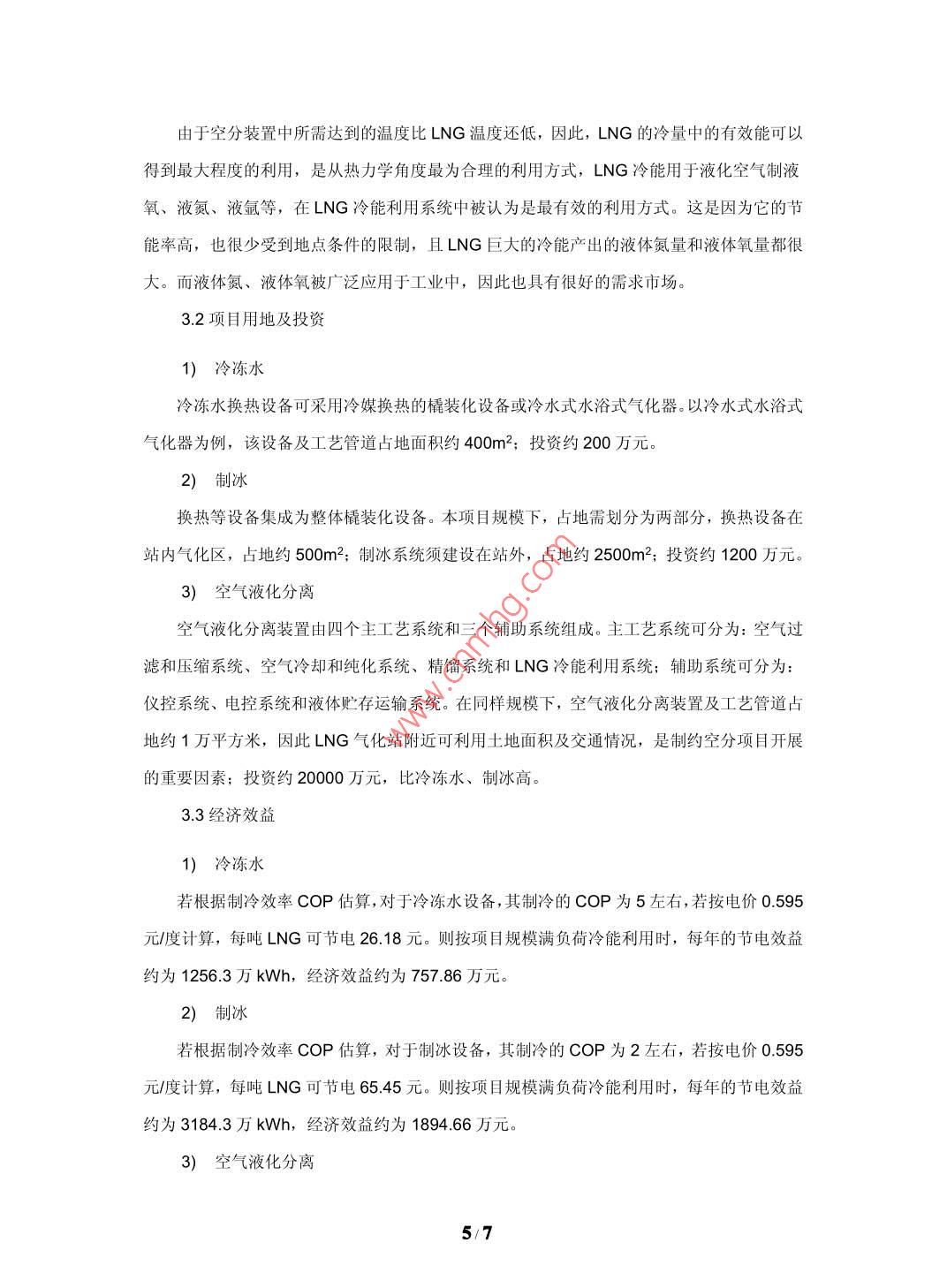 大型LNG氣化站氣化工藝及冷能利用的探討中海石油福建新能源有限公司福建廈門(mén) 361008中圖分類(lèi)號(hào): P744.4文獻(xiàn)標(biāo)識(shí)碼: A文章編號(hào):摘要:天然氣是一-種燃燒熱值高、潔凈、污染小的重要能源資源,深受各國(guó)的關(guān)注和歡迎。為了解決長(zhǎng)距離運(yùn)輸問(wèn)題,原產(chǎn)地的業(yè)主均要花費(fèi)大量的投資和能耗,把天然氣液化為L(zhǎng)NG再進(jìn)行運(yùn)輸,所以我們?cè)谝M(jìn)LNG時(shí),不僅引進(jìn)了清潔、高熱值的天然氣,同時(shí)也引進(jìn)了潛在于其中來(lái)之不易的冷能。通常LNG需要重新氣化成氣態(tài)的天然氣才能獲得利用,國(guó)內(nèi)LNG氣化站普遍采用空溫式氣化器對(duì)LNG進(jìn)行氣化,其好處是不用耗能可以完成LNG的氣化過(guò)程,但因空溫式氣化器占地面積大、投資金額大、生產(chǎn)過(guò)程霧氣彌漫等問(wèn)題而限制LNG氣化站的規(guī)模,同時(shí)LNG冷能隨著空溫式氣化器的熱交換而被舍棄在大氣中,造成能源的浪費(fèi)。本文介紹了大型LNG氣化站氣化工藝選擇的優(yōu)劣,闡述各種不同氣化工藝對(duì)氣化站建設(shè)以及冷能利用的影響,重點(diǎn)探討冷能在冷凍水、制冰及空氣液化分離等方面的利用的分析對(duì)比,得出冷能利用方案的優(yōu)劣性,有利于LNG氣化站項(xiàng)目合理研究選擇氣化工藝并充分進(jìn)行冷能的利用。關(guān)鍵詞: LNG氣化站氣化器冷能利用一、氣化工藝選擇以及對(duì)氣化站建設(shè)的影響氣化器熱源有自然熱源(空氣、海水)與人工熱源(熱水、蒸汽、電、冷凍水、冷媒)。利用自然熱源的氣化器體積較大,投資較大,運(yùn)行成本接近為零;利用人工熱源的氣化器體積較小,投資較小,運(yùn)行成本偏高。空溫式氣化器的連續(xù)工作時(shí)間一般為6~8小時(shí),如若超過(guò)8小時(shí),則出氣溫度會(huì)降低,長(zhǎng)時(shí)間使用,會(huì)導(dǎo)致氣化器結(jié)霜嚴(yán)重氣化效率降低,出口溫度達(dá)不到要求,需要另外備用一套切換使用,讓工作后氣化器進(jìn)行自然化霜。在夏季,熱交換充分,運(yùn)行情況良好;在冬季或雨季,由于環(huán)境溫度或濕度的影響,氣化器氣化效果大大降低,影響氣化量和出站氣溫度,同時(shí)氣化過(guò)程造成霧氣彌漫的情況,影響安全操作。1/7空溫式氣化器由于體積過(guò)大或因冬季熱交換管結(jié)冰不能運(yùn)行,只適用于氣化量較小,氣溫比較高的地方。例如氣化能力在50萬(wàn)方天以上的大型氣化站,若采用空溫式氣化器作為L(zhǎng)NG氣化設(shè)備,其氣化站用地將達(dá)到30畝以上。而如果采用人工熱源氣化器,氣化站占地面積可以縮小到15畝以?xún)?nèi)。在氣化站設(shè)計(jì)中,若采用空溫式氣化器為主、水浴式加熱器為輔,互為備用,這樣的設(shè)計(jì)有以下優(yōu)點(diǎn): 1、節(jié)省約四分之- -空溫式氣化器投資成本: 2、節(jié)省- - 半空溫式氣化器的占地面積; 3、 在外界溫度條件許可情況下,投用空溫式氣化器,運(yùn)行成本接近為零;在有免費(fèi)熱源的情況下,投用水浴式氣化器,運(yùn)行成本相對(duì)較低,而且氣化能力明顯增加,同時(shí)可以解決冬季或陰雨天氣情況下空溫式氣化器嚴(yán)重結(jié)霜以及周邊霧氣彌漫而影響安全生產(chǎn)的問(wèn)題。采用自然熱源的空溫式氣化器或海水水浴式氣化器,LNG冷能隨著氣化器的熱交換而被舍棄在大氣或海水中,造成能源的浪費(fèi)。采用人工熱源的氣化器,在用熱水、蒸汽和電等作為熱交換源時(shí),氣化站運(yùn)行成本較高;而在用冷凍水、冷媒進(jìn)行熱交換時(shí),很大程度能夠?qū)NG潛在的冷能利用起來(lái),而且該部分冷能的利用價(jià)值相當(dāng)可觀。因此冷能利用在大型LNG氣化站中的利用,值得進(jìn)一步研究和推廣實(shí)施。二、LNG冷能回收的意義和途徑LNG是由低污染天然氣經(jīng)過(guò)脫酸、脫水處理,通過(guò)低溫工藝?yán)鋬鲆夯傻牡蜏?一162"C)的液體混和物,其密度大大地增加(約600倍),有利于長(zhǎng)距離運(yùn)輸。每生產(chǎn)--噸LNG的動(dòng)力及公用設(shè)施耗電量約為850kW.h,而在LNG氣化站,一般又需將LNG通過(guò)氣化器氣化后使用,氣化時(shí)放出很大的冷量,其值大約為830kJlkg(包括液態(tài)天然氣的氣化潛熱和氣態(tài)天然氣從儲(chǔ)存溫度復(fù)溫到環(huán)境溫度的顯熱)。這種冷能從能源品位來(lái)看,具有較高的利用價(jià)值,而其通常在天然氣氣化器中隨空氣或海水被舍棄了,造成了能源的浪費(fèi)。為此,通過(guò)特定的工藝技術(shù)利用LNG冷能,可以達(dá)到節(jié)省能源、提高經(jīng)濟(jì)效益的目的。2.1節(jié)省能源、提高經(jīng)濟(jì)效益LNG的液化費(fèi)用約占LNG總成本的30%,這30%的費(fèi)用通過(guò)冷源的方式蓄積在LNG中。通常LNG需要重新汽化成氣態(tài)的天然氣才能獲得利用,而當(dāng)LNG在1atm(1atm=0.101 325 MPa)壓力下氣化時(shí),釋放出常溫氣體的冷量約220 kWh/T。在實(shí)際氣化操作中,根據(jù)氣化壓力的不同,LNG冷量有所不同 。2/7下圖為能級(jí)系數(shù)e和冷能Q坐標(biāo)上的LNG氣化曲線(曲線與橫軸之間的面積就相當(dāng)于氣化過(guò)程中所釋放的冷量) 。1. 620.1 MPa+ 1.0 MPai 1.2-一100MPa愛(ài)0.8煎0.40.0050100150200250冷能(kWh/t)據(jù)測(cè)算-一個(gè)10X 104Nm3/d規(guī)模的LNG氣化站,可利用冷功