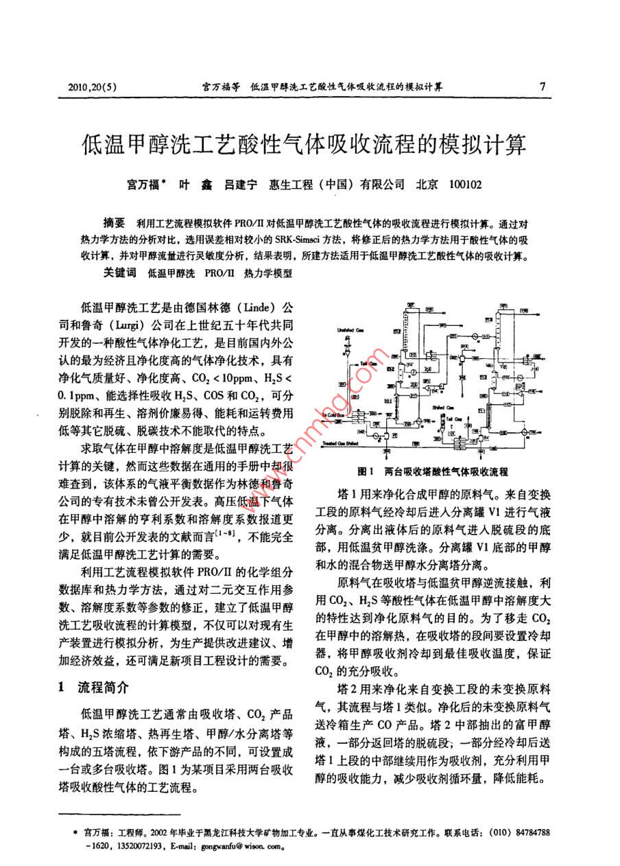 低溫甲醇洗工藝酸性氣體吸收流程的模擬計算