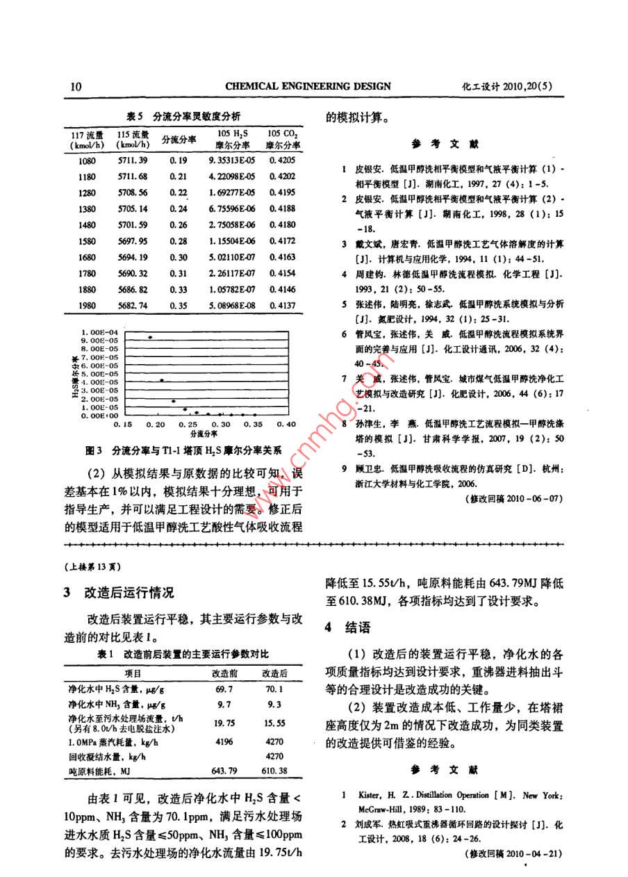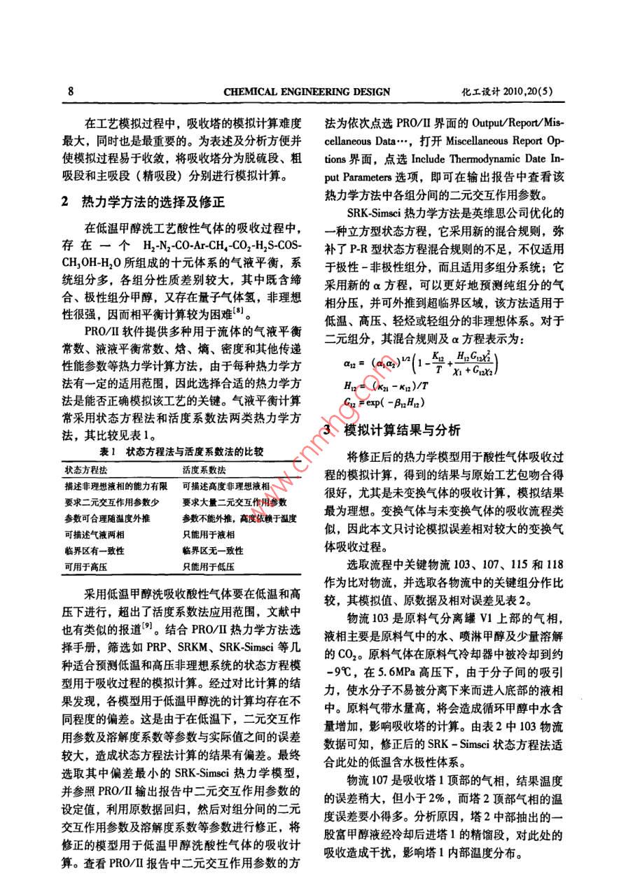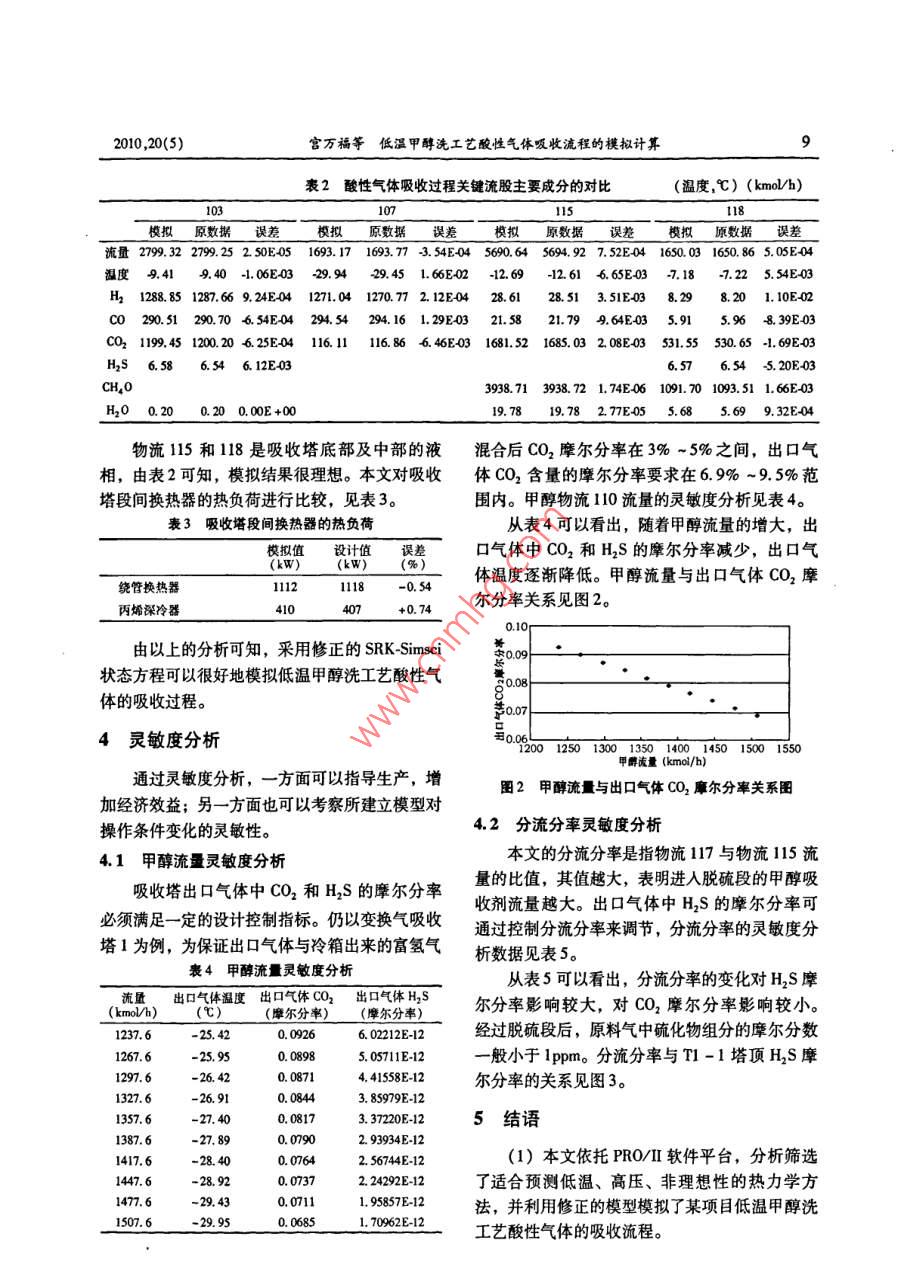 2010,20(5)宮萬福等低溫甲醇洗工藝酸性氣體吸收流程的模擬計算低溫甲醇洗工藝酸性氣體吸收流程的模擬計算宮萬福·葉鑫呂建寧惠生工程(中國)有限公司北京100102摘要利用工藝流程模擬軟件PRO/對低溫甲醇洗工藝酸性氣體的吸收流程進行模擬計算。通過對熱力學(xué)方法的分析對比,選用誤差相對較小的 SRK-Simsci方法,將修正后的熱力學(xué)方法用于酸性氣體的吸收計算,并對甲醇流量進行靈敏度分析,結(jié)果表明,所建方法適用于低溫甲醇洗工藝酸性氣體的吸收計算。關(guān)鍵詞低溫甲醇洗PRO熱力學(xué)模型低溫甲醇洗工藝是由德國林德( Linde)公司和魯奇( Lurgi)公司在上世紀(jì)五十年代共同開發(fā)的一種酸性氣體凈化工藝,是目前國內(nèi)外公認的最為經(jīng)濟且凈化度高的氣體凈化技術(shù),具有黑[畫凈化氣質(zhì)量好、凈化度高、CO2<10pm、H2S<0.lpm、能選擇性吸收H2S、COS和CO2,可分別脫除和再生、溶劑價廉易得、能耗和運轉(zhuǎn)費用低等其它脫硫、脫碳技術(shù)不能取代的特點。求取氣體在甲醇中溶解度是低溫甲醇洗工藝計算的關(guān)鍵,然而這些數(shù)據(jù)在通用的手冊中卻很圖1兩臺吸收塔酸性氣體吸收流程難查到,該體系的氣液平衡數(shù)據(jù)作為林德和魯奇公司的專有技術(shù)未曾公開發(fā)表。高壓低溫下氣體塔1用來凈化合成甲醇的原料氣。來自變換在甲醇中溶解的享利系數(shù)和溶解度系數(shù)報道更工段的原料氣經(jīng)冷卻后進入分離罐Ⅵ進行氣液少,就目前公開發(fā)表的文獻而言",不能完全分離。分離出液體后的原料氣進入脫硫段的底滿足低溫甲醇洗工藝計算的需要。部,用低溫貧甲醇洗滌。分離罐ⅥI底部的甲醇利用工藝流程模擬軟件PRO的化學(xué)組分和水的混合物送甲醇水分離塔分離。數(shù)據(jù)庫和熱力學(xué)方法,通過對二元交互作用參原料氣在吸收塔與低溫貧甲醇逆流接觸,利數(shù)、溶解度系數(shù)等參數(shù)的修正,建立了低溫甲醇用CO2、H2S等酸性氣體在低溫甲醇中溶解度大洗工藝吸收流程的計算模型,不僅可以對現(xiàn)有生的特性達到凈化原料氣的目的。為了移走CO2產(chǎn)裝置進行模擬分析,為生產(chǎn)提供改進建議、增在甲醇中的溶解熱,在吸收塔的段間要設(shè)置冷卻加經(jīng)濟效益,還可滿足新項目工程設(shè)計的需要。器,將甲醇吸收劑冷卻到最佳吸收溫度,保證CO2的充分吸收。1流程簡介塔2用來凈化來自變換工段的未變換原料低溫甲醇洗工藝通常由吸收塔、CO2產(chǎn)品氣,其流程與塔1類似。凈化后的未變換原料氣塔、H2S濃縮塔、熱再生塔、甲醇/水分離塔箏送冷箱生產(chǎn)CO產(chǎn)品。塔2中部抽出的富甲醇構(gòu)成的五塔流程,依下游產(chǎn)品的不同,可設(shè)置成液,部分返回塔的脫硫段,一部分經(jīng)冷卻后送臺或多臺吸收塔。圖1為某項目采用兩臺吸收塔1上段的中部繼續(xù)用作為吸收劑,充分利用甲塔吸收酸性氣體的工藝流程。醇的吸收能力,減少吸收劑循環(huán)量,降低能耗。·宮萬福:工程師。2002年畢業(yè)于黑龍江科技大學(xué)礦物加工專業(yè)。一直從事煤化工技術(shù)研究工作。聯(lián)系電話:(010)8478471620,13520072193,E-mail:gongwanfu@wison.comCHEMICAL ENGINEERING DESIGN化工設(shè)計2010,20(5)在工藝模擬過程中,吸收塔的模擬計算難度法為依次點選PRo界面的 Output/Report/Mis最大,同時也是最重要的。為表述及分析方便并 cellaneous Dal…,打開 Miscellaneous Report0p使模擬過程易于收斂,將吸收塔分為脫硫段、粗ons界面,點選 Include Thermodynamic Date In吸段和主吸段(精吸段)分別進行模擬計算。 put Parameters選項,即可在輸出報告中查看該2熱力學(xué)方法的選擇及修正熱力學(xué)方法中各組分間的二元交互作用參數(shù)。SRK-Simsci熱力學(xué)方法是英維思公司優(yōu)化的在低溫甲醇洗工藝酸性氣體的吸收過程中,一種立方型狀態(tài)方程,它采用新的混合規(guī)則,彌存在一個H2-N2 Co-Ar-CH4-CO2-H2SC0-補了PR型狀態(tài)方程混合規(guī)則的不足,不僅適用CH2OHH2O所組成的十元體系的氣液平衡,系于極性-非極性組分,而且適用多組分系統(tǒng);它統(tǒng)組分多,各組分性質(zhì)差別較大,其中既含締采用新的a方程,可以更好地預(yù)測純組分的氣合、極性組分甲醇,又存在量子氣體氫,非理想相分壓,并可外推到超臨界區(qū)域,該方法適用于性很強,因而相平衡計算較為困難。低溫、高壓、輕烴或輕組分的非理想體系。對于PRO軟件提供多種用于流體的氣液平衡常數(shù)、液液平衡常數(shù)、焓、熵、密度和其他傳遞二元組分,其混合規(guī)則及a方程表示為:性能參數(shù)等熱力學(xué)計算方法,由于每種熱力學(xué)方a°(a)(1-號+法有一定的適用范圍,因此選擇合適的熱力學(xué)方2)T法是能否正確模擬該工藝的關(guān)鍵。氣液平衡計算Gu =exp(-BuHn)常采用狀態(tài)方程法和活度系數(shù)法兩類熱力學(xué)方法,其比較見表1。3模擬計算結(jié)果與分析表1狀態(tài)方程法與活度系數(shù)法的比較將修正后的熱力學(xué)模型用于酸性氣體吸收過狀態(tài)方程法活度系數(shù)法描述非理想液相的能力有限可描述高度非理想液相程的模擬計算,得到的結(jié)果與原始工藝包吻合得很好,尤其是未變換氣體的吸收計算,模擬結(jié)果要求二元交互作用參數(shù)少要求大量二元交互作用參數(shù)參數(shù)可合理隨溫度