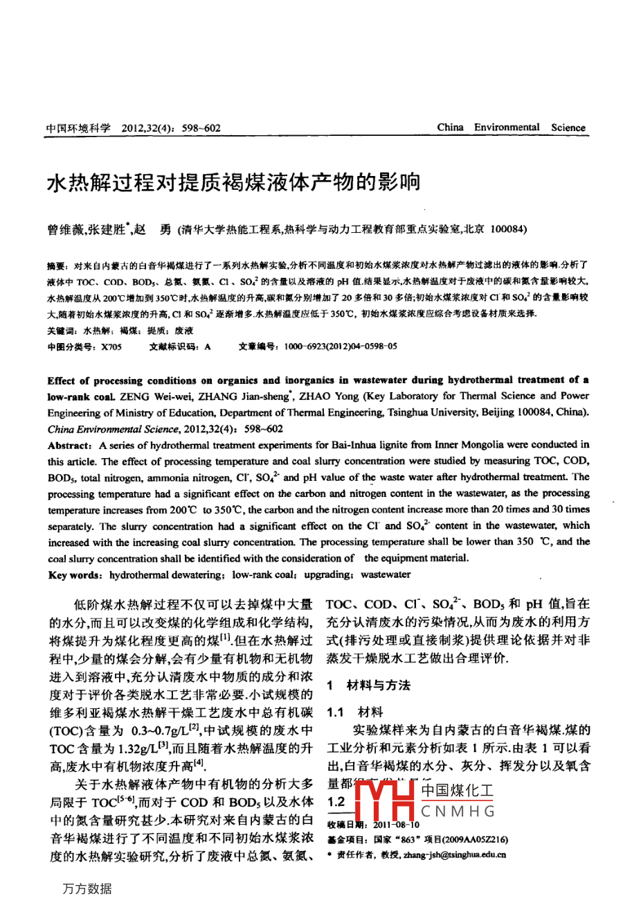 中國環(huán)境科學2012.32(4):598602China Environmeental Science水熱解過程對提質(zhì)褐煤液體產(chǎn)物的影響曾維薇,張建勝;趙勇(清華大學熱能工程系熱科學與動力工程教育部重點實驗室北京10008搞要:對來自內(nèi)蒙古的白音華褐煤進行了一系列水熱解實驗分析不同溫度和初始水煤漿濃度對水熱解產(chǎn)物過濾出的液體的影響分析了液體中TOC、cOD、BOD3、總氮、氨氮、C1、SO2的含量以及溶液的pH值結(jié)果顯示水熱解溫度對于廢液中的碳和氮含量彩響較大水熱解溫度從200℃增加到350℃時水熱解溫度的升高碳和氮分別增加了20多倍和30多倍;初始水煤漿濃度對C和SO42的含量影響較大隨著初始水煤漿濃度的升高C1和SO42逐漸增多水熱解溫度應(yīng)低于350℃,初始水煤漿濃度應(yīng)綜合考慮設(shè)備材質(zhì)來選擇關(guān)鍵詞:水熱解;褐煤;提質(zhì);廢液中田分類號:X705文獻標識碼:A文章編號:10006923(2012)04-05980Effect of processing conditions on organics and inorganics in wastewater during hydrothermal treatment of alow-rank coal. ZENG Wei-wei, ZHANG Jian-sheng, ZHAO Yong(Key Laboratory for Thermal Science and PowerEngineering of Ministry of Education, Department of Thermal Engineering, Tsinghua University, Beijing 100084, China).China Environmental Science, 2012, 32(4): 598-602Abstract: A series of hydrothermal treatment experiments for Bai-lnhua lignite from inner Mongolia were conducted inthis article. The effect of processing temperature and coal slurry concentration were studied by measuring TOC, COD,BOD, total nitrogen, ammonia nitrogen, Cl, So and ph value of the waste water after hydrothermal treatment. Theprocessing temperature had a significant effect on the carbon and nitrogen content in the wastewater, as the processingtemperature increases from 200C to 350C, the carbon and the nitrogen content increase more than 20 times and 30 timesseparately. The slurry concentration had a significant effect on the Cr and So. content in the wastewater, whichincreased with the increasing coal slurry concentration. The processing temperature shall be lower than 350 C, and thecoal slurry concentration shall be identified with the consideration of the equipment materialKey words: hydrothermal dewatering: low-rank coal; upgrading: wastewater低階煤水熱解過程不僅可以去掉煤中大量TOC、COD、CI、SO42、BOD和pH值旨在的水分而且可以改變煤的化學組成和化學結(jié)構(gòu),充分認清廢水的污染情況從而為廢水的利用方將煤提升為煤化程度更高的煤但在水熱解過式(排污處理或直接制漿)提供理論依據(jù)并對非程中,少量的煤會分解會有少量有機物和無機物蒸發(fā)干燥脫水工藝做出合理評價進入到溶液中,充分認清廢水中物質(zhì)的成分和濃度對于評價各類脫水工藝非常必要.小試規(guī)模的1材料與方法維多利亞褐煤水熱解干燥工藝廢水中總有機碳1.1材料(TOC)含量為0307g,中試規(guī)模的廢水中實驗煤樣來為自內(nèi)蒙古的白音華褐煤煤的TOC含量為1.32g,而且隨著水熱解溫度的升工業(yè)分析和元素分析如表1所示由表1可以看高廢水中有機物濃度升高出,白音華褐煤的水分、灰分、揮發(fā)分以及氧含關(guān)于水熱解液體產(chǎn)物中有機物的分析大多量都中國煤化工局限于TOC6,而對于COD和BOD5以及水體12中的氮含量研究甚少本研究對來自內(nèi)蒙古的白CNMHG收稿日音華褐煤進行了不同溫度和不同初始水煤漿濃蕃金項目:國家“863″項目(209A05216度的水熱解實驗研究分析了廢液中總氮、氨氮、·責任作者,教投,hanish@tsinghua.edu.cn4期曾維嶶等:水熱解過程對提質(zhì)褐煤液體產(chǎn)物的影響表1原煤工業(yè)分析和發(fā)熱量分析Table 1 Raw coal proximate analysis and ultimate analysisM(wt%, dbA(wt%, d b)V(wt%, d, b)FC(wt%, d b)HHⅤ( MJ/kg, db)工業(yè)分析o(wt%, db)元素分析H(wt%, d b)N(wt%, d b) S(wt%, d b)57.74注:M為水分;A為灰分;V為揮發(fā)分;FC為固定碳江HⅣ為高位熱值;db為干基實驗系統(tǒng)如圖1所示包括3L的不銹鋼反應(yīng)析其TOC、COD、BOD5、總氮、氨氮、CI、釜(TFCF3-20)、控制器和N2氣瓶反應(yīng)釜攪拌器SO2的含量和pH值的冷卻水來自循環(huán)冷卻水系統(tǒng)水熱解實驗在3L實驗工況如表2所示當溫度高于150℃時,的不銹鋼反應(yīng)釜中進行反應(yīng)釜最高壓力為煤中親水的含氧官能團開始發(fā)生分解,所以褐20MPa最高溫度450℃反應(yīng)釜裝有一支熱電偶,煤脫水提質(zhì)過程所選溫度一般為200400c為了保證攪拌器正常運行不至于過熱在整個實本實驗所選溫度為200,250,280,300,320,350℃,驗過程中循環(huán)水箱連續(xù)工作直至反應(yīng)釜冷卻至壓力均略高于對應(yīng)溫度下的飽和蒸汽壓在進行室溫冷卻水系統(tǒng)只在反應(yīng)結(jié)束后反應(yīng)釜冷卻階不同溫度實驗時加入的水煤漿濃度為25%(煤水段啟動比1:3),干煤量200g由于氣化所用的水煤漿濃度大約為50%70%如果選用煤水比1:3進行脫水處理,那么煤漿在經(jīng)過脫水處理之后還需要除掉HO出Ho進部分水分才能加入到氣化爐中氣化所以本實驗考慮增大煤漿濃度,測試不同初始水煤漿濃度對廢液的影響因此選用了初始水煤漿濃度為1:11:2、1:3共3個工況來研究初始水煤漿濃度與液體產(chǎn)物的關(guān)系表2實驗工況壓力、鬣下出料Table 2 Experimental conditions反應(yīng)董溫度(℃)壓力MPa)裝料量(干煤+水)氣氛圖1實驗系統(tǒng)示意20000g+60mLFig 1 Schematic drawing of the experimental system200g+600mLn2200g+600mLN2為使煤樣粒徑分布均勻,首先將原煤研磨至200g+600mLN2粒徑小于0