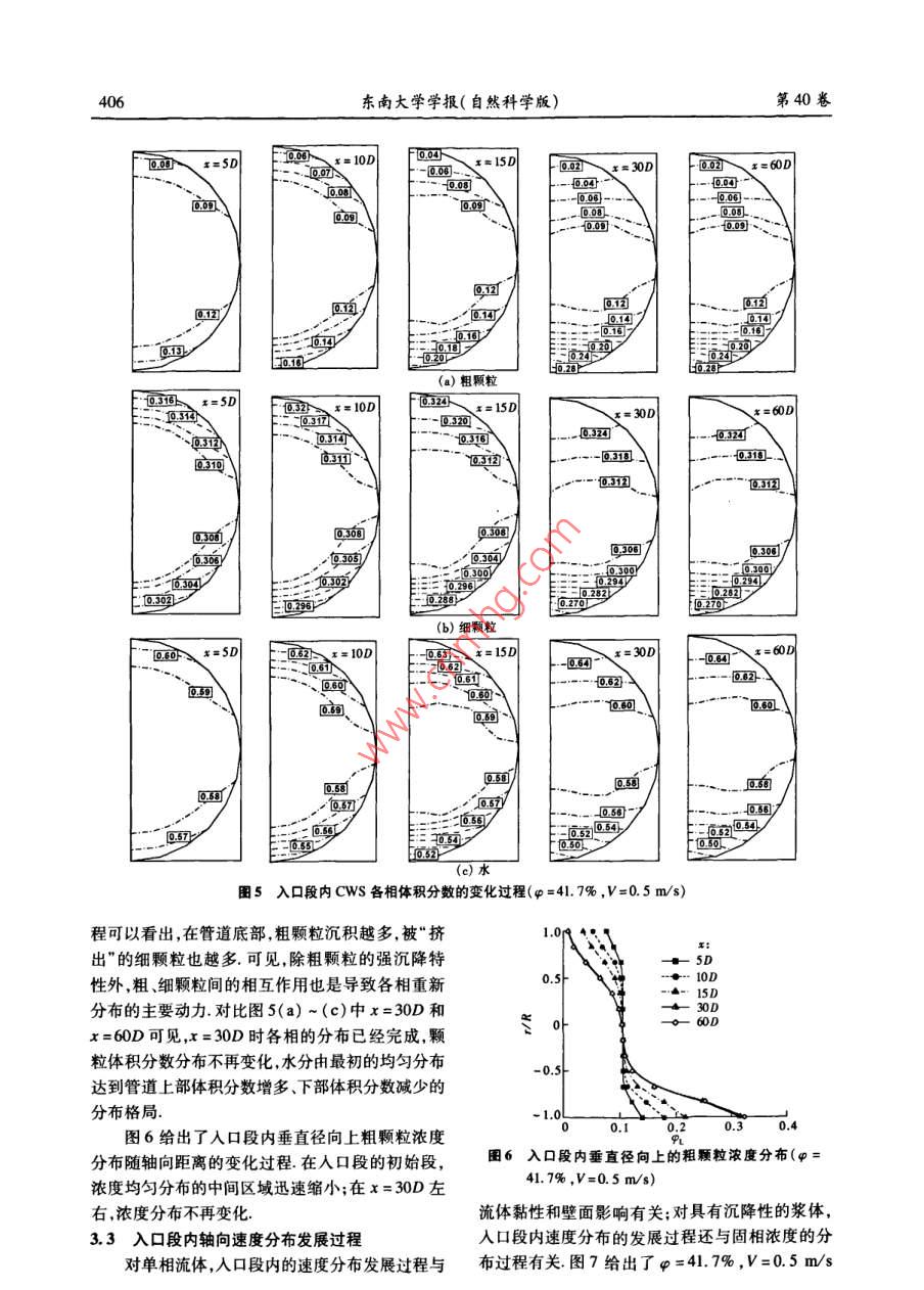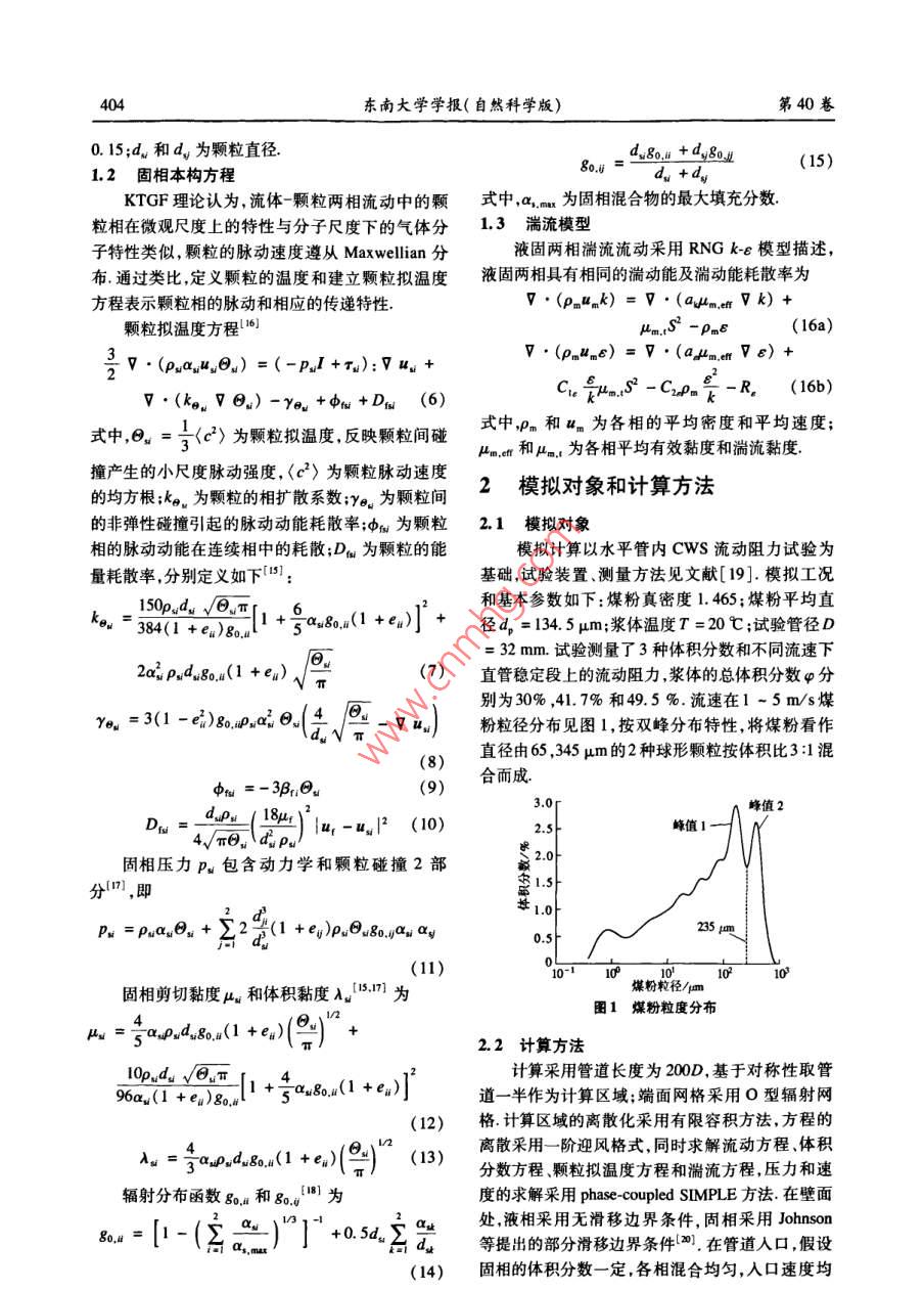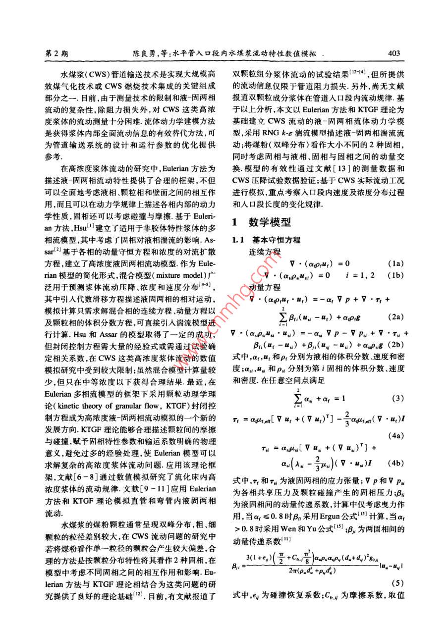 第40卷第2期東南大學(xué)學(xué)報(自然科學(xué)版)Vol 40 No. 22010年3月JOURNAL OF SOUTHEAST UNIVERSITY( Natural Science Edition)Mar.2010doi;10.3969/ 1. Issn.l001-0505.2010.02.036水平管入口段內(nèi)水煤漿流動特性數(shù)值模擬陳良勇12段鈺鋒!劉猛!蒲文灝!趙長遂(東南大學(xué)能源與環(huán)境學(xué)院南京210096)(2南京工業(yè)大學(xué)能源學(xué)院南京2100摘要:以 Eulerian多相流方法為基礎(chǔ)建立了水煤漿流動的液圊兩相流體動力學(xué)模型,并對水平管入口段內(nèi)水煤漿流動進(jìn)行了模擬.模型采用顆粒動理學(xué)理論求解固相本枃方程,釆用RNGk-ε湍流混合模型描述顆粒間具有強烈作用的兩相湍流流動.針對水煤漿中煤粉顆粒的雙峰分布特性,將煤粉看作2種大小不同的固相,同時考慮固相與液相、固相與固相之間的動量交換模型有效性通過 Kaushal等試驗結(jié)果和水煤漿的壓降試驗驗證,通過模擬考察了入口段內(nèi)速度及濃度分布過程和入口段長度的變化規(guī)律,結(jié)果表明:重力和顆粒間的相互作用對濃度和速度分布過程具有重要影響;固相體積分?jǐn)?shù)在30%-49.5%范圍內(nèi),入口段長度隨濃度的增加而減小,隨平均流速(0.2~5.0m/s)先增加后減小關(guān)鍵詞:水煤漿;入口段;多相流模型;顆粒動理學(xué)中圖分類號:O373文獻(xiàn)標(biāo)志碼:A文章編號:1001-0505(2010)02040207Numerical study of developing coal-water slurry flown entrance region of horizontal pipeChen Liangyong", 2 Duan Yufeng Liu Meng Pu Wenhao Zhao Changsui(School of Energ(College of Energy, Nanjing University of Technology, Nanjing 210009, China)Abstract: An Eulerian multi- fluid flow model is developed to carry out a numerical study on coalwater slurry flow in the entrance region of horizontal pipe. The kinetic theory of granular flow isused to calculate constitutive equations of the solid-phase components and the rng - turbulentmodel is incorporated into the governing equation to model turbulent two phase flow with strong par-ticle-particle interactions. In this model, the coal particles with bimodal distribution are consideredtwo solid-phase components and the moment exchange between solid and liquid phase as well as thatbetween solid and solid phase are taken into account. The model was validated with Kaushal experi-mental data from available literature and the pressure gradient data by author's experiments. The nu-merical investigations focus mainly on the developing processes of volume fraction and velocity dis-tributions in the entrance region as well as the entry length. The results show that the gravitationalforce and the strong particle-particle interaction have significant effects on concentration and velocitydistribution profile. The entry length decreases as solid concentration increases from 30% to 49.5%and for the same slurry, the entry length firstly increases and then decreases when the inlet velocityincreases from 0. 2 to 5.0 msKey words: coal water slurry: entrance region; multi-fluid model; kinetic theory of granular flow收稿日期:2000930.作者簡介:陳良勇(1977-)男博士生:段鈺鋒(聯(lián)系人)男博士教授博士生導(dǎo)師, yidun@seu.cd.cm基金項目:國家重點基礎(chǔ)研究發(fā)展計劃(973計劃)資助項日(2010CB227001)引文格式:陳良勇段鈺鋒劉猛,等水平管人口段內(nèi)水煤漿流動特性數(shù)值模擬[J]東南大學(xué)學(xué)報:自然科學(xué)版,2010,40(2):402-408[doi:0.3969/j,isn.1001-0505第2期良勇,等:水平管入口段內(nèi)水煤漿流動特性數(shù)值模擬水煤漿(CwS)管道輸送技術(shù)是實現(xiàn)大規(guī)模高雙顆粒組分漿體流動的試驗結(jié)果1,但所提供效煤氣化技術(shù)或CwS燃燒技術(shù)集成的關(guān)鍵組成的流動信息僅限于管道阻力損失,另外,尚無文獻(xiàn)部分之一.目前,由于測量技術(shù)的限制和液-固兩相報道雙顆粒成分漿體在管道入口段內(nèi)流動規(guī)律基流動的復(fù)雜性,除阻力損失外,對CwS這類高濃于以上分析,本文以 Eulerian方法和KTGF理論為度漿體的流動測量十分困難流體動力學(xué)建模方法基礎(chǔ)建立cws流動的液-固兩相流體動力學(xué)模是獲得漿體內(nèi)部全面流動信息的有效替代方法,可型,采用RNGkε湍流模型描述液-固兩相湍流流為管道輸送系統(tǒng)的設(shè)計和運行參數(shù)的優(yōu)化提供動;將煤粉(雙峰分布)看作大小不同的2種固相參考同時考慮固相與液相、固相與固相之間的動量交在高濃度漿體流動的研究中, Eulerian方法為換模型的有效性通過文獻(xiàn)[13]的測量數(shù)據(jù)和描述液-固兩相流動特性提供了合理的框架,不但Cws壓降試驗數(shù)據(jù)驗證;基于CwS實際流動工況可以全面地考慮液相顆粒相和壁面之間的相互作進(jìn)行模擬,重點考察入口段內(nèi)速度及濃度分布過程用,而且可以在動力學(xué)規(guī)律上描述各相內(nèi)部的動力和入口段長度的變化規(guī)律學(xué)性質(zhì),固相還可以考慮碰撞與摩擦,基于 Euleri-an方法Hsu"建立了適用于非膠體特性漿體的多1數(shù)學(xué)模型相流模型,其中考慮了固相對液相湍流的影響As1.1基本守恒方程sar(2基于各相的動量守恒方程和濃度的對流擴散連續(xù)方程方程,建立了高濃度液固兩相流動模型作為Eulev·(apr)=0rian模型的簡化形式,混合模型( mixture model)廣1,2(1b)泛用于預(yù)測漿體流動壓降濃度和速度分布3動量方程其中引入代數(shù)滑移方程描述液固兩相的相對運動·(apHr·)=-arVp+V模擬計算只需求解混合相的連續(xù)方程、動量方程以及顆粒相的體積分?jǐn)?shù)方程,可直接引入湍流模