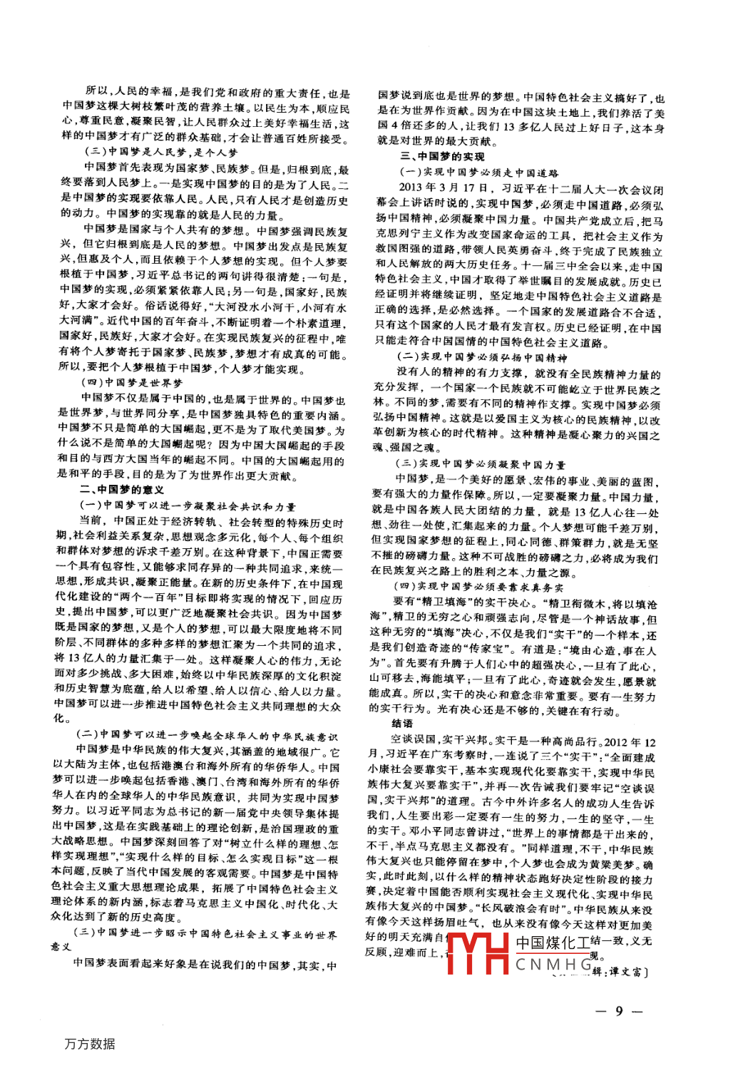 2013年第12期理論觀察No.12,2013(總第90期)Theoretic ObservationSerial No. 90試論中國夢全太碧中共德江縣委黨校貴州德江565200[摘要]實現(xiàn)中華民族偉大復(fù)興,就是中華民族近代以來最偉大的夢想,其內(nèi)涵就是要實現(xiàn)國家富強、民族振興、人民幸福,中國夢就是人民的夢、民族的夢。[關(guān)鍵詞]中國夢;民族復(fù)興;中國[中圖分類號]D616[文獻標識碼]A[文章編號]109-2234(201312-008-02有所思即有所夢,夢反映的是一種追求體現(xiàn)的是一種義富國、強國道路。強國夢不僅表現(xiàn)在我們的經(jīng)濟、軍事等抱負。盡管在歷史上我們的先人沒有提出過中國夢這個概等硬實力上,也表現(xiàn)在文化、社會發(fā)展的軟實力上。改革開念,但對中國夢的追求其實并沒有中斷過,中國夢一直是照放30多年圓了中國人心中的奧運夢、世博夢、飛天夢、探耀我們民族前進的燈塔。月夢、深潛夢、航母夢、諾貝爾獎夢……我們的綜合國力和中國夢是中華民族5000年延綿不斷的夢。中華民族是國際影響力在增強個有著5000年文明史的偉大民族。早在秦漢時期,我國中國夢是復(fù)興夢就是要實現(xiàn)民族復(fù)興。實現(xiàn)中華民族就在這個地球上率先進入了盛世。在整個5000年歷史中,偉大復(fù)興不是簡單地重尋昔日的榮光,中國夢不是重塑漢我國曾以世界第一富強大國“獨領(lǐng)風騷”達1500年之久。曾代雄風、大唐偉業(yè),再造康乾盛世,也不是要恢復(fù)古代中國、“貞觀之治”、“康乾盛世”等盛世。遺憾的鼎盛時期的疆域版圖。而是要使我們國家經(jīng)濟發(fā)晨、政治昌是,到了清朝末期,由于清政府的腐敗無能,導(dǎo)致了1840年明、文化繁榮、社會和諧、生態(tài)文明,到本世紀中葉成為富強的中英第一次鴉片戰(zhàn)爭。鴉片戰(zhàn)爭,不但打開了中國的國民主文明和諧的社會主義現(xiàn)代化國家,進而再向前發(fā)展。實門,也打碎了“天朝之夢”。從此,中國開始淪為半殖民地半現(xiàn)中華民族偉大復(fù)興,是要使中華民族躋身于先進民族行封建社會飽受了百年屈辱歷史。但在1840年至1949年新列,為人類作出貢獻的份額盡量擴大。因此,中國夢,不是復(fù)中國成立的109年間,埋藏在無數(shù)矢志于民族復(fù)興的仁人興封建帝國的舊夢,也不是食洋不化的他國夢,而是一個轉(zhuǎn)志士心中的中國夢并未泯滅,中華兒女對中國夢的探尋從型發(fā)展的現(xiàn)代夢沒有停止過?!笆赂锩宦暸陧?給我們送來了馬克思列(二)中國夢是幸福夢寧主義?!罢嬲阎袊嗣窈椭腥A民族帶上實現(xiàn)中國夢“人中國夢不僅表現(xiàn)為國家富強、民族復(fù)興,更表現(xiàn)為人民間正道”的是中國共產(chǎn)黨。幸福。人民幸福是中國夢的目的。老百姓的幸福夢是什么?、中國夢的內(nèi)灑習(xí)近平總書記說:“我們的人民熱愛生活,期盼有更好什么是中國夢呢?2012年11月29日,當選總書記不育、更穩(wěn)定的工作、更滿意的收入、更可靠的社會保障、更高久的習(xí)近平在國家博物館參觀大型歷史展覽《復(fù)興之路》水平的醫(yī)療衛(wèi)生服務(wù)、更舒適的居住條件、更優(yōu)美的環(huán)境,說:大家都在討論中國夢我認為,實現(xiàn)中華民族偉大復(fù)興,期盼孩子們能成長得更好、工作得更好、生活得更好?!边@些就是中華民族近代以來最偉大的夢想。2013年3月17日話說得多么實在、具體、親切。習(xí)近平在當選國家主席后發(fā)表重要講話,詮釋了中國夢的其實,普通百姓想要的幸福夢其實并不復(fù)雜,就是希望深刻內(nèi)涵,提出了實現(xiàn)中國夢的科學(xué)路徑。其內(nèi)涵就是要實不再看到貪官污吏的存在,不再看到官僚主義、形式主義,現(xiàn)國家富強、民族振興、人民幸福,既深深體現(xiàn)了今天中國希望權(quán)力能夠關(guān)進制度的籠子,每一個官員都能為官清廉人的理想,也深深反映了我們先人們不懈追求進步的光榮為老百姓謀福利就是希望不再看到特權(quán)。而是每個人都能憑借勤奮努力和出眾的才華取勝,就是希望不再看到貧窮(一)中國夢是強國夢,是復(fù)興夢落后,希望上學(xué)能有學(xué)校,而且學(xué)費還不高;工作能找到工改革開放30多年,中國發(fā)生了翻天覆地的變化。我國作,而且收入還不少;生了病了能去醫(yī)院看病,而且醫(yī)藥費的人均國民生產(chǎn)總值從1978年的不到250美元,提高到還不貴;老了社保能養(yǎng)老,而且條件還很好;就是老百姓能2012年的6100美元,中國成為世界第二的經(jīng)濟體,重塑了吃得放心,能喝上干凈的水,呼吸上清潔的空氣,對普通中全球經(jīng)濟版圖。中國走出了一條屬于“中國特色”的社會主國百姓來說,中國夢就是這么簡單。[收稿日期]2013-12-11H中國煤化工[作者簡介]全太碧(1968-),男(土家族),貴州德江人。講師、辦公室主任,CNMHG所以人民的幸福是我們黨和政府的重大責任,也是國夢說到底也是世界的夢想。中國特色社會主義搞好了,也中國夢這棵大樹枝繁葉茂的營養(yǎng)土壤。以民生為本,順應(yīng)民是在為世界作貢獻。因為在中國這塊土地上,我們養(yǎng)活了美心,尊重民意,凝聚民智,讓人民群眾過上美好幸福生活,這國4倍還多的人,讓我們13多億人民過上好日子,這本身樣的中國夢才有廣泛的群眾基礎(chǔ),才會讓普通百姓所接受。就是對世界的最大貢獻。(三)中國夢是人民夢,是個人