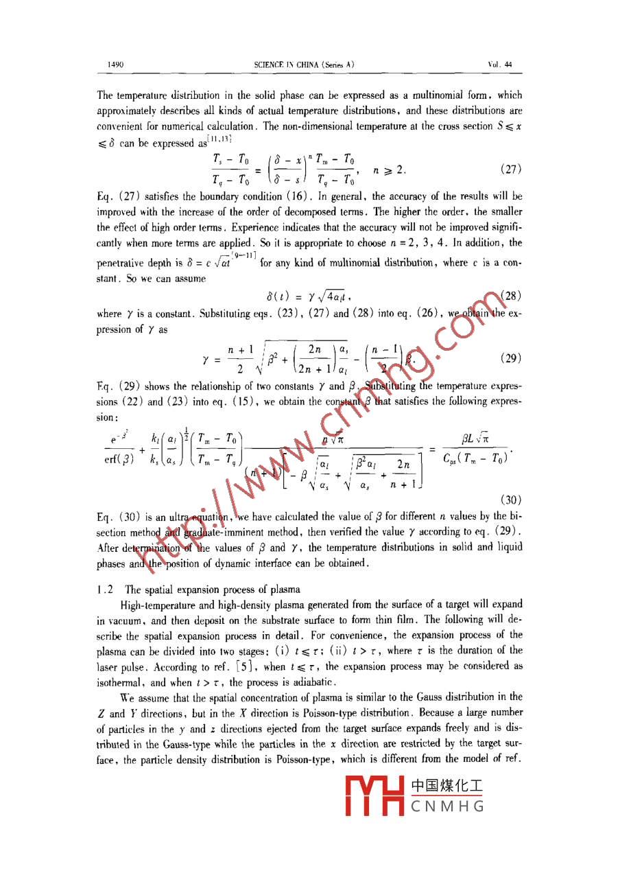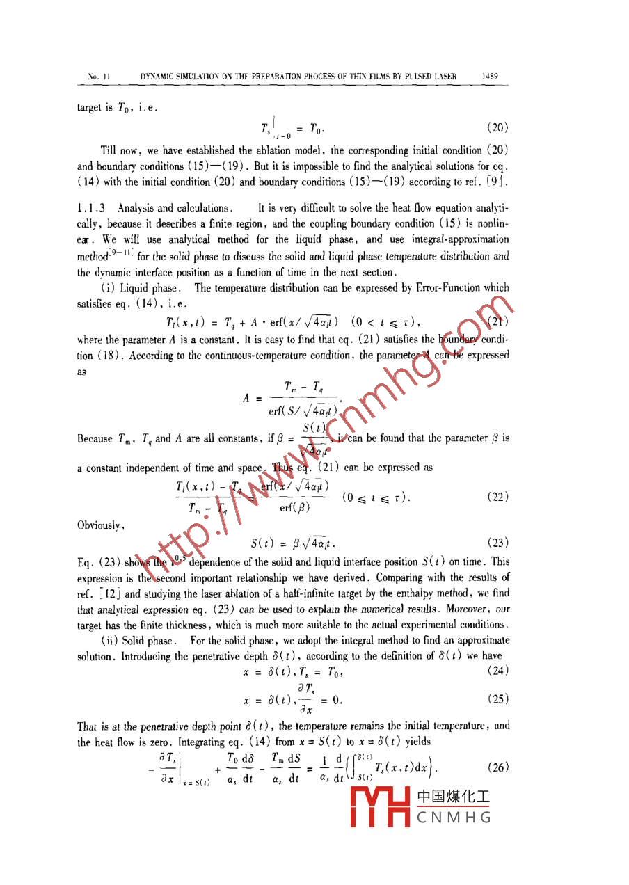 Vvol. 44 Sio. 11 .SCIENCE IN CHINA (Series A)Novenber 2001Dynamic simulation on the preparation process of thin filmsby pulsed laserZHANG Duanming (張端明), LI Zhihua (李智華)', YU Boming (郁伯銘)',HUANG Mingtao (黃明濤)', GUANLi(關(guān)麗)',ZHONG Zhicheng (鐘志成)2 & L Guodong (李國棟)=1. Depatment of Physics, Huazhong University of Science and Technology, Wuhan 430074. China;2. Departnent of Physics. Xiangfan Universily. Xiangfan 410000 ChinaCorespondence should be adresed to Zhang Duanming ( email: zhangd @ public. wuhan. cngb. com)Received March 20, 2001AbstractAn ablation model of targets iradiated by pulsed laser is established. By using the simpleenergy balance conditins, the relationship between ablation surface location and time is derived. Byan adiabatic approximation, the continuous-temperature condition, energy conservation and all bound-ary conditions can be established. By applying the analytical method and integral-. approximationmethod, the solid and liquid phase temperature distributions are obtained and found to be a function oftime and location. The interface of solid and liquid phase is also derived. The results are comparedwith the other published data. In additin, the dynamics process of pulsed laser deposition of KTN(Kta. sNb, xsO,) thin fim is simulated in detail by using fluid dynamics theory. By combining the ex-pression of the target ablation ratio and the dynamic equation and by using the experimental data, theeffects of laser action parameters on the thickness distrbution of thin film and on the thin film compo-nent characterstics are discussed. The results are in good agreement with the experimental data.Keywords: ablation ratio, KTN thin flm, plasma. pulsed laser deposition (PLD).In recent years,with the development of the high-density pulsed laser technique, the PulsedLaser Deposition (PLD) technigue shows its special advantages,2. ,such as high-deposition ve-locity, low substrate temperature and similarity between target and thin flm components. Although many kinds of functional thin flms'. . have been prepared and great progresses in experi-menls have been made, lttle attention was paid to the understanding of the mechanism of thePLD. Singh and Narayan'SI proposed a theoretical model for plasma expansion, but the systemati-cal study in this area was still very limited. lIt is very important 10 prepare the high-quality thinfilm and study the thin flm physics for better understanding the mechanism and dynamie process-es of the interactions between a pulsed laser and a target. In this paper, the PLD mechanism isstudied systematically ,including the ablation process , expansion process and deposition process .First, according to the energy balance conditions, the ablation surface Jocation as a function oftime is derived; then by using the appropriate boundary conditions , we calculate the temperaturedistribution and the interface location of solid and liquid phases . Secondly, based on the modifiedS-N model and on the hydrodynamie theory, the motion equation of plasma generated by pulsedlaser is derived. By combining the ablation process with the spatial-expansion process of plasma,the process equations are obtained which can be used to describe the process of the quasi- molecu-lar deposition for KTN thin films .中國煤化工MYHCNMHG1486SCIENCE IN CHINA (Series A)Vol. 441 Theoretical modelThe process of PLD is generally casified into three separate regimes: (i) the high densityand high lemperature existing on the larget surface iluminated by pulsed laser; (ii) the plasmaexpanding into the vacuum space; (ii) then the plasma depositing on the substrate. We now de-scribe the three processes in the fllowing.1.1 Pulsed-laser ablation modelWhen a high-powered laser beam iradiates on a target surface, the target will absorb thelaser energy and sputter out high-lemperalure and high pressure plasma, and meanwhile, a pantof the target will be liquated. A sketch of the laser- solid interaction is shown infig. I.Fig.1 shows that during the incidence of alaser pulse, three separate purts can be distin-Laser beams guished. (a) High-temperature and high-pressureplasma cloud which can be divided into two re-gions: corona region and conduction region6 ( seec) (b) (a)regions A and B in fig. 1). Ninety-eight percentFig. 1. A sketch of the laser-solid interacin.of laser energy is deposited in corona by the in-verse bremsstrahlung absorption process, and thena part of the absorbed energy will transfer into the ablation surface because of existence of temper-ature gradient. (b) Liquid phase region generated by the liquated target. (c) Solid phase regionabsorbing the conducting energy。In addition, the heating and meling processes of pulsed laserirrudiation on material constitute a three-dimensional heat flow problem. But in the mlliecondprocess, the short thermal difusion distance and the large dimension of the laser beam comparedto the melt depth limit the thermal gradient parallel to the interface to several orders of magnitudeless than the gradient perpendicular to0 the interface. Thus, the problem can be simplified into aone-dimensional heat flow problem . The solid and liquid phase temperatures , ablation surface po-sition and the dynamic interface are discussed in detail in the next seetion.1.1.1 Ablation ratio and the ablaion process of pulsed laser.The ablation ratio for a tar-get for pulsed laser can be expressed asN = pd/(tm),(1)where N is the evaporating ratio of particles for a unit dimension,τ is the duration of time of laserpulse, P represents the target density, d is the depth of ablated target, and m is the ablatedAssuming that the power densily of ineident laser pulse is lo, the absorbing coficient is b,the power density 1(x) at the location x satisfiesd/(x)/dx =- 61(x),(2)with the boundary condition: x=0,1(0)= lo, then1(x) = lge~,(3)When a beam of laser transmits to the location x,,中國煤化工reasesto 1,. thelaser cannot evaporale p