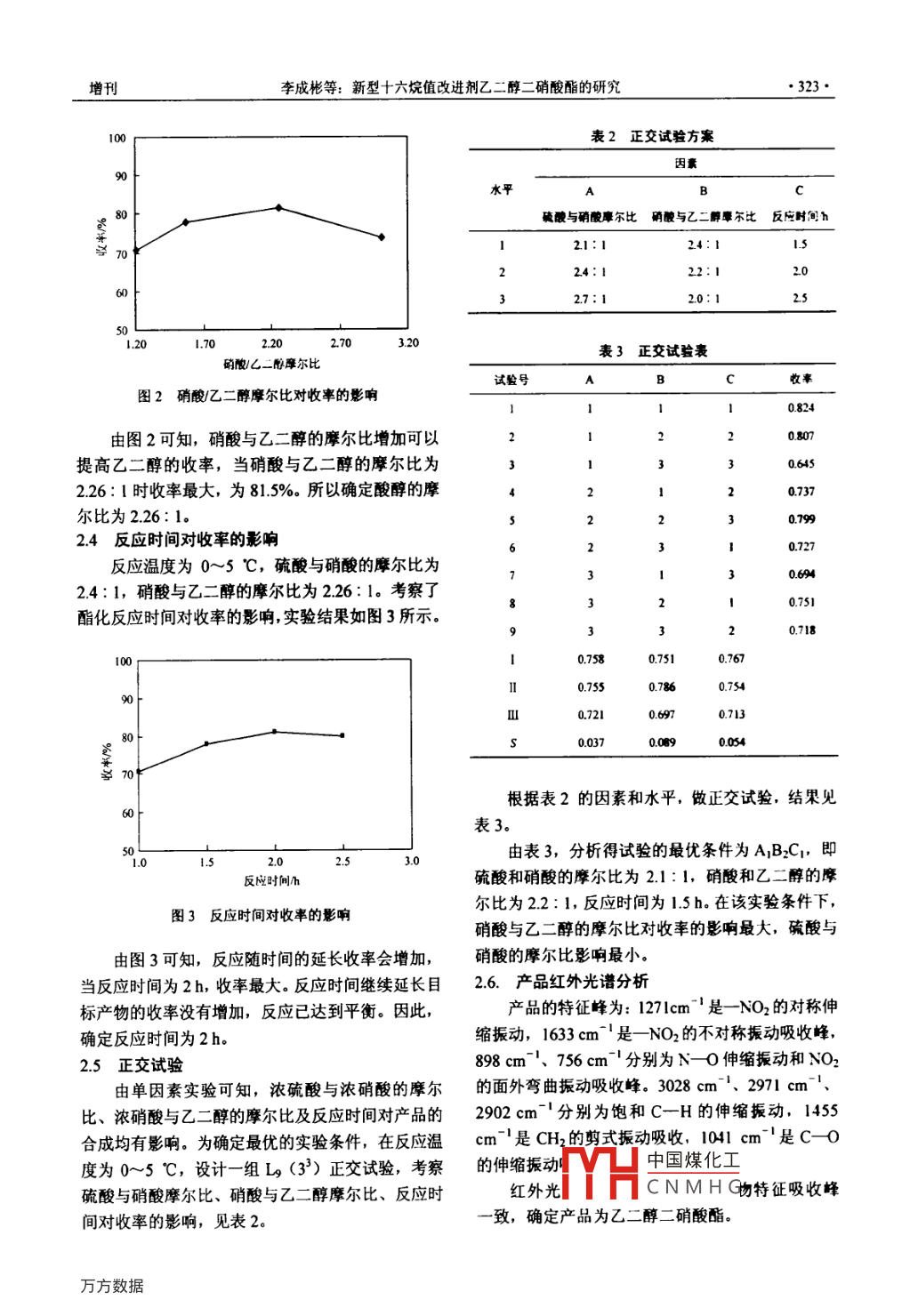 化工進(jìn)展2010年第29卷增刊CHEMICAL INDUSTRY AND ENGINEERING PROGRESS321·多研究開發(fā)新型十六烷值改進(jìn)劑乙二醇二硝酸酯的研究李成彬,龍小柱,高錦鵬,司廣順,宗學(xué)軍,程艷榮(沈陽化工大學(xué)化學(xué)工程學(xué)院,遼寧沈陽10142)摘要:采用低溫循環(huán)水浴裝置,以乙二醇、濃硝酸為原料,濃硫酸為催化劑,尿素和酸銨為穩(wěn)定劑,制備了乙二醇二硝酸酯??疾炝缩セ磻?yīng)溫度、反應(yīng)時(shí)間、酸酸摩爾比和酸醇摩爾比對(duì)酯化反應(yīng)的影響。實(shí)驗(yàn)確定了最佳反應(yīng)條件:混酸及酯化溫度控制在0~5℃,濃硫酸與濃硝酸摩爾比2.1:1,硝酸與乙二醇摩爾比為22:1,反應(yīng)時(shí)間為15h.通過紅外光譜分析產(chǎn)物的吸收峰與目標(biāo)產(chǎn)品分子的官能團(tuán)吸收峰基本一致.在該條件下合成的乙二醇二硝酸酯的收率在80%以上關(guān)鍵詞:硝酸;乙二酶;酯化;乙二酶二硝酸酯;十六烷值改進(jìn)劑中圖分類號(hào):TE6248文獻(xiàn)標(biāo)志碼:A文章編號(hào):1000-6613(2010)S2-321-04Research on new cetane number improver ethylene glycol dmitrateLI Chengbin, LONG Xiaozhu, GAO Jinpeng, SI Guangshun, ZONG Xuejun, CHENG YarrongDepartment of Chemical Engineering, Shenyang University of Chemical TechnologyShenyang 110142, Liaoning, China)Abstract: Ethylene glycol dinitrate was synthesized in a low temperature recycle water bath, with nitricacid and ethylene glycol as raw materials, sulfuric acid as catalyst and urea and ammonium sulfate asstabilizer Reaction parameters, such as esterification temperature, reaction time, molar ratio of sulfuricacid and nitric acid, molar ratio of nitric acid and ethylene glycol were studied. The optimumconditions showed that the acid mixing and esterification temperature was between 0 and 5 C, molarratio of sulfuric acid and nitric acid 2.1: 1, nitric acid and ethylene glycol was 2.2: 1, reaction timewas 1.5 h. Infrared spectrum showed that the absorption peaks of synthesized product and targetproduct functional groups were basically identical. the yield was above 80%under these conditionsKey words: nitric acid; ethylene glycol; esterification; ethylene glycol dinitrate; cetane number improver十六烷值( cetane number,簡(jiǎn)稱CN)是衡量普遍方法。國(guó)際上應(yīng)用較廣的改進(jìn)劑有美國(guó)乙基柴油抗爆性能的一項(xiàng)重要指標(biāo),高CN值的柴油具公司的EHN(2乙基己基硝酸酯)。我國(guó)主要研有明顯縮短著火滯燃期和改善燃燒特性的效果,究開發(fā)硝酸烷基酯類明、過氧化物類CN改進(jìn)我國(guó)國(guó)家標(biāo)準(zhǔn)規(guī)定車用柴油的CN不小于49劑。通過進(jìn)行臺(tái)架及燃燒分析試驗(yàn),硝酸烷酯類由于輕質(zhì)原油產(chǎn)量的下降,重質(zhì)原油催化裂化添加劑改善了柴油燃燒質(zhì)量0。叔丁基過氧化物對(duì)生產(chǎn)的汽柴油增加。柴油中正構(gòu)化烷烴含量降低,芳烴含量高的催化柴油有較好的效果,但合成工芳構(gòu)化烴在調(diào)配柴油中的比例提高,柴油的CN降低,柴油質(zhì)量下降印。提高柴油CN一般有3收稿日期:20010改唱日期,2010102種方法:①將高CN的柴油與低CN的柴油調(diào)配;基金項(xiàng)目:遼寧中國(guó)煤化工)資鵬第一作者簡(jiǎn)介:聯(lián)系人:龍?、趯?duì)柴油進(jìn)行深加工,如催化加氫技術(shù);③添柱.教授,碩生導(dǎo)甲從和恤聊的研究,Em加CN改進(jìn)劑6。添加CN改進(jìn)劑是提高CN的 ongpxiaozhulogl63am322·化工進(jìn)展2010年第29卷藝復(fù)雜。表1酯化反應(yīng)溫度的影響多硝酸酯較單硝酸酯的添加效果好,熱分解可溫度/c收率/%以產(chǎn)生更多的自由基,因此能更好地提高柴油燃燒0~5效率1.二苯胺與多硝酸酯混合是使用較為安全的70.35十六烷值改進(jìn)劑有文獻(xiàn)報(bào)道用NO5為硝化劑10~155903合成多硝酸酯,如用N2O5合成1,2丙二醇二硝15~205061酸酯,但N2O5須先在實(shí)驗(yàn)室合成,其制備工藝復(fù)注:硫酸與硝酸的摩爾比20:1,硝酸與乙二醇的摩爾比20:1,雜。本實(shí)驗(yàn)以混酸工藝合成乙二醇二硝酸酯,工反應(yīng)時(shí)間2h藝簡(jiǎn)單。乙二醇與水混溶而乙二醇二硝酸酯不溶于水,產(chǎn)品易分離且反應(yīng)較充分。為使反應(yīng)平穩(wěn)進(jìn)行,采用了尿素和硫酸銨為混合反應(yīng)穩(wěn)定劑門,反應(yīng)安量的熱,考慮到反應(yīng)溫度對(duì)產(chǎn)品的收率、純度和反全,產(chǎn)物的收率和純度較高。應(yīng)平穩(wěn)性都有影響;研究了不同溫度下的產(chǎn)品收率,結(jié)果如表1所示。1實(shí)驗(yàn)部分由表1可知,隨溫度的升高,產(chǎn)品的收率減小。1.1化學(xué)試劑反應(yīng)溫度為0~5℃時(shí)收率最大,當(dāng)溫度為15~20硫酸(濃度98%);硝酸(濃度65%);乙二醇℃時(shí)收率降低,且上層酯液顏色為紅棕色。原因是(分析純);三氯甲烷(化學(xué)純);碳酸鈉(化學(xué)純);溫度升高,反應(yīng)的平衡常數(shù)減小,反應(yīng)收率低;且無水硫酸鈉(化學(xué)純)。硝酸的氧化性變強(qiáng),會(huì)氧化乙二醇,生成紅棕色氮12儀器氧化物,致使目標(biāo)產(chǎn)物的收率降低低溫外循環(huán)水浴(HWC);紅外光譜儀22硫酸用量對(duì)反應(yīng)的影響( NEXUS470);增力電動(dòng)攪拌(JB50D)。硫酸為催化劑,考慮到硫酸與硝酸不同的摩爾13實(shí)驗(yàn)方法比對(duì)酯化反應(yīng)會(huì)有影響。在反應(yīng)溫度0~5℃、硝向裝有攪拌器、溫度計(jì)及滴液漏斗的三口燒瓶酸與乙二醇的摩爾比為20:1、反應(yīng)時(shí)間2h的