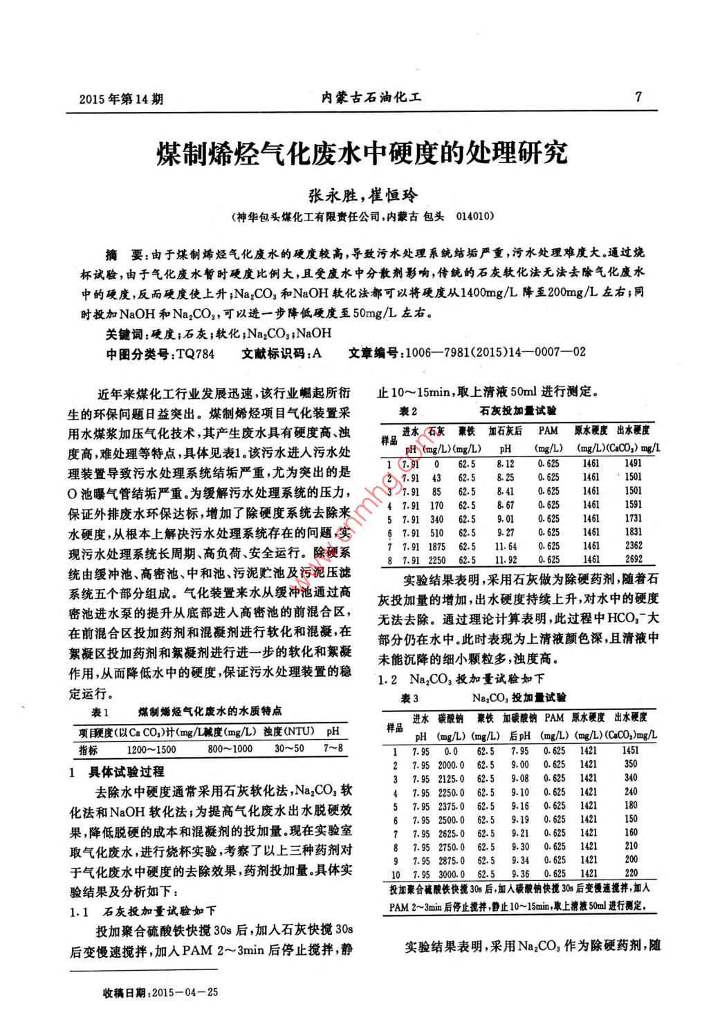 煤制烯烴氣化廢水中硬度的處理研究