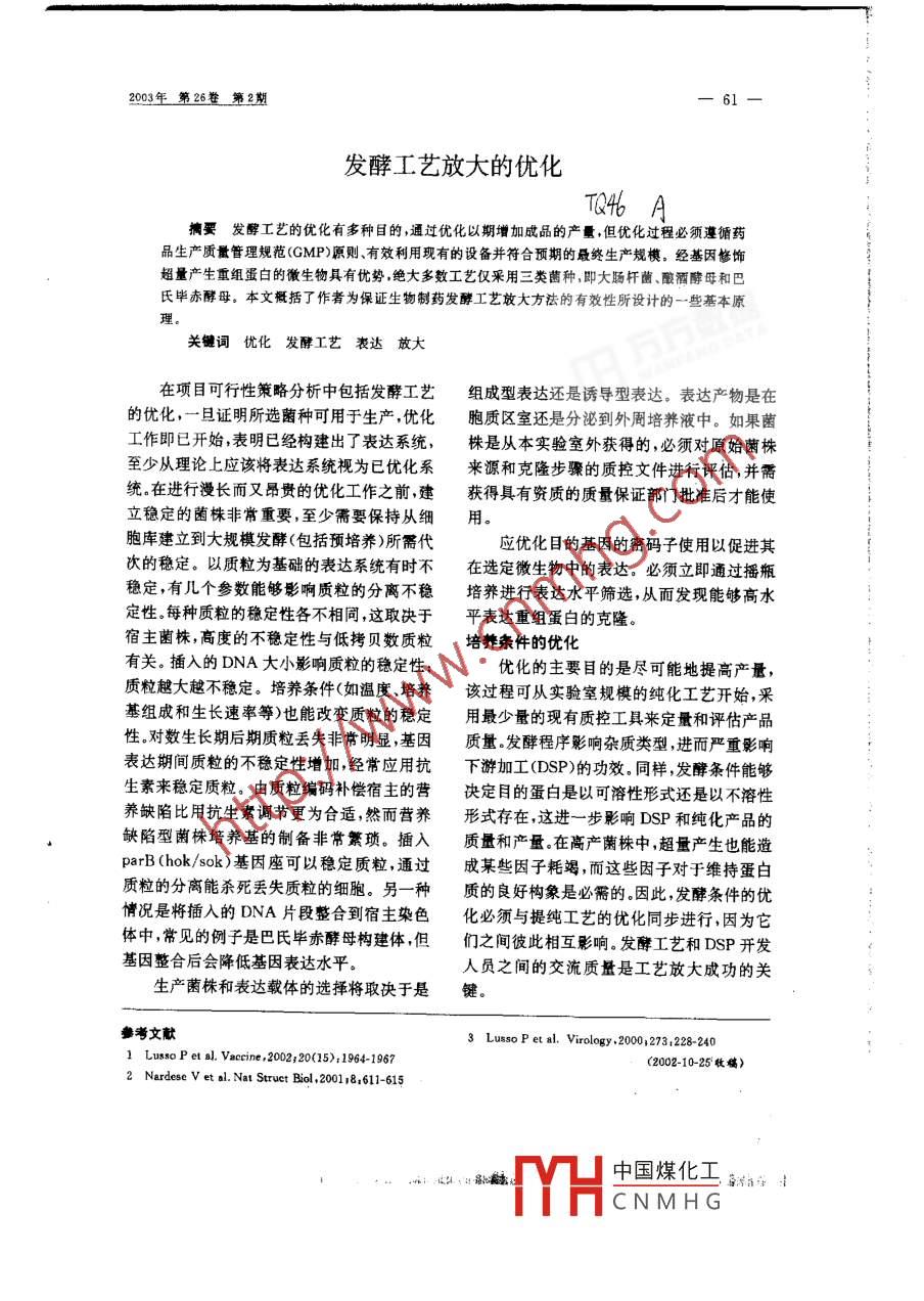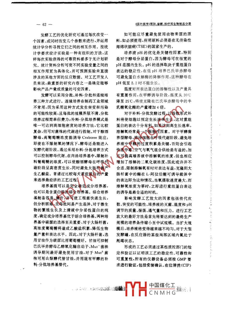 2003年第26卷第2期發(fā)酵工藝放大的優(yōu)化T46瘸要發(fā)醇工藝的優(yōu)化有多種目的,通過優(yōu)化以期增加成品的產(chǎn)量,但優(yōu)化過程必須蓬循藥品生產(chǎn)質(zhì)量管理規(guī)范GMP)原則、有效利用現(xiàn)有的設(shè)備并符合預(yù)期的最終生產(chǎn)規(guī)模。經(jīng)基因修飾超量產(chǎn)生重組蛋白的徽生物具有優(yōu)勢(shì),絕大多數(shù)工藝僅采用三類菌種,即大腸桿菌、釀酒酵母和巴氏畢赤酵母。本文概括了作者為保證生物制藥發(fā)酵工藝放大方法的有效性所設(shè)計(jì)的一些基本原關(guān)鍵詞優(yōu)化發(fā)酵工藝表達(dá)放大在項(xiàng)目可行性策略分析中包括發(fā)酵工藝組成型表達(dá)還是誘導(dǎo)型表達(dá)。表達(dá)產(chǎn)物是在的優(yōu)化,一旦證明所選菌種可用于生產(chǎn),優(yōu)化胞質(zhì)區(qū)室還是分泌到外周培養(yǎng)液中。如果菌工作即已開始,表明已經(jīng)構(gòu)建出了表達(dá)系統(tǒng),株是從本實(shí)驗(yàn)室外獲得的,必須對(duì)原始菌株至少從理論上應(yīng)該將表達(dá)系統(tǒng)枧為已優(yōu)化系來源和克隆步驟的質(zhì)控文件進(jìn)行評(píng)估,并需統(tǒng)在進(jìn)行漫長(zhǎng)而又昂貴的優(yōu)化工作之前,建獲得具有資質(zhì)的質(zhì)量保證部門批準(zhǔn)后才能使立穩(wěn)定的菌株非常重要,至少需要保持從細(xì)用。胞庫建立到大規(guī)模發(fā)酵(包括預(yù)培養(yǎng))所需代應(yīng)優(yōu)化目的基因的密碼子使用以促進(jìn)其次的穩(wěn)定。以質(zhì)粒為基礎(chǔ)的表達(dá)系統(tǒng)有時(shí)不在選定微生物中的表達(dá)。必須立即通過播瓶穩(wěn)定,有幾個(gè)參數(shù)能夠影響質(zhì)粒的分離不穩(wěn)培養(yǎng)進(jìn)行表達(dá)水平篩選,從而發(fā)現(xiàn)能夠高水定性。每種質(zhì)粒的穩(wěn)定性各不相同,這取決于平表達(dá)重組蛋白的克隆宿主菌株,高度的不穩(wěn)定性與低拷貝數(shù)質(zhì)粒培養(yǎng)條件的優(yōu)化有關(guān)。插入的DNA大小影響質(zhì)粒的穩(wěn)定性:優(yōu)化的主要目的是盡可能地提高產(chǎn)量質(zhì)粒越大越不穩(wěn)定。培養(yǎng)條件(如溫度、培養(yǎng)該過程可從實(shí)驗(yàn)室規(guī)模的純化工藝開始,采基組成和生長(zhǎng)速率等)也能改變質(zhì)粒的穩(wěn)定用最少量的現(xiàn)有質(zhì)控工具來定量和評(píng)估產(chǎn)品性。對(duì)數(shù)生長(zhǎng)期后期質(zhì)粒丟失非常明顯,基因質(zhì)量。發(fā)酵程序彩響雜質(zhì)類型,進(jìn)而嚴(yán)重影響表達(dá)期間質(zhì)粒的不穩(wěn)定性增加,經(jīng)常應(yīng)用抗下游加工(DSP的功效。同樣,發(fā)酵條件能夠生素來穩(wěn)定質(zhì)粒。由質(zhì)粒編碼補(bǔ)償宿主的營(yíng)決定目的蛋白是以可溶性形式還是以不溶性養(yǎng)缺陷比用抗生素調(diào)節(jié)更為合適,然而營(yíng)養(yǎng)形式存在,這進(jìn)一步影響DSP和純化產(chǎn)品的缺陷型菌株培養(yǎng)基的制備非常繁瑣。插入質(zhì)量和產(chǎn)量。在高產(chǎn)菌株中,超量產(chǎn)生也能遺parB(hok/sok)基因座可以穩(wěn)定質(zhì)粒,通過成某些因子耗竭,而這些因子對(duì)于維持蛋白質(zhì)粒的分離能殺死丟失質(zhì)粒的細(xì)胞。另一種質(zhì)的良好構(gòu)象是必需的。因此,發(fā)酵條件的優(yōu)情況是將插入的DNA片段整合到宿主染色化必須與提純工藝的優(yōu)化同步進(jìn)行,因?yàn)樗w中,常見的例子是巴氏畢赤酵母構(gòu)建體,但們之間彼此相互彩響。發(fā)酵工藝和DSP開發(fā)基因整合后會(huì)降低基因表達(dá)水平人員之間的交流質(zhì)量是工藝放大成功的關(guān)生產(chǎn)菌株和表達(dá)載體的選擇將取決于是鍵。參考文款3 Lusso P et al. Virology 2000, 273, 228-2401 Lusso p et a]. Vaccine,2002:20(15);1964-1967(2002-10-25收稿)2 Nardese V et al. Nat Struct Biol. 20011 81611-615中國(guó)煤化工CNMHG《國(guó)外醫(yī)學(xué)》預(yù)防診斷治療用生物制品分冊(cè)發(fā)酵工藝的優(yōu)化研究可通過每次改變?nèi)缈赡軕?yīng)盡量避免使用動(dòng)物來源的原個(gè)因素、或同時(shí)改變幾個(gè)參數(shù)來進(jìn)行,并運(yùn)用料,如必須使用,所用原料必須是在無傳染性統(tǒng)計(jì)學(xué)分析尋找它們之間的相互作用。按統(tǒng)海綿狀腦病(TSE)的國(guó)家生產(chǎn)的。計(jì)學(xué)要求設(shè)計(jì)實(shí)驗(yàn)是一種有組織的方法這培養(yǎng)液pH的優(yōu)化是關(guān)鍵性因素,特別樣每次實(shí)驗(yàn)獲得的可靠資料要多于無計(jì)劃研是對(duì)于酵母分泌蛋白,因?yàn)榻湍缚稍诤軐挼木?。統(tǒng)計(jì)資料分析可使不同實(shí)驗(yàn)變量之間的pH范圍內(nèi)生長(zhǎng)。PH的選擇取決于重組蛋白相互作用更為具體化,并可預(yù)測(cè)實(shí)驗(yàn)未直接表達(dá)的穩(wěn)定性,在低pH培養(yǎng)巴氏畢赤酵母涉及的其他方面的反應(yīng)數(shù)據(jù)。對(duì)工藝開發(fā)人可避免蛋白水解酶的降解作用,這種酵母在員來說,最重要的研究?jī)?nèi)容之一是確定能夠pH低至2.2時(shí)不能生長(zhǎng)影響產(chǎn)品產(chǎn)量或質(zhì)量的可變因素溫度對(duì)所表達(dá)蛋白的溶解性以及產(chǎn)量具發(fā)酵可以采用分批、補(bǔ)料-分批和連續(xù)培有重要作用,在甲醇誘導(dǎo)階段,溫度從30℃養(yǎng)三種方式進(jìn)行。連續(xù)培
