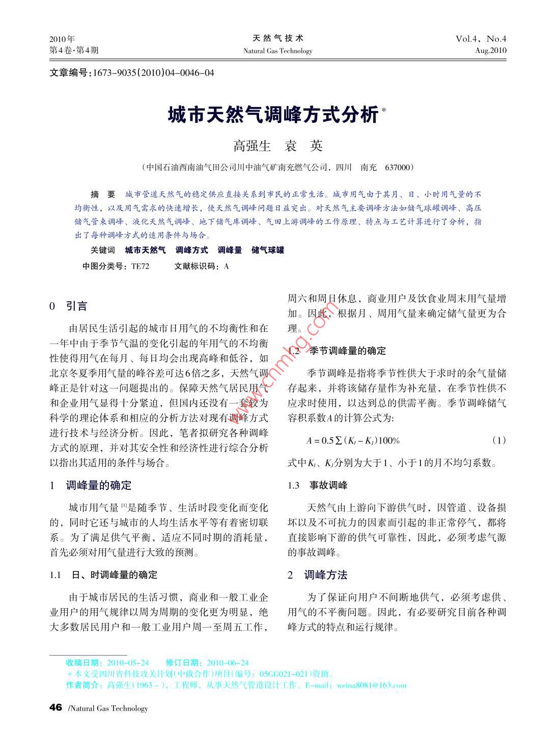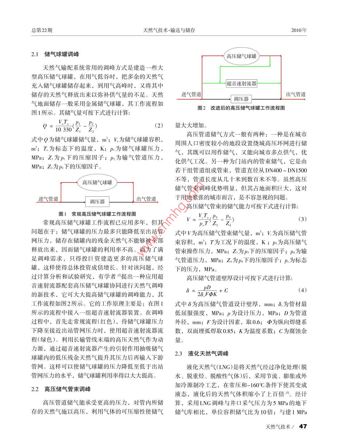 2010年天然氣技術(shù)Vol4,No.4第4卷.第4期Natural Gas TechnologyAug:2010文章編號(hào):1673- -9035(2010)04- -0046- 04城市天然氣調(diào)峰方式分析高強(qiáng)生袁英(中國(guó)石油西南油氣田公司川中油氣礦南充燃?xì)夤?,四川南?37000)摘要城市管道天然氣的穩(wěn)定供應(yīng)直接關(guān)系到市民的正常生活。城市用氣由于其月、日、小時(shí)用氣量的不均衡性,以及用氣需求的快速增長(zhǎng),使天然氣調(diào)峰問(wèn)題日益突出。對(duì)天然氣主要調(diào)峰方法如儲(chǔ)氣球罐調(diào)峰、高壓儲(chǔ)氣管束調(diào)峰、液化天然氣調(diào)峰、地下儲(chǔ)氣庫(kù)調(diào)峰、氣田上游調(diào)峰的工作原理、特點(diǎn)與工藝計(jì)算進(jìn)行了分析,指出了每種調(diào)峰方式的適用條件與場(chǎng)合。關(guān)鍵詞城市天然氣 調(diào)峰方式調(diào)峰量?jī)?chǔ)氣球罐中圖分類號(hào): TE72文獻(xiàn)標(biāo)識(shí)碼: A周六和周日休息,商業(yè)用戶及飲食業(yè)周末用氣量增0引言加。因此,根據(jù)月、周用氣量來(lái)確定儲(chǔ)氣量更為合由居民生活引起的城市日用氣的不均衡性和在-年中由于季節(jié)氣溫的變化引起的年用氣的不均衡1.2季節(jié)調(diào)峰量的確定性使得用氣在每月、每日均會(huì)出現(xiàn)高峰和低谷,如北京冬夏季用氣量的峰谷差可達(dá)6倍之多,天然氣調(diào)季節(jié)調(diào)峰是指將季節(jié)性供大于求時(shí)的余氣量?jī)?chǔ)峰正是針對(duì)這一問(wèn)題提出的。保障天然氣居民用氣存起來(lái),并將該儲(chǔ)存量作為補(bǔ)充量,在季節(jié)性供不和企業(yè)用氣顯得十分緊迫,但國(guó)內(nèi)還沒(méi)有一套較為應(yīng)求時(shí)使用,以達(dá)到總的供需平衡。季節(jié)調(diào)峰儲(chǔ)氣科學(xué)的理論體系和相應(yīng)的分析方法對(duì)現(xiàn)有調(diào)峰方式容積系數(shù)A的計(jì)算公式為:進(jìn)行技術(shù)與經(jīng)濟(jì)分析。因此,筆者擬研究各種調(diào)峰A= 0.52(K- K)100%(1)方式的原理,并對(duì)其安全性和經(jīng)濟(jì)性進(jìn)行綜合分析以指出其適用的條件與場(chǎng)合。式中K、K分別為大于1、小于1的月不均勻系數(shù)。1調(diào)峰 量的確定1.3事故調(diào)峰城市用氣量"是隨季節(jié)、生活時(shí)段變化而變化天然氣由上游向下游供氣時(shí),因管道、設(shè)備損的,同時(shí)它還與城市的人均生活水平等有著密切聯(lián)壞以及不可抗力的因素而引起的非正常停氣,都將系。為了滿足供氣平衡,適應(yīng)不同時(shí)期的消耗量,直接影響下游的供氣可靠性,因此,必須考慮氣源首先必須對(duì)用氣量進(jìn)行大致的預(yù)測(cè)。的事故調(diào)峰。1.1日、 時(shí)調(diào)峰量的確定2調(diào)峰方法由于城市居民的生活習(xí)慣,商業(yè)和- -般工業(yè)企為了保證向用戶不間斷地供氣,必須考慮供、業(yè)用戶的用氣規(guī)律以周為周期的變化更為明顯,絕用氣的不平衡問(wèn)題。因此,有必要研究目前各種調(diào)大多數(shù)居民用戶和一.般工業(yè)用戶周一至周五工作,峰 方式的特點(diǎn)和運(yùn)行規(guī)律。收稿日期: 2010-05-24修訂日期: 2010-06-24中本文受四川省科技攻 關(guān)計(jì)劃(中俄合作)項(xiàng)目(編號(hào): 05G0021-021 )資助.作者簡(jiǎn)介:高強(qiáng)生(1963-), 工程師,從事天然氣管道設(shè)計(jì)工作。E-mail: wein808 1@ 163.com46 /Natural Gas Technology總第22期天然氣技術(shù).輸送與儲(chǔ)存2010年2.1儲(chǔ)氣球罐調(diào)峰高壓儲(chǔ)氣球罐天然氣輸配系統(tǒng)常用的調(diào)峰方式是建造一些大型高壓儲(chǔ)氣球罐,在用氣低谷時(shí),把多余的天然氣充人儲(chǔ)氣球罐儲(chǔ)存起來(lái),到用氣高峰時(shí),又將其中超音速射流器儲(chǔ)存的天然氣釋放出來(lái)以彌補(bǔ)供氣量的不足。天然進(jìn)氣管道出氣管道.調(diào)壓器氣地面儲(chǔ)存一一 般采用金屬儲(chǔ)氣球罐,其工作流程如圖2改進(jìn)后的高壓儲(chǔ)氣球罐 工作流程圖圖I所示。其儲(chǔ)氣量可按下式進(jìn)行計(jì)算:Q=10330(Z -會(huì))量大大增加。高壓管道儲(chǔ)氣方式一般有兩種:一.種是在城市式中Q為儲(chǔ)氣球罐儲(chǔ)氣量,m; V.為儲(chǔ)氣球罐容積,周圍人口密度較小的地段設(shè)置繞城高壓環(huán)網(wǎng)進(jìn)行儲(chǔ)m'; T。為標(biāo)態(tài)下的溫度,K; p.為儲(chǔ)氣球罐壓力,氣,其既可以用作儲(chǔ)氣,又能向城市多點(diǎn)供氣,優(yōu)MPa; Z為pr下的壓縮因子; pr 為輸氣管道壓力,化供氣工況。另一種為門站內(nèi)的管束儲(chǔ)氣,它是由MPa; Z為p2下的壓縮因子。若干組管道組成管束,管道直徑從DN400 ~ DN1500不等,管道長(zhǎng)度從幾十米到數(shù)百米不等。雖然高壓儲(chǔ)氣管束調(diào)峰優(yōu)勢(shì)明顯,但其占地面積巨大,這對(duì)調(diào)壓器于用地緊張的城市而言,是不容忽視的問(wèn)題。高壓儲(chǔ)氣管束的儲(chǔ)氣能力可按下式進(jìn)行計(jì)算:圖1 常規(guī)高壓儲(chǔ)氣球罐工作流程圖常規(guī)高壓儲(chǔ)氣球罐工作流程已應(yīng)用多年,但其p.TZ,- z?問(wèn)題在于:儲(chǔ)氣球罐的壓力最多只能降低至出站管式中V為高壓儲(chǔ)氣管束儲(chǔ)氣量,m'; V.為高壓儲(chǔ)氣管網(wǎng)壓力,儲(chǔ)存在儲(chǔ)罐內(nèi)的殘余天然氣不能夠被全部束容積,m'; T為工況下的溫度,K ; ps為高壓儲(chǔ)氣釋放出來(lái),因而儲(chǔ)氣球罐
