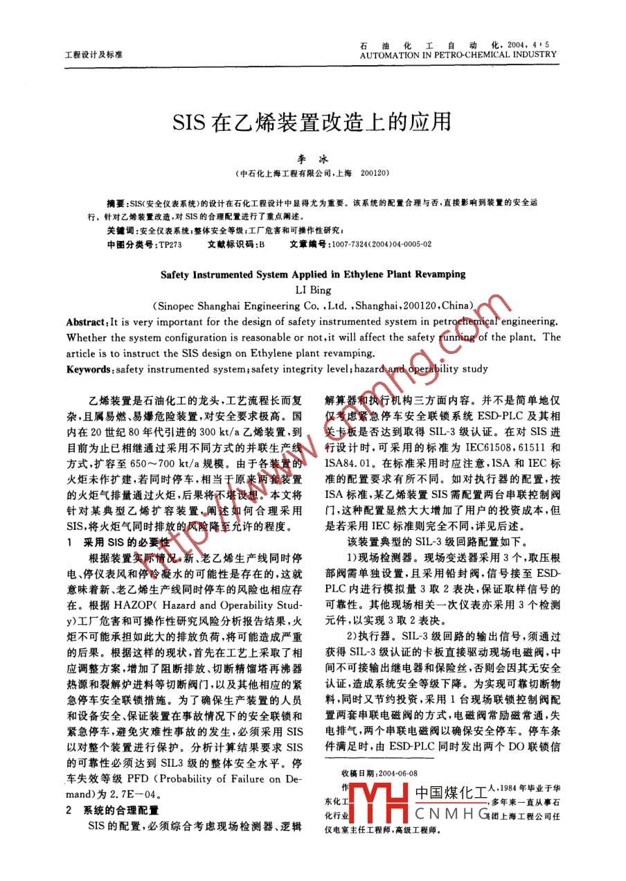 石油化工自動(dòng)..化2004,4:5工程設(shè)計(jì)及標(biāo)準(zhǔn)AUTOMATION IN PETRO-CHEMICAL INDUSTRYSIS在乙烯裝置改造上的應(yīng)用李冰(中石化上海工程有限公司.上海200120)摘要:SIS(安全儀表系統(tǒng))的設(shè)計(jì)在石化工程設(shè)計(jì)中顯得尤為重要.該系統(tǒng)的配置合理與否,直接影響到裝置的安全運(yùn)行。針對(duì)乙烯裝置改造,對(duì)sIS的合理配置進(jìn)行了重點(diǎn)闡述。關(guān)鍵詞:安全儀表系統(tǒng);整體安全等級(jí);I廠危害和可操作性研究;中圖分類號(hào):TP273文獻(xiàn)標(biāo)識(shí)碼:B文章編號(hào)10-73242004040005-0Safety Instrumented System Applied in Ethylene Plant RevampingLI Bing(Sinopec Shanghai Engineering Co. ,Ltd. ,Shanghai,200120 ,China)Abstract:It is very important for the design of safety instrumented system in petrochemical engineering.Whether the system configuration is reasonable or not,it will affect the safety running of the plant. Thearticle is to instruct the SIS design on Ethylene plant revamping.Keywords: safety instrumented system; safety integrity level; hazard and operability study乙烯裝置是石油化工的龍頭,工藝流程長(zhǎng)而復(fù)解算器和執(zhí)行機(jī)構(gòu)三方面內(nèi)容。并不是簡(jiǎn)單地僅雜,且屬易燃易爆危險(xiǎn)裝置,對(duì)安全要求極高。國(guó)僅考慮緊急停車安全聯(lián)鎖系統(tǒng)ESD-PLC及其相內(nèi)在20世紀(jì)80年代引進(jìn)的300 kt/a乙烯裝置,到關(guān)卡板是否達(dá)到取得SIL-3級(jí)認(rèn)證。在對(duì)SIS進(jìn)目前為止已相繼通過采用不同方式的并聯(lián)生產(chǎn)線行設(shè)計(jì)時(shí),可采用的標(biāo)準(zhǔn)為IEC61508, 61511和方式,擴(kuò)容至650~700 kt/a規(guī)模。由于各裝置的ISA84.01。在標(biāo)準(zhǔn)采用時(shí)應(yīng)注意,ISA和IEC標(biāo)火炬未作擴(kuò)建,若同時(shí)停車,相當(dāng)于原來兩套裝置準(zhǔn)的配置要求有所不同。如對(duì)執(zhí)行器的配置,按的火炬氣排量通過火炬,后果將不堪設(shè)想。本文將ISA標(biāo)準(zhǔn),某乙烯裝置SIS需配置兩臺(tái)串聯(lián)控制閥針對(duì)某典型乙烯擴(kuò)容裝置,闡述如何合理采用門,這種配置顯然大大增加了用戶的投資成本,但SIS,將火炬氣同時(shí)排放的風(fēng)險(xiǎn)降至允許的程度。是若采用IEC標(biāo)準(zhǔn)則完全不同,詳見后述.1采用SIS的必要性.該裝置典型的SIL-3級(jí)回路配置如下。根據(jù)裝置實(shí)際情況,新、老乙烯生產(chǎn)線同時(shí)停1)現(xiàn)場(chǎng)檢測(cè)器?,F(xiàn)場(chǎng)變送器采用3個(gè),取壓根電停儀表風(fēng)和停冷凝水的可能性是存在的,這就部閥需單獨(dú)設(shè)置,且采用鉛封閥,信號(hào)接至ESD-意味著新、老乙烯生產(chǎn)線同時(shí)停車的風(fēng)險(xiǎn)也相應(yīng)存PLC內(nèi)進(jìn)行模擬量3取2表決,保證取樣信號(hào)的在。根據(jù)HAZOP( Hazard and Operability Stud-可靠性。其他現(xiàn)場(chǎng)相關(guān)- -次儀表亦采用3個(gè)檢測(cè)y)工廠危害和可操作性研究風(fēng)險(xiǎn)分析報(bào)告結(jié)果,火元件,以實(shí)現(xiàn)3取2表決.炬不可能承擔(dān)如此大的排放負(fù)荷,將可能造成嚴(yán)重2)執(zhí)行器。SIL-3 級(jí)回路的輸出信號(hào),須通過的后果。根據(jù)這樣的現(xiàn)狀,首先在工藝上采取了相獲得SIL-3級(jí)認(rèn)證的卡板直接驅(qū)動(dòng)現(xiàn)場(chǎng)電磁閥,中應(yīng)調(diào)整方案,增加了阻斷排放、切斷精餾塔再沸器間不可接輸出繼電器和保險(xiǎn)絲,否則會(huì)因其無安全熱源和裂解爐進(jìn)料等切斷閥門,以及其他相應(yīng)的緊認(rèn)證,造成系統(tǒng)安全等級(jí)下降。為實(shí)現(xiàn)可靠切斷物急停車安全聯(lián)鎖措施。為了確保生產(chǎn)裝置的人員料,同時(shí)又節(jié)約投資,采用1臺(tái)現(xiàn)場(chǎng)聯(lián)鎖控制閥配和設(shè)備安全、保證裝置在事故情況下的安全聯(lián)鎖和置兩套串聯(lián)電磁閥的方式,電磁閥常勵(lì)磁常通,失緊急停車,避免災(zāi)難性事故的發(fā)生,必須采用SIS電排氣,兩個(gè)串聯(lián)電磁閥以確保安全停車。停車條以對(duì)整個(gè)裝置進(jìn)行保護(hù)。分析計(jì)算結(jié)果要求SIS件滿足時(shí),由ESD-PLC同時(shí)發(fā)出兩個(gè)DO聯(lián)鎖信的可靠性必須達(dá)到SIL3級(jí)的整體安全水平。停收稿日期:2004-06-08車失效等級(jí)PFD (Probability of Failure on De人,1984年畢業(yè)于華mand)為2. 7E- -04.東化I中國(guó)煤化工,多年來一直從事石系統(tǒng)的合理配置SIS的配置,必須綜合考慮現(xiàn)場(chǎng)檢測(cè)器、邏輯化行業(yè)儀電室主任工程師,高級(jí)工程師。MYHC NM H G團(tuán)上海工程公司任石油化工自動(dòng)化2004 年號(hào),與此同時(shí)DCS亦需向該控制閥發(fā)出4 mA或DCS控制網(wǎng)聯(lián)接,但獨(dú)立于DCS控制網(wǎng)。DCS操20 mA的模擬關(guān)(開)信號(hào),以確保安全聯(lián)鎖閥門作站只能讀取ESD-PLC的數(shù)據(jù),不可對(duì)其進(jìn)行操動(dòng)作。為及時(shí)獲得該閥門的故障信息,通過采用作。ESD-PLC設(shè)置獨(dú)立的工程師站,實(shí)現(xiàn)編程和Hart信號(hào)轉(zhuǎn)換器與智能定位器配合,將閥位運(yùn)行事件報(bào)警記錄、打印等功能。系統(tǒng)具備在線修改、和故障診斷的數(shù)字信號(hào),通過Hart信號(hào)轉(zhuǎn)換器轉(zhuǎn)在線下載、卡件在線插拔等功能。采用3個(gè)表決通換成DC