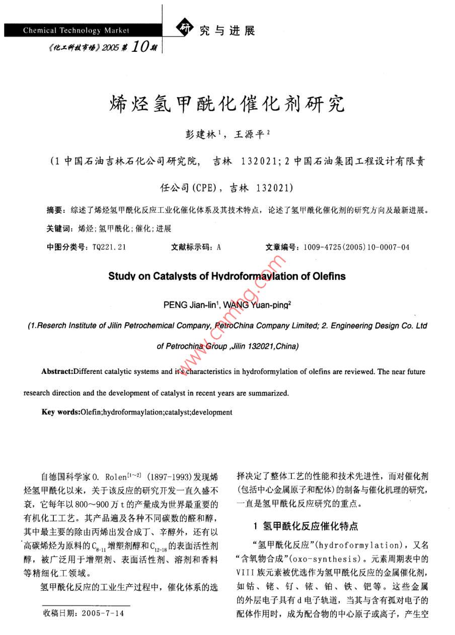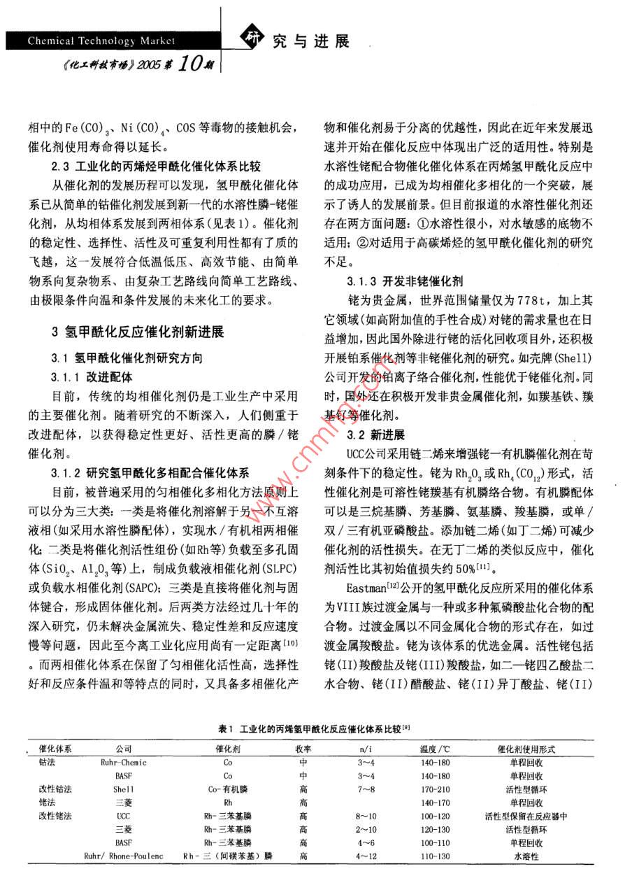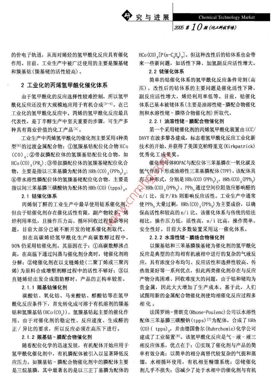 Chemical Technology Marke究與進展《化工科技市場)2005第10m烯烴氫甲酰化催化劑研究彭建林,王源平2(1中國石油吉林石化公司研究院, 吉林132021;2 中國石油集團工程設計有限責任公司(CPE),吉林132021)摘要:綜述了烯烴氫甲?;磻I(yè)化催化體系及其技術特點,論述了氫甲?;呋瘎┑难芯糠较蚣白钚逻M展。關鍵詞:烯烴;氫甲酰化;催化;進展中圖分類號: TQ221.21文獻標示碼: A文章編號: 1009-4725 (2005) 10-0007-04Studv on Catalysts of Hydroformavlation of OlefinsPENG Jian-lin', WANG Yuan-ping2(1.Reserch Institute of Jilin Petrochemical Company, PetroChina Company Limited; 2. Engineering Design Co. Ltdof Petrochina Group ,Jilin 132021,China)Abstract:Different catalytic systems and it's characteristics in hydroformylation of olefins are reviewed. The near futureresearch direction and the development of catalyst in recent years are summarized.Key words:Olefin;hydroformaylation;catalyst;development自德國科學家0. Rolen[1~2] (1897-1993) 發(fā)現(xiàn)烯擇決定了整體工藝的性能和技術先進性,而對催化劑烴氫甲酰化以來,關于該反應的研究開發(fā)一直久盛不(包括中心金屬原子和配體)的制備與催化機理的研究,衰,它每年以800~900萬t的產(chǎn)量成為世界最重要的一直是氫甲?;磻芯康闹攸c。有機化工工藝。其產(chǎn)品遍及各種不同碳數(shù)的醛和醇,其中最主要的除由丙烯出發(fā)合成丁、辛醇外,還有以1氫甲?;磻呋攸c‘高碳烯烴為原料的C。"增塑劑醇和C21的表面活性劑“氫甲酰化反應"(hydroformylation),又名醇,被廣泛用于增塑劑、表面活性劑、溶劑和香料“含氧物合成"(oxo-synthesis)。元素周期表中的等精細化工領域。VIII族元素被優(yōu)選作為氫甲?;磻慕饘俅呋瘎?,氫甲酰化反應的工業(yè)生產(chǎn)過程中,催化體系的選如鈷、銠、釕、銥、鉑、鐵、鈀等。這些金屬的外層電子具有d電子軌道,當其與含有孤對電子的收稿日期: 2005-7-14配體作用時,成為配合物的中心原子或離子,產(chǎn)生空30究與進展Chemical Technology Market2005第10期(化工科技市場》的價電子軌道,從而對烯烴的氫甲?;磻哂写呋疕Co (CO) g[P(n-CH),]。但這種改性后的鈷體系也會帶作用。目前。工業(yè)生產(chǎn)中被廣泛使用的主要是羰基銠來一些新問題,如活性下降、加氫副反應活性增大。和羰基鈷(羰基銠的活性較高)。2.2銠催化體系簡單的鈷催化體系的氫甲酰化反應條件苛刻(高2工業(yè)化的丙烯氫甲?;呋w系壓),改性后的鈷體系的主要問題是催化活性下降,由于氫甲?;姆磻x擇性較難控制,所以氫甲副反應活性增大,烯烴利用率低等。目前,鈷催化?;磻€沒有大規(guī)模地應用于有機合成3~41。在已體系已基 本被銠體系(主要是油溶性銠-膦配合物催化工業(yè)化的氫甲酰化反應中,丙烯的氫甲酰化反應最具劑和水溶 性銠-膦絡合物催化劑)所取代。代表性,是丁辛醇生產(chǎn)中至關重要的步驟,可生產(chǎn)多2.2. 1油溶性銠-膦配合物催化劑種具有商業(yè)價值的化工產(chǎn)品[5]。第一個采用銠催化劑的丙烯氫甲酰化裝置由UCC/工業(yè)生產(chǎn)中丙烯氫甲?;拇呋瘎┲饕捎?種類DAVY 在波多黎各建成,標志著氫甲?;磻I(yè)化新型[6]的過渡金屬配合物:①氫羰基鈷配位化合物HCo技 術的開始,并獲得了美國克帕特里克(Ki rkpatrick)(C0) g;②帶叔膦配位體的氫羰基鈷配位化合物,如優(yōu)秀化工成果獎。HCo (CO)。(PR,) ;③帶叔膦配位體的氫羰基銠配位化合催化劑母體ROPAC與配位體三苯基膦在- -氧化碳及物,主要是指以三苯基膦為配體的HRh(C0)。(PPh)2;氫 氣作用下形成油溶性三苯基膦配體(PP),該配體具④帶水溶性膦配位體的氫羰基銠配位化合物,主要是有三種形式,分別是HRh(CO) (PPh)z HRh (CO),(PPh)指以間三苯基膦三磺酸鈉為配體的HRh (CO) (pps)。2、HRh(C0), (PPh,)。 PPh, 通過空間位阻效應影響醛的2.1鈷催化體系n/i比,而P/Rh則影響反應活性。工業(yè)生產(chǎn)中通常丙烯制丁醛的工業(yè)生產(chǎn)中最早使用鈷系催化劑,使PPh,大量過剩,HRh (CO)。(PPh,)為主要成份,以確但由于鈷催化劑存在催化活性有限,副產(chǎn)物較多,烯保高活性和較高的 n/i比。該催化體系與傳統(tǒng)的鈷法烴利用率低,且操作壓力高、循環(huán)回收過程復雜等問相比,操作壓力低,活性高,n/i比高,操作簡單,題,目前大部分已被不斷開發(fā)的銠系催化劑取代。安全性好。目前大多數(shù)裝置采用這一-催化體系。但在高碳烯烴氫甲?;a(chǎn)高碳數(shù)醇過程中,2.2.2水溶性銠-膦絡合物催化劑90%仍采用鈷催化劑。其原因在于:①高碳數(shù)醇沸點以羰基鈷和三苯基膦羰基銠為催化劑的氫甲?;?,在高溫下通過閃蒸與催化劑分離時,銠催化劑將反應是典型的在均相有機液相中進行的復雜的氣液反分解;②銠催化劑在以支鏈烯烴(二聚丁烯或三聚丙應,具有濃度分布均勻、反應活性和選擇性較高、傳烯)為原料合成增塑劑醇過程中的活性不夠好;③以熱效果好等一系列優(yōu)點,但此兩類催化劑存在與反應直鏈烯烴出發(fā)合成脂肪醇時,產(chǎn)品的正構率較差。產(chǎn)物分離困難、回收難度大的問題,由于鈷和銠均為2.1.1羰基鈷催化劑貴金屬,因此大大增加了生產(chǎn)成本?;诖耍藗兲妓徕?、氧化鈷、馬來酸鈷、醋酸鈷等在氫甲試圖用新的金屬配合物催化劑使均相催化反應過程多?;磻獥l件下,首先轉(zhuǎn)化成可溶于有機溶劑的羰基相化。鈷和氫羰基鉆(HCo(C0)),氫羰基鈷起主要的催化作法國羅納-普朗克(Rhone-Poulenc)公司以水溶