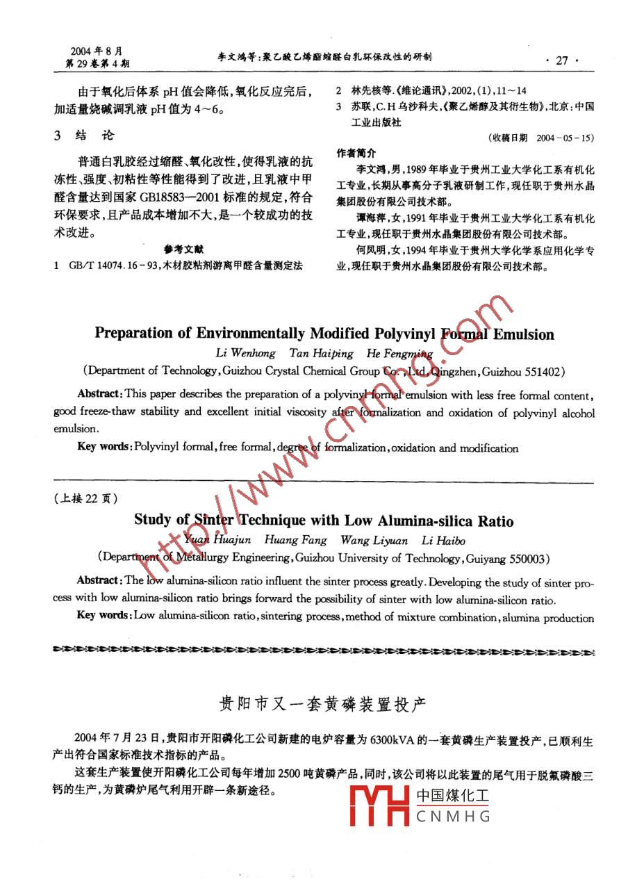 - 期刊名字:貴州化工