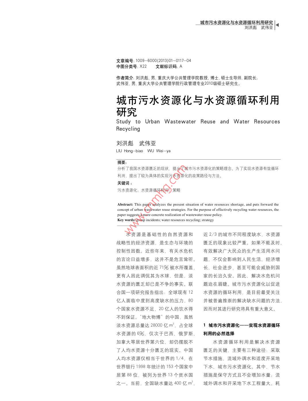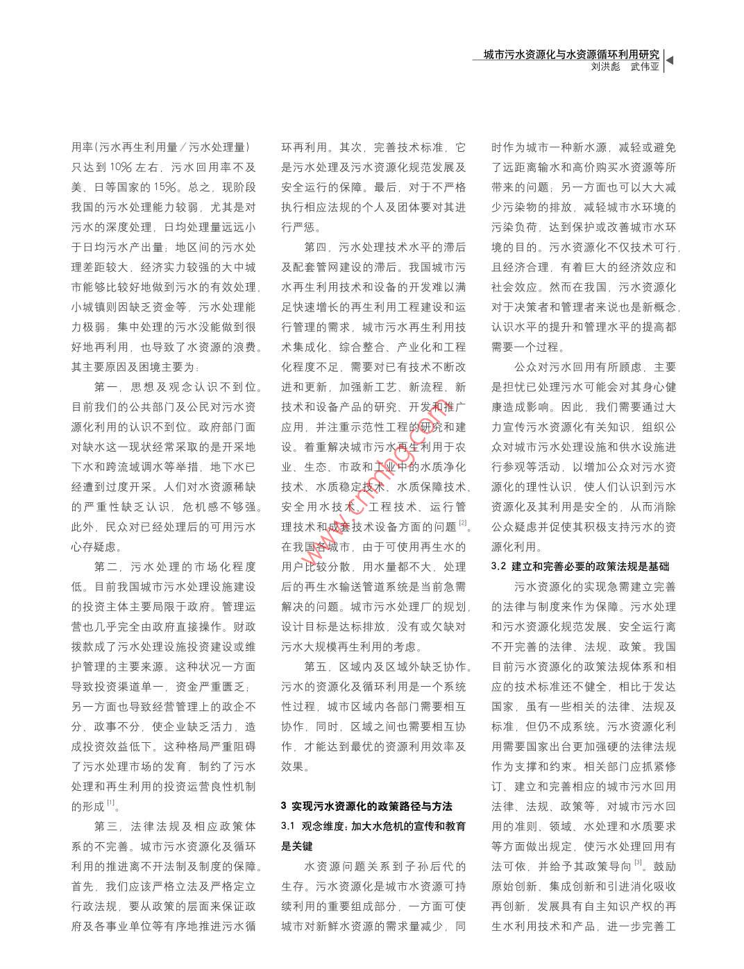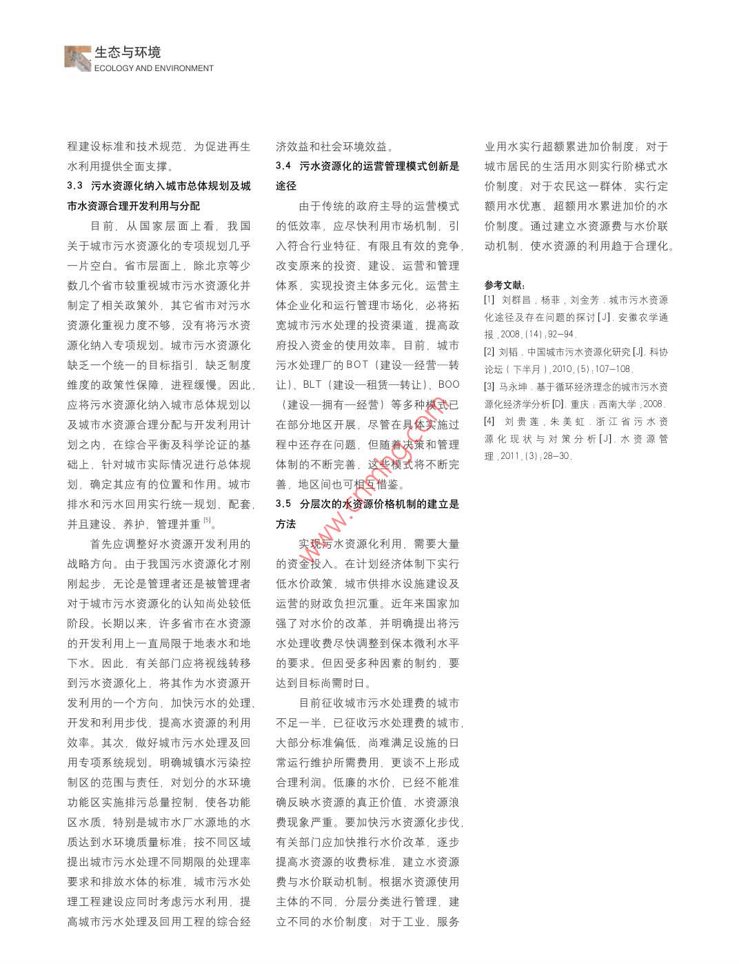 城市污水資源化與水資源循環(huán)利用研究|。劉洪彪武偉亞文章編號(hào): 1009- 6000(2013)01 -0117- -04中圖分類(lèi)號(hào): X22文獻(xiàn)標(biāo)識(shí)碼: A作者簡(jiǎn)介:劉洪彪,男.重慶大學(xué)公共管理學(xué)院教授,博士.碩士生導(dǎo)師.副院長(zhǎng):武偉亞,男.重慶大學(xué)公共管理學(xué)院行政管理專(zhuān)業(yè)2010級(jí)碩士研究生。城市污水資源化與水資源循環(huán)利用研究Study to Urban Wastewater Reuse and Water ResourcesRecyclingLIU Hong- -biao WU Wei-ya摘要:分析了我國(guó)水資源匱乏的現(xiàn)狀,提出了城市污水資源化的策略理念。為了實(shí)現(xiàn)水資源有效循環(huán)利用,提出了較為具體的實(shí)現(xiàn)污水資源化的政策路徑與方法。關(guān)鍵詞:污水資源化:水資源循環(huán)利用:策略Abstract: This paper analyzes the present situation of water resources shortage, and puts forward theconcept of urban wastewater reuse strategies. For the purpose of efctively recycling water resources, thepaper suggests a more concrete realization of wastewater reuse policy,Key words: group ieidents;, water resoure reyeing:; stategey水資源是基礎(chǔ)性的自然資源和近2/3的城市不同程度缺水,水資源戰(zhàn)略性的經(jīng)濟(jì)資源,是生態(tài)與環(huán)境的匱乏的現(xiàn)象比較嚴(yán)重。如果不能及時(shí),控制性因數(shù)。近些年來(lái),有關(guān)水危機(jī)有效解決廣大民眾的生產(chǎn)生活用水問(wèn)的言論日益增多,這并不是危言聳聽(tīng)。題, 不僅會(huì)影響到人民生活、經(jīng)濟(jì)增雖然地球表面積的近71%被水所覆蓋,長(zhǎng)、社會(huì)進(jìn)步,甚至可能會(huì)威脅到國(guó)更有人因此調(diào)侃其為水球.但是.淡家的長(zhǎng)治久安。因此,解決水危機(jī)問(wèn)水資源的匱乏卻已是不爭(zhēng)的事實(shí)。聯(lián)題迫在眉睫。城市污水資源化以促進(jìn)合國(guó)- -項(xiàng)研究報(bào)告指出:全球現(xiàn)有12水資源的循環(huán)利用,是目前最受關(guān)注億人面臨中度到高度缺水的壓力.80并被普遍推崇的解決缺水問(wèn)題的方法,個(gè)國(guó)家水資源不足,20 億人的飲水得因而對(duì)其進(jìn)行研究將具有重大意義。不到保證。”地大物博” 的中國(guó),雖然淡水資源總量達(dá)28000億m'.占全球1城市污水資源化一一 實(shí)現(xiàn)水資源循環(huán)水資源的6%,僅次于巴西、俄羅斯、利用的必然選擇加拿大等居世界第六位,卻仍擺脫不水資源循環(huán)利用是解決水資源了人均水資源十分匱乏的現(xiàn)實(shí)。中國(guó)匱乏的關(guān)鍵,主要有三種途徑:采取人均水資源僅相當(dāng)于世界的1/4.在節(jié)水措施、流域外調(diào)水和適度開(kāi)采地世界銀行1998年統(tǒng)計(jì)的153個(gè)國(guó)家中下水,城市污水資源化。其中,節(jié)水居第88位,被列為世界13個(gè)貧水國(guó)措施是保守方式且不會(huì)增加水量:流之一。當(dāng)前,全國(guó)缺水量達(dá)400億m,域外調(diào)水和開(kāi)采地下水工程量大、 耗! 生態(tài)與環(huán)境ECOLOGY AND ENVIRONMENT資耗時(shí),執(zhí)行不當(dāng)甚至?xí)?dǎo)致一-系列經(jīng)與美國(guó)不相上下,可使我國(guó)在污水業(yè)用水70%~ 80%.如電力、化工自然生態(tài)環(huán)境的人為破壞,得不償失。資源化方面迅速縮小與發(fā)達(dá)國(guó)家的差等行業(yè)冷卻水占90%以上。但對(duì)于再根據(jù)資料顯示:城市供水的80%轉(zhuǎn)化距:其次,污水再利用已經(jīng)擁有20多生水的工業(yè)回用需注意: -是要確保為污水后經(jīng)收集處理,其中70%可以年的實(shí)踐探索,在技術(shù)研發(fā)、工藝流供水的保證率,決不能因再生水?dāng)嗨俅窝h(huán)使用。這意味著通過(guò)污水回程設(shè)計(jì)、成套設(shè)備制造等方面有了較而停產(chǎn):二是要保證工業(yè)產(chǎn)品的衛(wèi)生用,可以在現(xiàn)有供水量不變的情況下,大的突破,污水再利用的管理運(yùn)行模質(zhì)量,工業(yè)用水系統(tǒng)的衛(wèi)生質(zhì)量:三使城市的可用水量增加50%以上。由式、行業(yè)標(biāo)準(zhǔn)和技術(shù)規(guī)范等方面也在是作為冷卻水補(bǔ)充水時(shí),必須確保工此可以看出,城市污水的再生利用即不斷完善之中。業(yè)冷卻水系統(tǒng)不會(huì)因?yàn)槲鬯|(zhì)硬度.城市污水資源化是促進(jìn)水資源循環(huán)利許多專(zhuān)家學(xué)者在管理體制、政策微生物等指標(biāo)而受到影響。用的必然選擇,可有效保障水資源永法規(guī)和傳統(tǒng)觀念上都進(jìn)行了研究論證,(3) 農(nóng)業(yè)灌溉用水。部分已處續(xù)利用。研究得出以下三點(diǎn)是污水再利用資源理污水用于農(nóng)業(yè)灌溉既可以替代寶貴1.1城市污水資源化概念及作用化的關(guān)鍵:一是水資源要實(shí)行統(tǒng)一管的淡水資源.又可以為農(nóng)作物提供一城市污水資源化是指將城市污水理。根據(jù)水資源自身的特性和國(guó)際管定的營(yíng)養(yǎng)物質(zhì),有利于農(nóng)作物的生長(zhǎng)。轉(zhuǎn)化為能夠滿足人們生產(chǎn)和生活活動(dòng)理經(jīng)驗(yàn),必須強(qiáng)化國(guó)家對(duì)水資源的權(quán)城市污水處理廠處理后的出水,用于要求的物質(zhì)資料的過(guò)程。城市污水量屬管理。二是要對(duì)污水再生利用系統(tǒng)農(nóng)業(yè)灌溉之前要確定其必須是無(wú)害的。大、集中、水質(zhì)較為穩(w