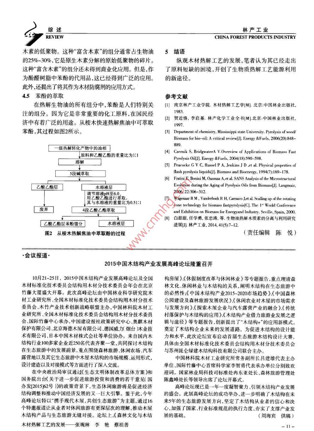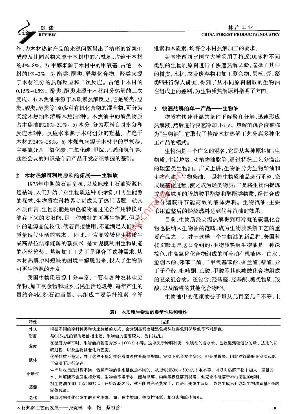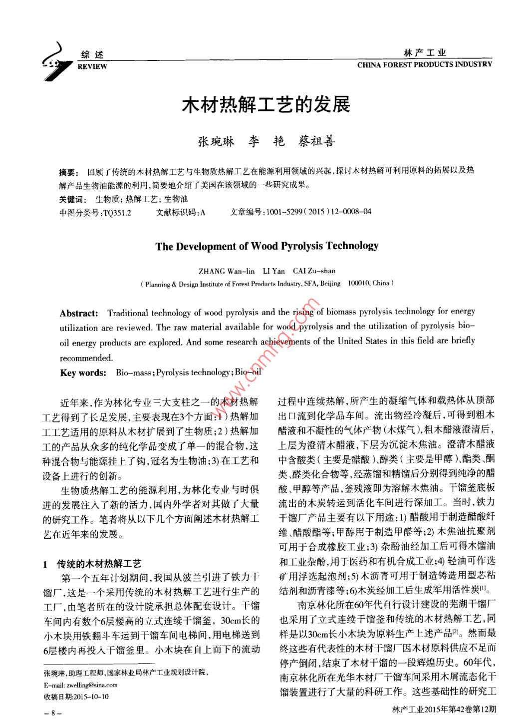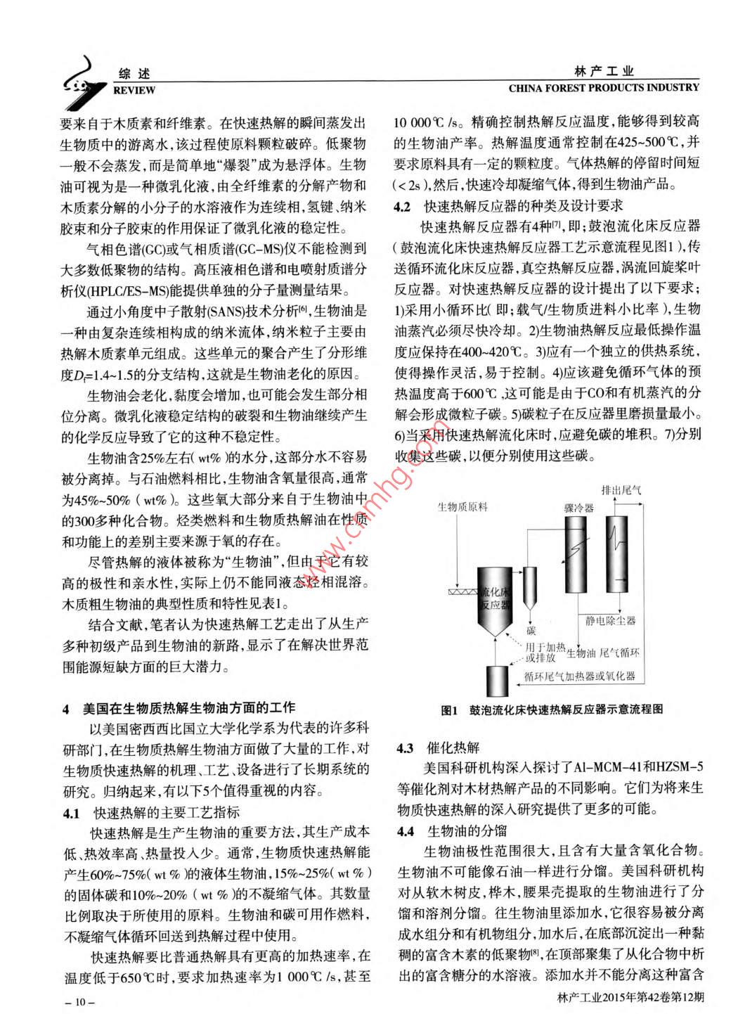 綜林產(chǎn)工業(yè)REVCHINA FOREST PRODUCTS INDUSTRY木材熱解工藝的發(fā)展張琬琳李艷蔡祖善摘要:回顧了傳統(tǒng)的木材熱解工藝與生物質(zhì)熱解工藝在能源利用領(lǐng)域的興起,探討木材熱解可利用原料的拓展以及熱解產(chǎn)品生物油能源的利用簡要地介紹了美國在該領(lǐng)域的一些研究成果。關(guān)鍵詞:生物質(zhì);熱解工藝;生物油中圖分類號:1Q3512文獻(xiàn)標(biāo)識碼:A文章編號:1001-5299(2015)12-0804The Development of Wood Pyrolysis TechnologyZHANG Wan-lin LI Yan CAI Zu-shanPlanning Design Institute of FeForest Products IndustrFA, Beijing 100010. ChinaAbstract: Traditional technology of wood pyrolysis and the rising of biomass pyrolysis technology for energyutilization are reviewed. The raw material available for wood pyrolysis and the utilization of pyrolysis biooil energy products are explored. And some research achievements of the United States in this field are brieflyrecommendedKey words: Bio-mass; Pyrolysis technology; Bio-oil近年來,作為林化專業(yè)三大支柱之一的木材熱解過程中連續(xù)熱解,所產(chǎn)生的凝縮氣體和載熱體從頂部工藝得到了長足發(fā)展,主要表現(xiàn)在3個(gè)方面:1)熱解加出口流到化學(xué)品車間。流出物經(jīng)冷凝后,可得到粗木工工藝適用的原料從木材擴(kuò)展到了生物質(zhì);2)熱解加醋液和不凝性的氣體產(chǎn)物(木煤氣),粗木醋液澄清后,工的產(chǎn)品從眾多的純化學(xué)品變成了單一的混合物,這上層為澄清木醋液,下層為沉淀木焦油。澄清木醋液種混合物與能源掛上了鉤冠名為生物油;3)在工藝和中含酸類(主要是醋酸)醇類(主要是甲醇)酯類、酮設(shè)備上進(jìn)行的創(chuàng)新。類、醛類化合物等,經(jīng)蒸餾和精餾后分別得到純凈的醋生物質(zhì)熱解工藝的能源利用,為林化專業(yè)與時(shí)俱酸、甲醇等產(chǎn)品,釜?dú)堃杭礊槿芙饽窘褂?。干餾釜底板進(jìn)的發(fā)展注入了新的活力,國內(nèi)外學(xué)者對其做了大量流出的木炭轉(zhuǎn)運(yùn)到活化車間進(jìn)行深加工。當(dāng)時(shí),鐵力的研究工作。筆者將從以下幾個(gè)方面闡述木材熱解工千餾廠產(chǎn)品主要有以下用途:1)醋酸用于制造醋酸纖藝在近年來的發(fā)展。維、醋酸酯等;甲醇用于制造甲醛等;2)木焦油抗聚劑可用于合成橡膠工業(yè);3)雜酚油經(jīng)加工后可得木餾油1傳統(tǒng)的木材熱解工藝和工業(yè)雜酚,用于醫(yī)藥和有機(jī)合成工業(yè);4輕油可作選第一個(gè)五年計(jì)劃期間我國從波蘭引進(jìn)了鐵力干礦用浮選起泡劑;5)木瀝青可用于制造鑄造用型芯粘餾廠,這是一個(gè)采用傳統(tǒng)的木材熱解工藝進(jìn)行生產(chǎn)的結(jié)劑和瀝青漆等;:6木炭經(jīng)加工后生成軍用活性炭。工廠,由筆者所在的設(shè)計(jì)院承擔(dān)總體配套設(shè)計(jì)。干餾南京林化所在60年代自行設(shè)計(jì)建設(shè)的蕪湖干餾廠車間內(nèi)有數(shù)個(gè)6層樓高的立式連續(xù)干餾釜,30cm長的也采用了立式連續(xù)干餾釜和傳統(tǒng)的木材熱解工藝,同小木塊用鐵翻斗車運(yùn)到干餾車間電梯間,用電梯送到樣是以30cm長小木塊為原料生產(chǎn)上述產(chǎn)品。然而最6層樓內(nèi)再投入千餾釜里。小木塊在自上而下的流動(dòng)終這些有代表性的木材干餾廠因木材原料供應(yīng)不足而停產(chǎn)倒閉,結(jié)束了木材干餾的一段輝煌歷史。60年代,張琬琳,助理工程師,國家林業(yè)局林產(chǎn)工業(yè)規(guī)劃設(shè)計(jì)院南京林化所在光華木材廠干餾車間采用木屑流態(tài)化干收稿日期:2015-10-10餾裝置進(jìn)行了大量的科研工作。這些基礎(chǔ)性的研究工林產(chǎn)工業(yè)2015年第42卷第12期綜述林產(chǎn)工業(yè)REVIEWCHINA FOREST PRODUCTS INDUSTRY作,為木材熱解產(chǎn)品的來源問題得出了清晰的答案:1)維素和木質(zhì)素均符合木材熱解加工的要求。醋酸及其同系物來源于木材中的乙酰基,占絕干木材美國密西西比國立大學(xué)采用了將近100多種不同的4%-8%。2)甲醇來源于木材中的甲氧基,占絕干木類別的生物質(zhì)原料進(jìn)行了快速熱解試驗(yàn),選擇了其中材的1%-2%。3)酯類、酮類、醛類化合物。醛類來源的樹皮,木材,農(nóng)業(yè)廢棄物和加工剩余物,果核、殼,藻于木材組分的熱解反應(yīng)和二次反應(yīng)。占絕干木材的類進(jìn)行深入研究,得到了從不同原料制取的生物油015%-0.5%。酯類、酮類來源于木材組分熱解的二次在組成上的差別,為生物質(zhì)熱解原料指明了方向。反應(yīng)。4木焦油來源于木質(zhì)素?zé)峤夥磻?yīng),它是酚類,烴類酸類醇類等180多種有機(jī)化合物的混合物可分為3快速熱解的單一產(chǎn)品——生物油沉淀木焦油和溶解木焦油2種。木焦油中的酚類物質(zhì)物質(zhì)在快速升溫的條件下解聚和分解,迅速形成占木焦油的20%‰~30%。5水分,分為原料自身水分和熱解液,然后進(jìn)行快速冷卻、回收。熱解的混合液被稱反應(yīng)水2種。反應(yīng)水來源于木材組分的羥基。占絕干為“生物油”,它取代了傳統(tǒng)木材熱解工藝分離多種化木材的24%~28%。6)木煤氣來源于木材中的甲氧基,工產(chǎn)品的模式。主要成分是一氧化碳、二氧化碳、甲烷、乙烯和氫氣等。生物油是一個(gè)廣義的冠名,它是從各種原料如:生這些公認(rèn)的知識是今后產(chǎn)品開發(fā)必須掌握的基礎(chǔ)。物質(zhì)、生活垃圾