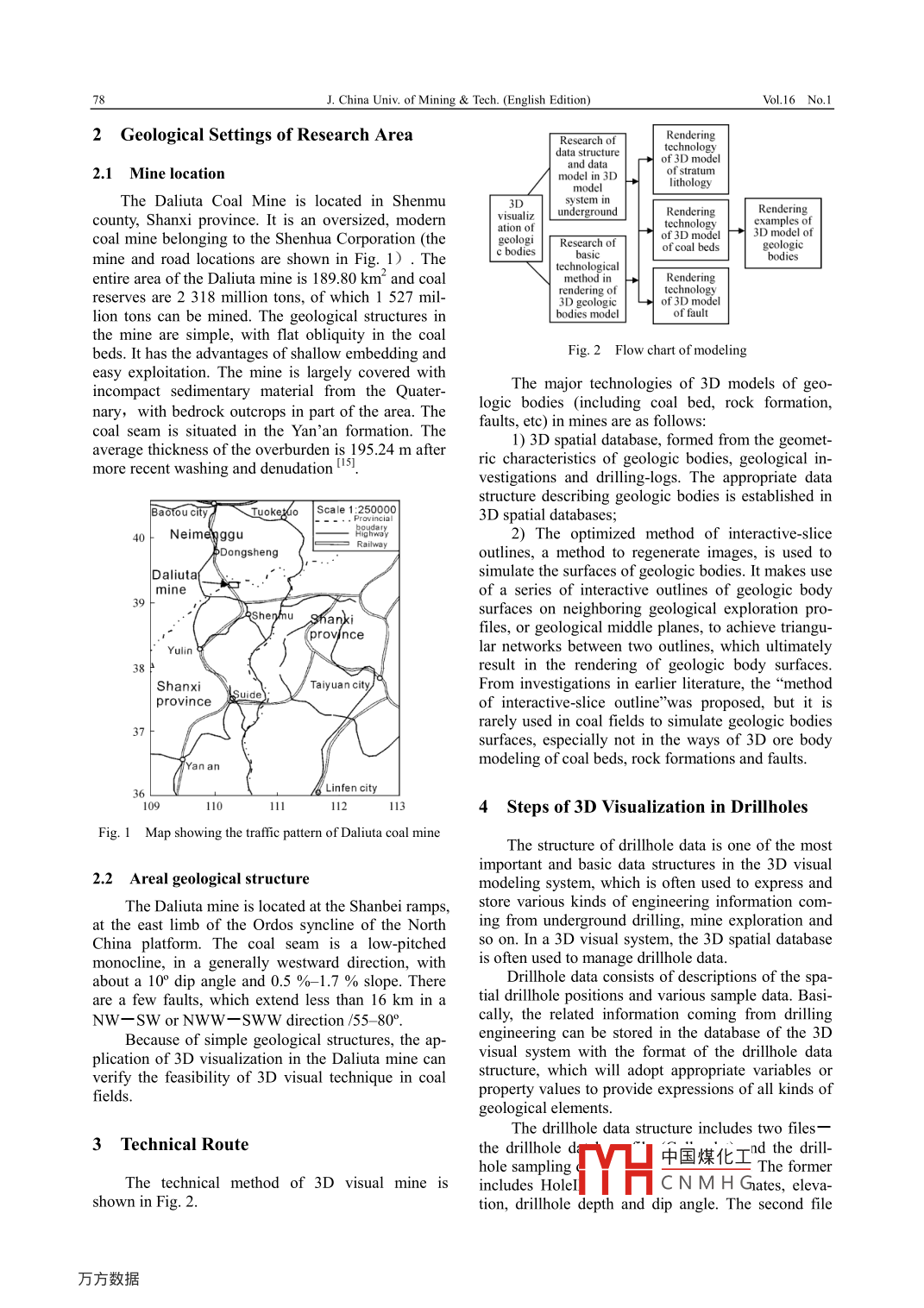 Mar.2006J. China Univ, of Mining Tech(English Edition)Vol 16 No. 1Application of 3d Visual Techniques inDaliuta Coal mineZHOU Ye"', LiN Ge, GONG Fa-xiong", LIU Shi-lin", Liu Ya-chuanGuangzhou Institute of Geochemistry, Chinese Academy of Sciences, Guangzhou, Guangdong 510640, ChinaGraduate School of Chinese Academy of Sciences, Beijing 100039, ChinaChina railway Engineering Consulting Group Co Ltd, Beijing 100020, ChinaAbstract: 3D visualization is one of major problems in"Digital Mine"theory and its technological research fieldThrough the observation of 3D geological models, spatial structural information, connected with the information ofproduction management hidden in geological data, could be detected. In order to meet the requirement of more efficientcoal exploration, a case study of geological characters of the Daliuta Coal Mine is presented in which 3D visual modelsof the ground surface and geologic bodies are established on the basis of data models and data structures of 3D geologymodeling. The main conclusions of this study are as follows:(1)Through analysis and organization of spatial discretedata, the drillhole database is designed with the data of the Daliuta mine; the connections amomg drillhole data are realized and displayed in a 3D environment. (2)Combining real data of the Daliuta mine, drillhole visualization is realizedin a 3D environment by using the CoalMiner systemhe ground surface modeling of the Daliuta coal mine adopteda surface-data model and a tin data structure. (4)3D models of coal seams and rock formations of the Daliuta mine areestablished, which provide a method for the simulation of complex surfaces of geologic bodies. In the end, the modelare applied to the Daliuta coal mine and the result shows that better geological effects are obtainedKey words: 3D visualization, 3D geology modelling, TIN, Daliuta coal mine, CoalMinerCLC number: TP 302Introductionoccur almost day-by-day, and bring about great economic loss and seriously threatens the safety of ourlmResearch and realization of 3Various kinds of geological information, espe- techniques of geologic bodies and phenomena permitcially those complicated geological structures andthe expression of mine conformations and variousphenomena distributed in 3D space can be expressed other kinds of property information and allow vastquantitatively and described clearly in a real 3D en- amounts of data to be managed by diagrams andvironment. Coal deposits are 3D geological entitiesmodern technology. As a consequence, the cost ofwhose locations and corresponding parameters needmanpower and material resources is reducedto be confirmexploration. MajIn this paper we use CoalMiner software to carrydrawings, technological data in mine development out 3D visualization practices in the Daliuta Coaland every process of mine development are conMine of the Shendong Company. For the benefit ofnected with 3D spaceAt present, research on 3D geological models isthe coal mining industry we attempt to provide agood example of 3D visualization. CoalMiner is avery comprehensive both at home and abroad, inoftware package for mine information managementcluding data models, visualization treatments and 3D which has the characteristics of real 3D. It is based ontopological relations (2-1. Many scientists app/y 3Ddata modeling, but little thought is given to visualizaMicroMine software and developed to accommodatetion treatments/ 8-31. Investigations by geologists inreal conditions of mines in China. This software canour country show that the nature of 3D visual soft- simulate the geology and exploring conditions ofware will affect practical applications.The level of information in our coal industrylogical modeling based on data from geology, surveying and mine engineering. One of the authors ofinadequate, so the production efficiency is lower than this paper takes part in the Coding of the software andthat in advanced coal countriesof the world [4] Sedeals with the 3D visualization part of the daliutavere geological disasters caused by coal exploitation ProjectReceived 15 May 2005; accepted 10 July 2005H中國煤化工CNMHGorrespondingauthorTel:+86-13710142885,+86-20-85290763;E-mailaddressyaning307@163.comJ.China Univof Mining& Tech(English Edition)Vol 16 No. 12 Geological Settings of research areaRenderingf 3D model2.1 Mine locationmodel in 3Dof stratumethologyThe Daliuta Coal mine is located in shenmusystem incounty, Shanxi province. It is an oversized, modernRenderingechnologyoal mine belonging to the Shenhua Corporation(theof 3D modelD model ofc bodiesof coal bedmine and road locations are shown in Fig. 1).Theentire area of the daliuta mine is 189. 80 km and coalreserves are 2 318 million tons, of which 1 527 miltechnologyof 3D modellion tons can be mined. The geological structures inbodies modelthe mine are simple, with flat obliquity in the coalbeds. It has the advantages of shallow embedding andFig 2 Flow chart of modelingeasy exploitation. The mine is largely covered withincompact sedimentary material from the QuaterThe major technologies of 3D models of geonary, with bedrock outcrops in part of the area. The logic bodies (including coalrock formationcoal seam is situated in the Yan'an formation. Thefaults, etc)in mines are as followsaverage thickness of the overburden is 195.24 m after1)3D spatial database, formed from the geomet-more recent washing and denudation 5ric characteristics of geologic bodies, geological investigations and drilling-logs. The appropriate data3D spatial databasesNeimenggu2)The optimized method of interactive-SliceDongshengoutlines, a method to regenerate images, is used toDaliutasimulate the surfaces of geologic bodies. It makes useoftlines of geologic bodysurfaces on neighboring geological exploration pro-geological middle planes, to achieveoutlines. which ultimatelyresult in the rendering of geologic body surfacesTaiyuan cityFrom investigations in earlier literature, the"methodprovinceof interactive-slic