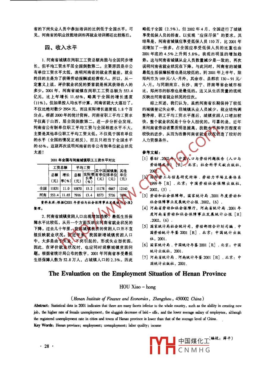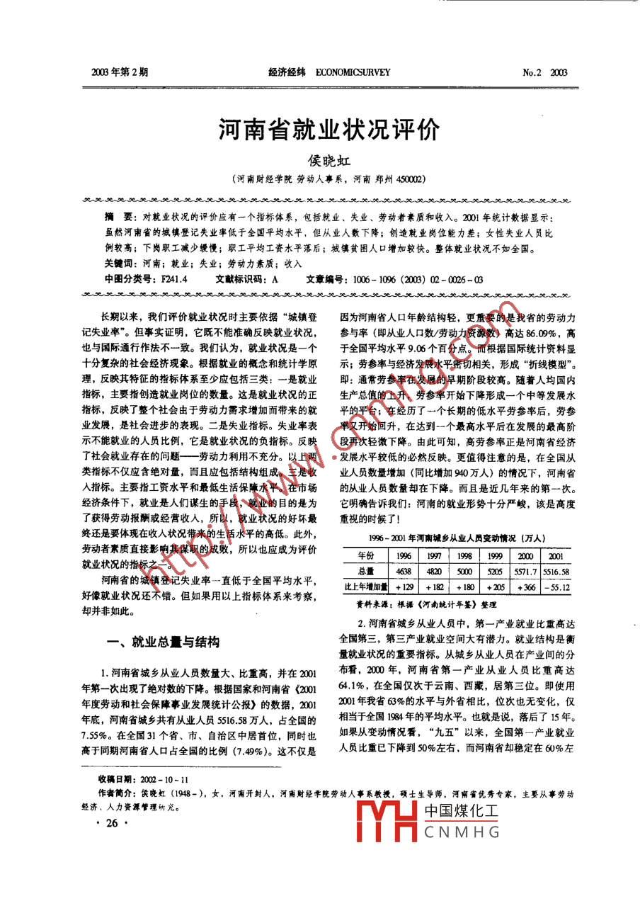 2003年第2期經(jīng)濟經(jīng)緯ECONOMICSURVEYNo.2 2003河南省就業(yè)狀況評價侯曉虹(河南財經(jīng)學(xué)院勞動人事系,河南鄭州450002)摘要:對就業(yè)狀況的評價應(yīng)有一個指標(biāo)體系,包括就業(yè)、失業(yè)、勞動者素質(zhì)和收入。2001 年統(tǒng)計數(shù)據(jù)顯示:雖然河南省的城鎮(zhèn)登記失業(yè)率低于全國平均水平,但從業(yè)人數(shù)下降;創(chuàng)造就業(yè)崗位能力差;女性失業(yè)人員比例較高;下崗職工減少緶慢;職工平均工資水平落后;城鎮(zhèn)貧困人口增加較快。整體就業(yè)狀況不如全國。關(guān)鍵詞:河南;就業(yè);失業(yè);勞動力素質(zhì);收入中國分類號: F241.4文獻(xiàn)標(biāo)識碼: A文章編號: 1006- 1096 (2003) 02 - 0026 -03長期以來,我們評價就業(yè)狀況時主要依據(jù)“城鎮(zhèn)登因為河南省人口年齡結(jié)構(gòu)輕,更重要的是我省的勞動力記失業(yè)率"。但事實證明,它既不能準(zhǔn)確反映就業(yè)狀況,參與率(即從業(yè)人口數(shù)/勞動力資源數(shù))高達(dá)86.09%,高也與國際通行作法不一致。我們認(rèn)為,就業(yè)狀況是一-個于全國平均水平9.06個百分點。而根據(jù)國際統(tǒng)計資料顯十分復(fù)雜的杜會經(jīng)濟現(xiàn)象。根據(jù)就業(yè)的概念和統(tǒng)計學(xué)原示;勞參率與經(jīng)濟發(fā)展水平密切相關(guān),形成“折線模型”。理,反映其特征的指標(biāo)體系至少應(yīng)包括三類:一是就業(yè)即:通常勞參率在發(fā)展的早期階段較高。隨著人均國內(nèi)指標(biāo),主要指創(chuàng)造就業(yè)崗位的數(shù)量。這是就業(yè)狀況的正生產(chǎn)總值的上升,勞參率開始下降形成-一個中等發(fā)展水指標(biāo),反映了整個社會由于勞動力需求增加而帶來的就平的平臺;在經(jīng)歷了一個長期的低水平勞參率后,勞參業(yè)發(fā)展,是社會進步的表現(xiàn)。二是失業(yè)指標(biāo)。失業(yè)率表率又開始回升,在達(dá)到一個最高水平后在發(fā)展的最高階示不能就業(yè)的人員比例,它是就業(yè)狀況的負(fù)指標(biāo)。反映段再次輕微下降。由此可知,高勞參率正是河南省經(jīng)濟了社會就業(yè)存在的問題---勞動力利用不充分。 以上兩發(fā)展水平較低的必然反映。更值得注意的是,在全國從類指標(biāo)不僅應(yīng)含絕對量,而且應(yīng)包括結(jié)構(gòu)組成。三是收業(yè)人員數(shù)量增加(同比增加940萬人)的情況下,河南省人指標(biāo)。主要指工資水平和最低生活保障水平。在市場的從業(yè)人員數(shù)量卻在下降。而且是近幾年來的第-次。經(jīng)濟條件下,就業(yè)是人們謀生的手段,就業(yè)的目的是為它明確告訴我們:河南的就業(yè)形勢十分嚴(yán)峻,該是高度了獲得勞動報酬或經(jīng)營收人,所以,就業(yè)狀況的好壞最重視的時候了!終還是要體現(xiàn)在收人狀況帶來的生活水平的高低。此外,1996- 2001年河南城鄉(xiāng)從業(yè)人員變動情況(萬人)勞動者素質(zhì)直接影響其謀職的成敗,所以也應(yīng)成為評價年份1996 I 199 1998199 2000 2001就業(yè)狀況的指標(biāo)之一。463848205000S205[ 5571.7 516.58河南省的城鎮(zhèn)登記失業(yè)率-直低于全國平均水平,比上年增加量+129| +182 +180 +205 +366 -55.12好像就業(yè)狀況還不錯。但如果用以上指標(biāo)體系來考察,貴料來源:根據(jù)<河南姚計年鑒整理卻并非如此。2.河南省城鄉(xiāng)從業(yè)人員中,第- -產(chǎn)業(yè)就業(yè)比重高達(dá)一、就業(yè)總量t與結(jié)構(gòu)全國第三,第三產(chǎn)業(yè)就業(yè)空間大有潛力。就業(yè)結(jié)構(gòu)是衡量就業(yè)狀況的重要指標(biāo)。從城鄉(xiāng)從業(yè)人員在產(chǎn)業(yè)間的分1.河南省城鄉(xiāng)從業(yè)人員數(shù)量大、比重高,并在2001布看,2000年,河南省第一產(chǎn)業(yè)從業(yè)人員比重高達(dá)年第- -次出現(xiàn)了絕對數(shù)的下降。根據(jù)國家和河南省<200164.1%,在全國僅次于云南、西藏,居第三位。即使用年度勞動和社會保障事業(yè)發(fā)展統(tǒng)計公報》的數(shù)據(jù),20012001年我省63%的水平與外省相比,位次也無變化,僅年底,河南省城鄉(xiāng)共有從業(yè)人員5516.58 萬人,占全國的相當(dāng)于全國1984年的平均水平。也就是說,落后了15年。7.55%。在全國31個省、市、自治區(qū)中居首位,同時也如果從變動情況看,“九五” 以來,全國第-產(chǎn)業(yè)就業(yè)高于同期河南省人口占全國的比例(7.49%)。 這不僅是人員比重已下降到50%左右,而河南省卻穩(wěn)定在60%左收稿日期: 2002- 10-11作者簡介:侯曉虹(1948-), 女,河南開封人,河南財經(jīng)學(xué)院勞動人事系教授,碩士生導(dǎo)師,河南省優(yōu)秀專家,主要從事勞動經(jīng)濟、人力資源管理研究。中國煤化工●26.YHCNMHG右。許多國家的發(fā)展歷史表明:第一產(chǎn)業(yè)就業(yè)人員比重人員再就業(yè)的難度。再從2001年的最新情況看,河南省為55%是一分界點。此后,該國進人工業(yè)化的加快發(fā)展國有企業(yè)下崗職工比上年減少4.13萬人,下降率為和農(nóng)業(yè)剩余勞動力加速轉(zhuǎn)移階段。(參看拙作 《九十年13.7%。而全國同期國企下崗職工減少142萬人,下降代中部地區(qū)農(nóng)業(yè)剩余勞動力加速轉(zhuǎn)移的新思路》《經(jīng)濟率為21.6%,比河南省高出7.9個百分點。這再次反映經(jīng)緯》1998年 1~4期)可見,