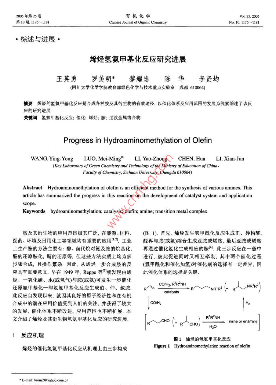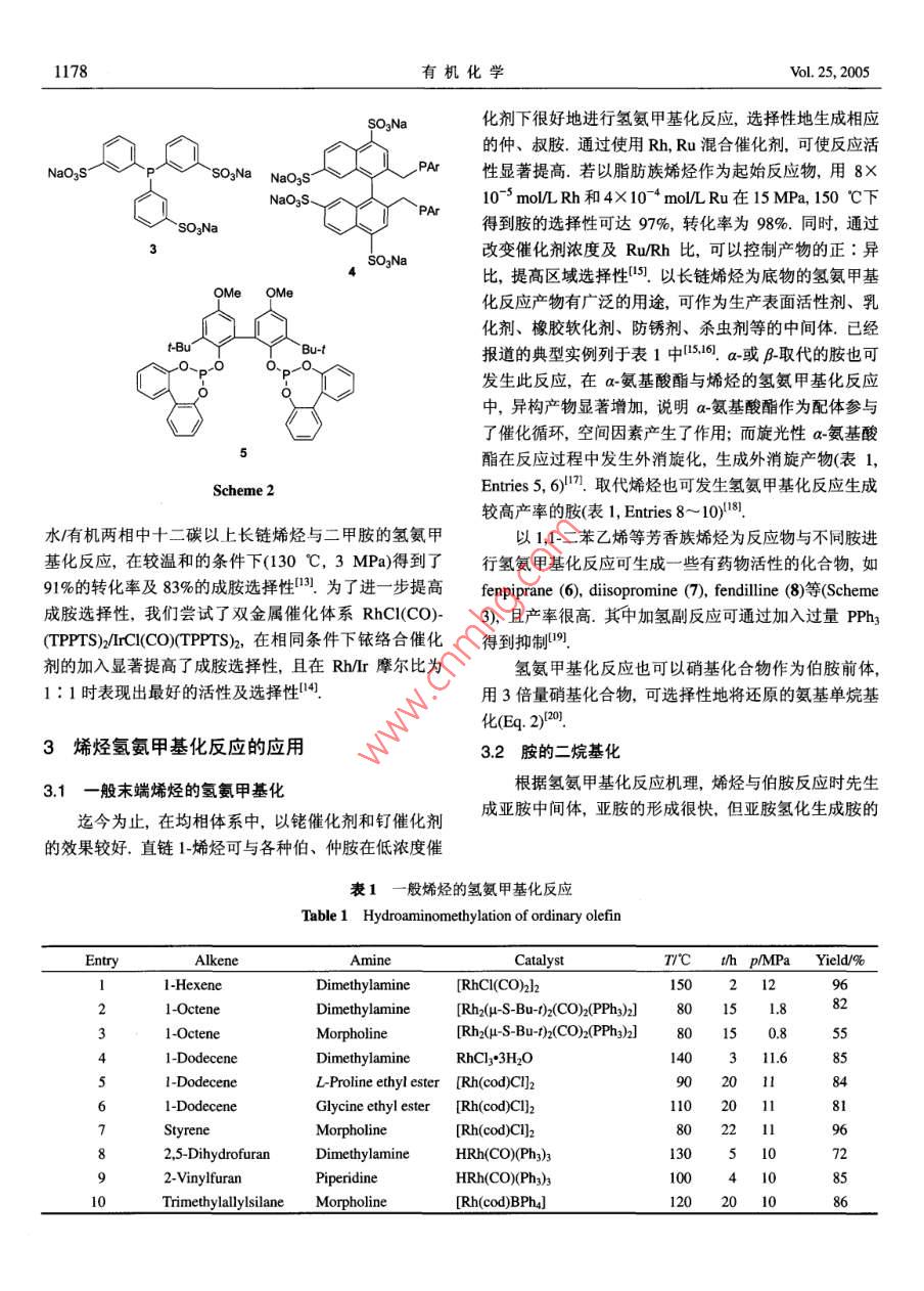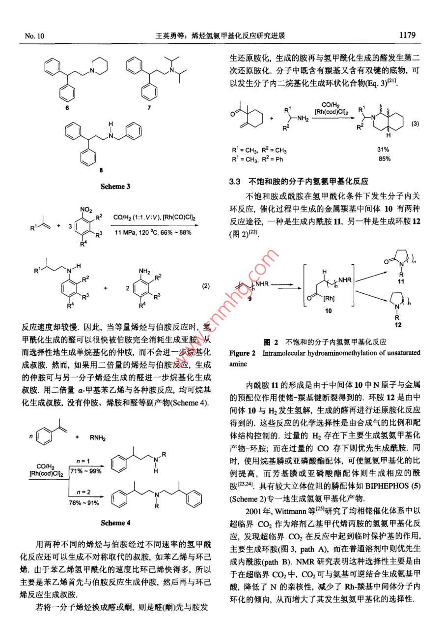 2005年第25卷有機(jī)化學(xué)Vol. 25, 2005第10期, 1176~1181Chin| of OrgarChemistryNo. 10, 1176~1181●綜述與進(jìn)展●烯烴氫氨甲基化反.應(yīng)研究進(jìn)展王英勇羅美明*黎耀忠陳華李賢均(四川大學(xué)化學(xué)學(xué)院教育部綠色化學(xué)與技術(shù)重點(diǎn)實(shí)驗(yàn)室成都610064)摘娶烯烴的氫氨甲基化反應(yīng)是 合成各種胺及其衍生物的有效途徑.以催化體系及應(yīng)用范圍的發(fā)展為線索綜述了該反應(yīng)的研究進(jìn)展.關(guān)鍵詞氫氨甲基化反應(yīng); 催化;烯烴;胺;過渡金屬絡(luò)合物Progress in Hydroaminomethylation of OlefinWANG, Ying- YongLUO, Mei-Ming*LI, Yao-ZhongCHEN, HuaLI, Xian-Jun(Key Laboratory of Green Chemistry and Technology of the Ministry of Education of China,Faculty of Chemistry, Sichuan Universit, Chengdu 610064)Abstract Hydroaminomethylation of olefin is an efficient method for the synthesis of various amines. Thisarticle has summarized the progress in this reaction on the development of catalyst system and applicationscope.Keywords hydroaminomethylation; catalysis; olefin; amine; transition metal complex胺及其衍生物的應(yīng)用范圍極其廣泛,在能源、材料、(圖1). 首先,烯烴發(fā)生氫甲?;磻?yīng)生成正、異構(gòu)醛,醫(yī)藥、環(huán)境及日用化工等領(lǐng)域均有重要的應(yīng)用121.工業(yè)醛再與胺(或氨)縮合生成亞胺或烯胺,最后亞胺或烯胺上生產(chǎn)胺的方法主要有:醇、鹵代烷對氨及胺的烷基化,再通過催化氫化生成相應(yīng)的胺用此三步反應(yīng)在一釜中醛的還原胺化,腈的還原等,但這些方法實(shí)質(zhì)上均為多進(jìn)行,彼此促進(jìn)同時(shí)又相互牽制,其中兩個(gè)催化過程步驟合成,且操作繁雜.因此,從烯烴一步合成胺的反(氫甲?;痛呋託?對催化劑的選擇有-定差異,因.應(yīng)具有重要意義.早在1949年, Reppe等)就發(fā)現(xiàn)由烯此催化體系的選擇是關(guān)鍵.烴、一氧化碳、水(或氫氣)與胺(或氨)可發(fā)生一步催化還原氨甲基化- -即氫氨甲基化反應(yīng)生成伯、仲、叔胺.R個(gè)CO/H2. R'R?NHNR'R2NR'R2)catalysts此反應(yīng)自發(fā)現(xiàn)以來,就因其良好的原子經(jīng)濟(jì)性和在有機(jī)合成中的潛在應(yīng)用價(jià)值受到人們的關(guān)注,并獲得了較大| COH2Hk的發(fā)展,催化體系不斷改進(jìn),應(yīng)用范圍也不斷擴(kuò)展.本文介紹了烯烴及其衍生物氫氨甲基化反應(yīng)的研究進(jìn)展.R'RNH(+ R個(gè)cHOH2Oimine or enamine1反應(yīng)機(jī)理圖1烯烴的氫氨甲基化反應(yīng)Figure 1 Hydroaminomethylation reaction of olefin烯烴的催化氫氨甲基化反應(yīng)從機(jī)理上由三步構(gòu)成* E-mail: luom2@yahoo.com.cnReccived August 31, 2004; revised January 24, 2005; accepted March 17, 2005.No. 10王英勇等:烯烴氫氨甲基化反應(yīng)研究進(jìn)展11772催化體系的發(fā)展BF42.1 均相催化體系PPh2Ph22.1.1早期均相金屬絡(luò) 合物催化體系最早的氫氨甲基化反應(yīng)以Fe(CO)s或它與錳、鋅、Scheme 1鎳等其它金屬的混合物作為催化劑.該反應(yīng)條件劇烈者考察了幾種不同雙膦配體的催化能力,發(fā)現(xiàn)了與氫甲(高達(dá)390 C, 95 MPa),反應(yīng)時(shí)間較長,需要大量的催?;磻?yīng)類似的規(guī)律:即隨著雙膦配體咬角的增大,生化劑(幾乎與反應(yīng)物等化學(xué)計(jì)量),且僅限于乙烯、丙烯成直鏈產(chǎn)物的選擇性也隨之增大.具有較大咬角的的反應(yīng),產(chǎn)率也較低B34.由于Fe(CO)s 催化體系效率低,后來被鈷金屬催化Xantphos配體(P -Rh- -P咬角11.49)表現(xiàn)出更好的活體系所代替.第一個(gè)鈷催化下乙烯和NH3的氫氨甲基化性和選擇性.同時(shí),以Xantphos (1)為配體考察了不同反應(yīng)生成丙胺和二丙胺(Eg.1),但以NH3的二烷基化為底物及不同反應(yīng)條件的影響,在甲苯和甲醇組成的混和主SI.膦改性的Co2(CO); 催化體系可使反應(yīng)壓力降到溶劑中, 125 C, 4 MPa的條件下,各種結(jié)構(gòu)的烯烴均可7.7~ 13 MPa,但催化1-烯烴與NH3、合成氣- -釜合成胺獲得較高的化學(xué)及區(qū)域選擇性(生成正構(gòu)胺的選擇性可的選擇性較低.同時(shí), Co催化的反應(yīng)有大量副產(chǎn)物,如達(dá)9%).Kalck等0]將[Bpm* Rh(CO)2]BF4 (2)與[Bpm*Rh-醛、酰胺、氫化產(chǎn)物以及醇等0.1971年銠催化劑首次(CO(PP;)BF4用于催化1-辛烯的氫氨甲基化反應(yīng),但用于氫氨甲基化反應(yīng),單獨(dú)以Rh2O3 作催化劑就表現(xiàn)出化學(xué)選擇性與位置選擇性都不高.比其它金屬明顯優(yōu)越的催化性能,而Fe(CO)s 作為助催2.1.4卡賓- 銠絡(luò)合物催化體系化劑加入Rh催化體系則大大抑制了副反應(yīng),提高了反應(yīng)速率(產(chǎn)率>90%)".這可謂是一個(gè)重大進(jìn)展,此后研最近,Beller等"]使用銠-卡賓絡(luò)合物作為催化劑進(jìn)究者們對Rh催化體系做了大量的研究與優(yōu)化.行了各種烯烴(包括端烯,內(nèi)烯及芳香族烯烴)和胺的氫氨甲基化反應(yīng).將卡賓配體引入銠絡(luò)合物以代替膦配CO/H2 (14). (Co], El2OCH2=CH2+ NH347~ 75 MPa, 1.5h, 170~ 262°C體,不僅可以減少配體的大量使用,還能解決過量膦配體的強(qiáng)配位作用引起的催化加氫活性低的問題.結(jié)果表+ HN^V明,在THF溶劑中85~105 C反應(yīng),僅用0.1 mol%的催化劑[Rh(cod)(Imes)CI],即可得到較好的產(chǎn)率及較高的2.1.2雙核銠絡(luò) 合物催化體系化學(xué)選擇性,最高可達(dá)到9%以上.1992年, Baig 及其研究小組4發(fā)現(xiàn)在絡(luò)合物[Rhx2.2水-有